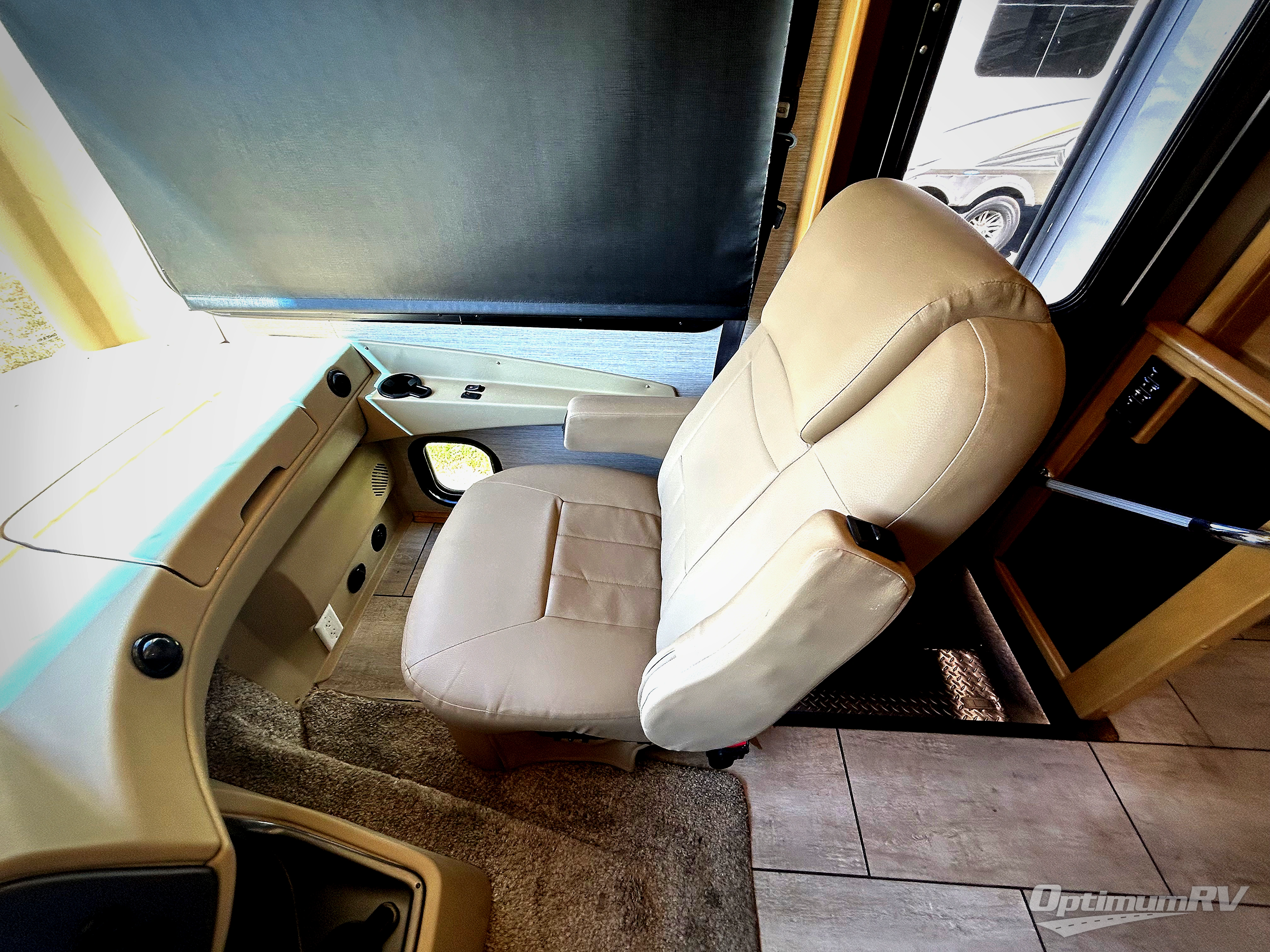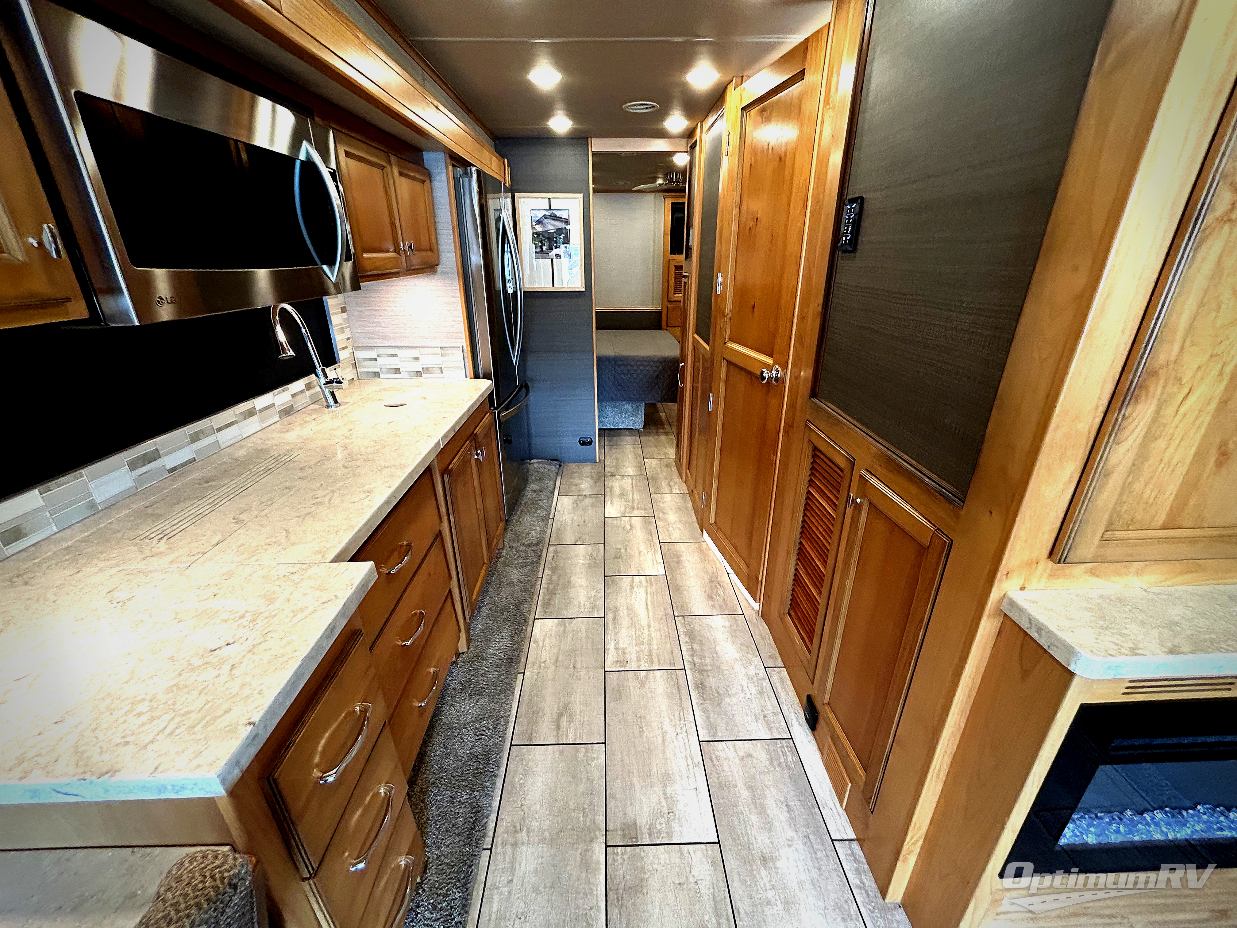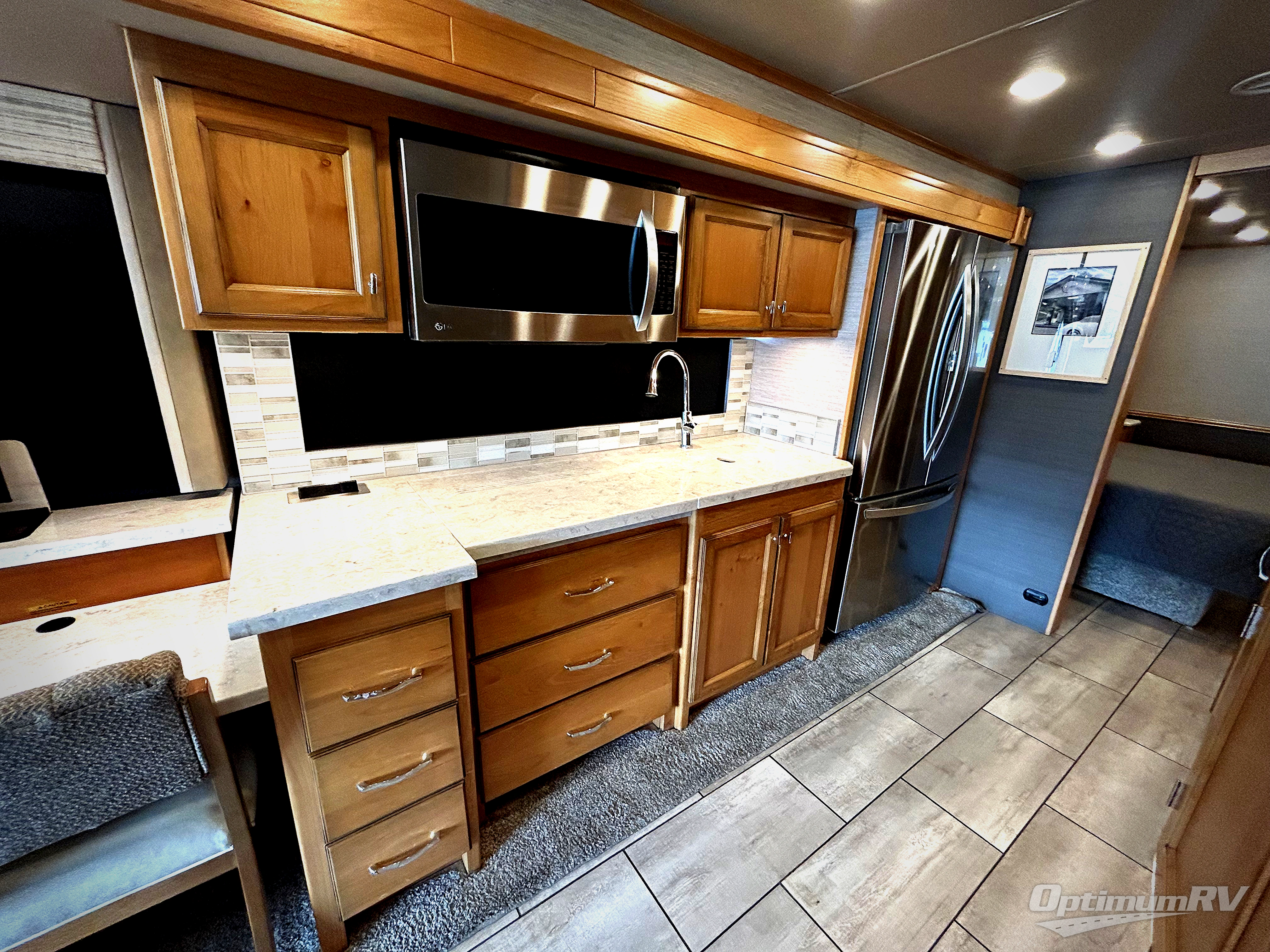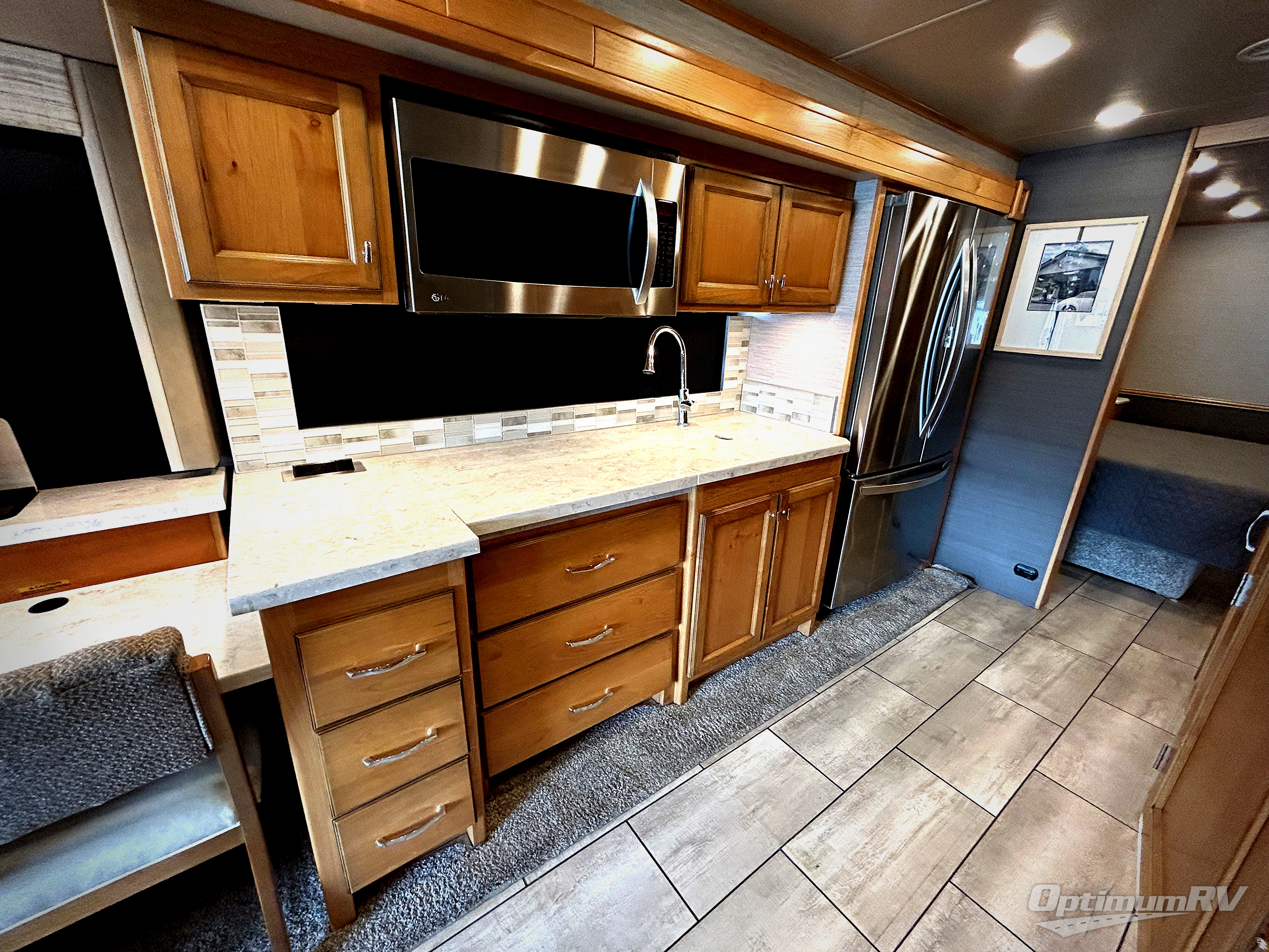 There are many standard luxurious features you will love about this motorhome! It also has many optional features you can add like the optional drop-down front bunk, the super sofa, the air coil sofa bed, the dinette with computer work station, and the dining bar with cabinet, printer, shelf, and file drawer below for an office on wheels. The king bed slide in the rear private bedroom offers a comfortable place to sleep, as well as the ultraleather flip and fold sofa bed and even the booth dinette once converted. The bedroom has lots of places to store your clothes between the bank of drawers below the single cabinet with TV, the wardrobe with drawers below, and the overhead cabinet with drawers below it. Plus, it has an entrance into the dual entry bathroom which has a shower with a seat and an area prepped to add an optional washer and dryer so you can extend your trip with clean clothes!