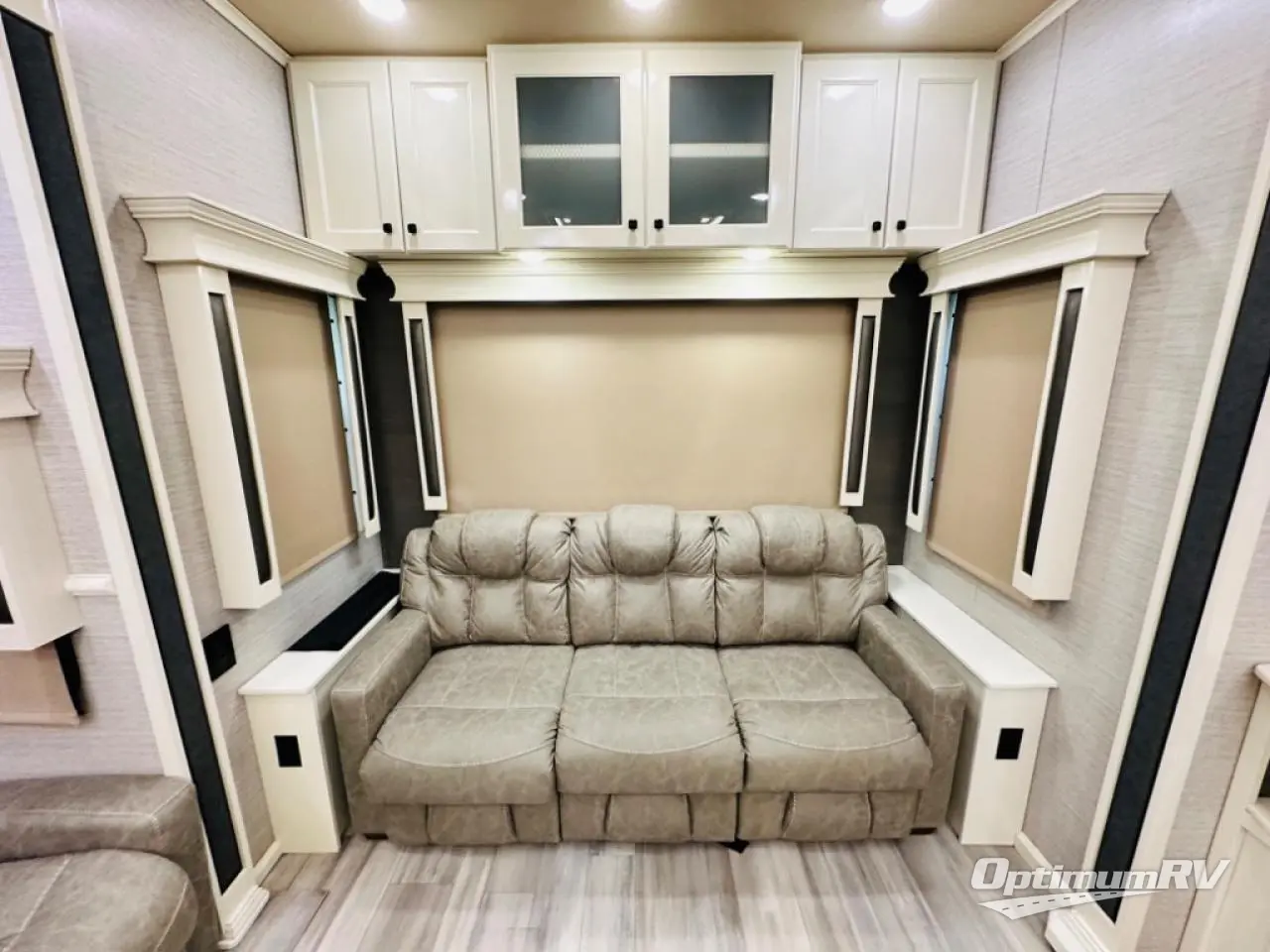 Enjoy time away from the hustle and bustle of the city life in this comfortable fifth wheel. Once you arrive at your destination, set up the two patio awnings, then stretch your legs around the campground. The chef of the family can prepare lunch on the kitchen island, and you can dine at the dinette with chairs. There is also a theater sofa and an 80" sofa bed for additional seating space, and the 40" fireplace with a TV above will feel just like home. If you've spent the day outdoors you can freshen up in the full bath that includes a shower with a seat, plus a medicine cabinet for your necessities. The front private bedroom includes everything you would expect to find at home, including a king bed, a Hi-Boy dresser with a TV, plus a large front closet with a sliding door!