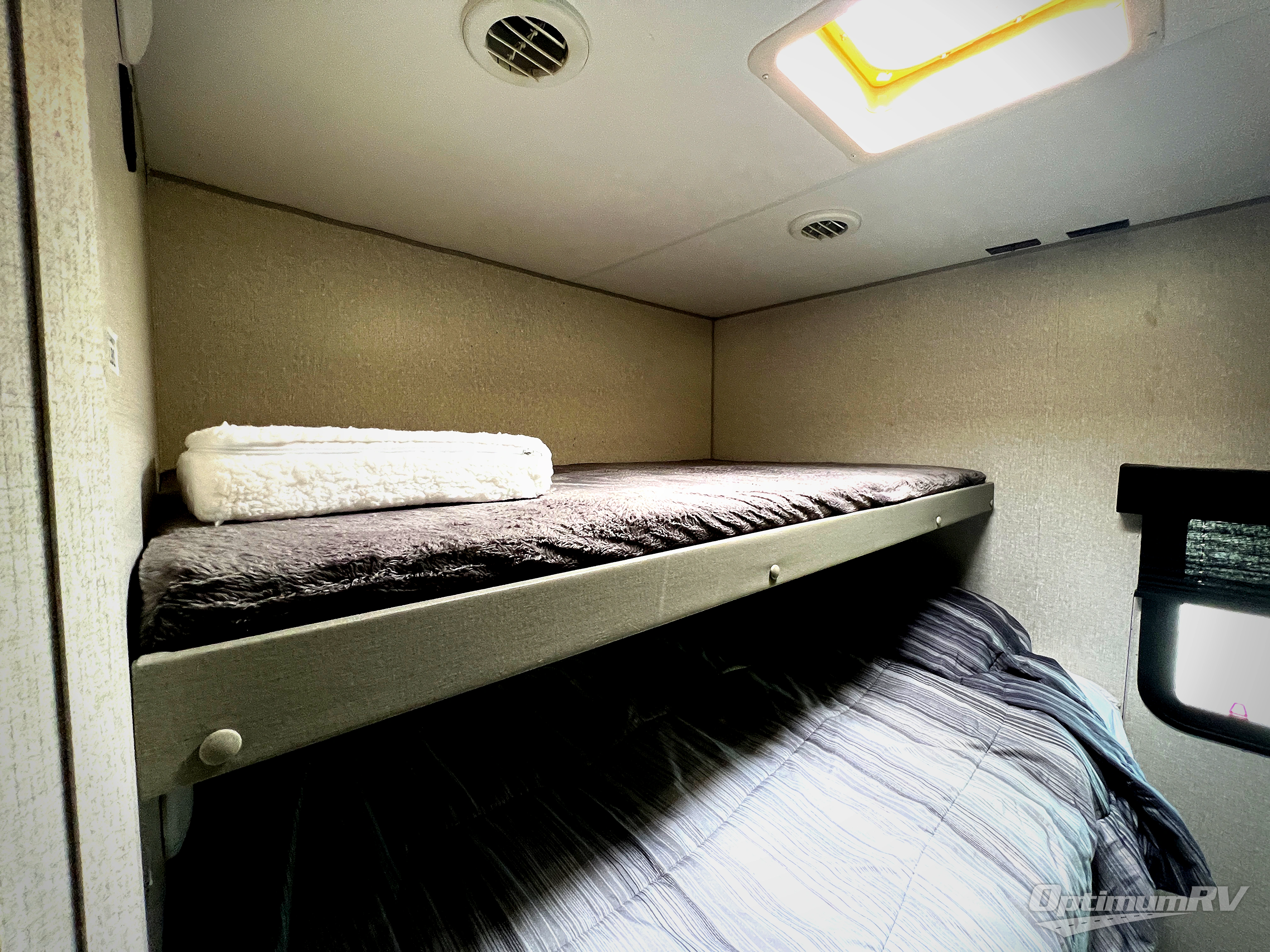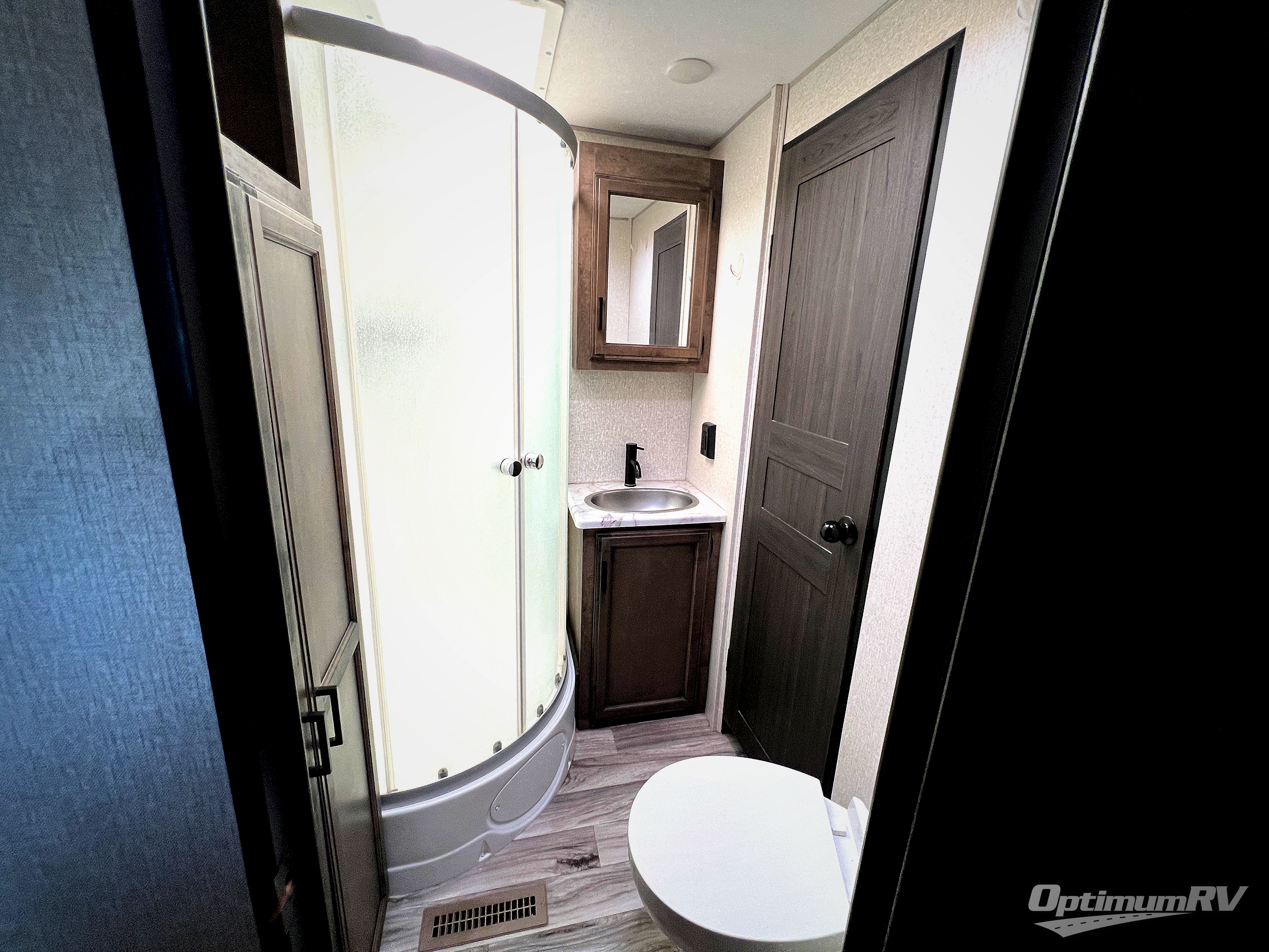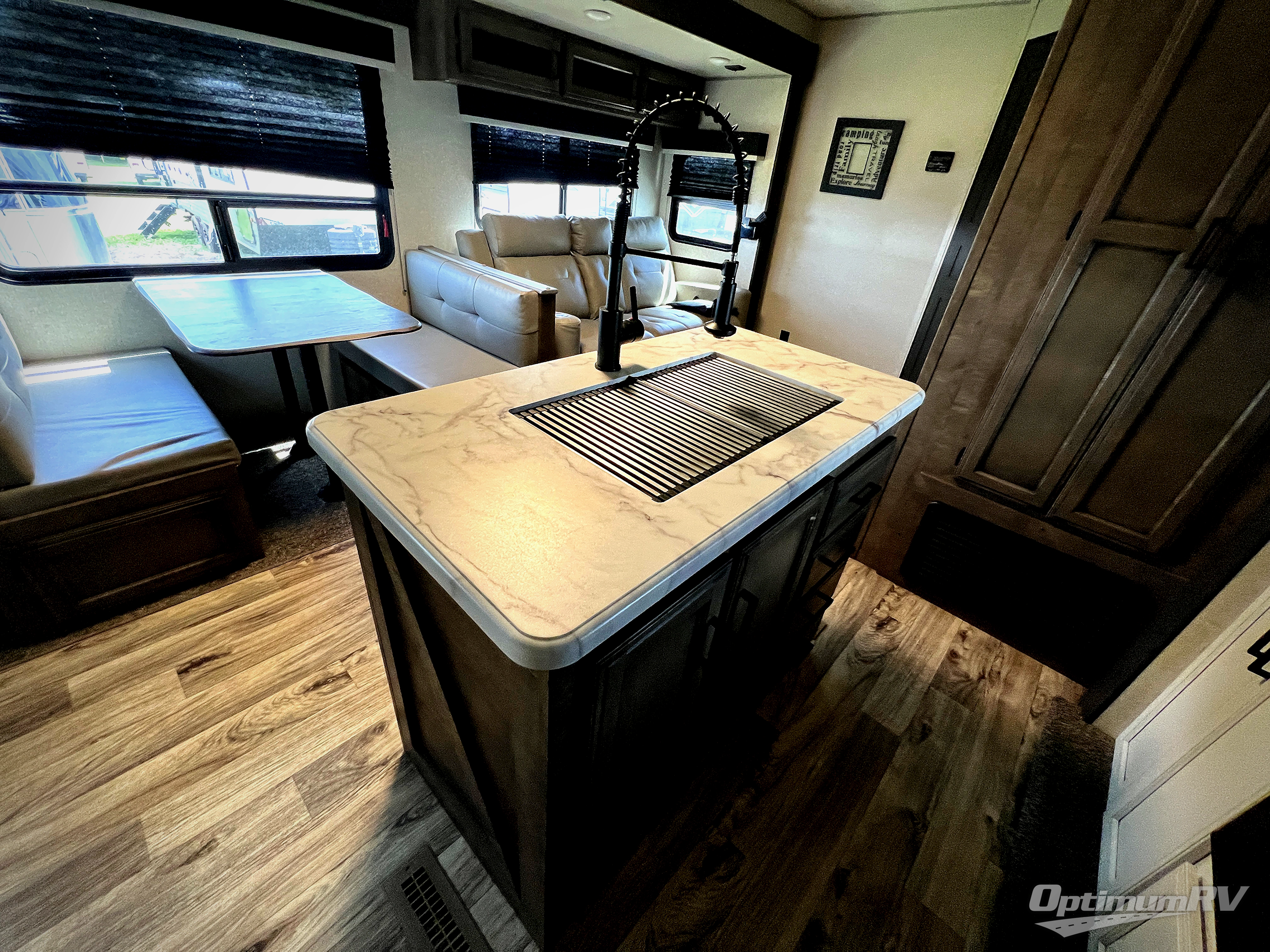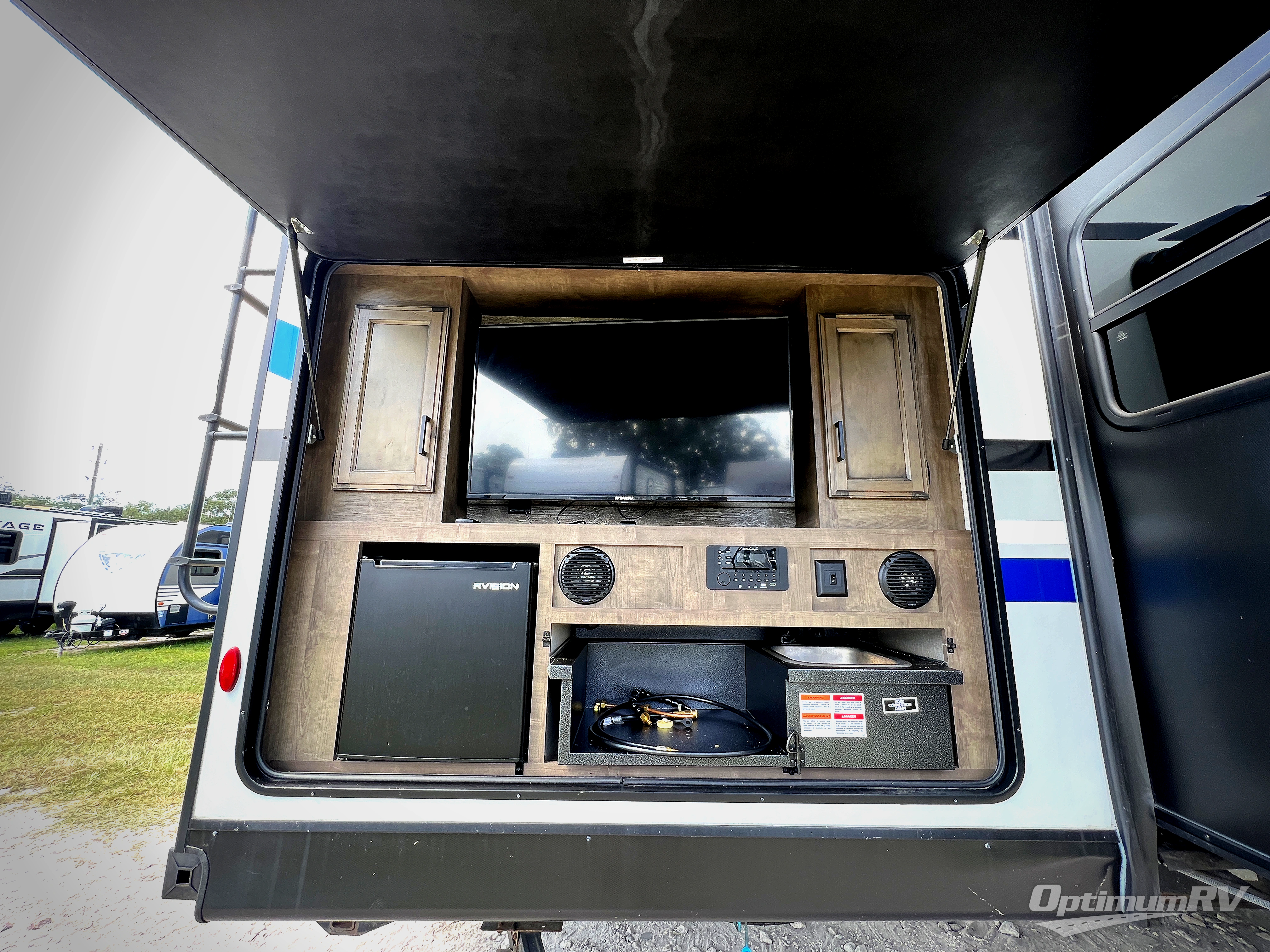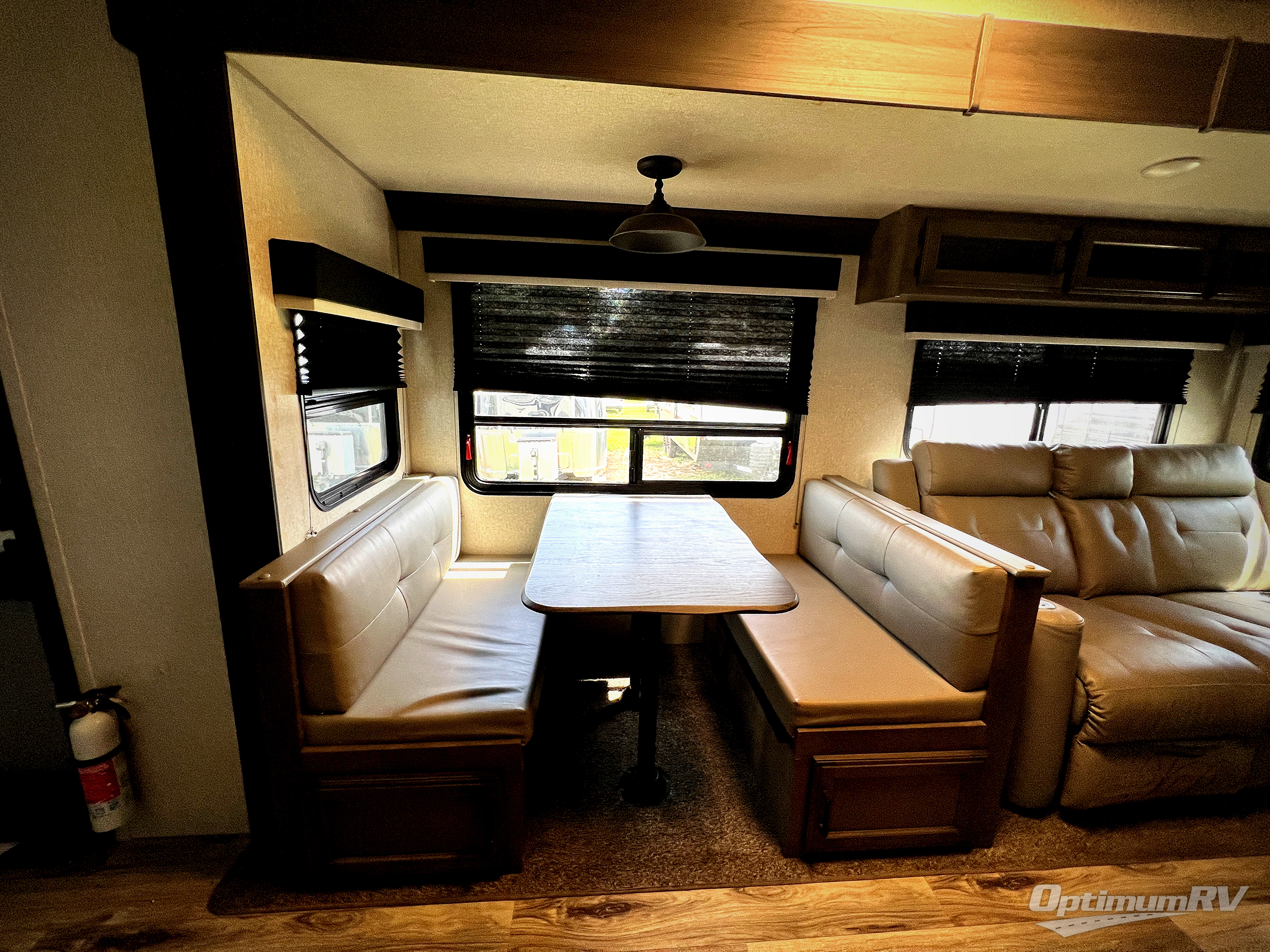 Stay protected rain or shine with the two 10' legless awnings with wind sensor on this travel trailer! Some other exterior features you will enjoy include a campfire café with a 38" TV to watch the big game while you grill steaks on the griddle, and the pass-through storage area with slam latch baggage doors will keep your gear in place. Inside there is a rear private bunkhouse with a closet, a 32" x 70" flip-up bunk above a 70" sofa with a table, and a 28" x 70" bunk above a 40" x 70" bottom bunk. The living area has a sofa across from an entertainment center with a 5,000 BTU frameless fireplace and a 40" TV with a swing arm so others can watch it from the 42" booth dinette. The dual entry bathroom has a 34" radius shower to freshen up in, and is easy to access, especially those staying in the front private bedroom!