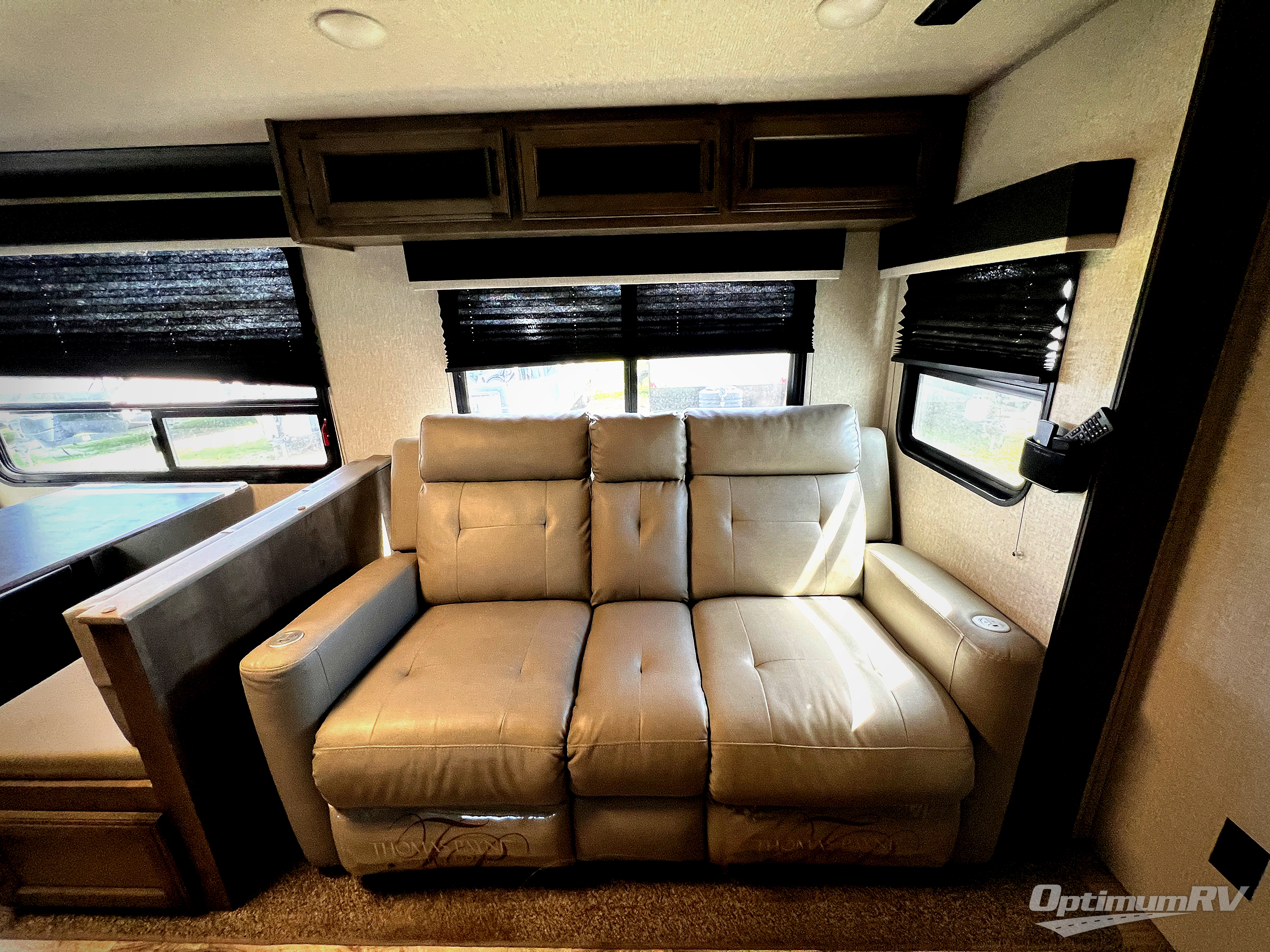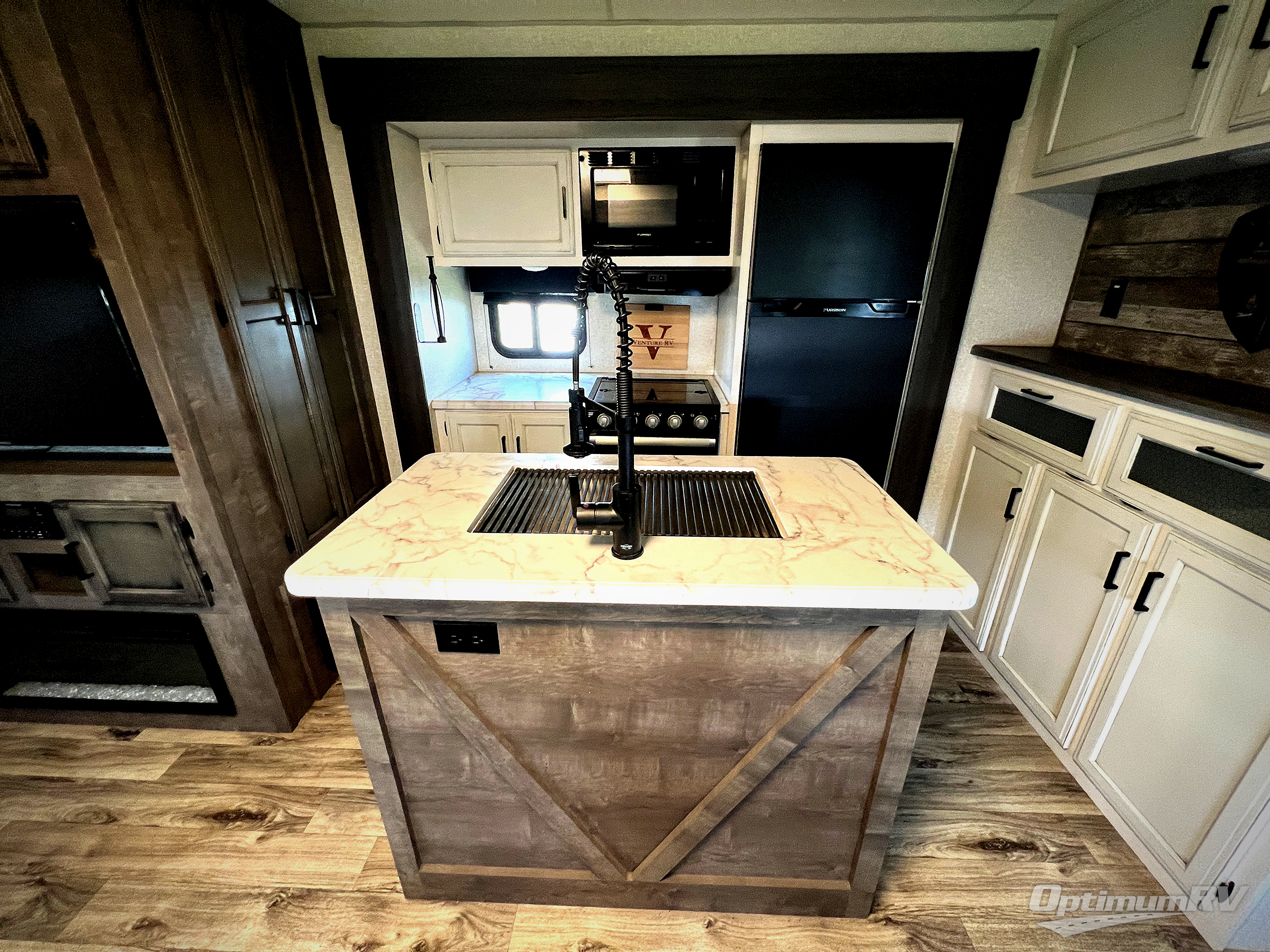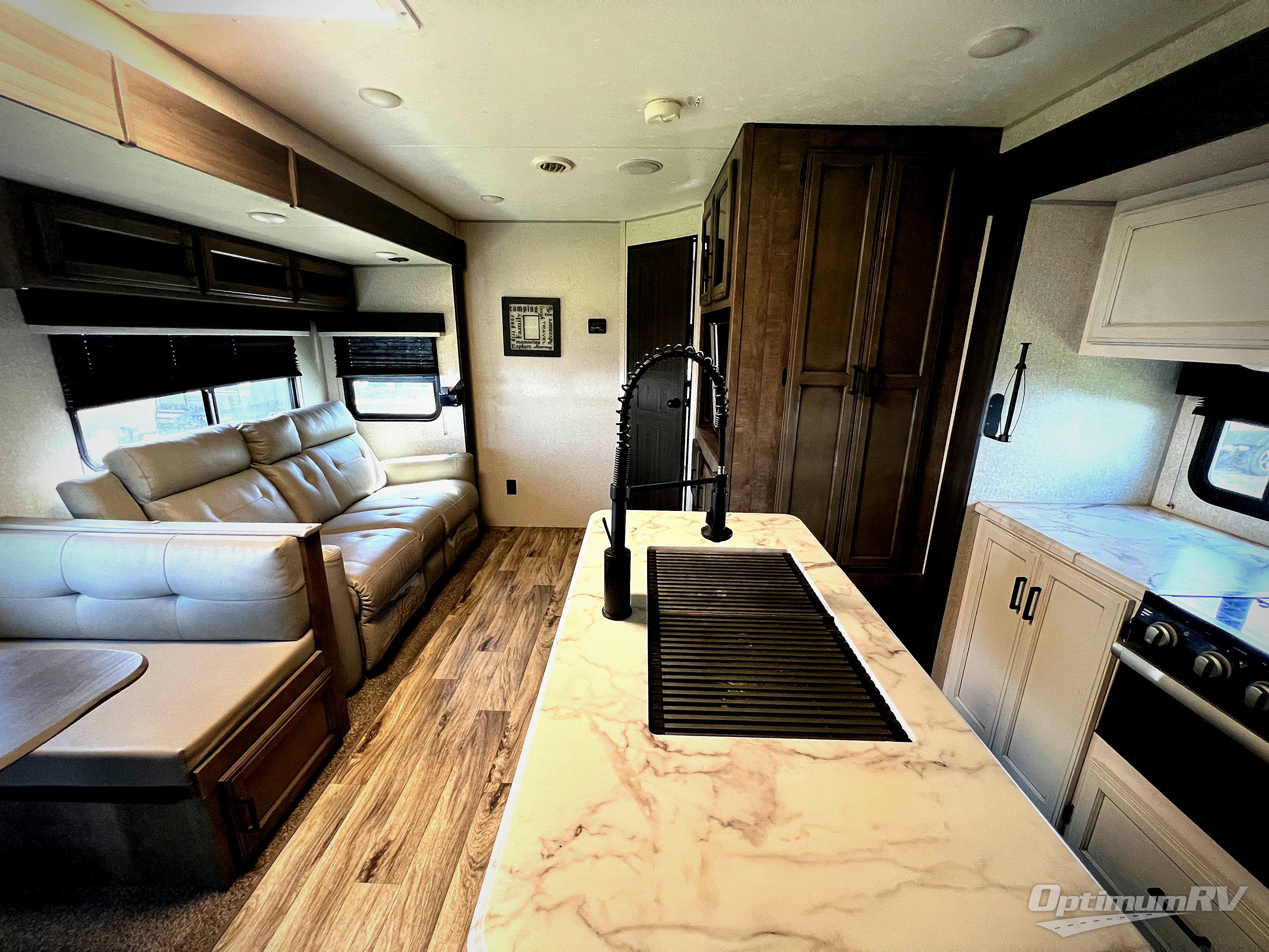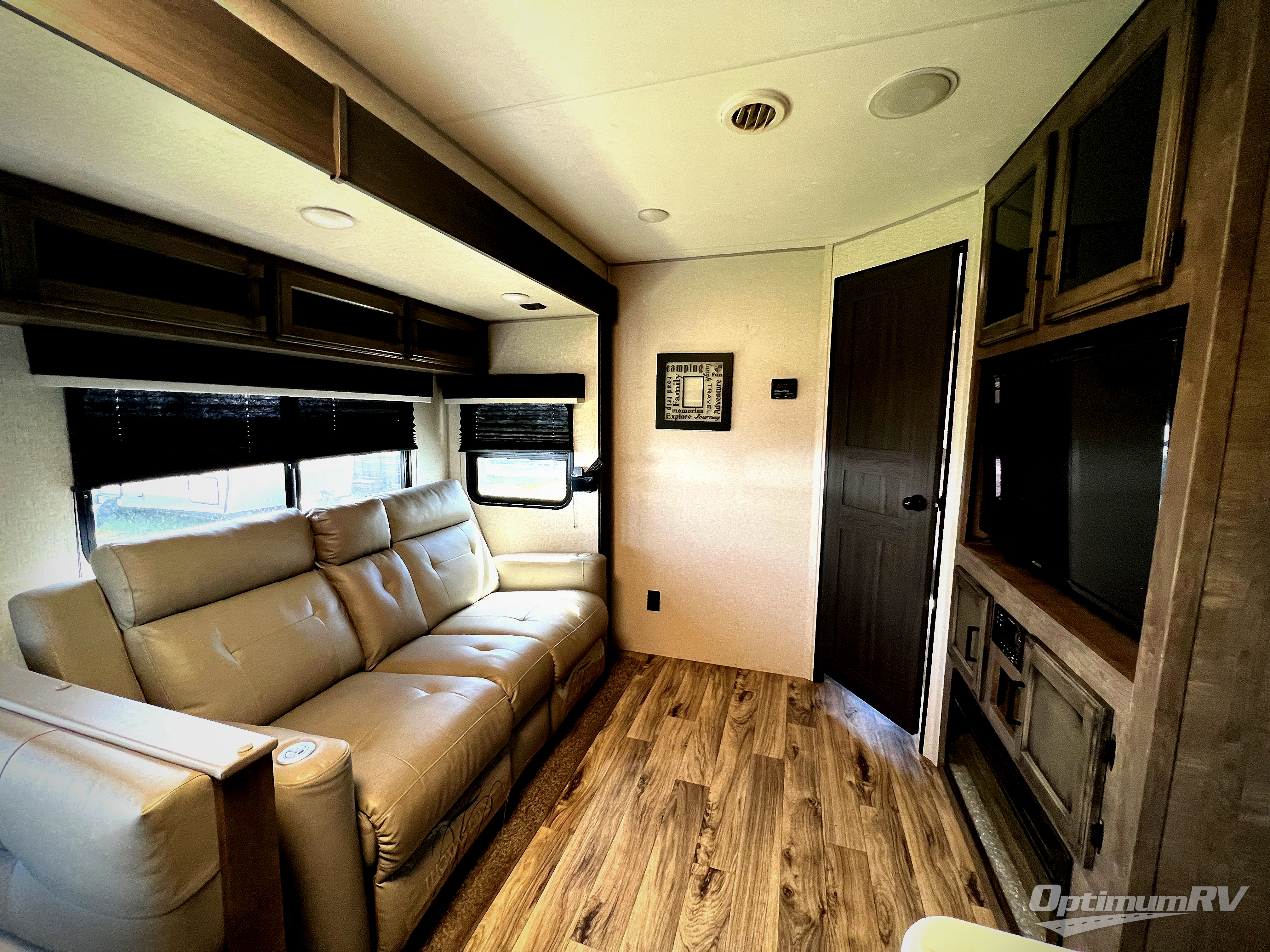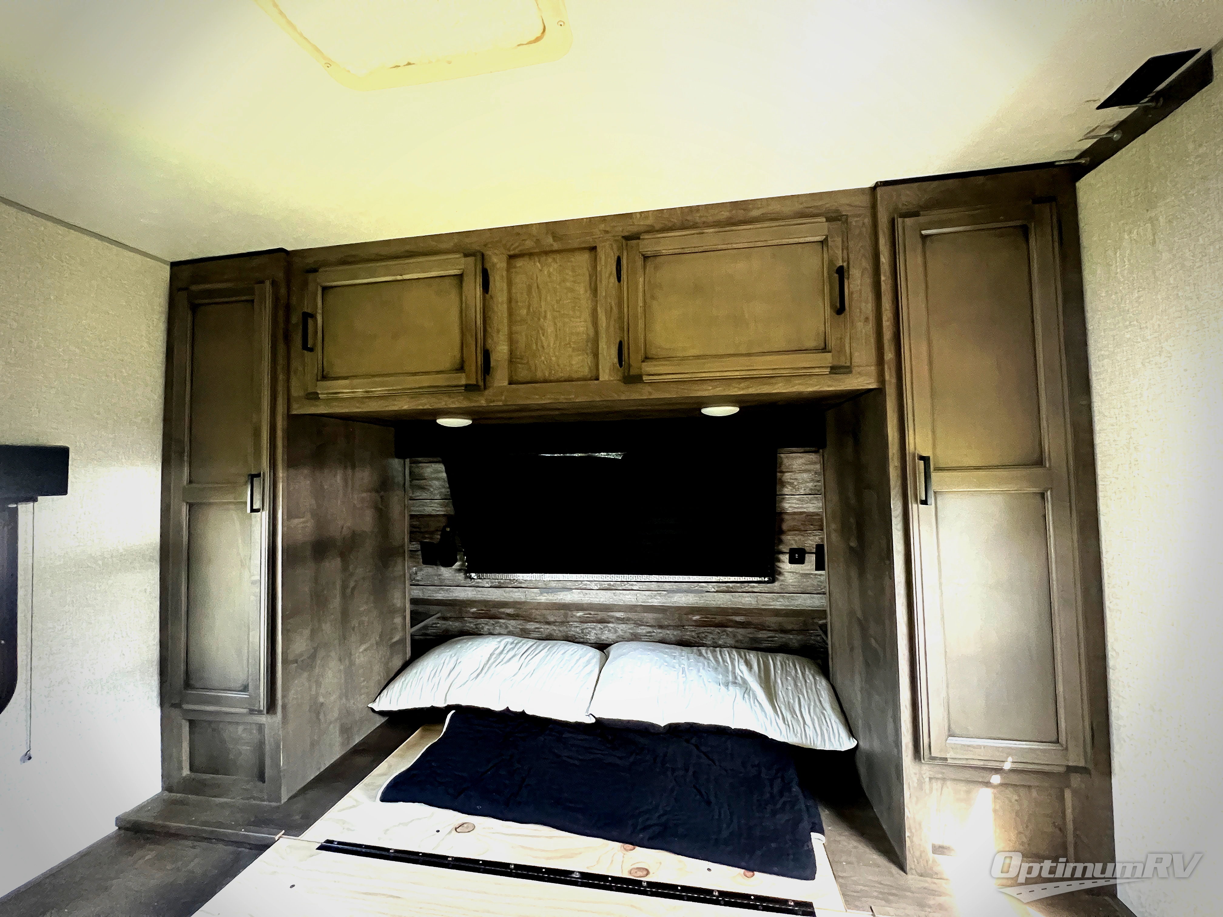 Stay protected rain or shine with the two 10' legless awnings with wind sensor on this travel trailer! Some other exterior features you will enjoy include a campfire café with a 38" TV to watch the big game while you grill steaks on the griddle, and the pass-through storage area with slam latch baggage doors will keep your gear in place. Inside there is a rear private bunkhouse with a closet, a 32" x 70" flip-up bunk above a 70" sofa with a table, and a 28" x 70" bunk above a 40" x 70" bottom bunk. The living area has a sofa across from an entertainment center with a 5,000 BTU frameless fireplace and a 40" TV with a swing arm so others can watch it from the 42" booth dinette. The dual entry bathroom has a 34" radius shower to freshen up in, and is easy to access, especially those staying in the front private bedroom!