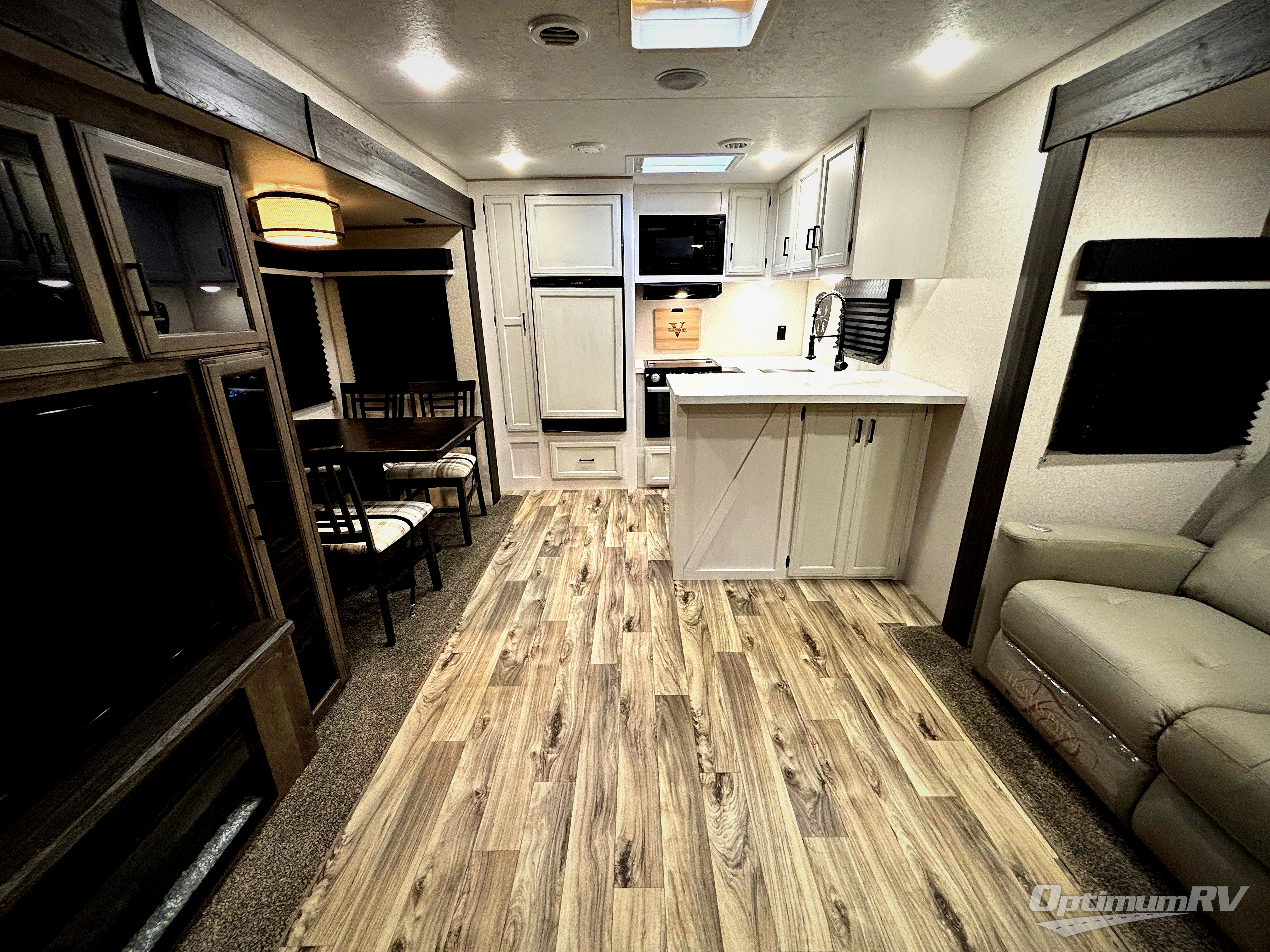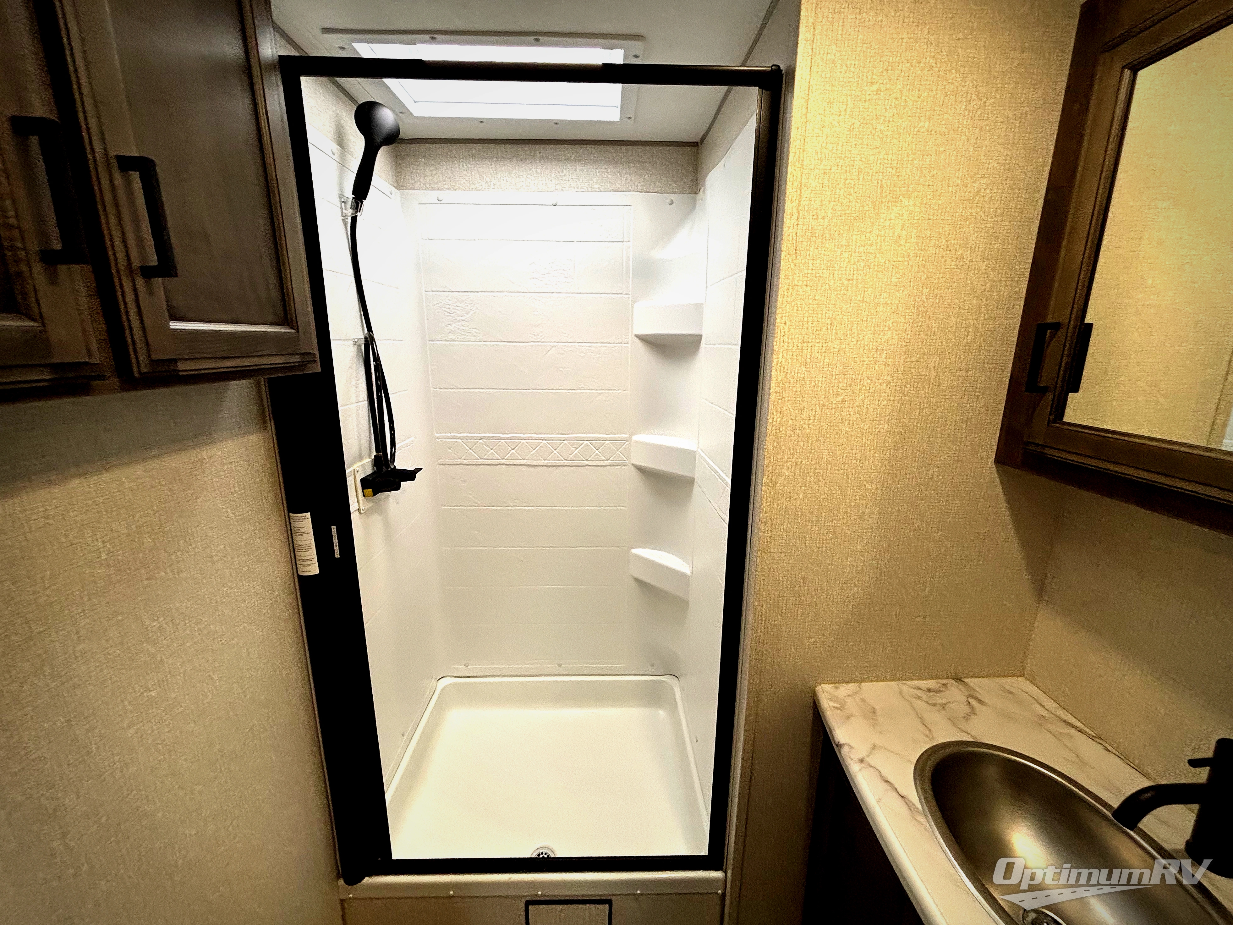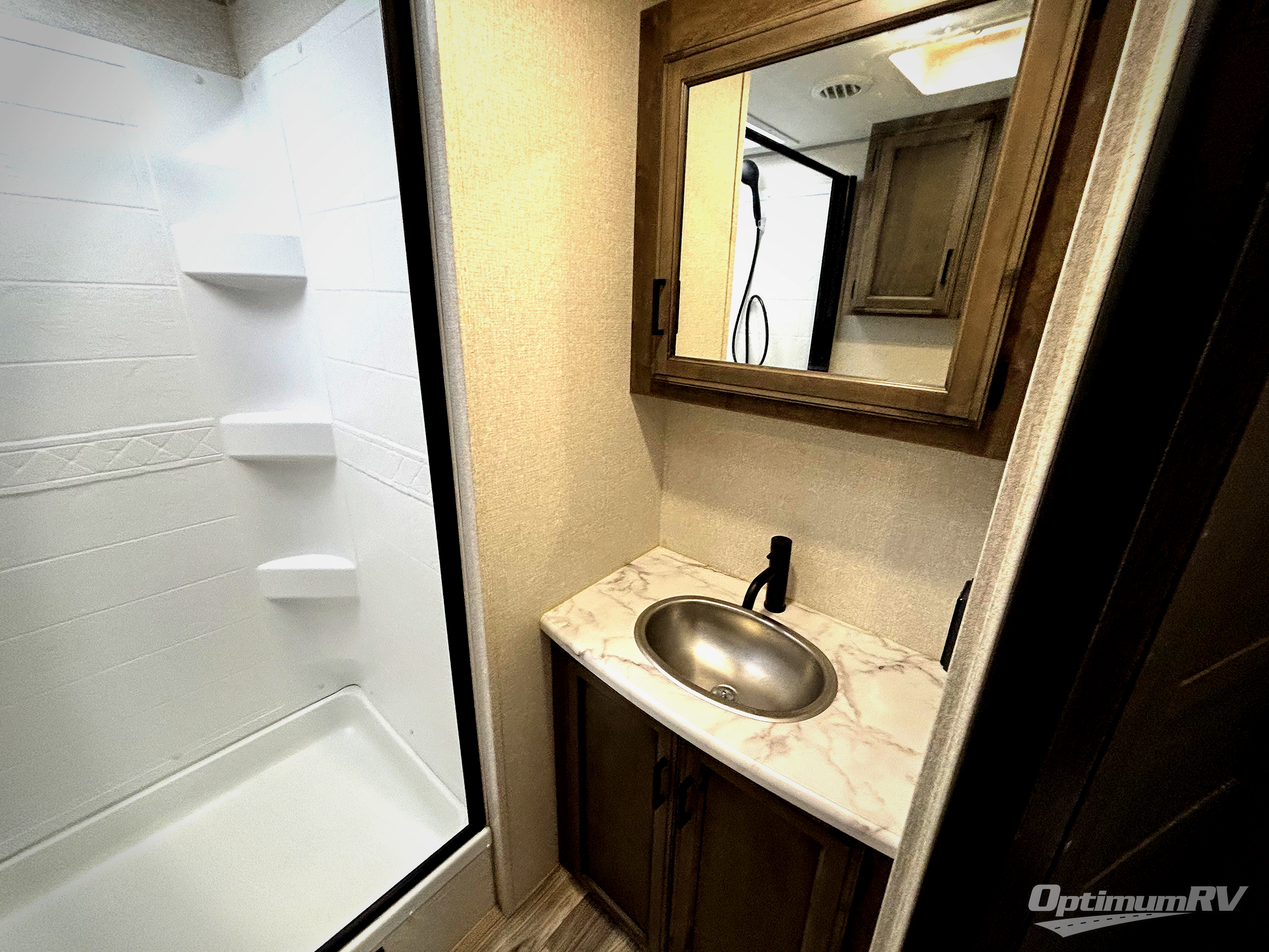 It's a clean decision with a bath and a half to take this travel trailer on your next camping trip! The rear private bunkhouse is decked out with a 28" x 70" bunk bed, a 32" x 70" top bunk, a 28" x 73" flip-up bunk above a 72" sofa with table, and a flip desk to do some school work. The half bathroom has an entrance/exit door so you can get back to cooking at the outdoor campfire café which has two 3 cu. ft. refrigerators, a sink, a griddle, and storage. Your clean up will be a breeze thanks to the kitchen island with a large sink and dish drying sink cover. If you need extra sleeping space then simply convert the 42" grand dinette and 70" sofa into sleeping spaces. Those staying in the front private bedroom will enjoy a good night's rest on the sleep tight queen bed and have the convenience of accessing the dual entry bathroom!