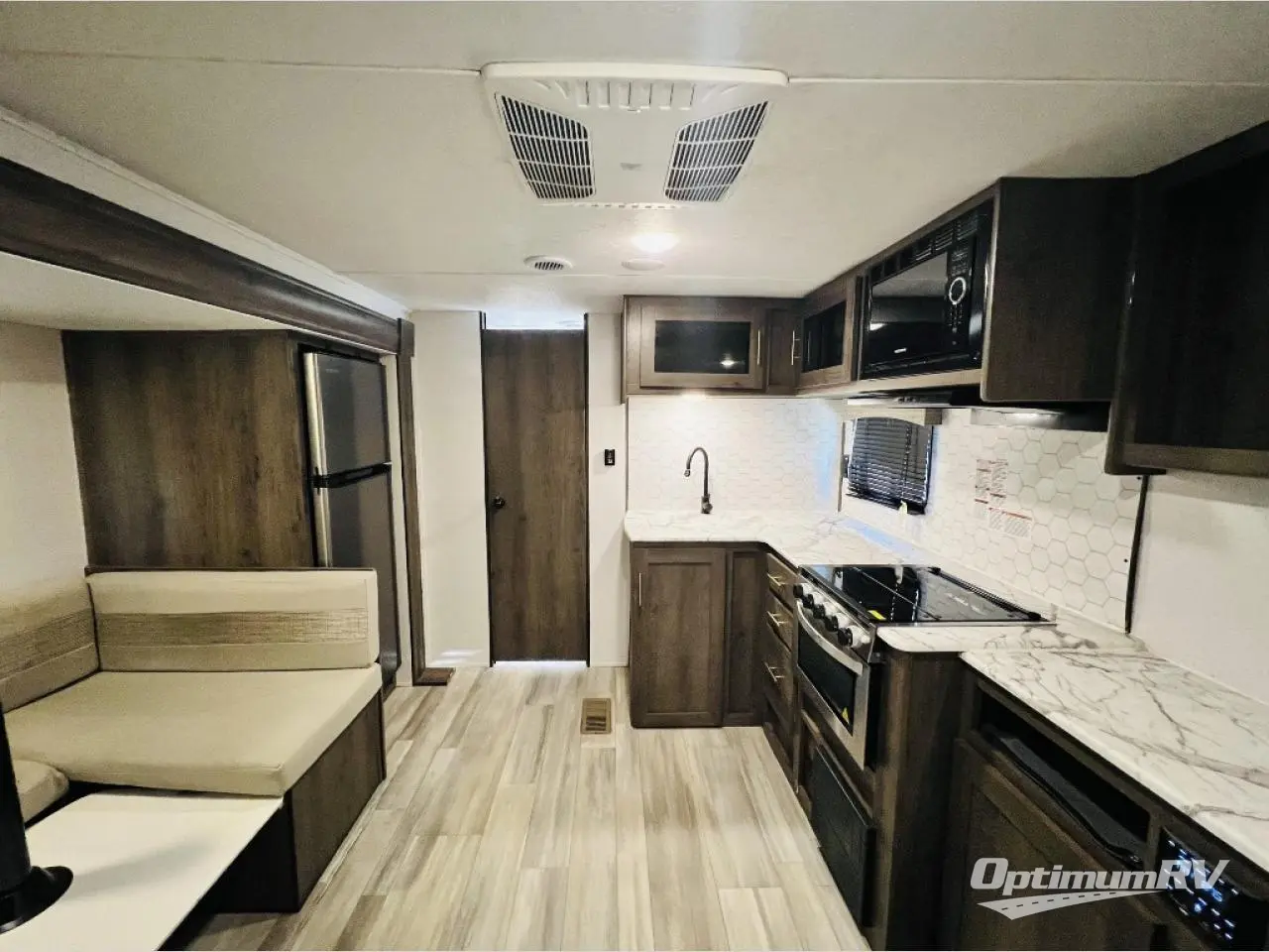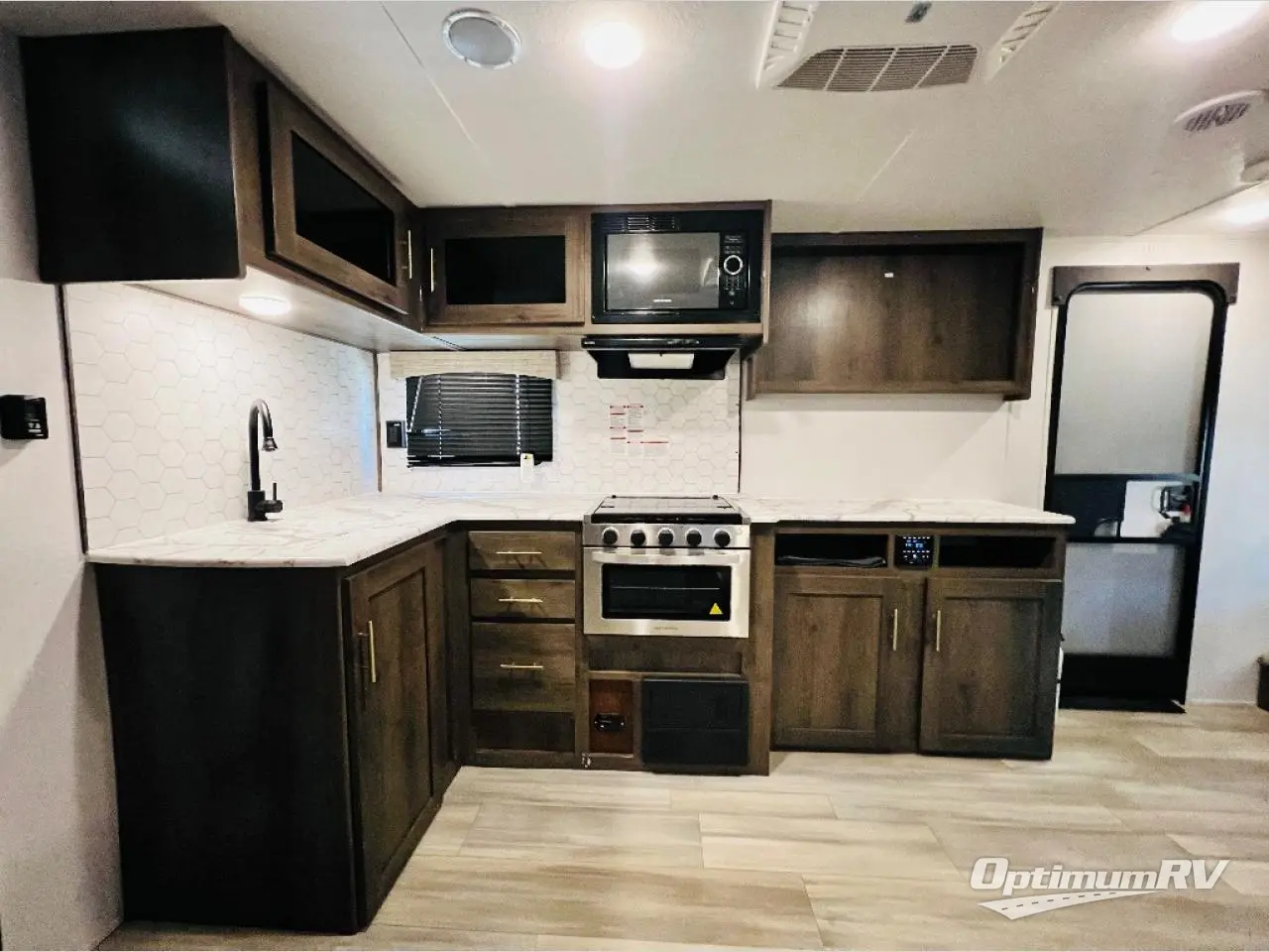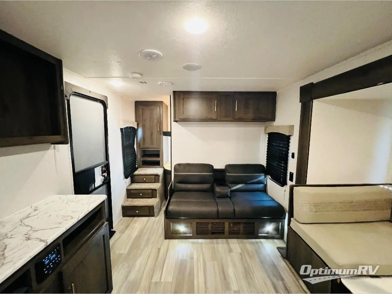 Start planning your trip and loading up your clothes for a fun family or friend get-away with this trailer in tow! The kids or your guests will pack the wardrobe by the double bunk beds in the rear which include steps leading up to them, and you can place your clothes in the wardrobes in the front private bedroom which includes the second entry/exit door for convenience. The main kitchen and living area is spacious with a slide out, and everyone can gather around the U-shaped dinette and sofa to visit, eat and plan their day. The outside camp kitchen allows you to make breakfast outdoors, and you'll find a three burner range with an oven indoors to bake a casserole for dinner. The exterior also offers an outside shower to wash off the dirt from the day, and an 16' power awning to relax in the shade!