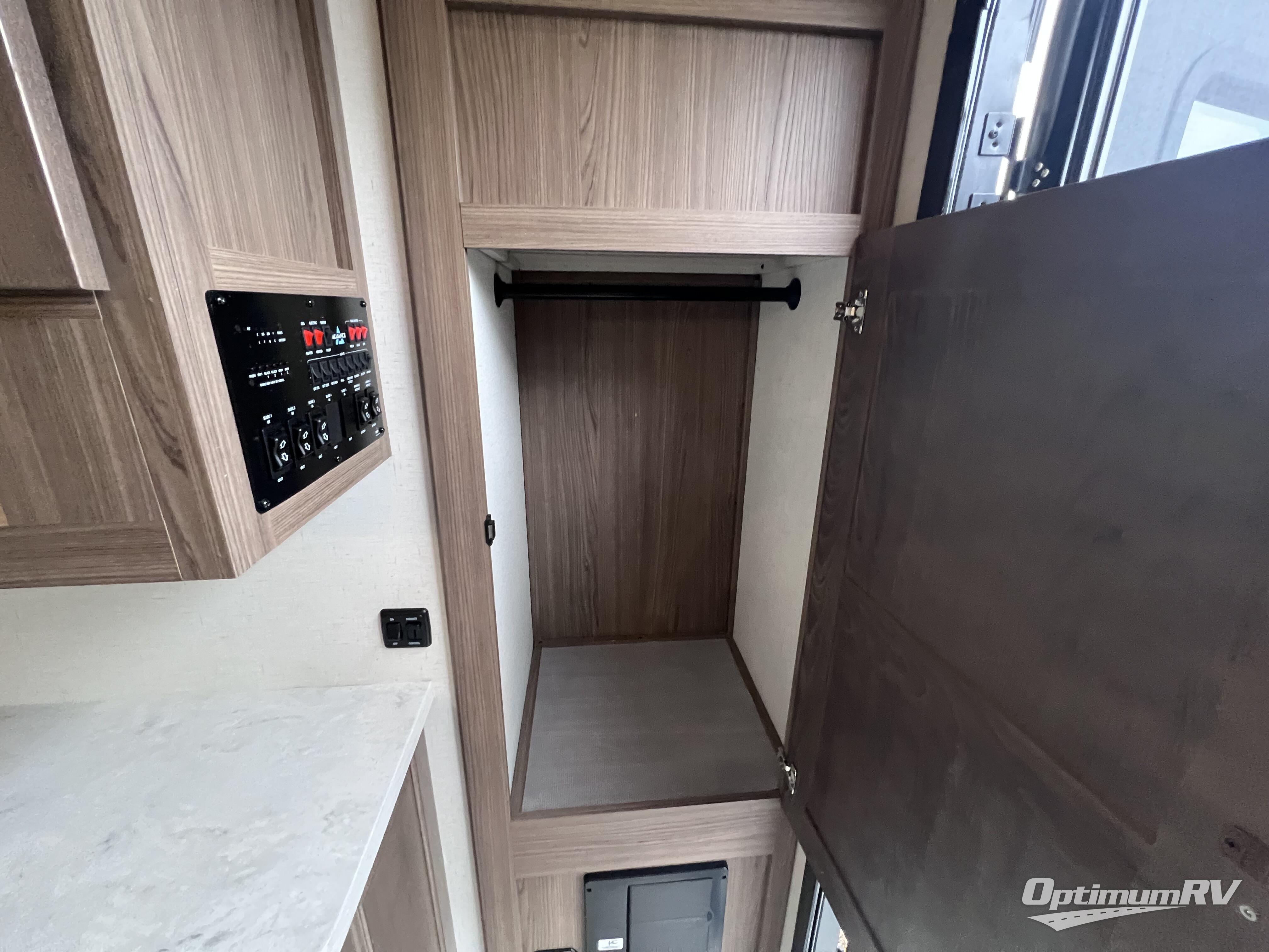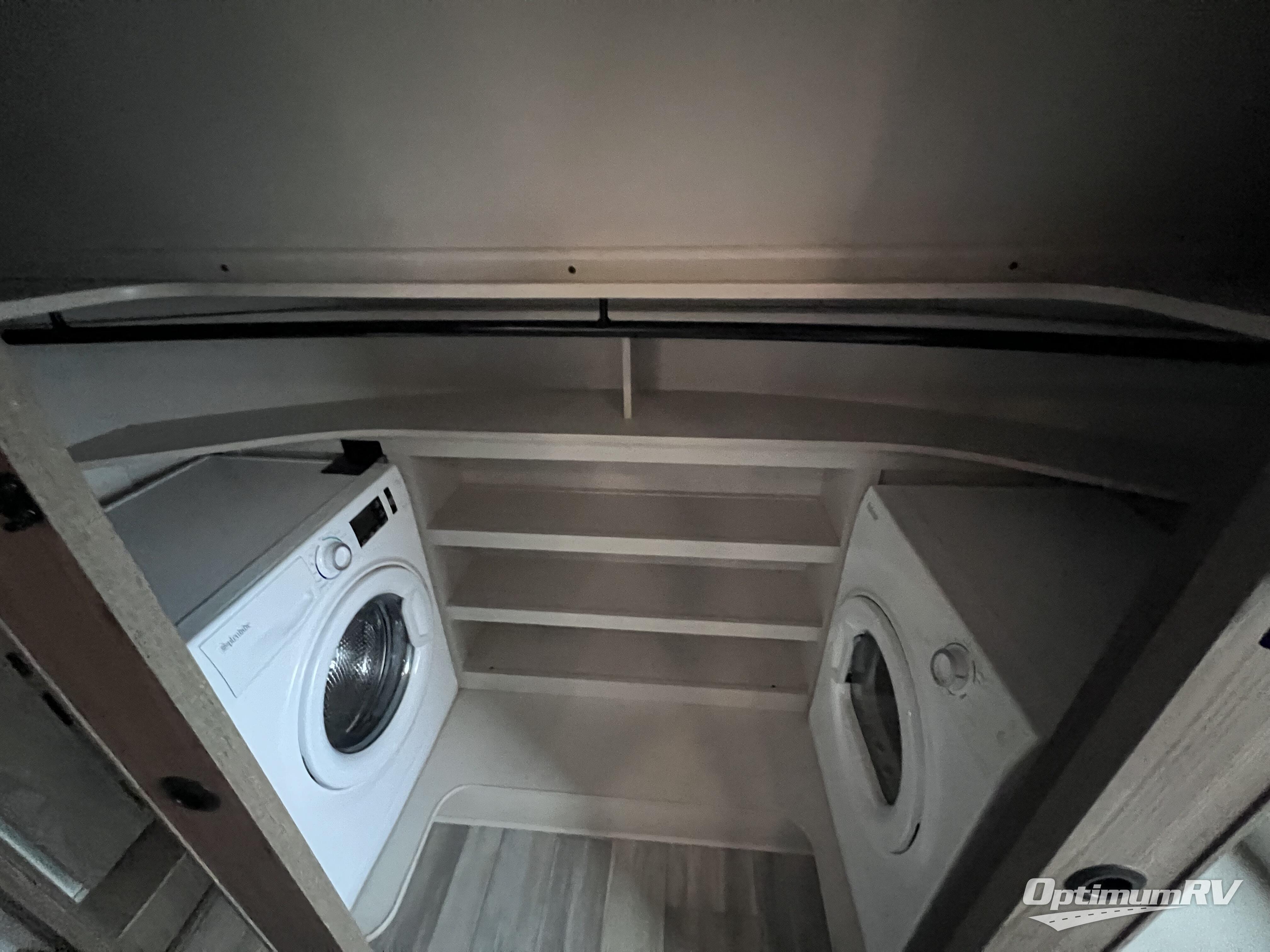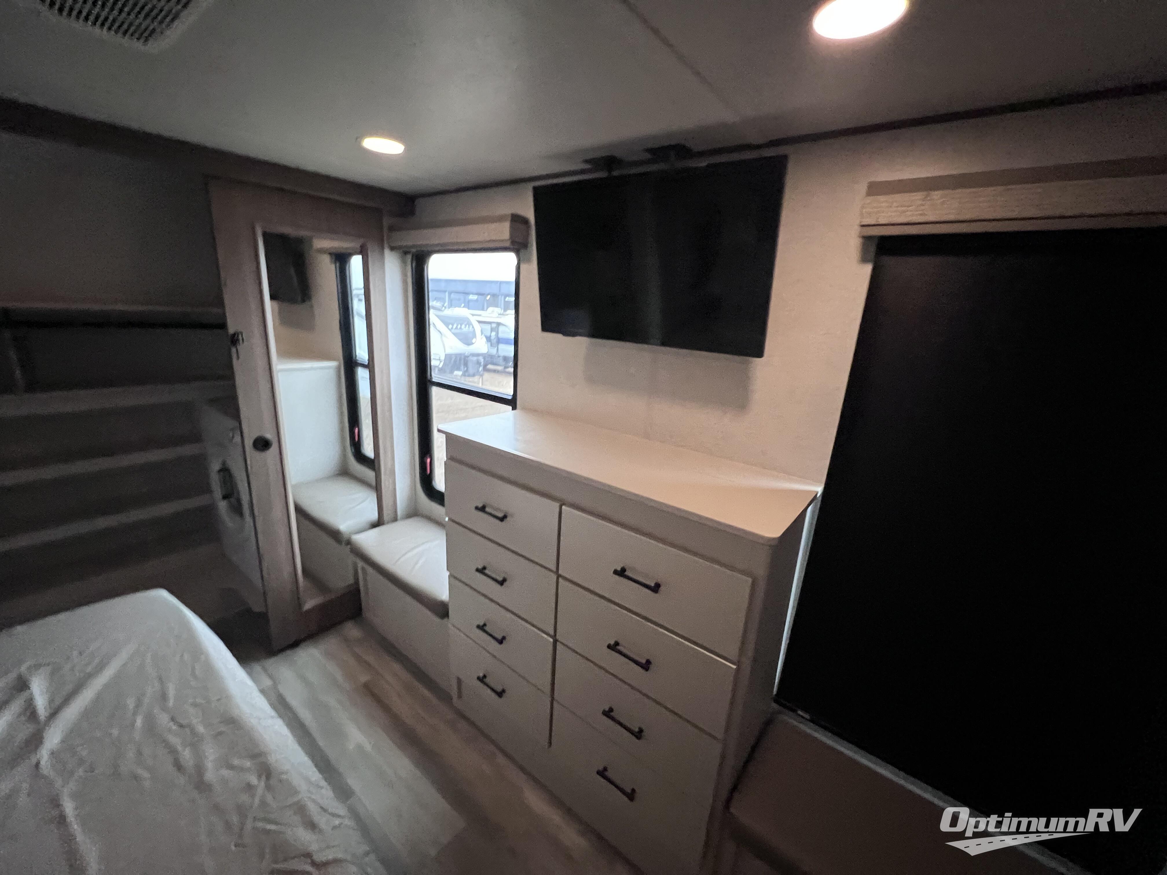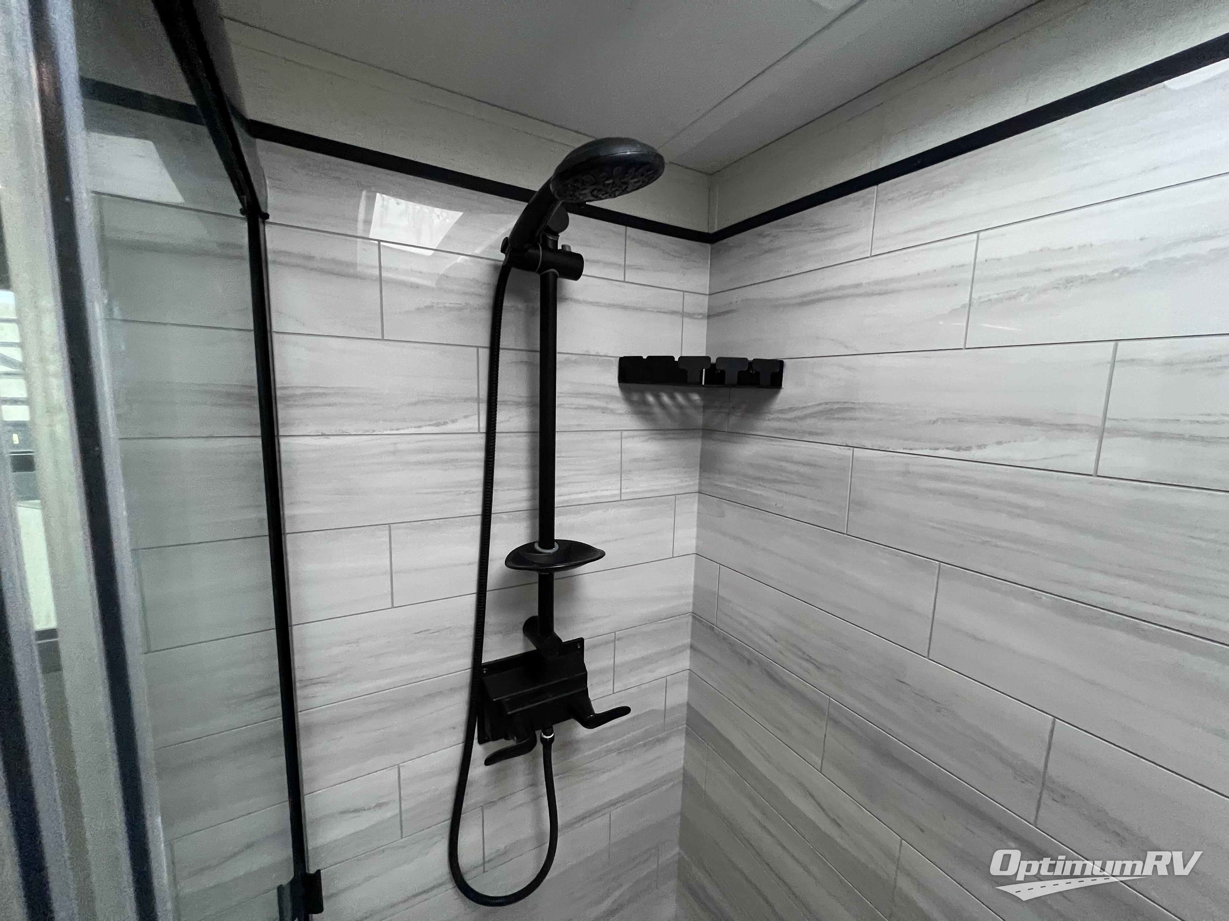 Travel to see family and friends while living in this RV or while on vacation! You will love the spacious rear living area thanks to the dual opposing slides which include the kitchen amenities and the 50" Smart TV with pull-out fireplace storage. There is a dual recliner love seat which is super comfortable and the floating dinette table with four chairs will be perfect to dine at. The kitchen island includes a stainless steel farm sink and counter space to utilize many ways, plus you can add a dishwasher option if you like. The full bathroom is up the steps towards the front bedroom and includes a 61" x 30" shower. You even have more floor space in the hallway thanks to the third slide out which includes shelf storage, plus more shelves and a king bed in the bedroom.