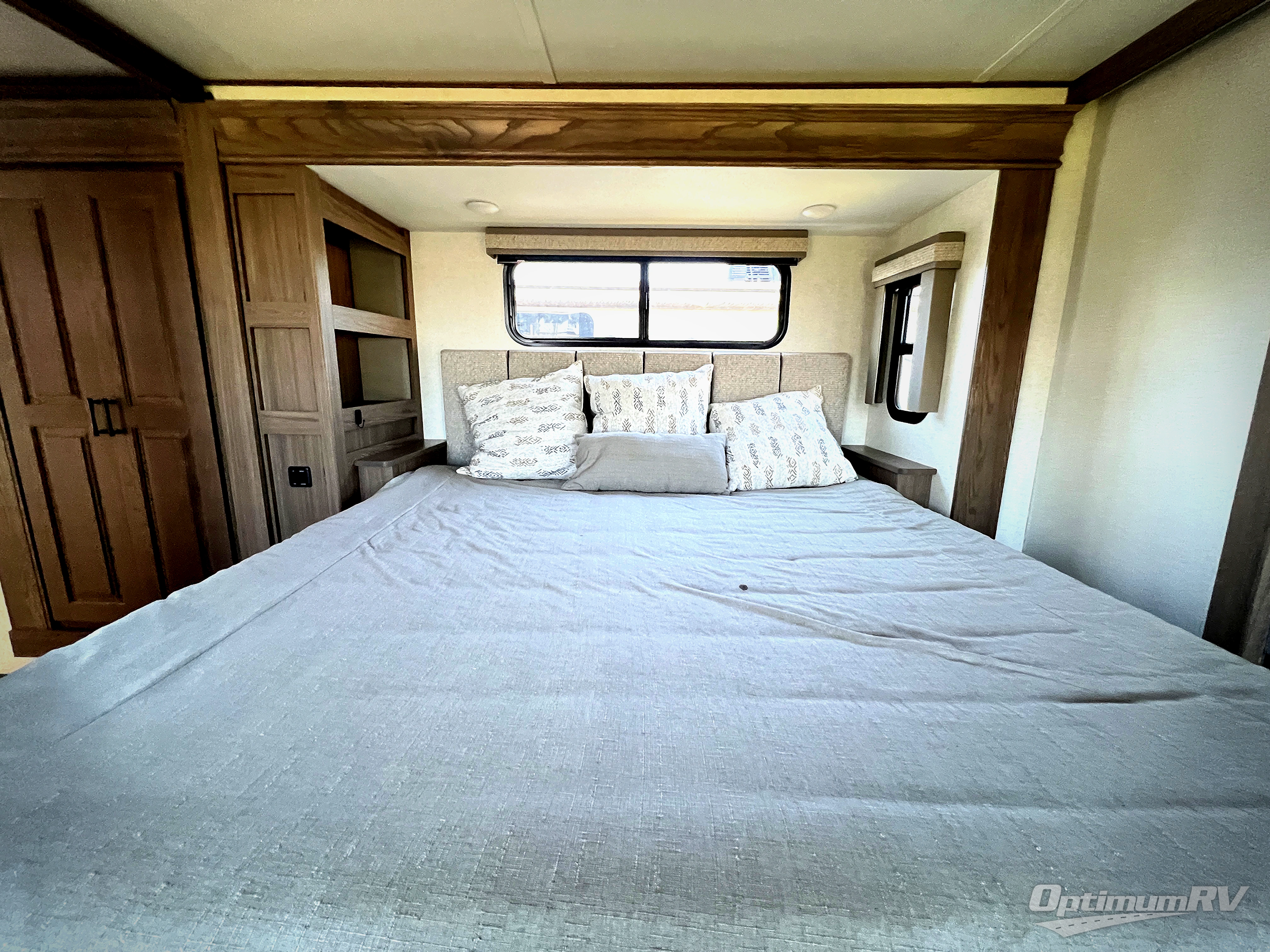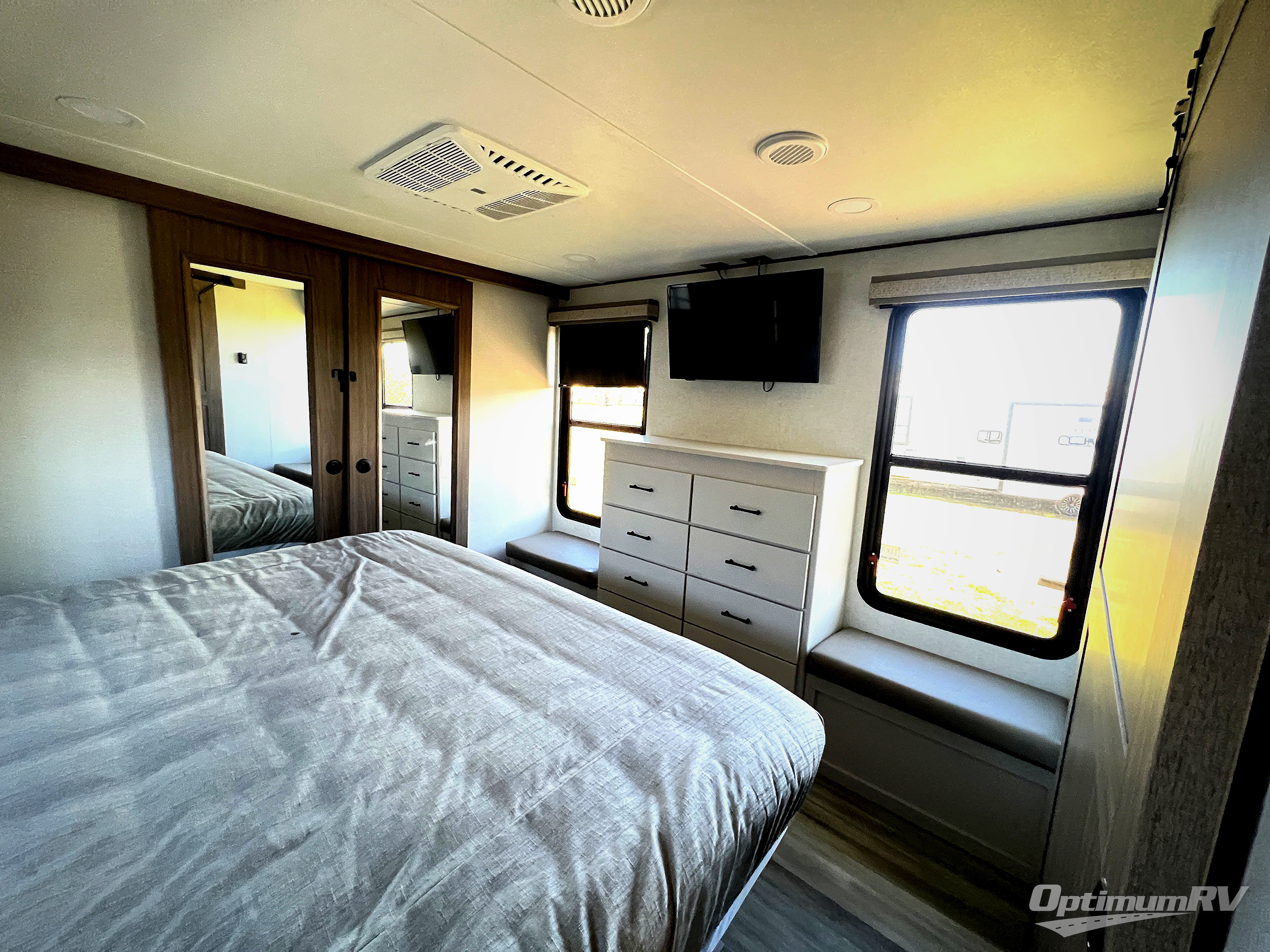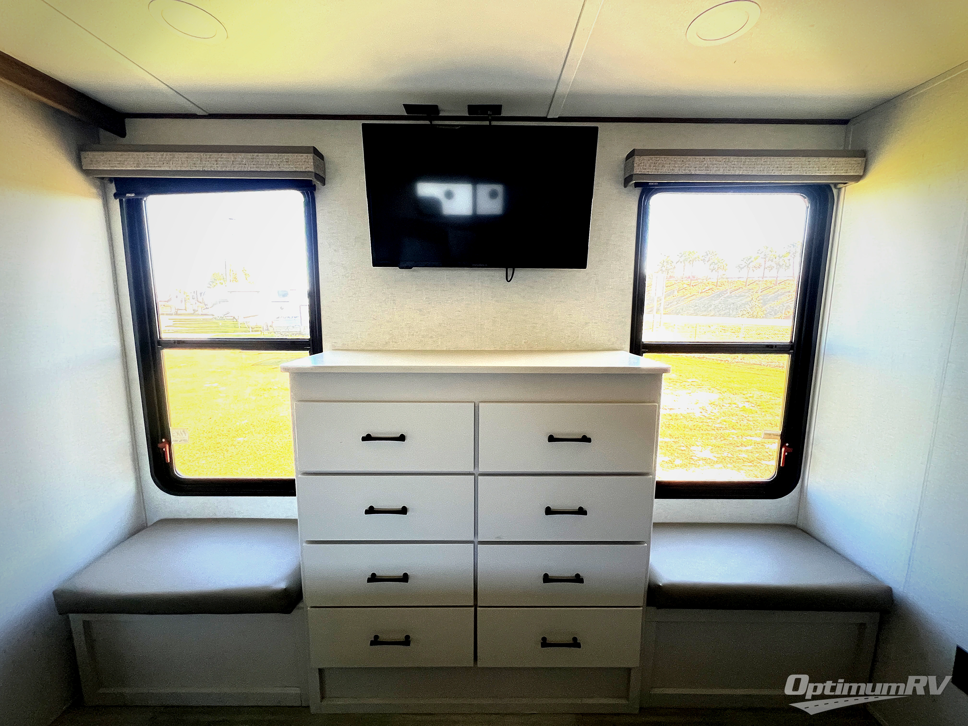 Travel to see family and friends while living in this RV or while on vacation! You will love the spacious rear living area thanks to the dual opposing slides which include the kitchen amenities and the 50" Smart TV with pull-out fireplace storage. There is a dual recliner love seat which is super comfortable and the floating dinette table with four chairs will be perfect to dine at. The kitchen island includes a stainless steel farm sink and counter space to utilize many ways, plus you can add a dishwasher option if you like. The full bathroom is up the steps towards the front bedroom and includes a 61" x 30" shower. You even have more floor space in the hallway thanks to the third slide out which includes shelf storage, plus more shelves and a king bed in the bedroom.