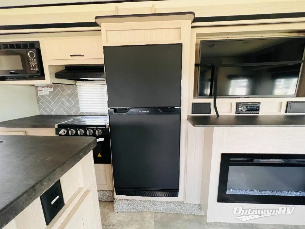 If you like to camp with a more at-home feel then you're going to love this travel trailer. There are dual opposing slides in the living area/kitchen for more interior space, and you can relax on the theater seating across from the entertainment center and fireplace. The kitchen includes an island the chef is sure to love, along with a three burner cooktop, a hutch, and an 8 cu. ft. 12V refrigerator. You will feel right at home in the front private bedroom with a queen bed and dual wardrobes for your clothes. This model also includes an outdoor camp kitchen with an outdoor TV; you can't beat that!