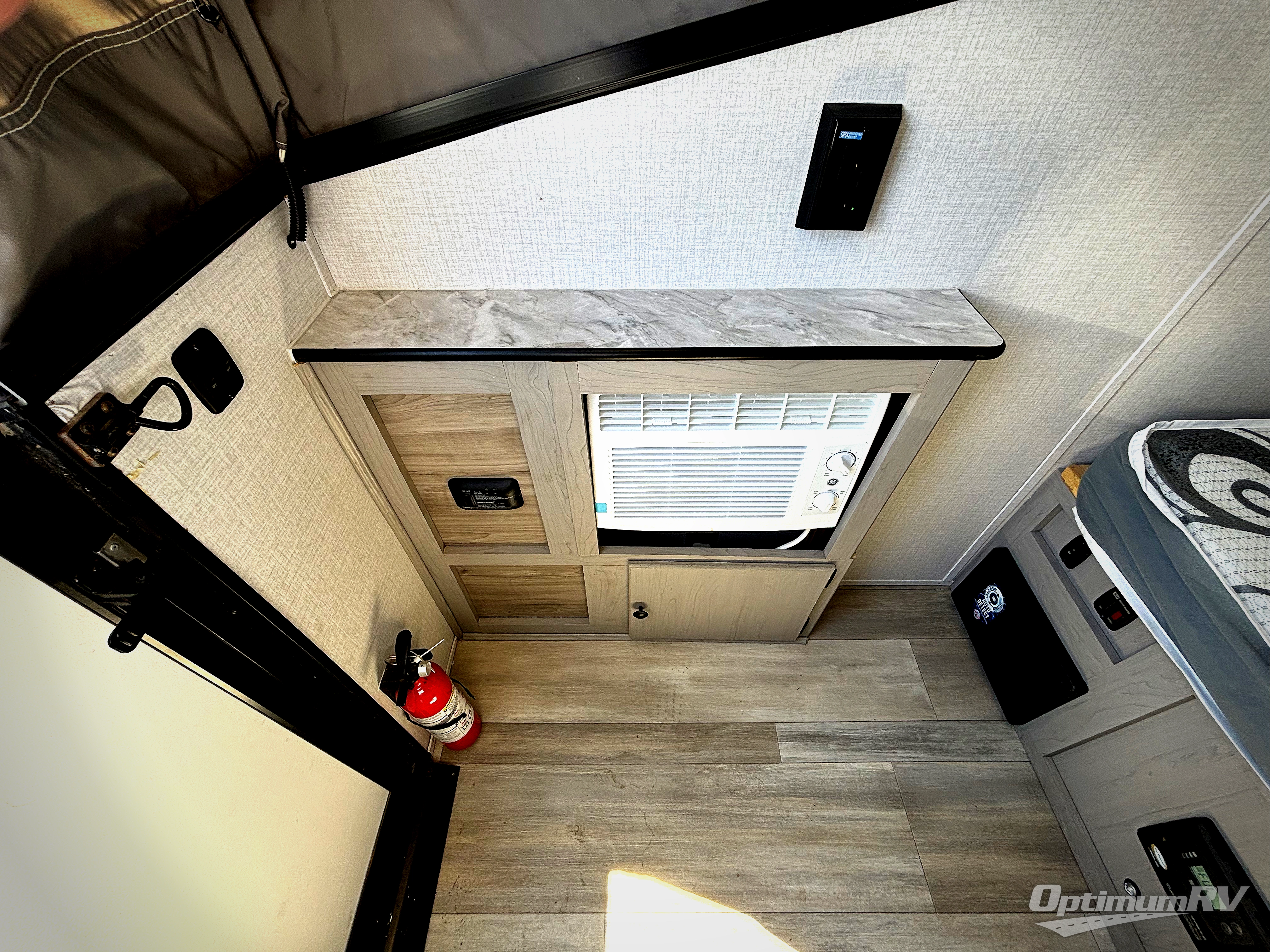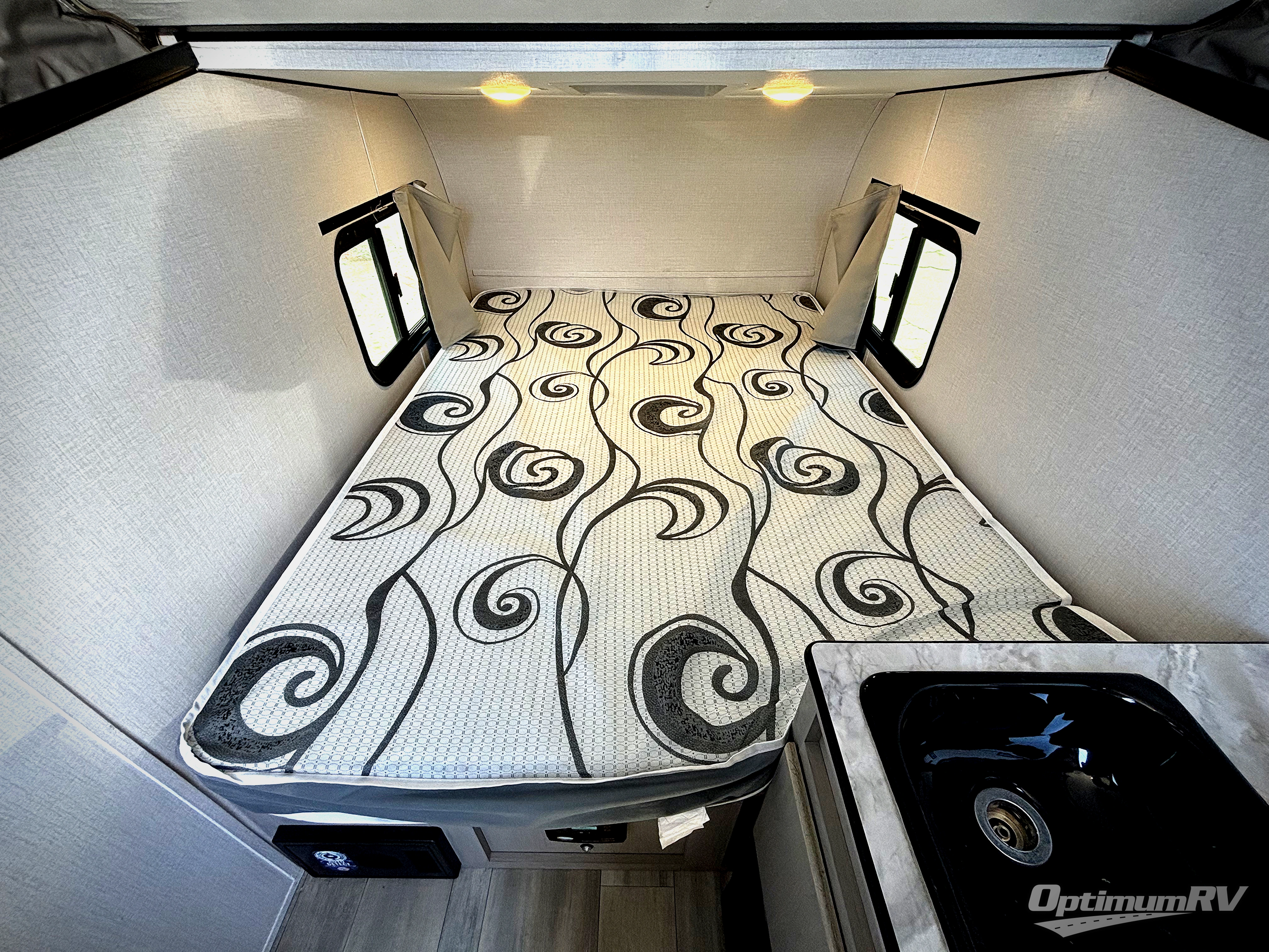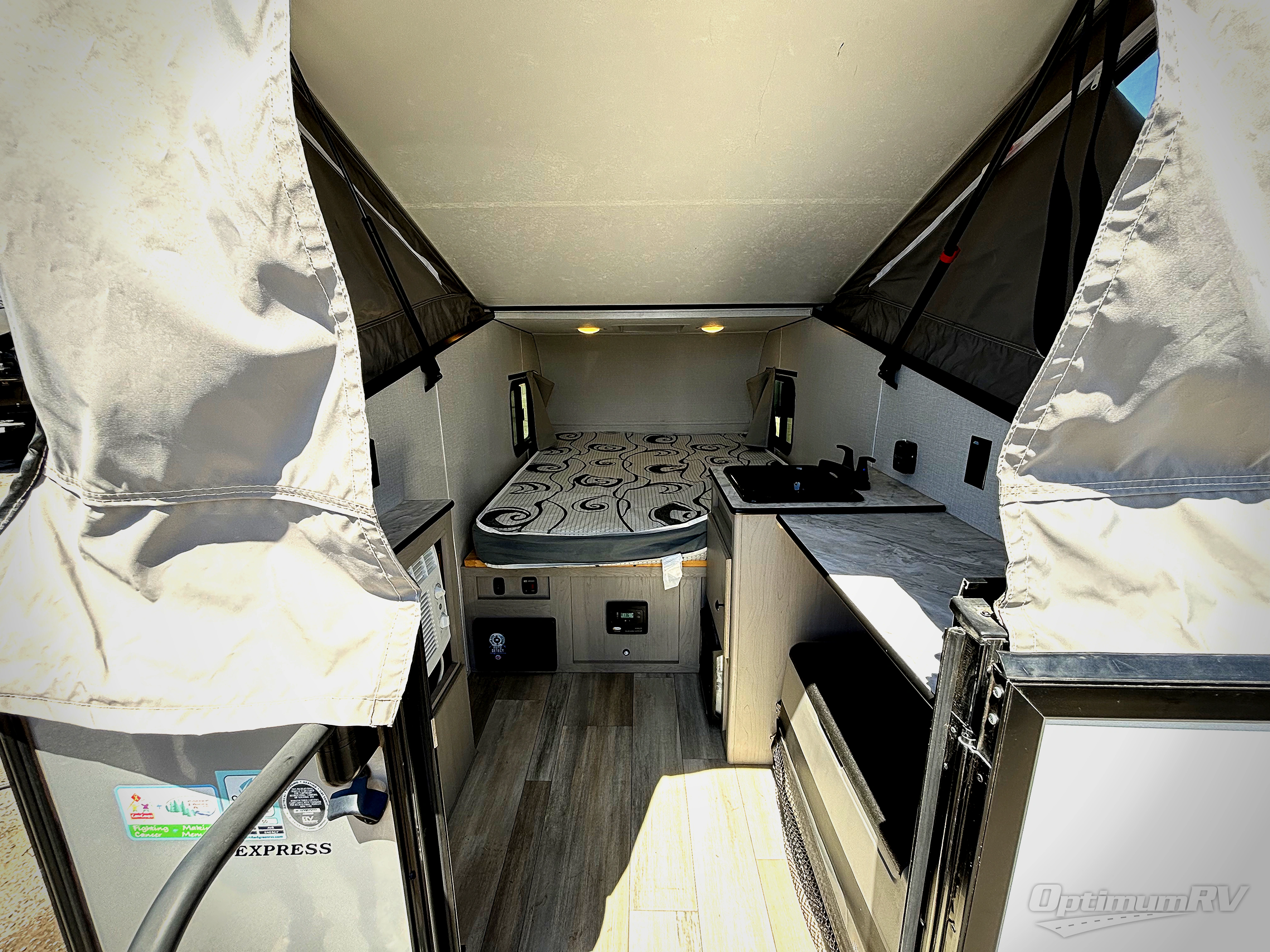 When you enjoy sleeping above ground while camping and getting away quickly, take this Express with you! You will have a 54" x 74" bed to sleep on, a bench seat to easily take your shoes off, plus a 20k BTU furnace to keep you warm during the colder camping months. You'll also love the LED exterior lights, the Wide Trac ultra lube spring axle for easy towing, plus the 5,000 BTU A/C to keep you cool. This model comes standard with the Off-Road Package that includes a flipped axle and 15" off-road tires for tougher terrain.