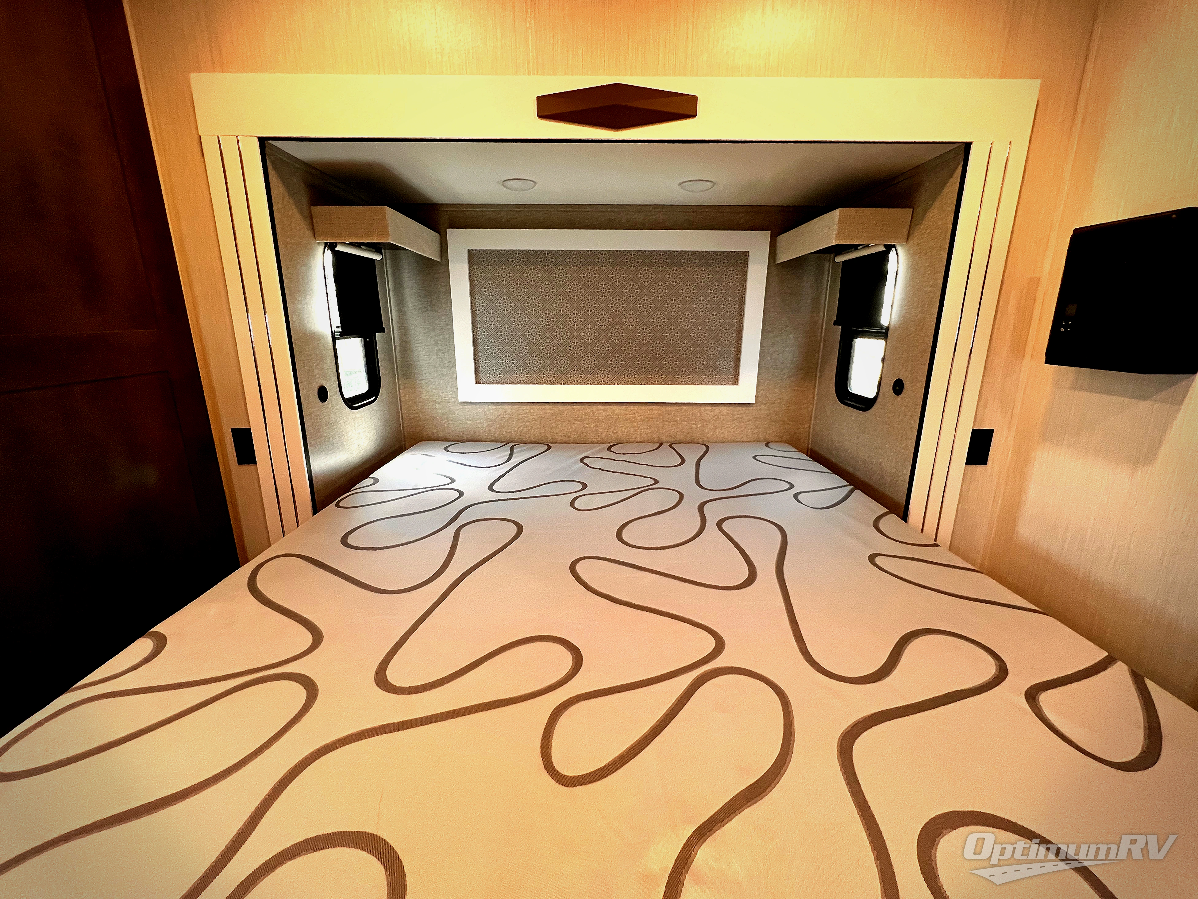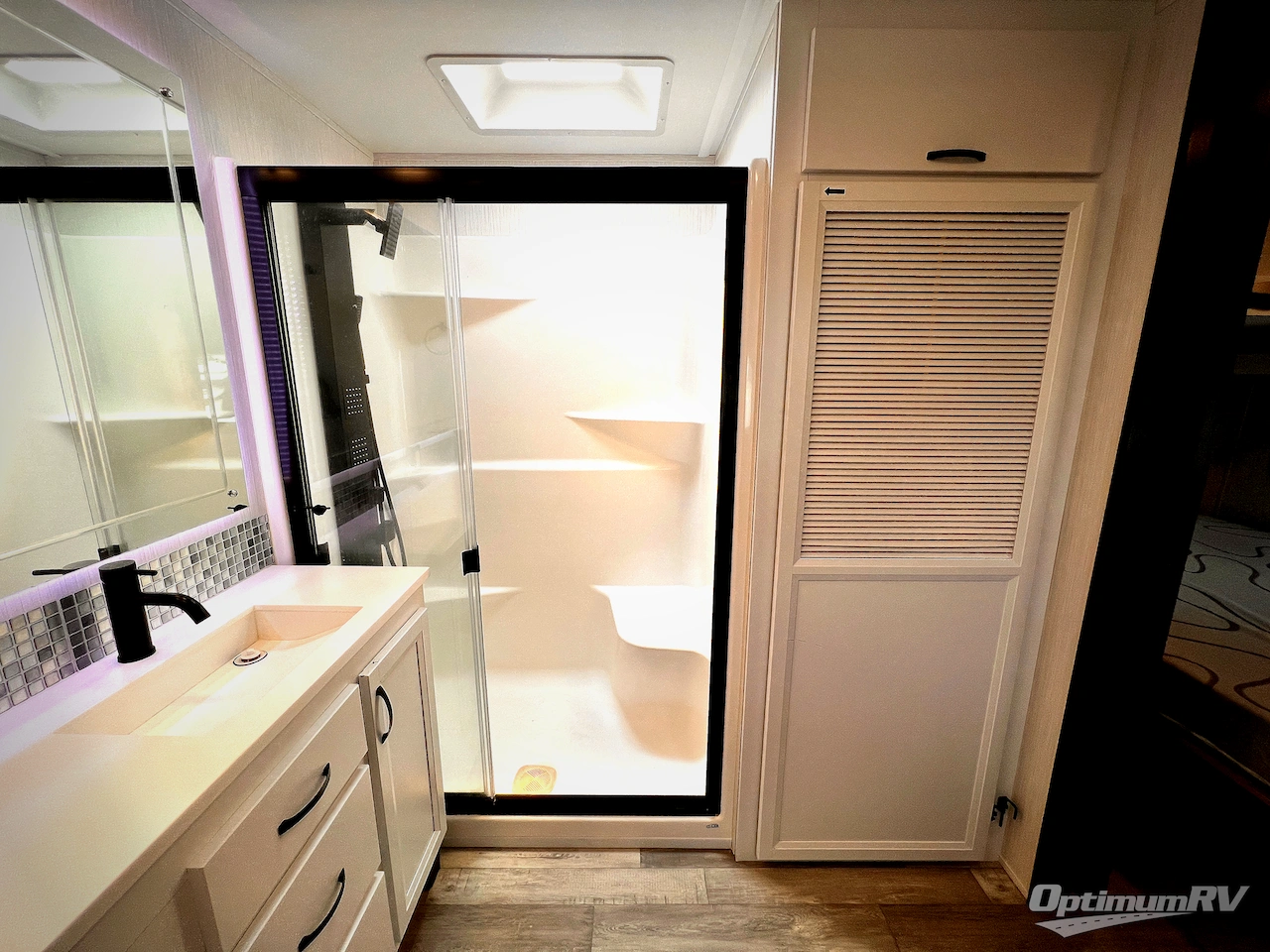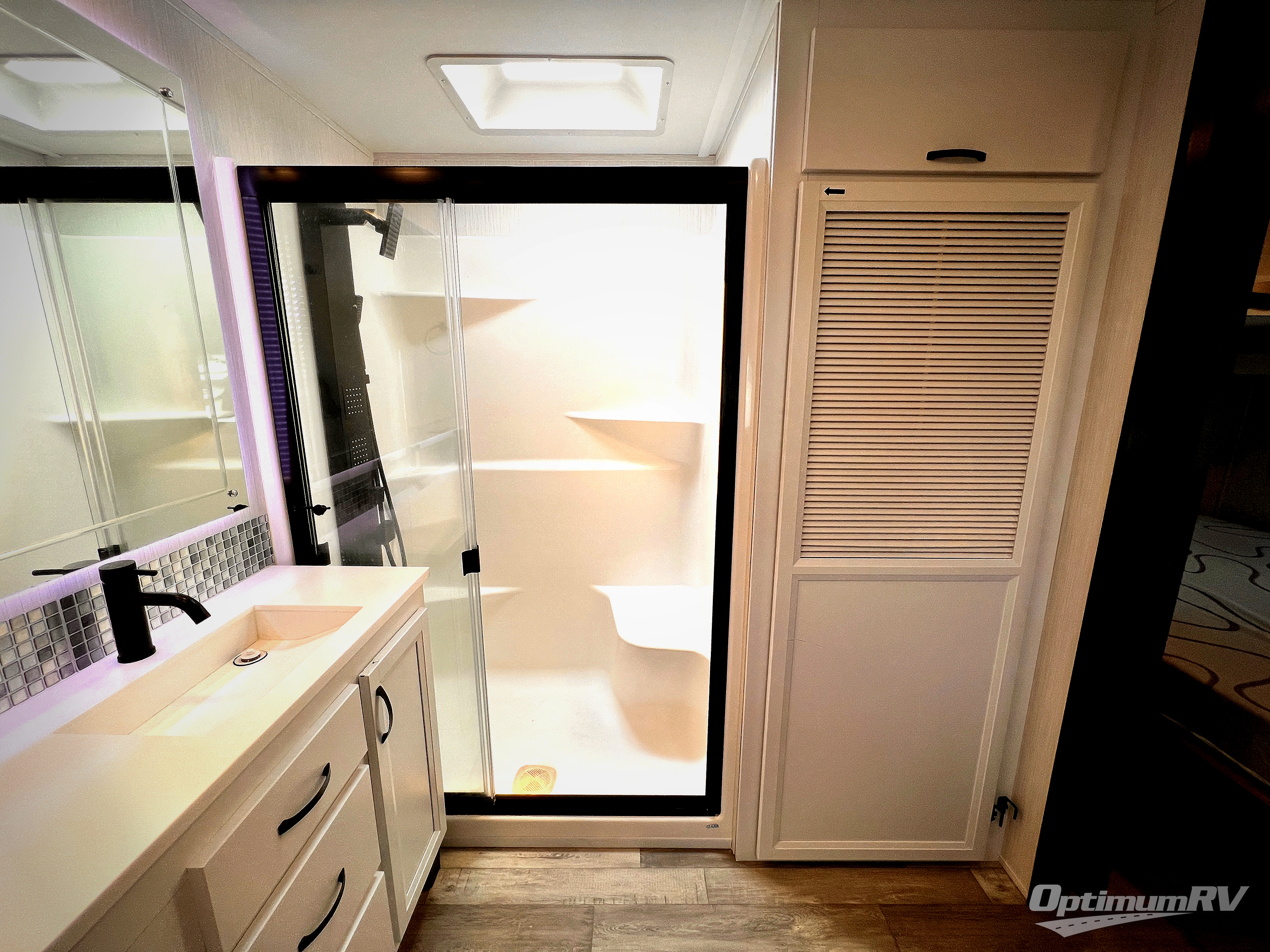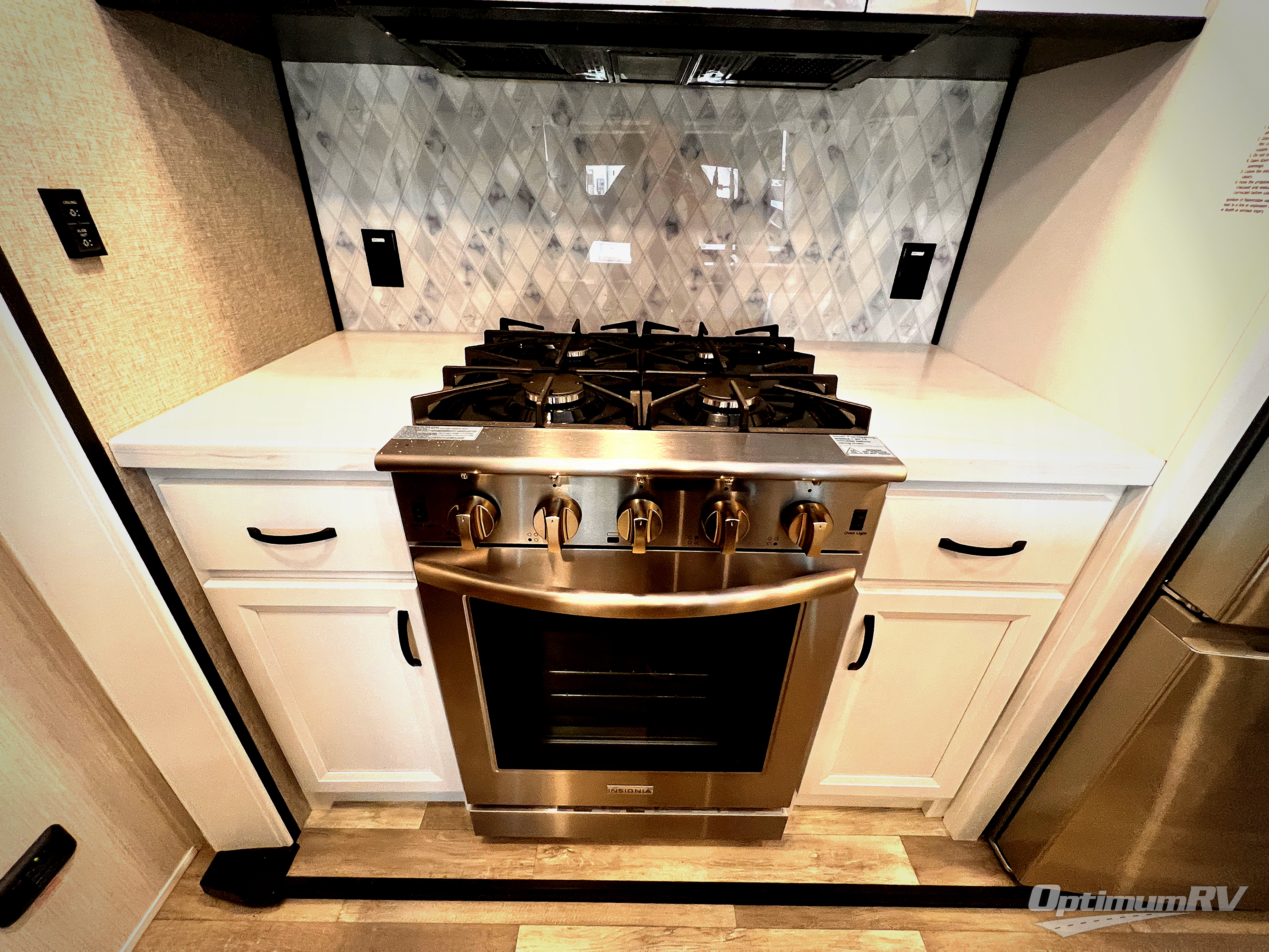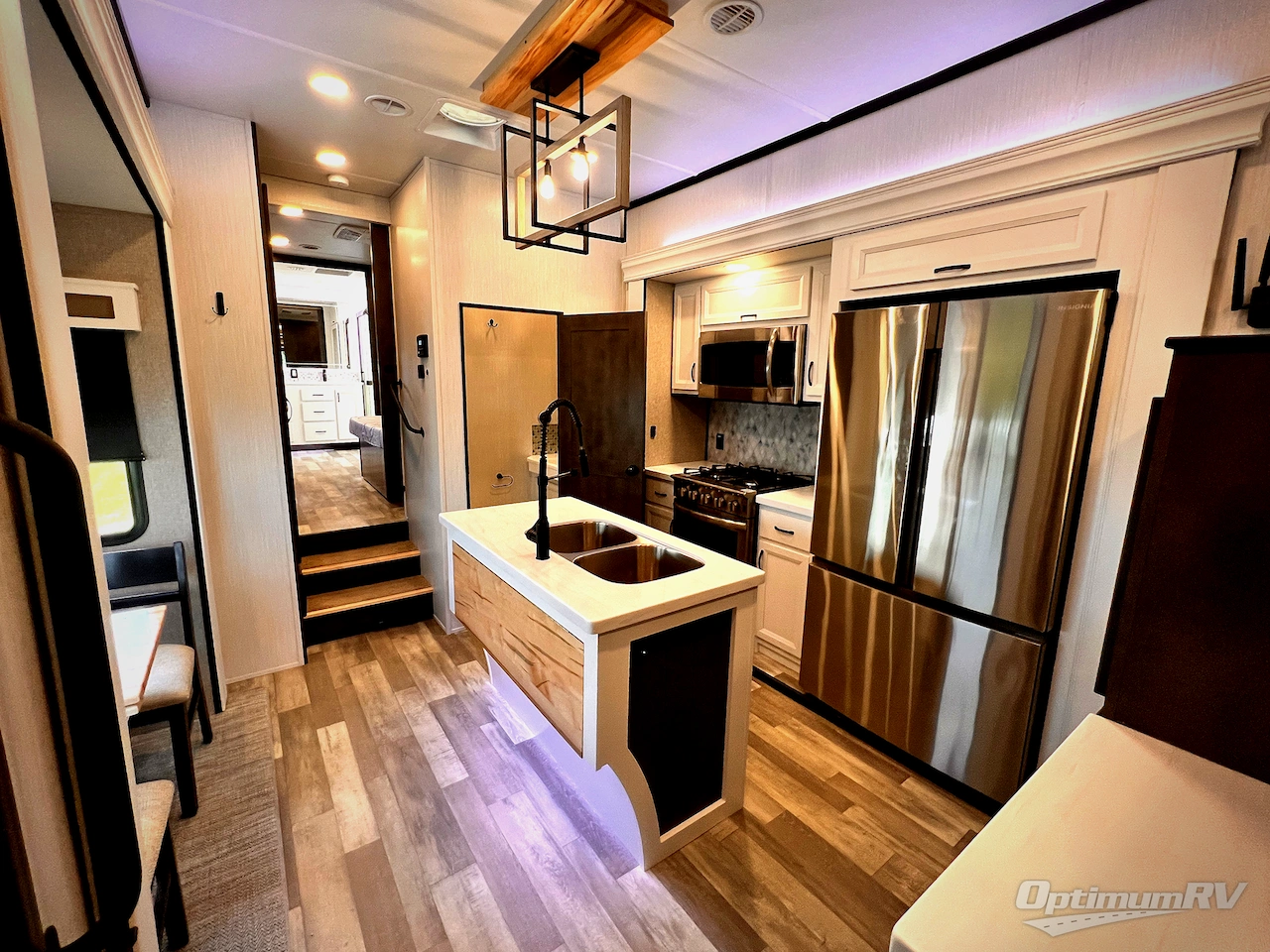 This fifth wheel has everything and then more! The front living area has opposing tri-fold sofas and power theater seating across from the front entertainment center with a fireplace and 50" flat screen TV. The chef can prepare their best meals with the kitchen island with a fold-down breakfast counter, and there is a 20 cu. ft. stainless steel refrigerator for food storage. Enjoy your meals and the extra space provided with the free standing table slide. The master suite has a king bed slide to lay your head at night and access to the full rear bathroom which has a drop-down storage, a shower with a seat, a linen closet, a closet prepped to add an optional washer and dryer, and a dual sink vanity. And the convenient half bath can be traded out for an optional bonus pantry if you don't need the half bath!