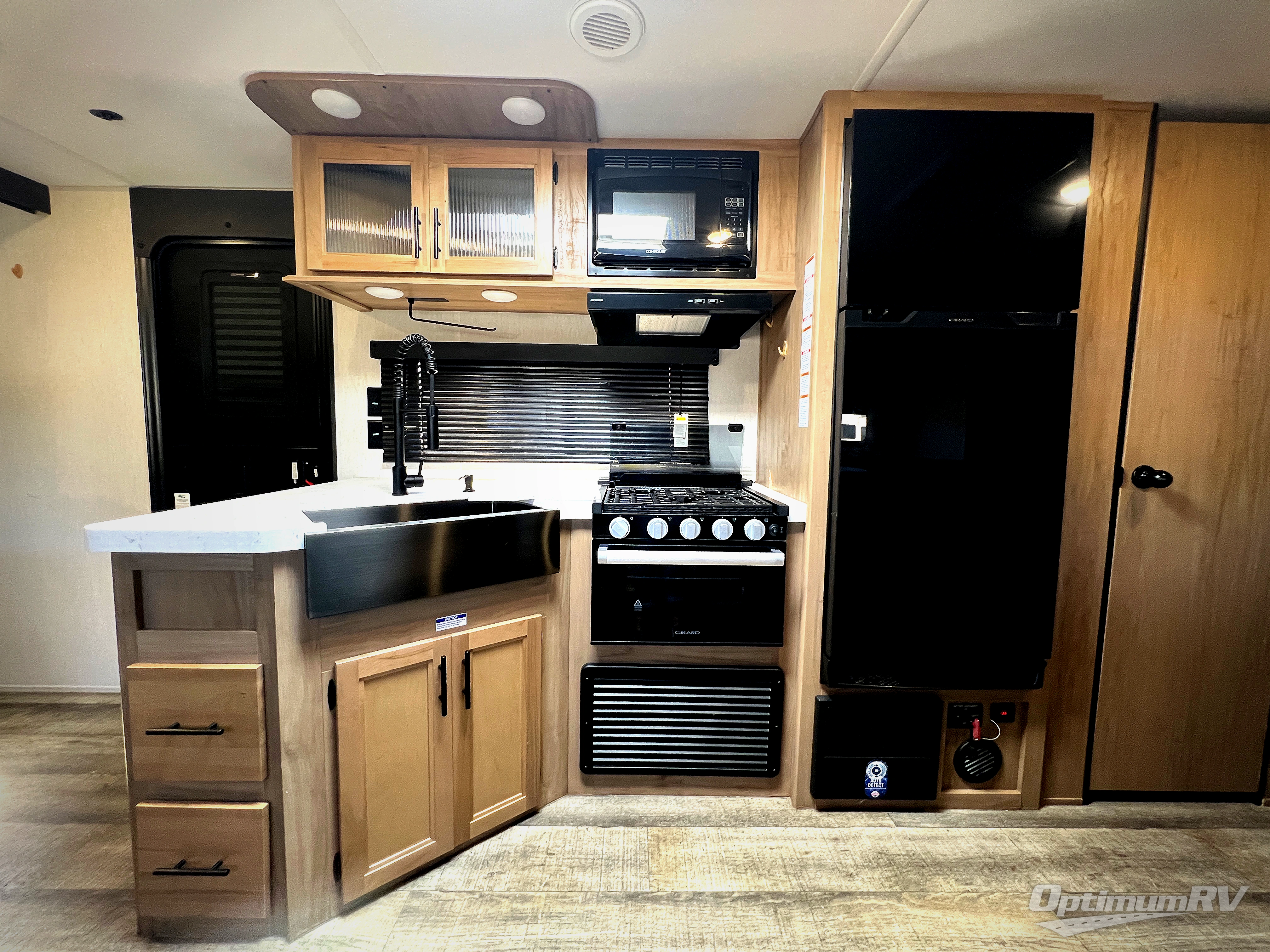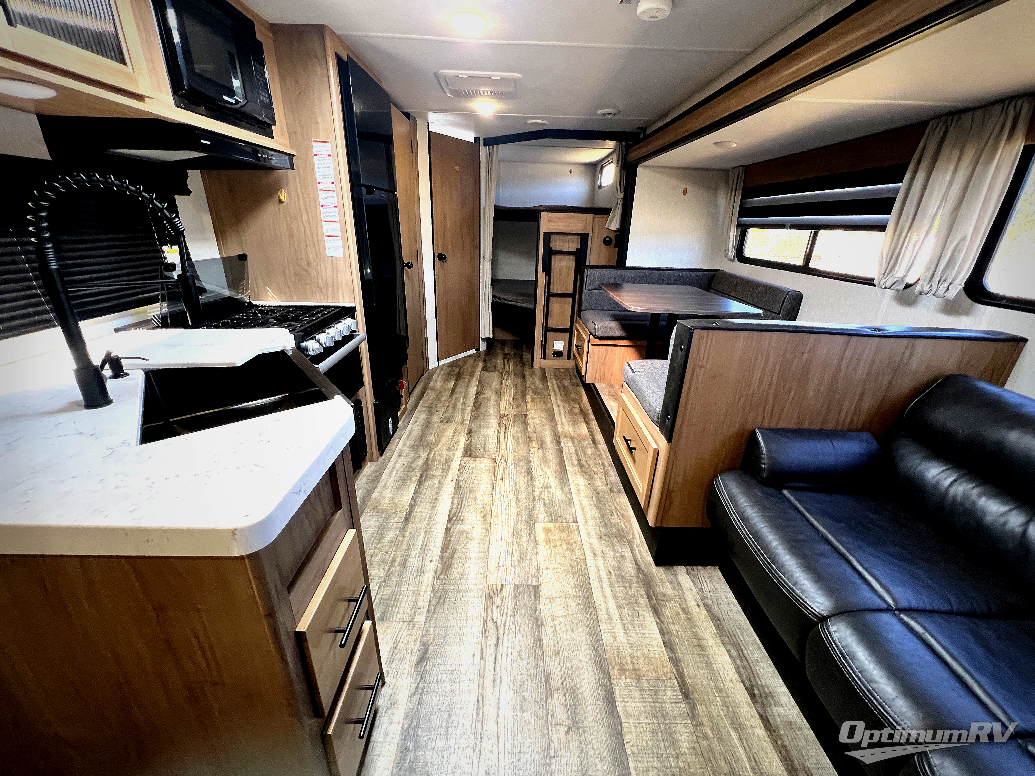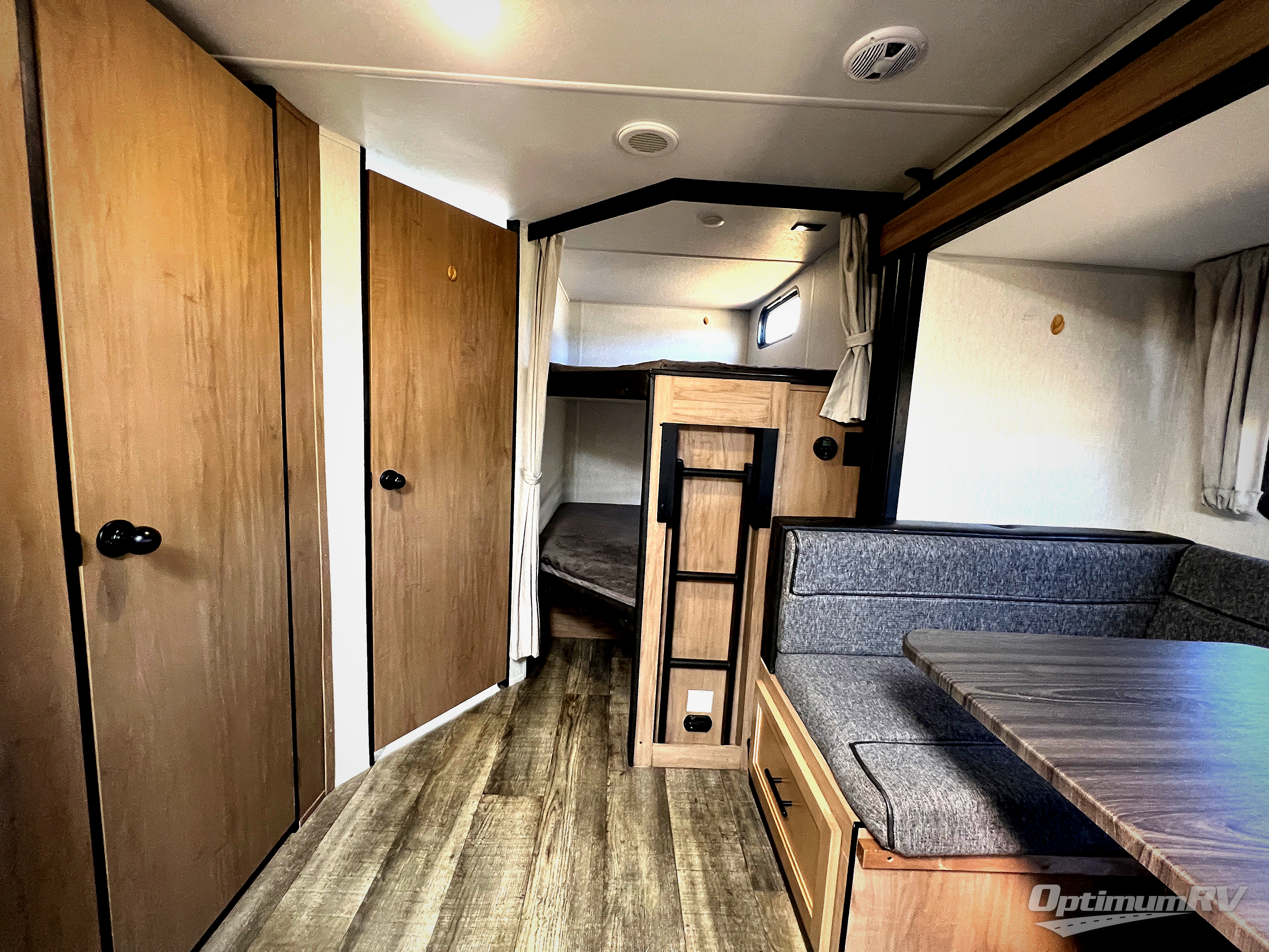 Come on inside this Cherokee Grey Wolf travel trailer and experience the convenience of a smooth flow of traffic in and out with two entry doors. The rear door leads into a full bath which is great for accessibility when outside and when you need to use the bathroom. Once inside, you will notice the large U-shaped dinette and the sofa which sit on the slide and create a spacious footprint for moving about, as well as great places to play games and socialize with your friends and family. A walk-in pantry provides plenty of storage allowing you to stock up on your favorite snacks and dry goods for your family adventure. At night, there is sleeping space for everyone between the double-size bunks and the queen-size bed, plus the furniture.
