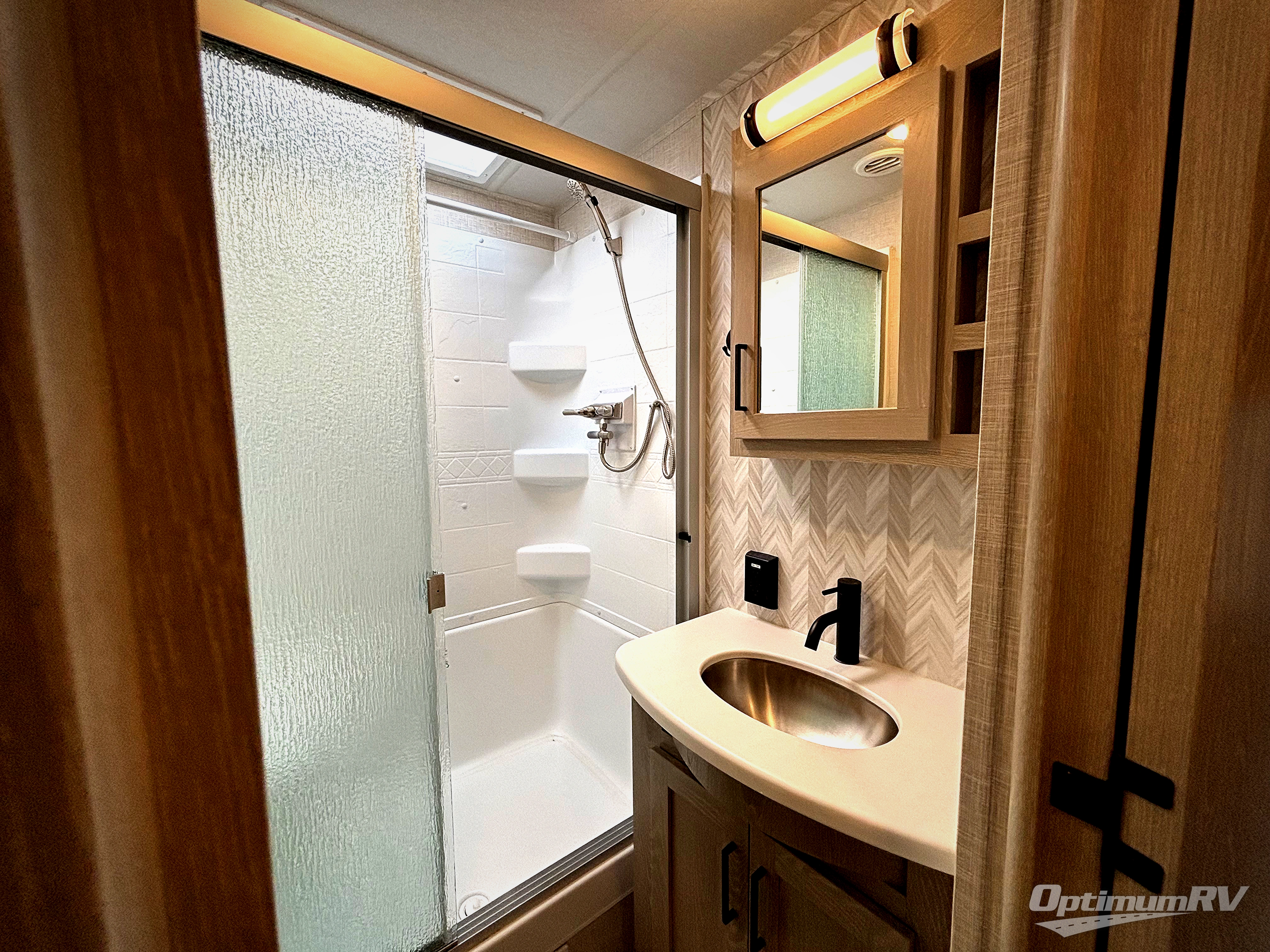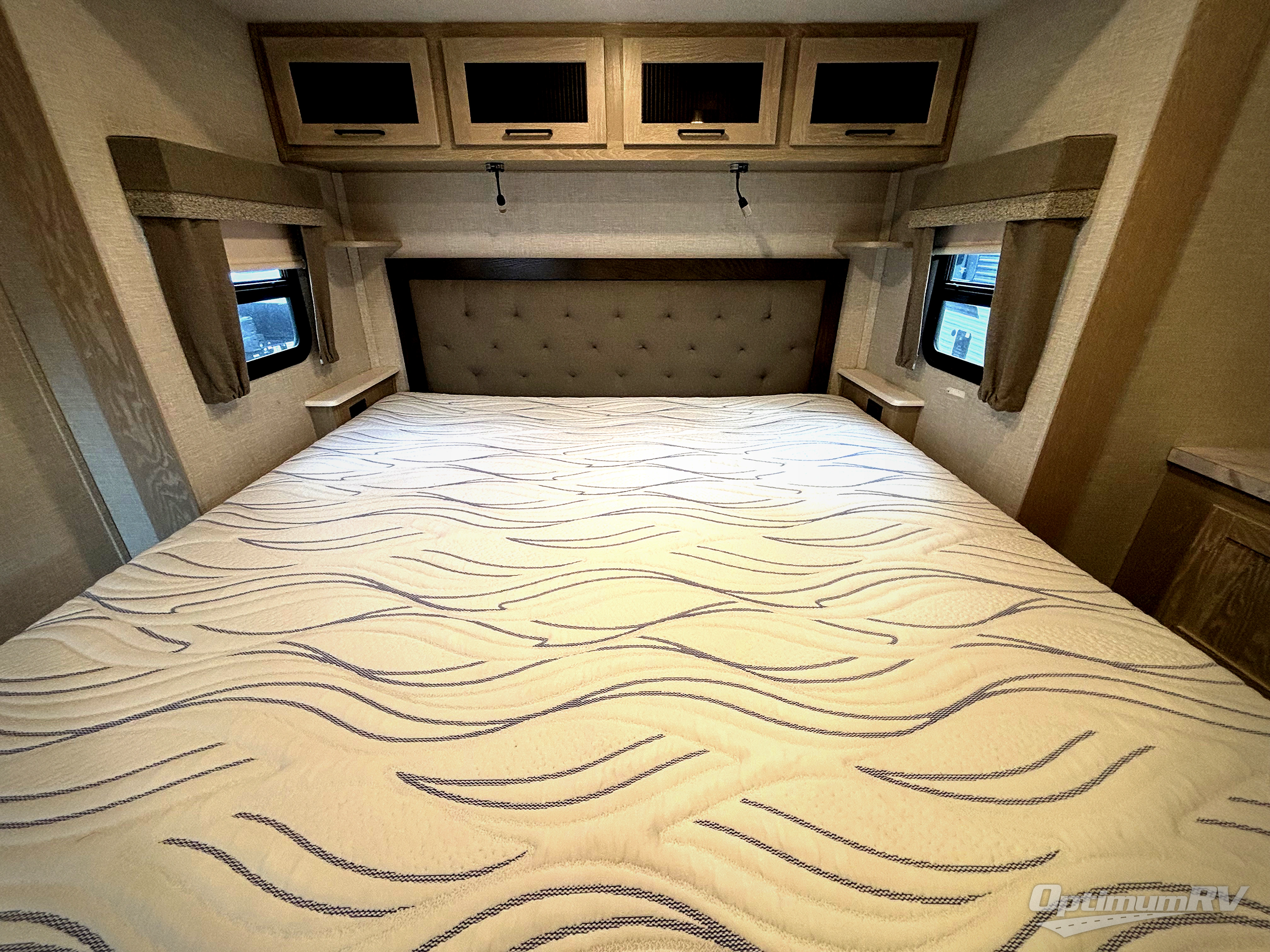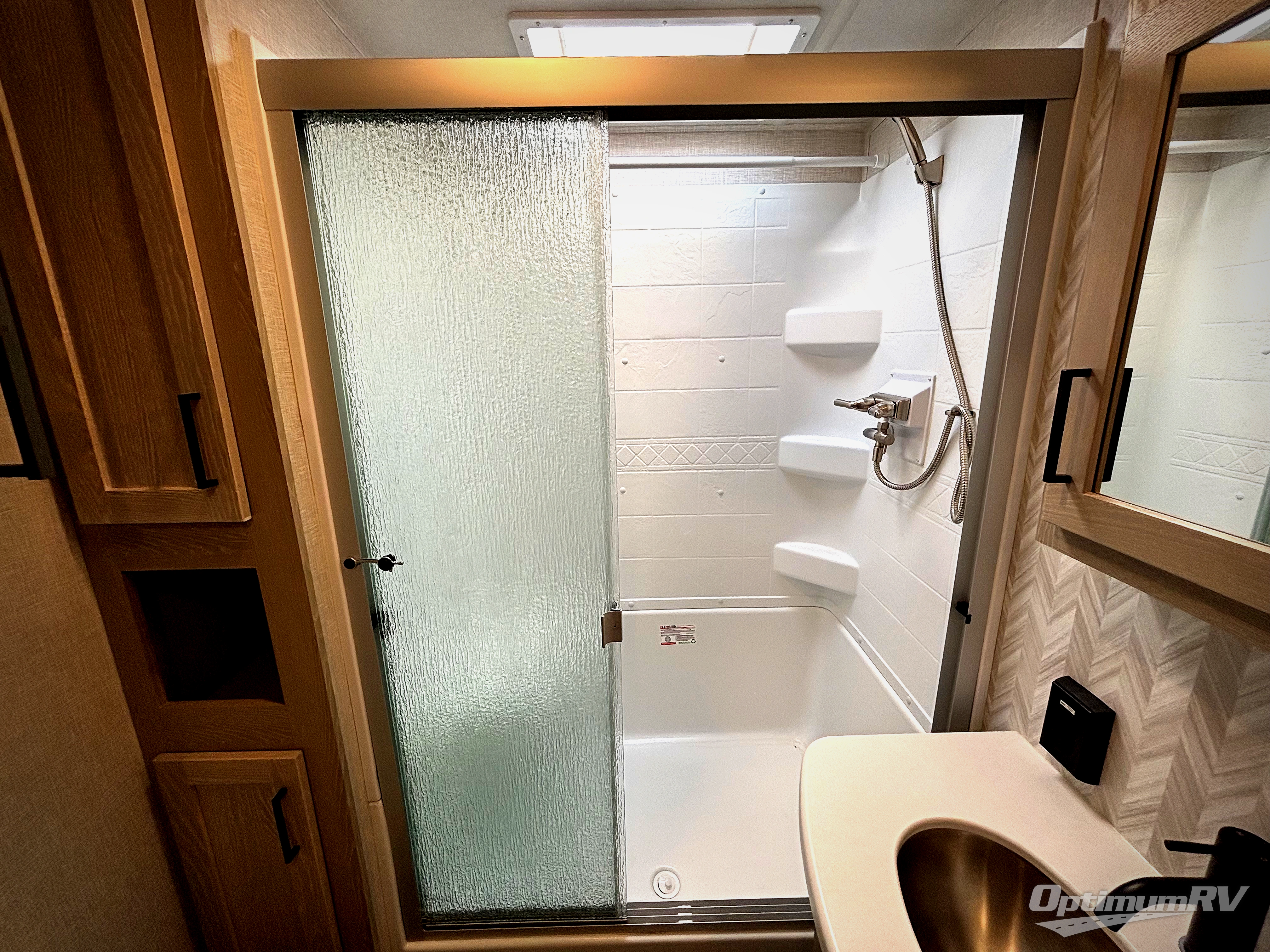The large windows in the rear and door side slide will bring nature's scenery indoors with this travel trailer! Everyone can relax together in the rear living area with the 76" hide-a-bed sofa and the 60" theater seating across from the entertainment center with a fireplace. Meal prepping will be even easier with the kitchen island, and the 39" booth dinette is a comfortable place to enjoy your meals. The full bathroom has a shower with a seat and a linen closet to keep your towels close. You will feel well rested each morning after sleeping on the king bed slide in the front private bedroom which also has a wardrobe that is prepped to add an optional washer and dryer and an area to add an optional TV!