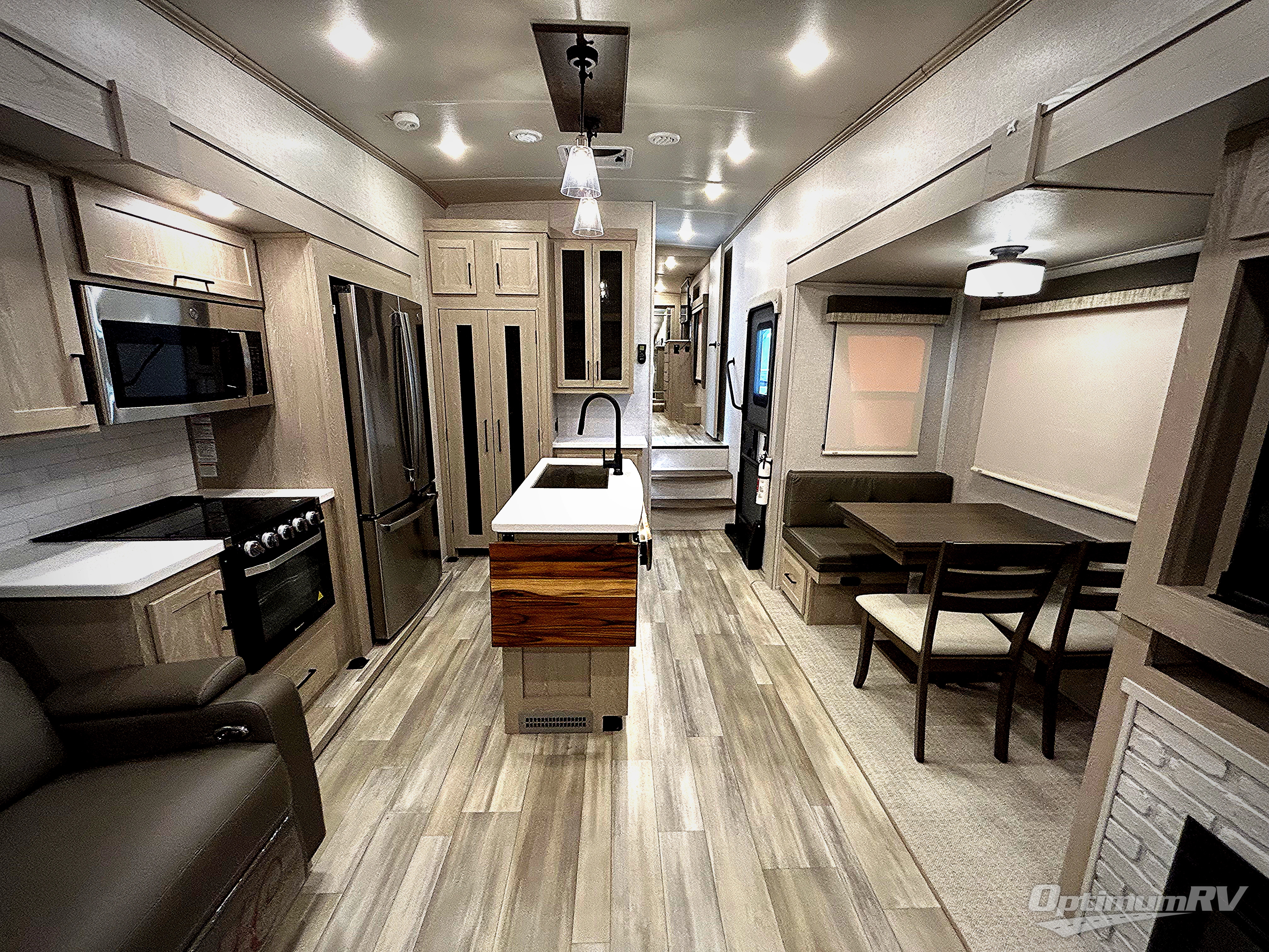 Meal prepping is made easy in this fifth wheel with a kitchen island! You can even prepare dinner outdoors at the outside kitchen with a refrigerator to keep your beverages cold while you cook. The booth & chairs dinette is big enough for everyone to gather around for game night, or some can choose to relax on either the rear 76" hide-a-bed sofa or 60" theater seating across from the entertainment center with a fireplace. The full bathroom has a shower with a seat to rinse the sand out of your hair and a linen closet close by to store your towels. Inside the front private bedroom is a king bed slide across from a dresser with the option to add a TV, as well as a front wardrobe with a shirt closet and an area to add an optional washer and dryer!