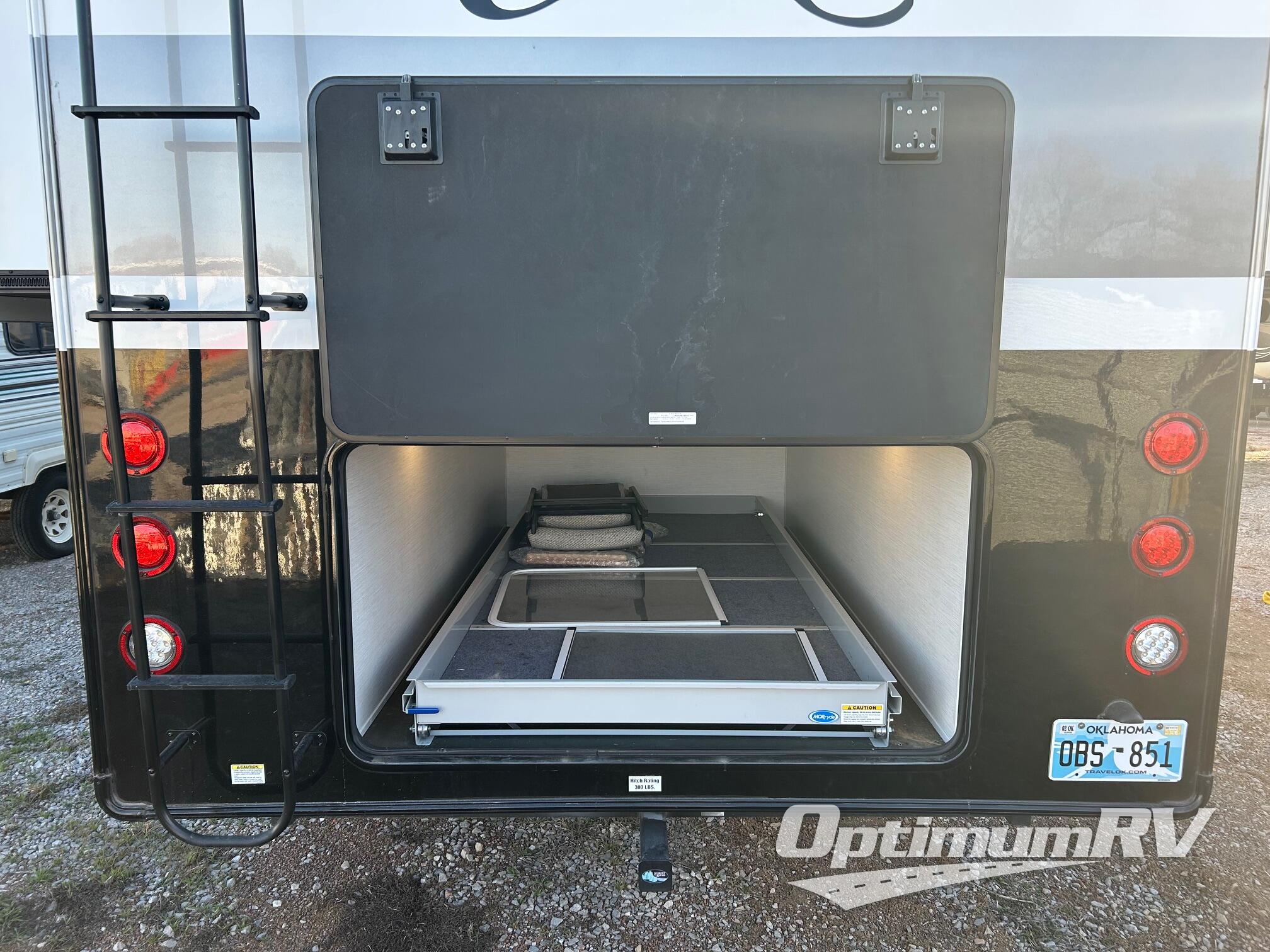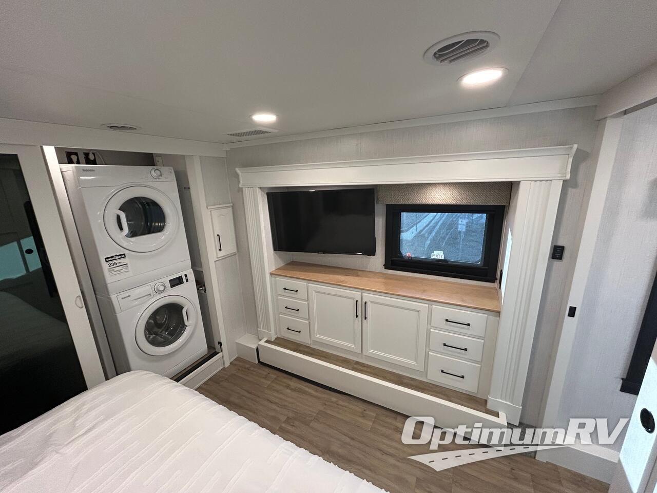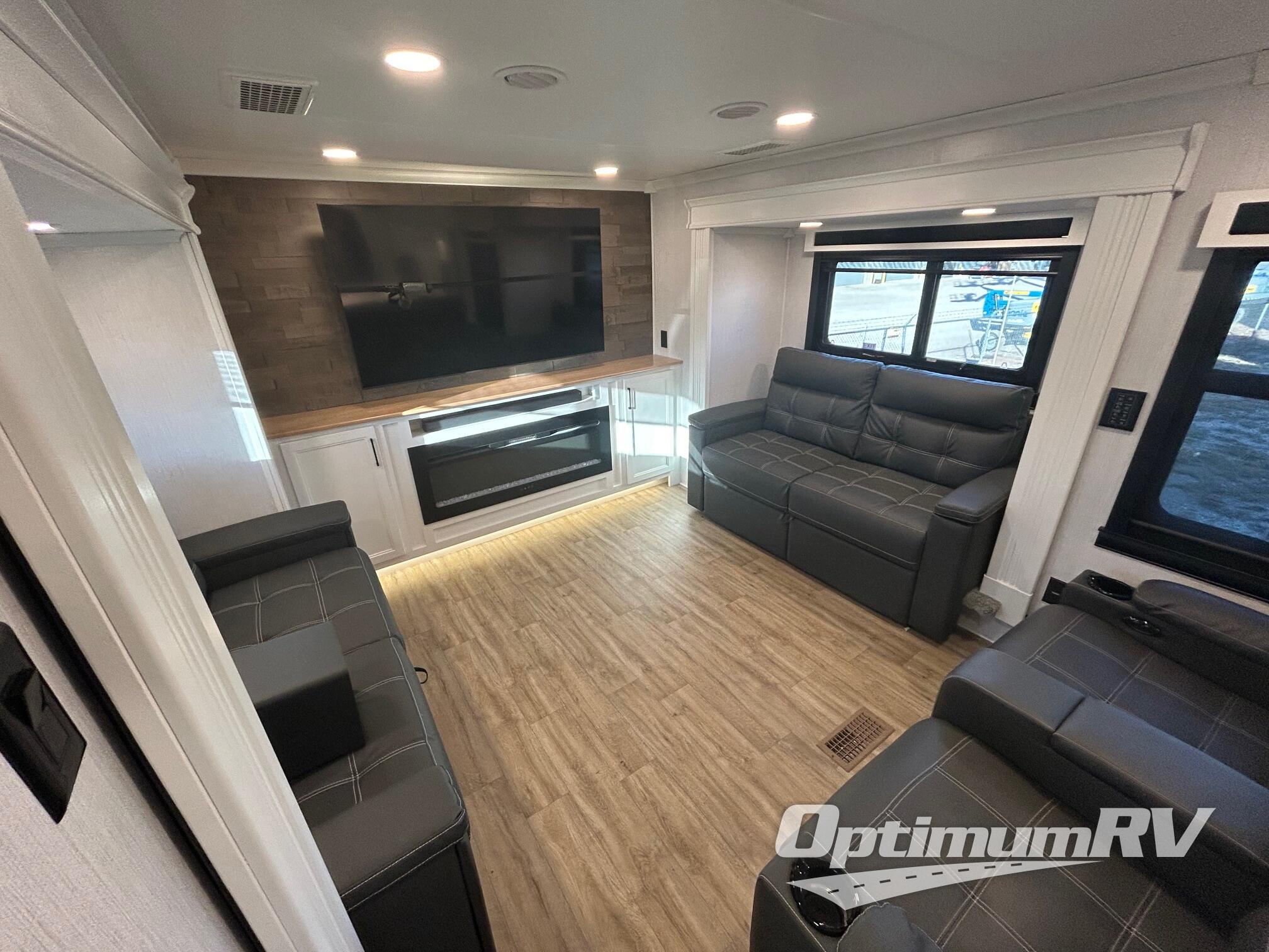 You will be completely impressed with this RiverStone fifth wheel! There is a private bedroom that includes a king-size bed, 40" LED TV, washer/dryer, dresser, and a mirrored wardrobe. The bedroom is right next to the full bathroom where you will find a dual-sink vanity, porcelain toilet with foot flush, shower, and linen closet. The kitchen has opposing slides that keep this space open, and there is a pull-out dinette that you can sit at when it's dinner time. Above the island there is a large Infiniti light, and the ceiling fan will keep the interior cool while you relax. Speaking of relaxing, there's no better place to do that than in the rear den. This separate living area has a theater sofa, two E-Z glide sofas, and an entertainment center with a 65" Samsung LED Smart TV and fireplace.