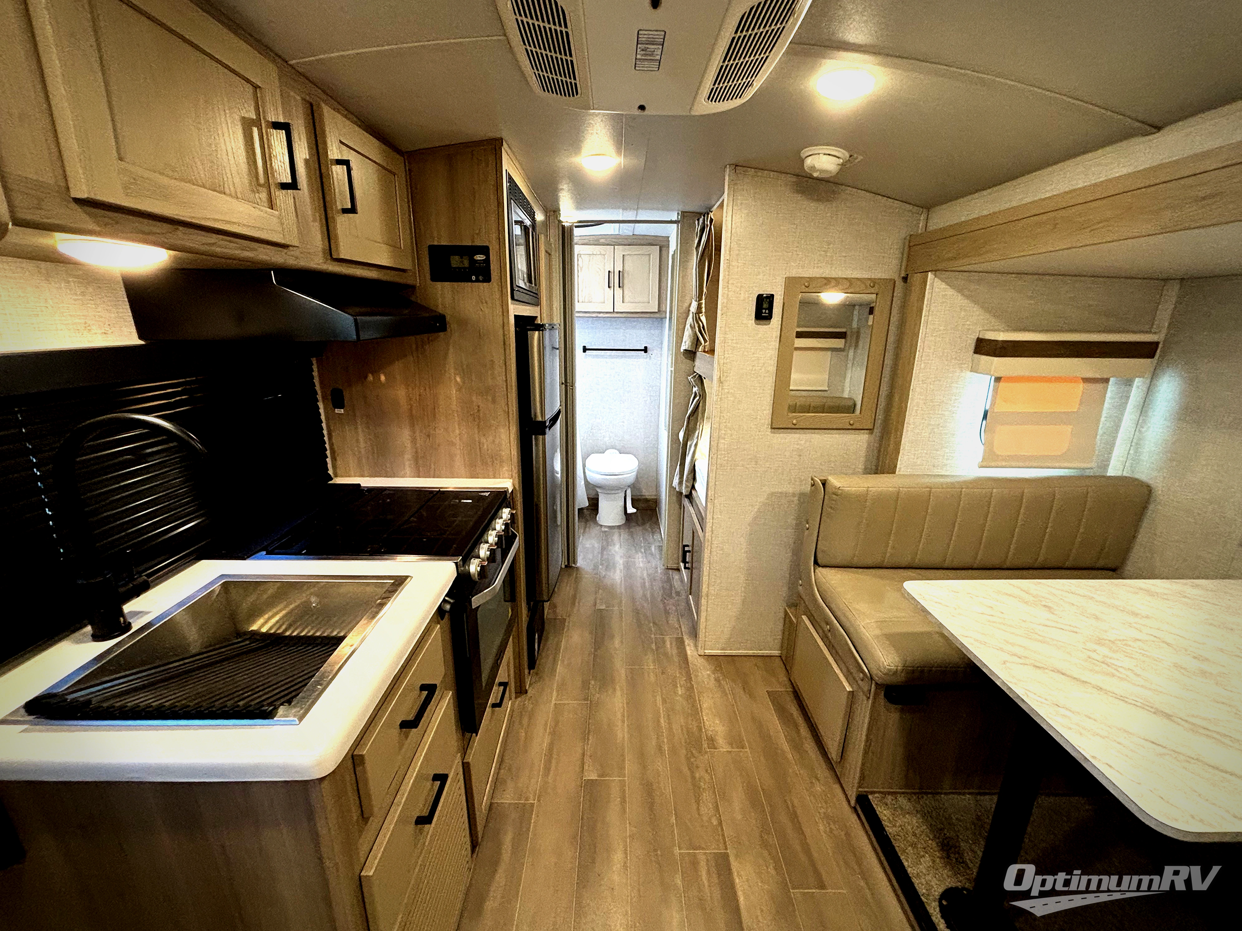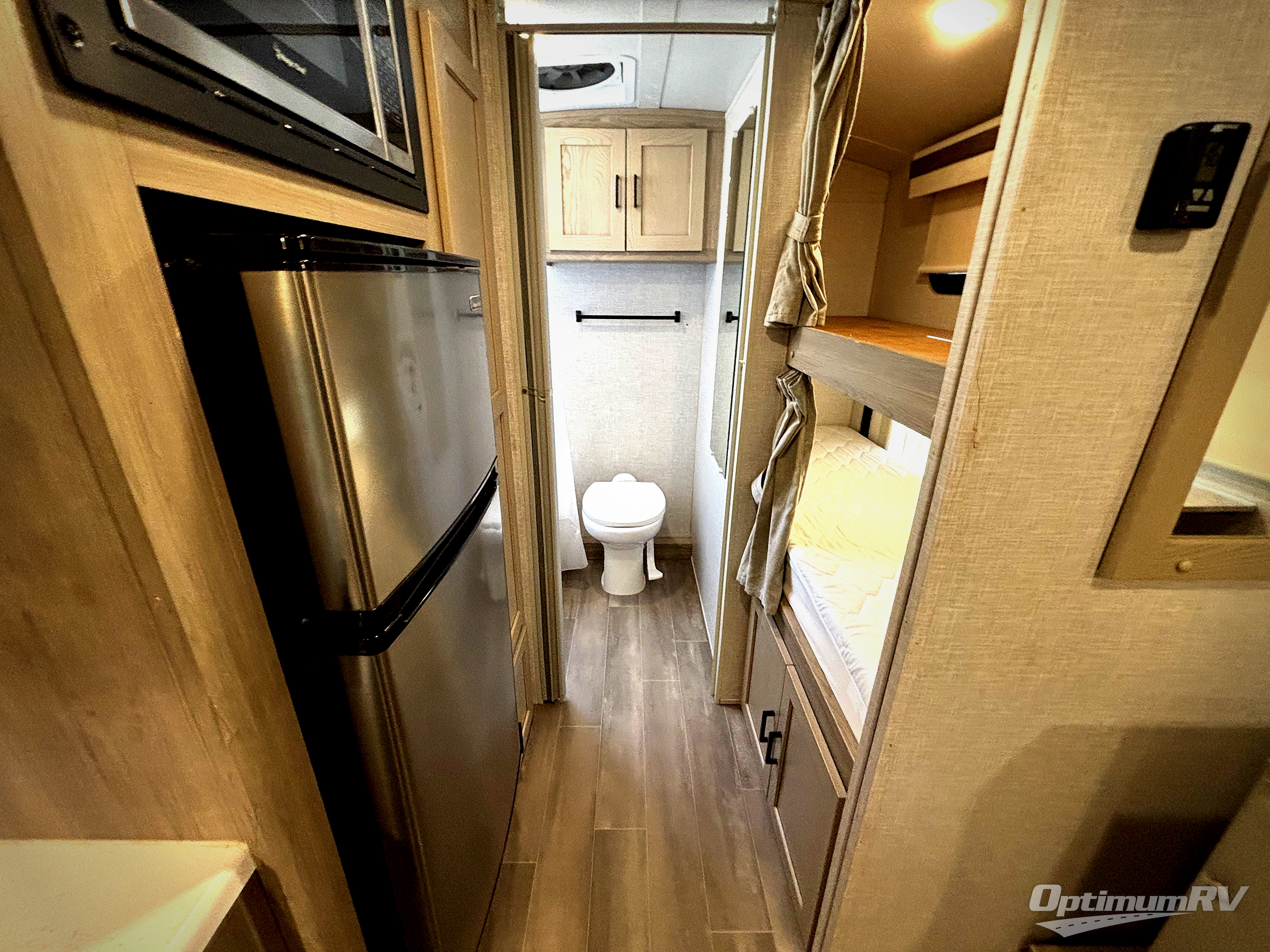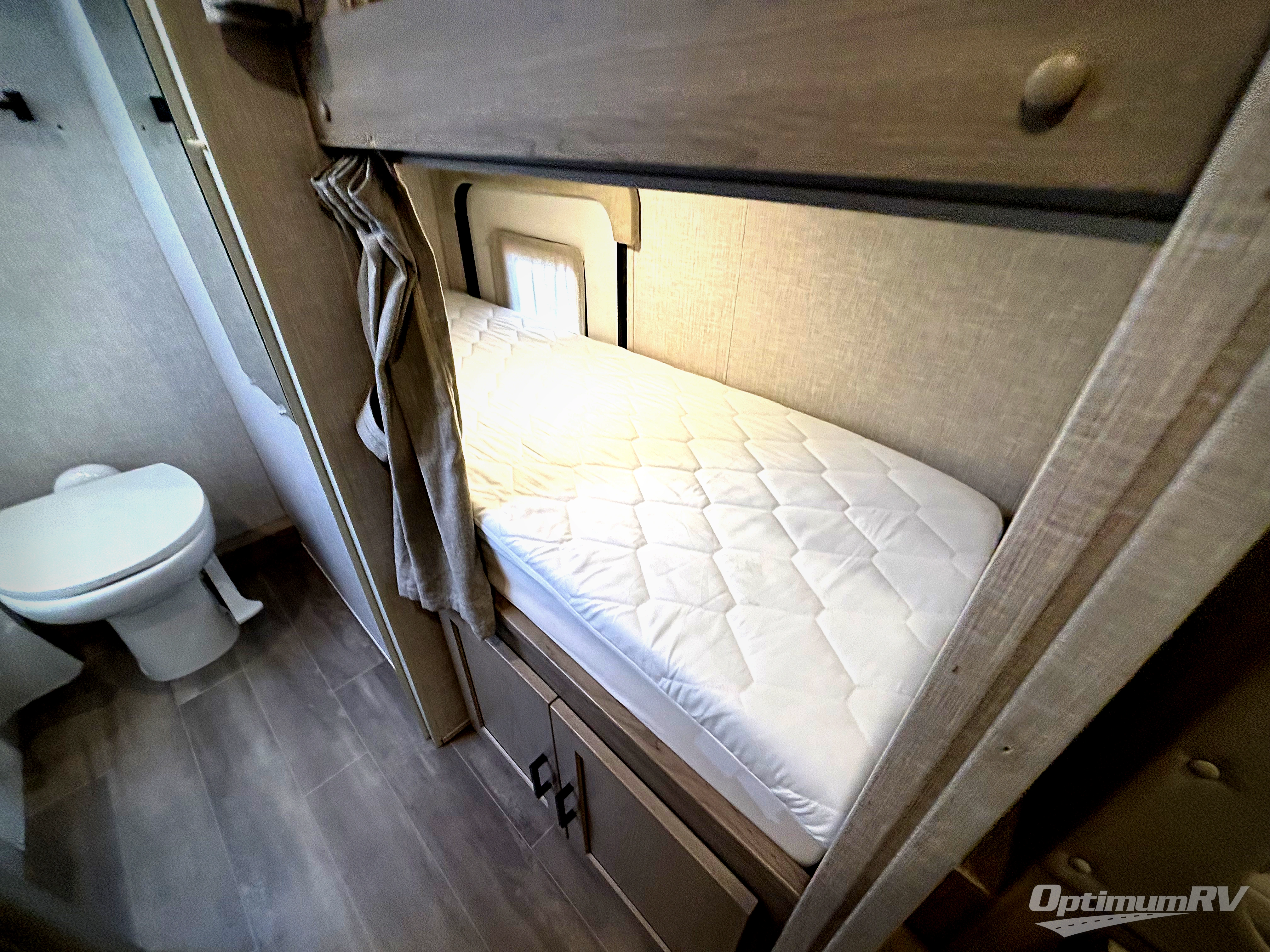 Your going to love camping with your family or friends in this largest bunk model in the GEO Pro lineup. The bunk beds will be perfect for little ones, while you take the front full-size bed. There is also a 44" booth dinette within the slide out for additional sleeping and seating space. The kitchen includes everything the chef will need to prepare meals each day, including a three burner cooktop, a microwave oven, and a 12V refrigerator for perishables. If the weather is nice, you may just find the chef outdoors cooking on the outside griddle under the 14' power awning. And check out the exterior bike door that will be perfect for bikes, luggage, or extra camp gear!
