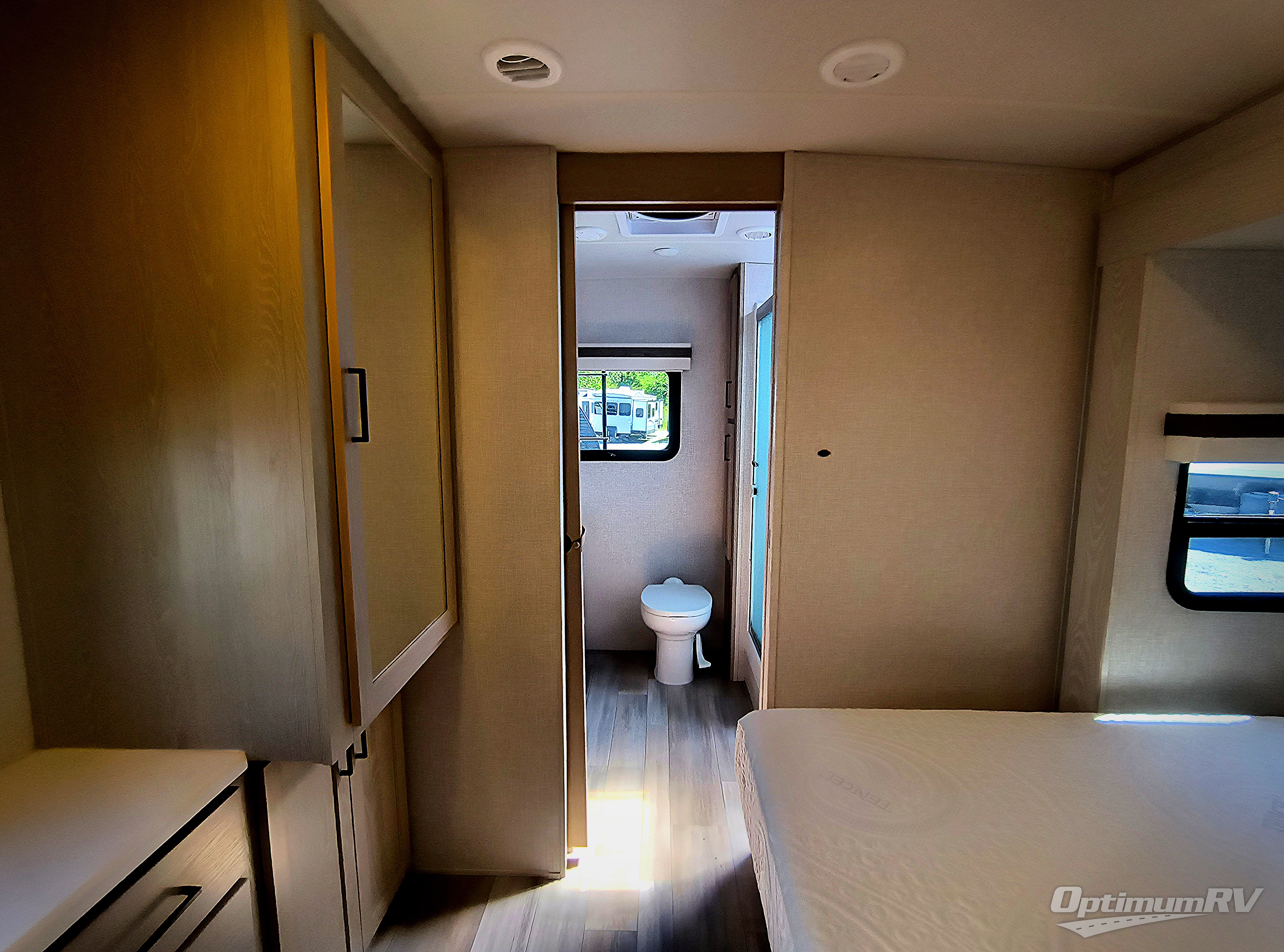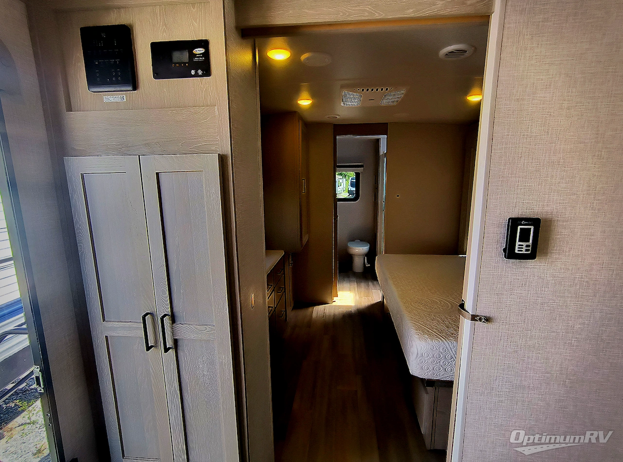 This front kitchen, couple's trailer is ready for adventure when you are! Once you arrive at your destination, prepare a quick lunch on the outside griddle, and enjoy the shade provided by the 19' power awning. You can eat outside, or inside at the counter with stools. The theatre seat will make this travel trailer feel more like home, and the double slides provide more space to stretch out. Within the master bedroom you'll find a king bed, a large wardrobe and a dresser, plus an optional TV. And check out the full rear bath with dual bath sinks and a shower with a seat! Now, that's what I call comfort!