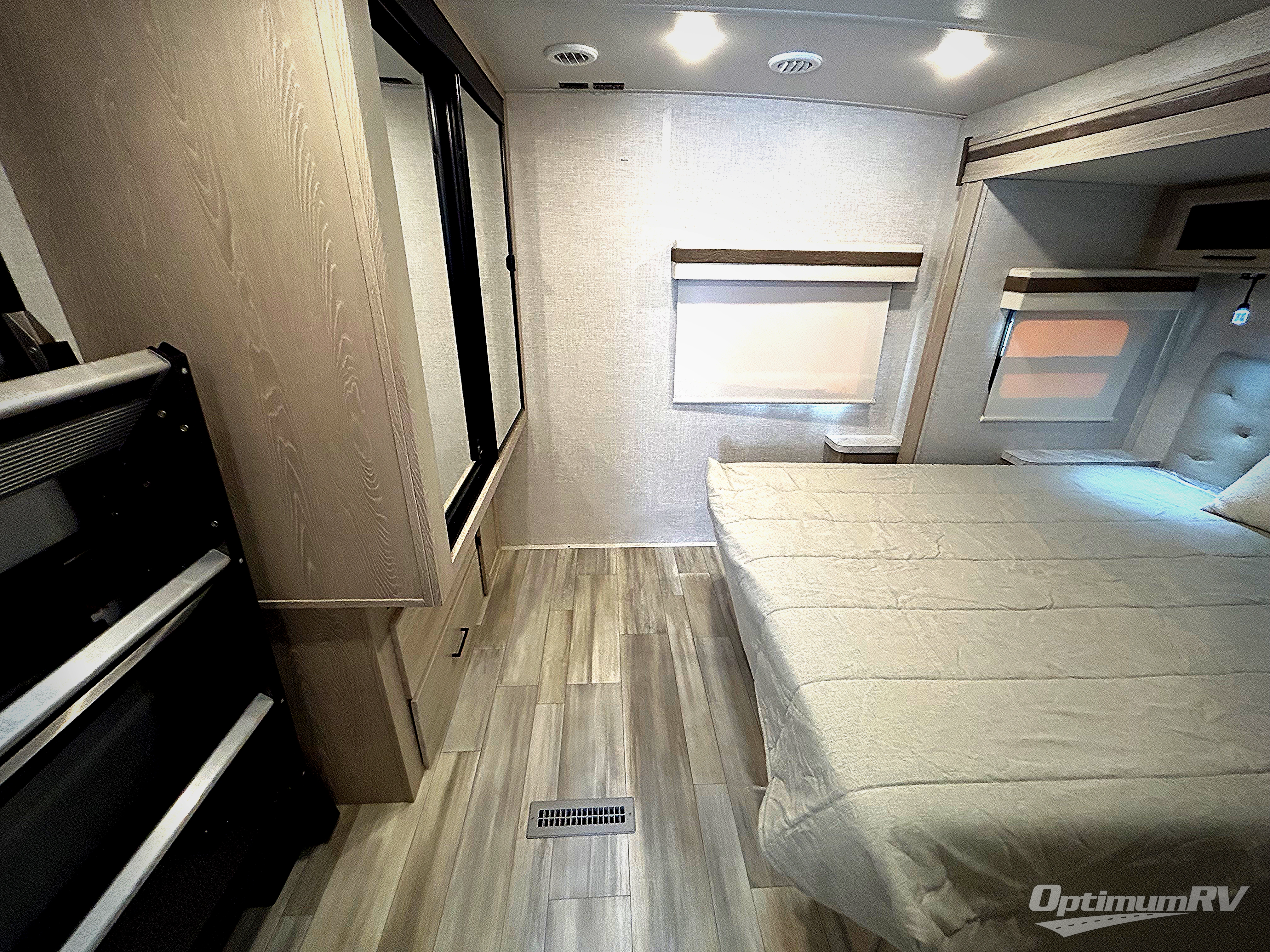 When you are outside this trailer you can enjoy the protection from the 21' power awning, and whip up a meal using the outside griddle. You will find exterior storage for your extra gear, and a ladder on the rear. You get to choose which entrance to step up into, be it the spacious rear bedroom with a queen bed slide and a wardrobe, or the main entry into the kitchen and living area. The furniture slide includes a booth dinette to eat your meals at, and theater seating to watch the LED TV with fireplace below. And the cook will love the front kitchen with extra counter space, and the appliances are nearby to make warm meals, and the pantry is next to the entry allowing you to grab a snack on your way out for a hike.