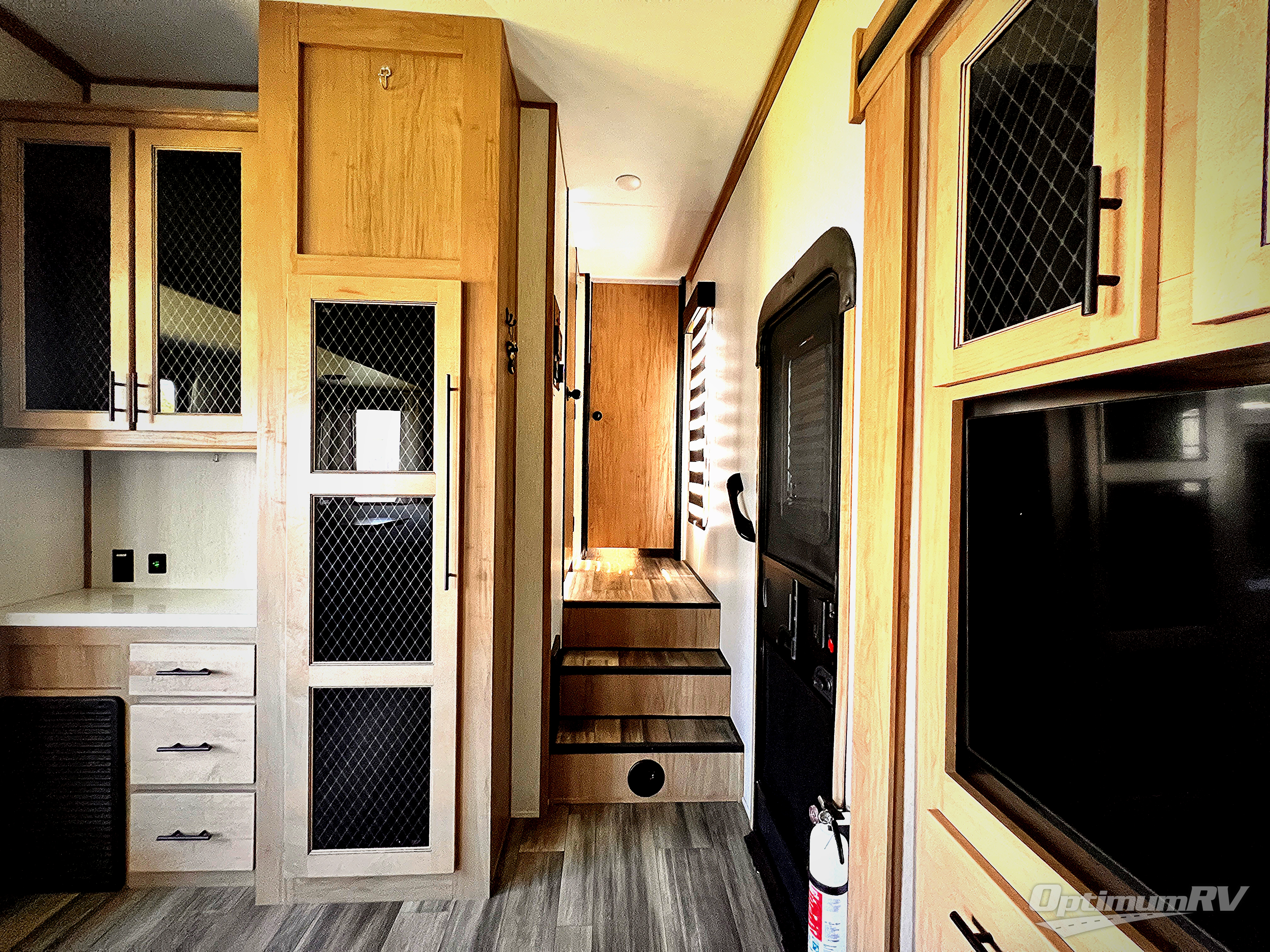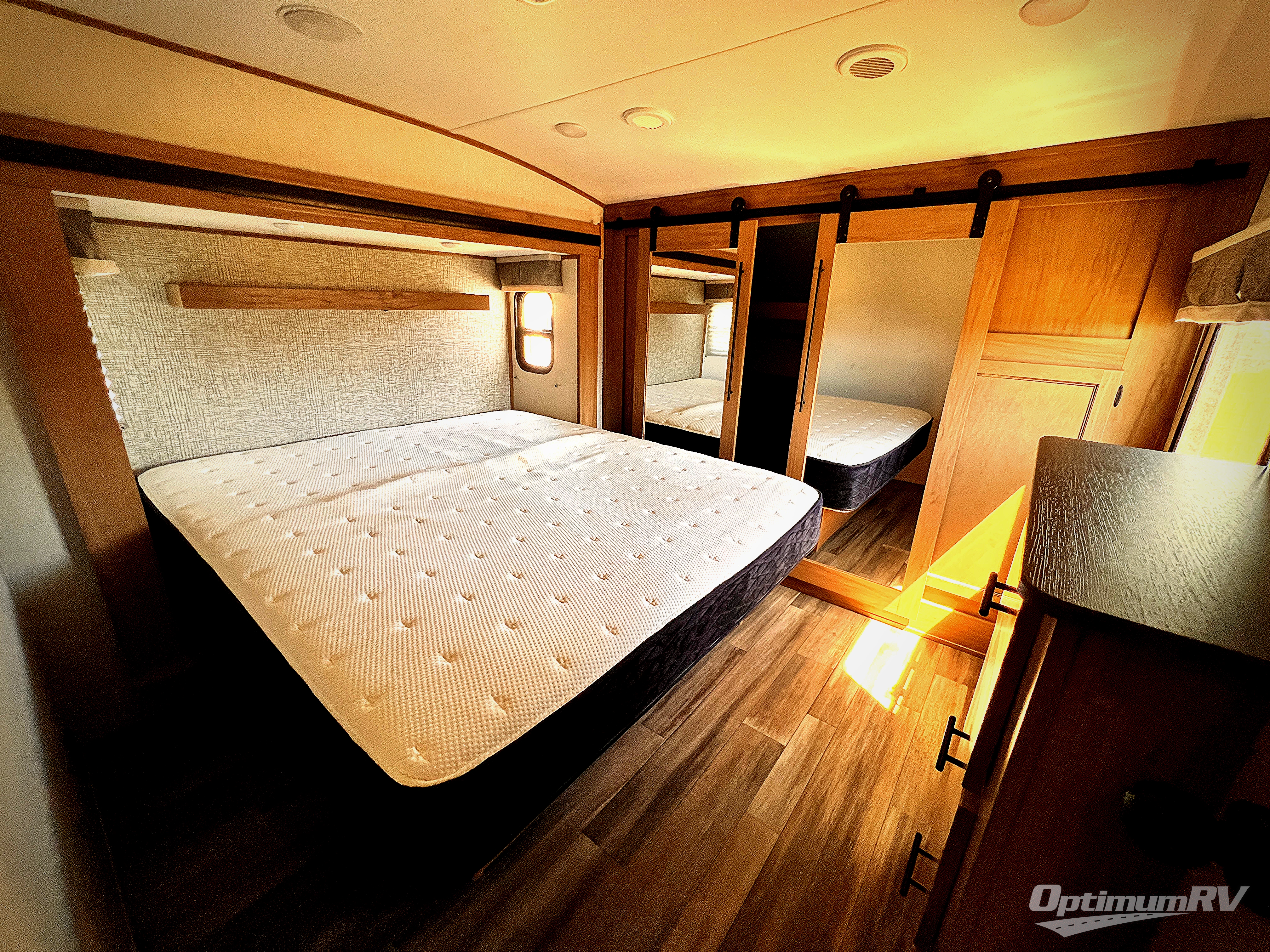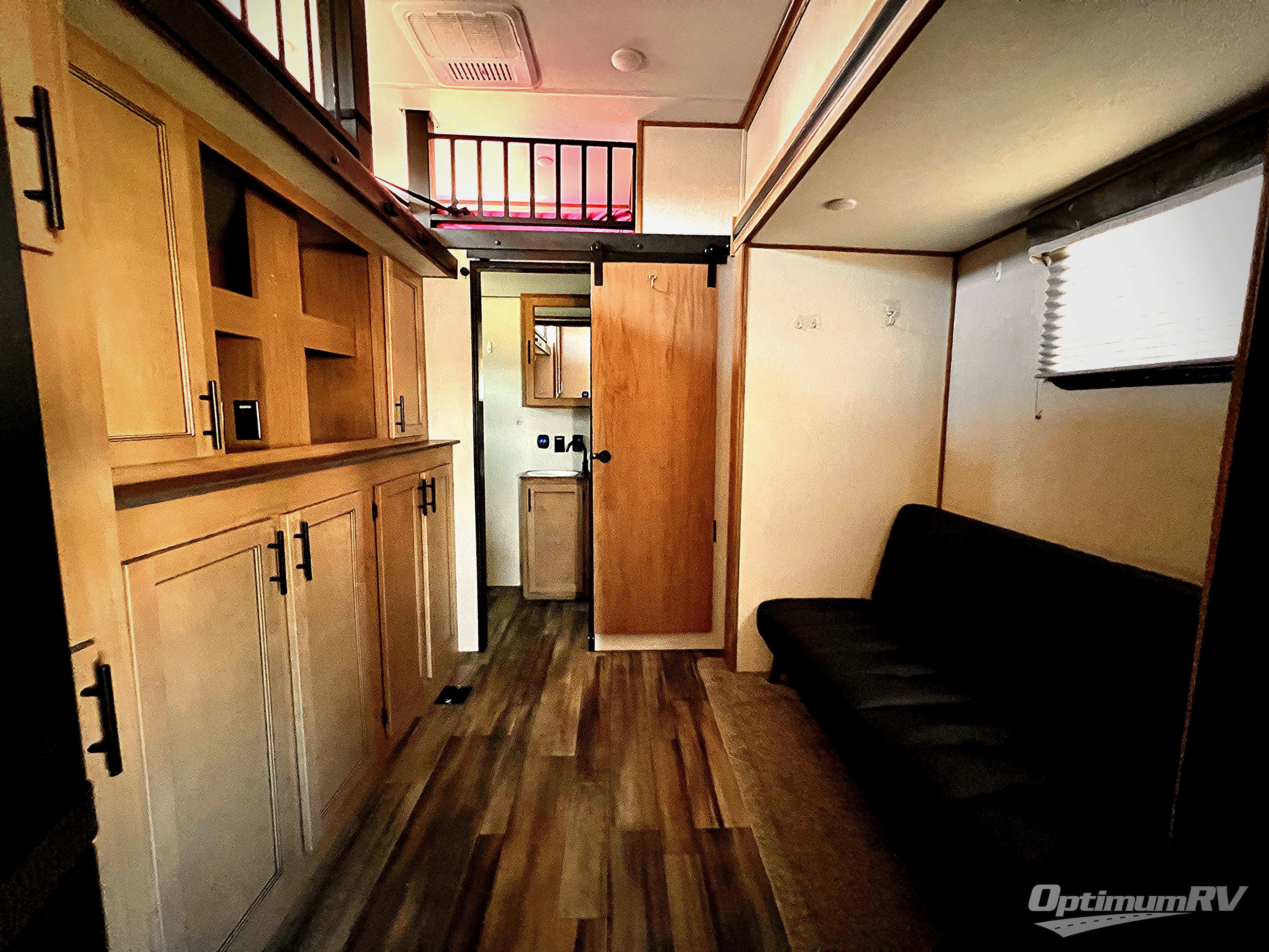 With two full bathrooms in this Sabre fifth wheel, everyone can stay squeaky clean, and with the washer and dryer prep in the front bedroom, your clothes can too if you choose that option. Your kids or friends will love having their own private bunkhouse suite with a tri-fold sofa and an entertainment center with storage, and access to their very own full rear bathroom which even has an exterior entry door. There is also loft space above the wardrobe side of the bunk space and above the rear bath for two more to sleep comfortably. The chef of your group will love having the extra counter and storage space thanks to the kitchen island, and if they want to enjoy some fresh air while they cook, then they can head to the outdoor kitchen.