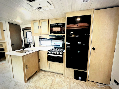 You will enjoy sleeping for up to six with a custom king bed in the private front bedroom, plus a versa-lounge and a u-shaped dinette within the large slide out. There are also panoramic windows here to let tons of natural light in. Cooking will be easy either indoors or outdoors with an exterior camp kitchen situated under the 20' awning, and the two pantries and an oversized fridge inside will hold all of your food. You will feel right at home in the front private bedroom that includes a custom king bed, dual nightstands and closets, plus a walk-in closet to keep your clothes wrinkle-free. And check out the pass-through storage outside to keep fishing poles, hiking gear, and extra lawn chairs!