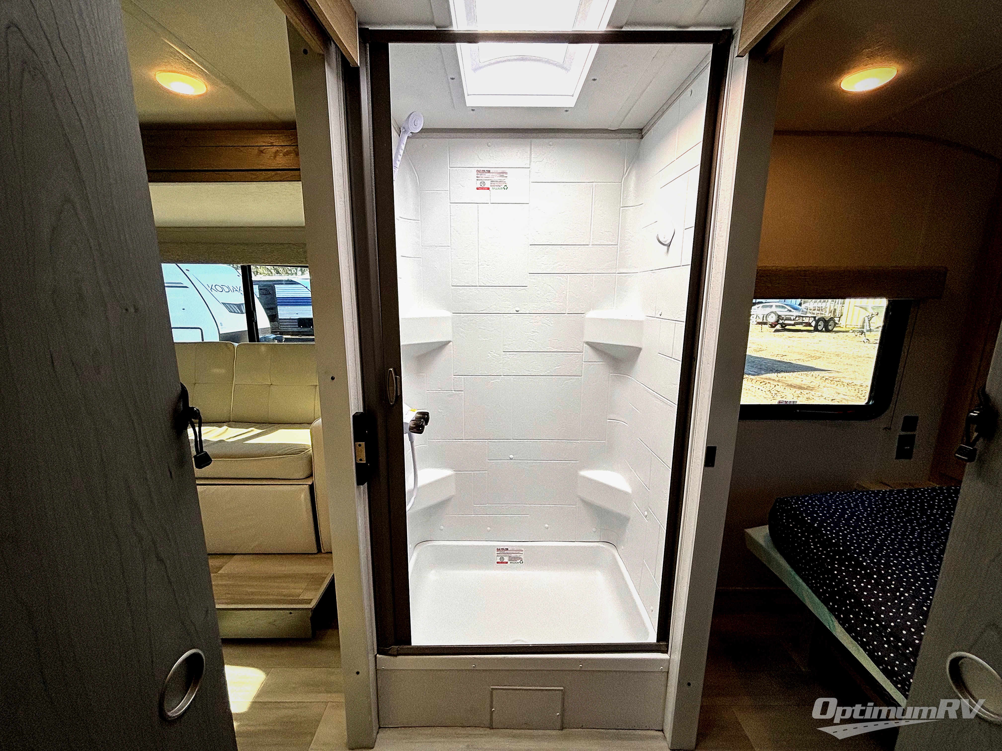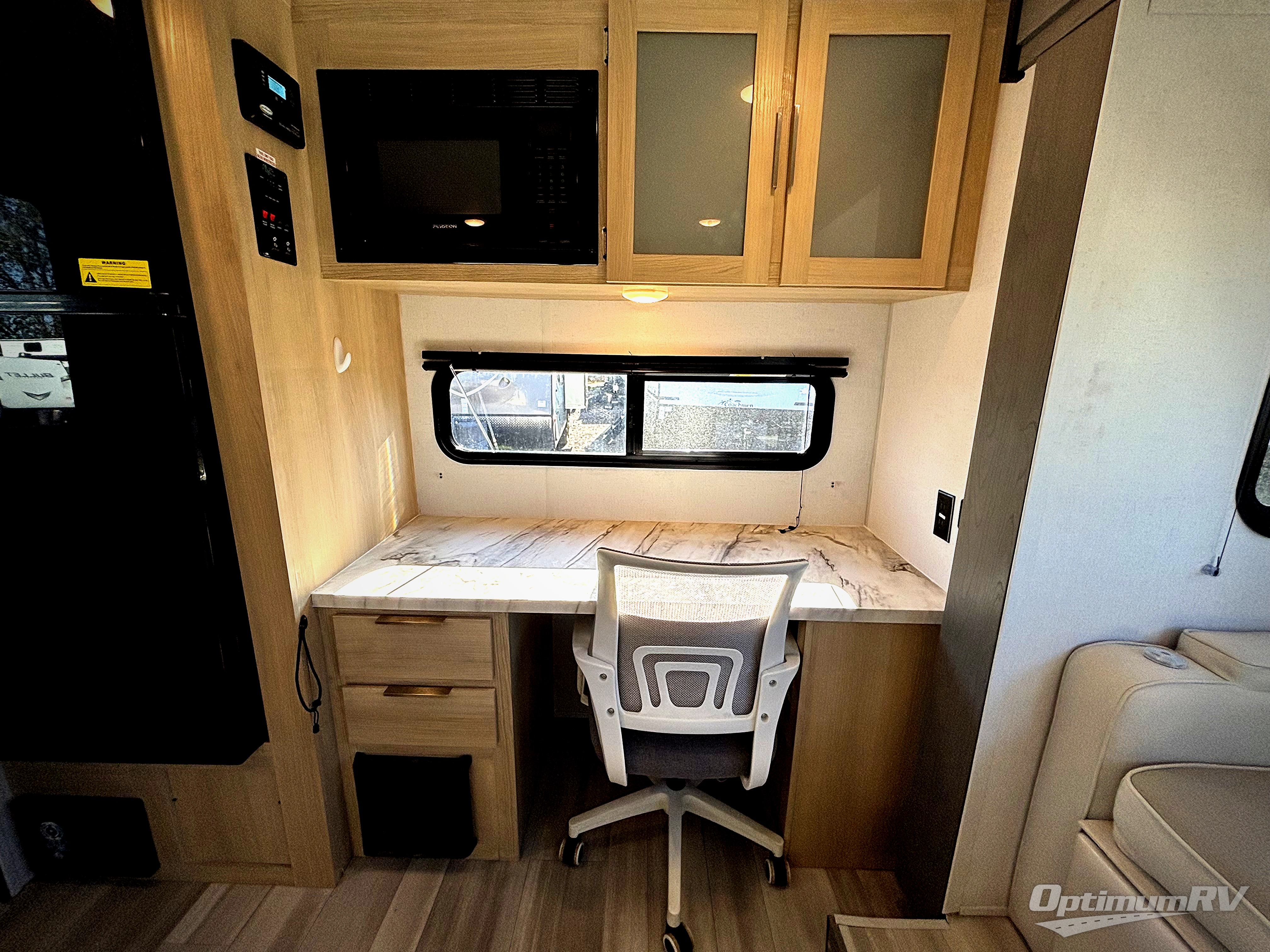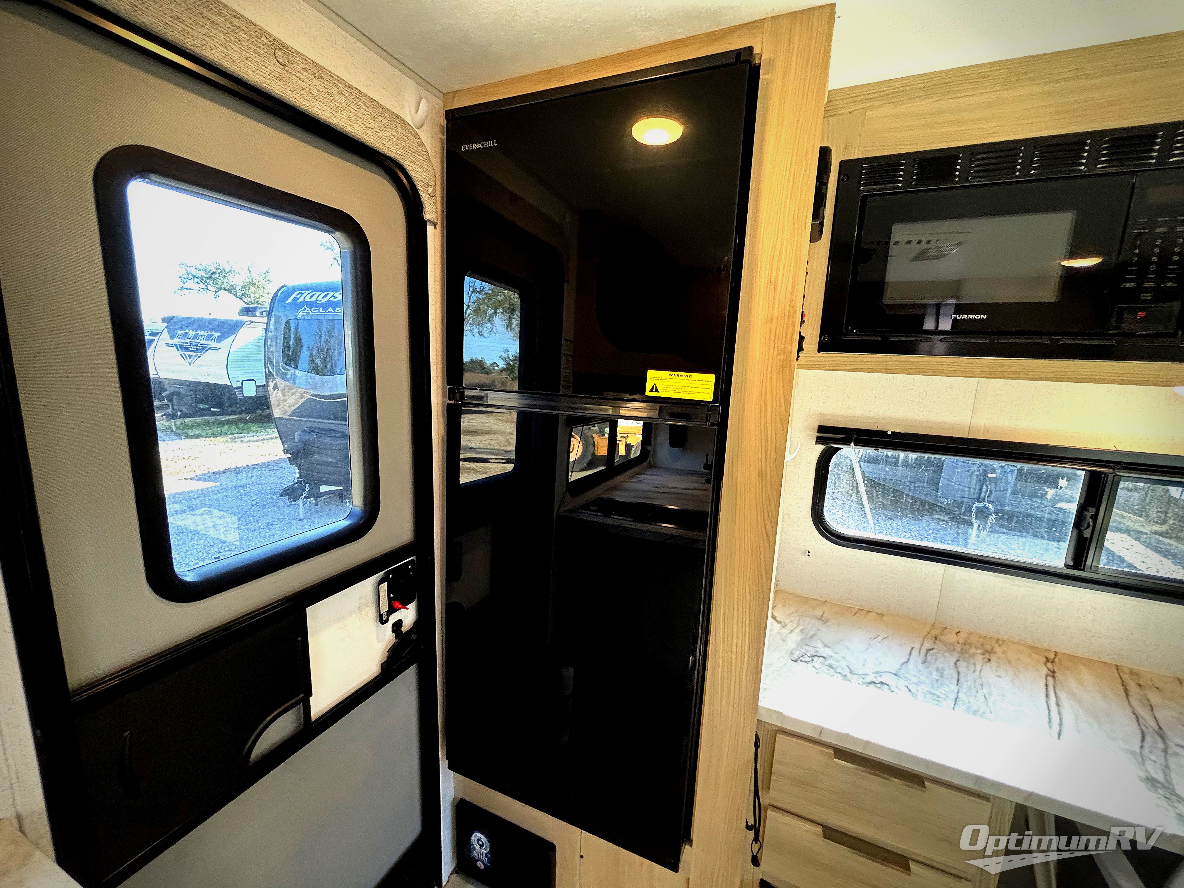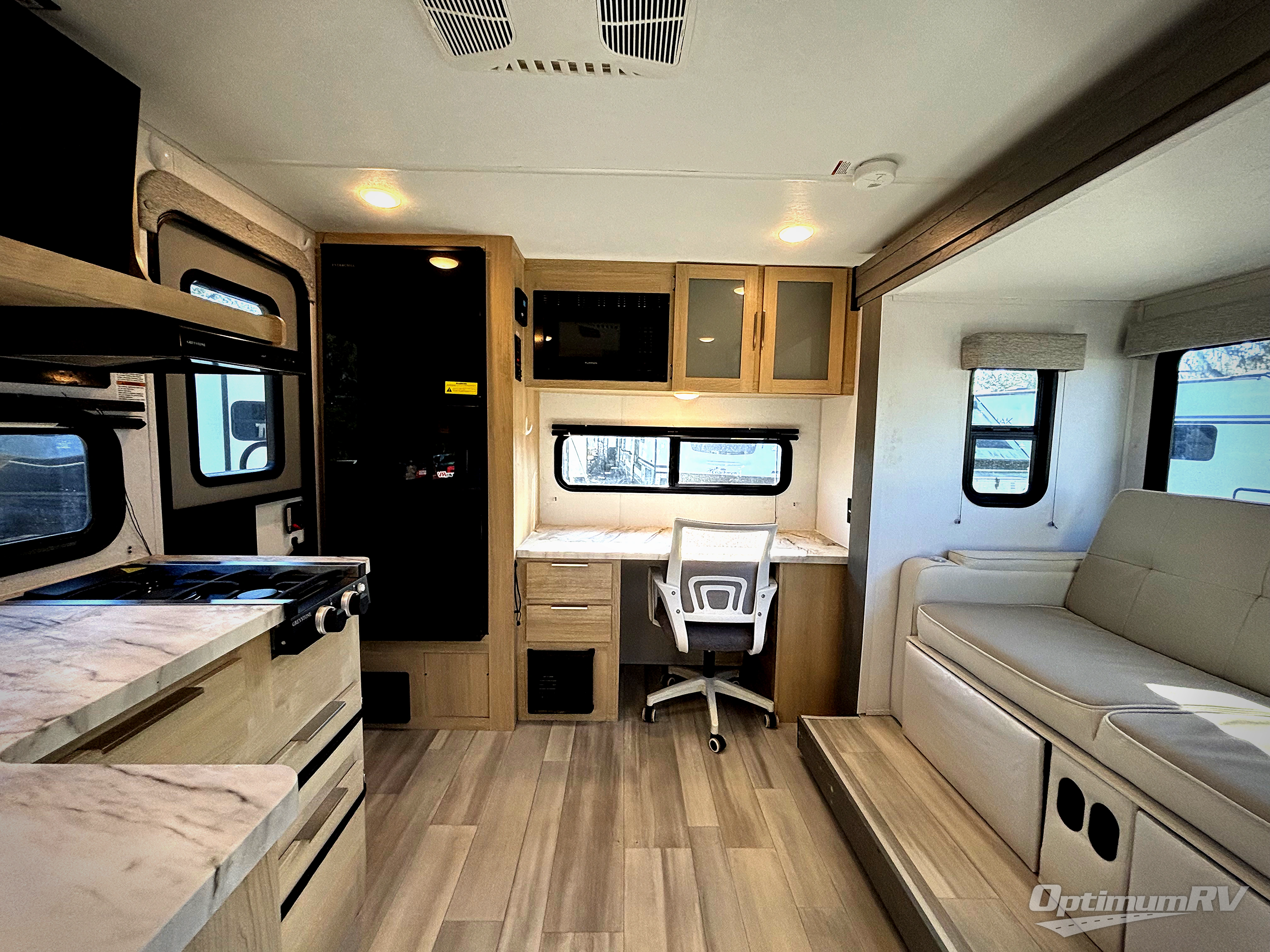 You're going to love every minute spent in this couple's trailer. The queen bed in the front private bedroom will provide a great night's rest, and there are dual wardrobes to easily get dressed in the morning. Head to the kitchen through the bath, then prepare eggs and bacon on the two burner cooktop. There is theater seating here to enjoy your coffee at each morning, or you may want to get some work done at the mobile workstation!