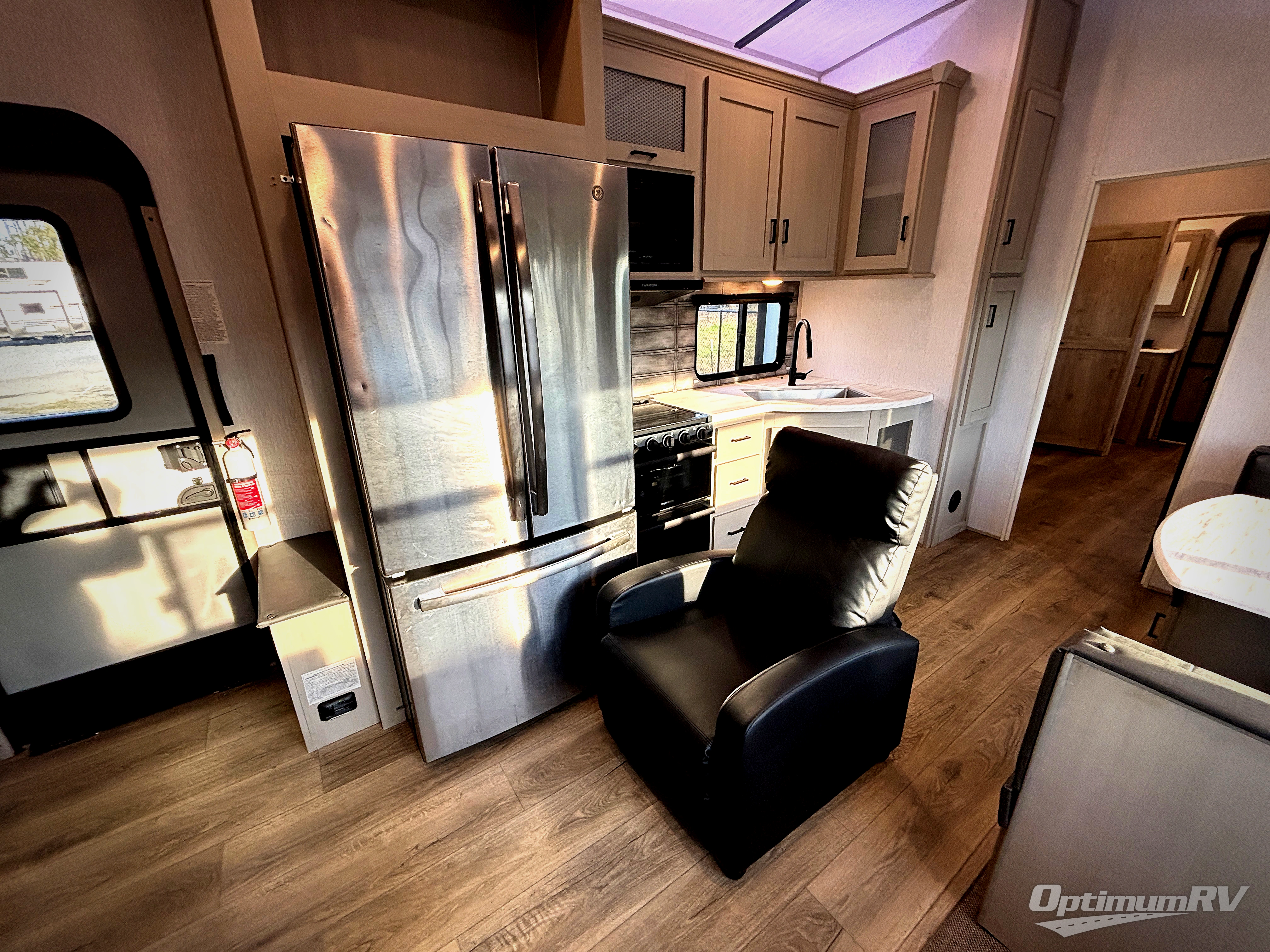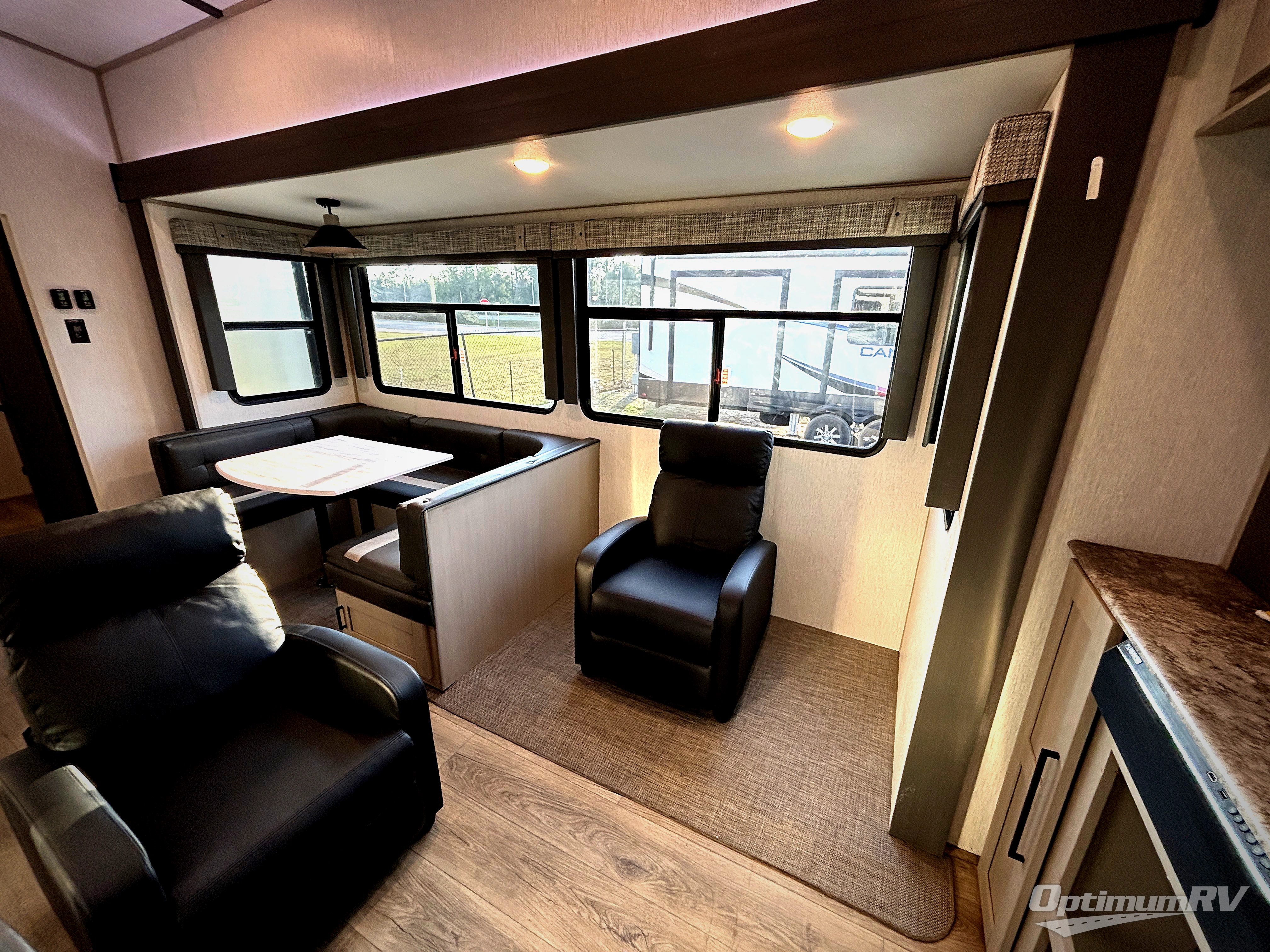 With two full bathrooms, everyone will stay clean in this fifth wheel! The double entry doors makes for a smooth flow of traffic and the unique rear entrance leads directly into the rear full bathroom. The private bunkhouse features not only one bunk above a Versa queen convertible bed/sofa, but also a second bunk above with storage. The U-shaped dinette is the perfect place for you to enjoy your meals at, play some card games and even transform into an extra sleeping space. The exterior has plenty of features you will love too like the outside kitchen/bar so you can have a good time cooking outdoors and a coax/TV hookup that you can add your own outside TV, plus an extra large pass-through storage area for your outdoor gear. When you're ready for bed, the custom king bed slide out will be waiting for you in the front private bedroom!