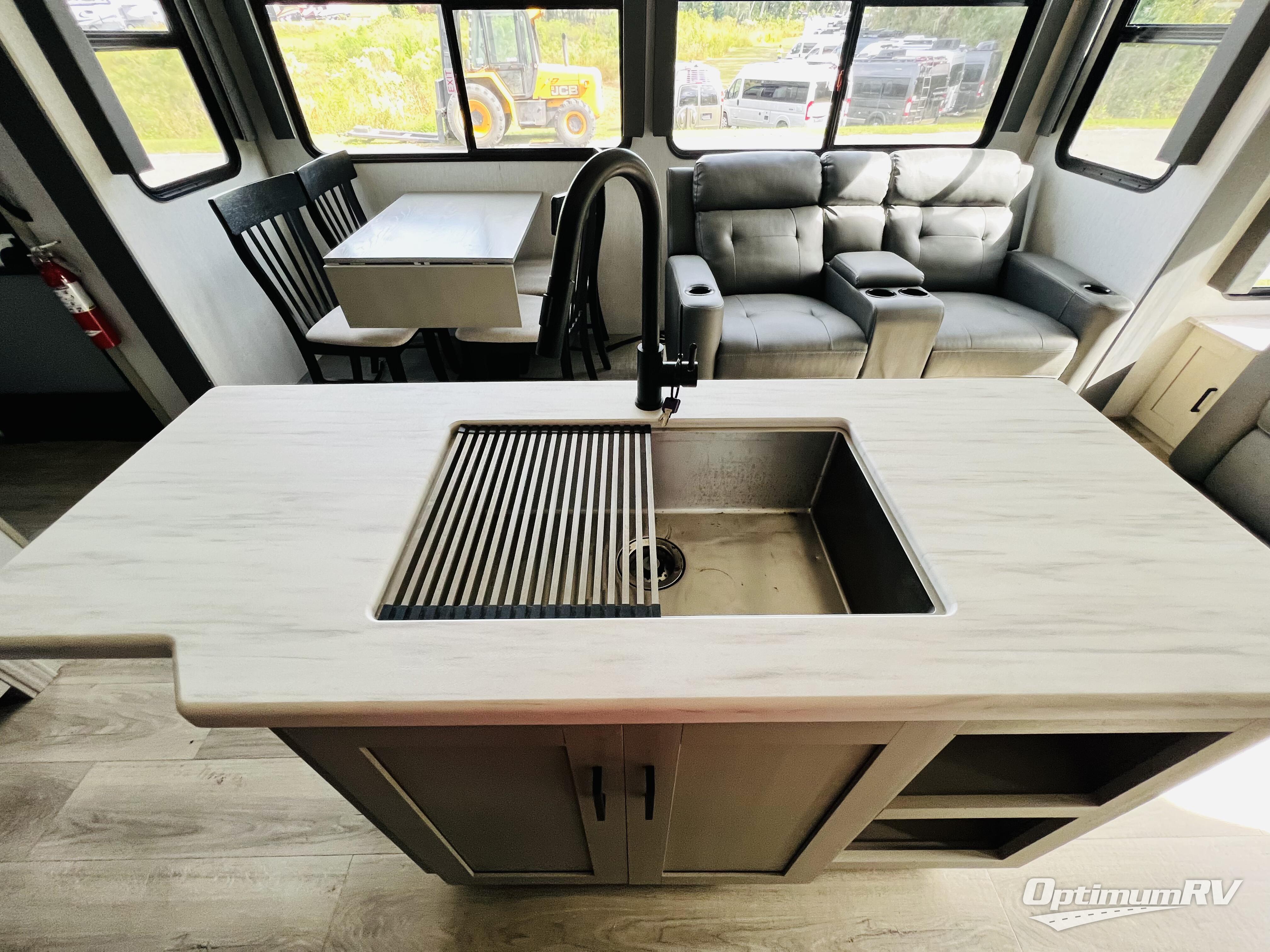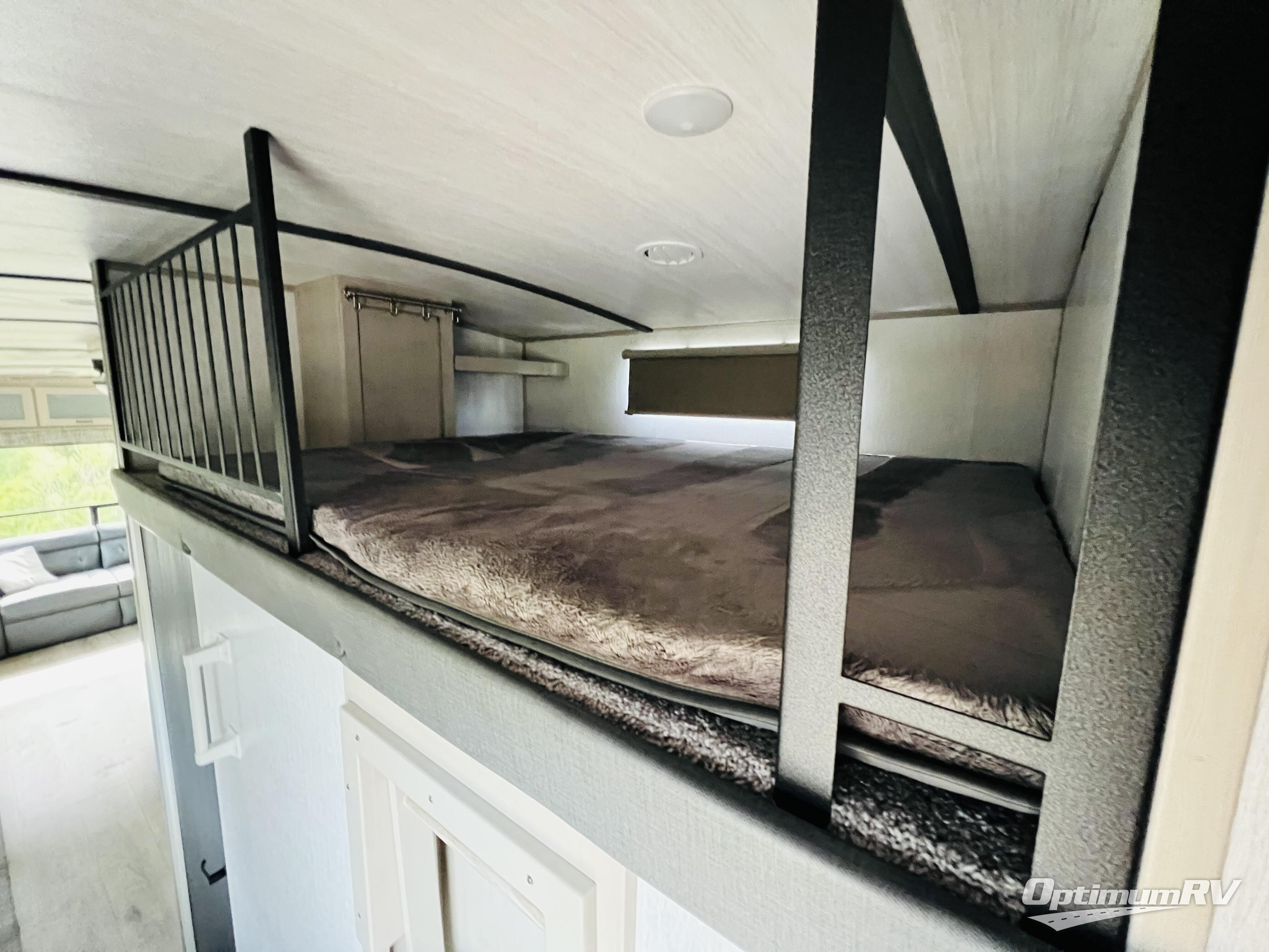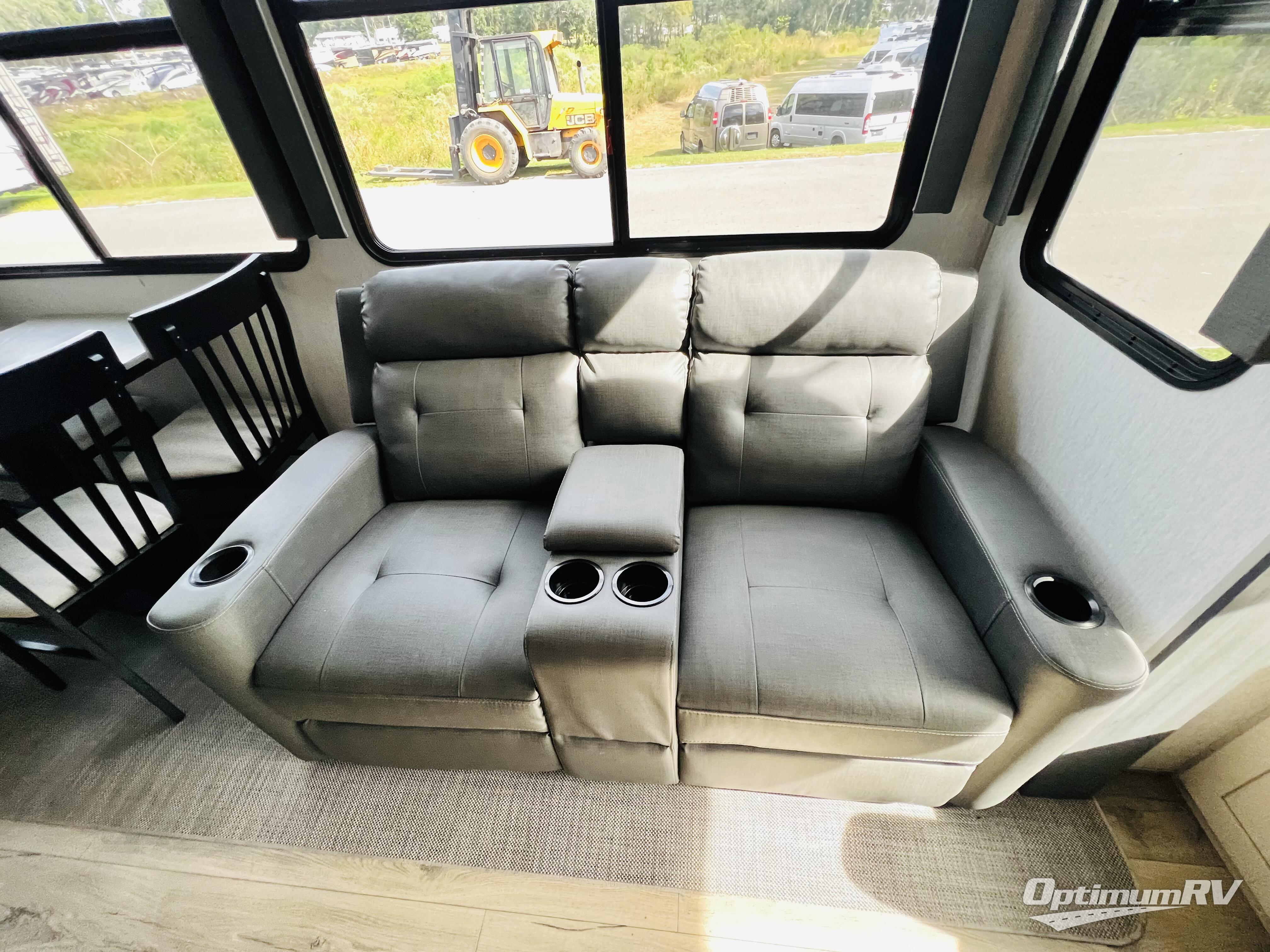 You won't know where to begin when you enter this fifth wheel! The rear living area has plenty of entertainment and seating choices between the tri-fold sofa and the theatre seating with cupholders, and the 50" LED TV will be perfect for movie nights. Meal prepping and clean up will be a breeze thanks to the kitchen island with a large sink, and the deluxe French door pantry that is big enough to store everyone's favorite snacks. Inside the middle bunkhouse, you will find a bunk with a Versa queen convertible bed/sofa below it and a loft above this room, plus there is a desk with a TV hookup and a dresser with a wardrobe. The outside also has lots of features you will love like the exterior storage with a refrigerator, the coax/TV hookup, two awnings and the Texas-sized pass-through storage area!