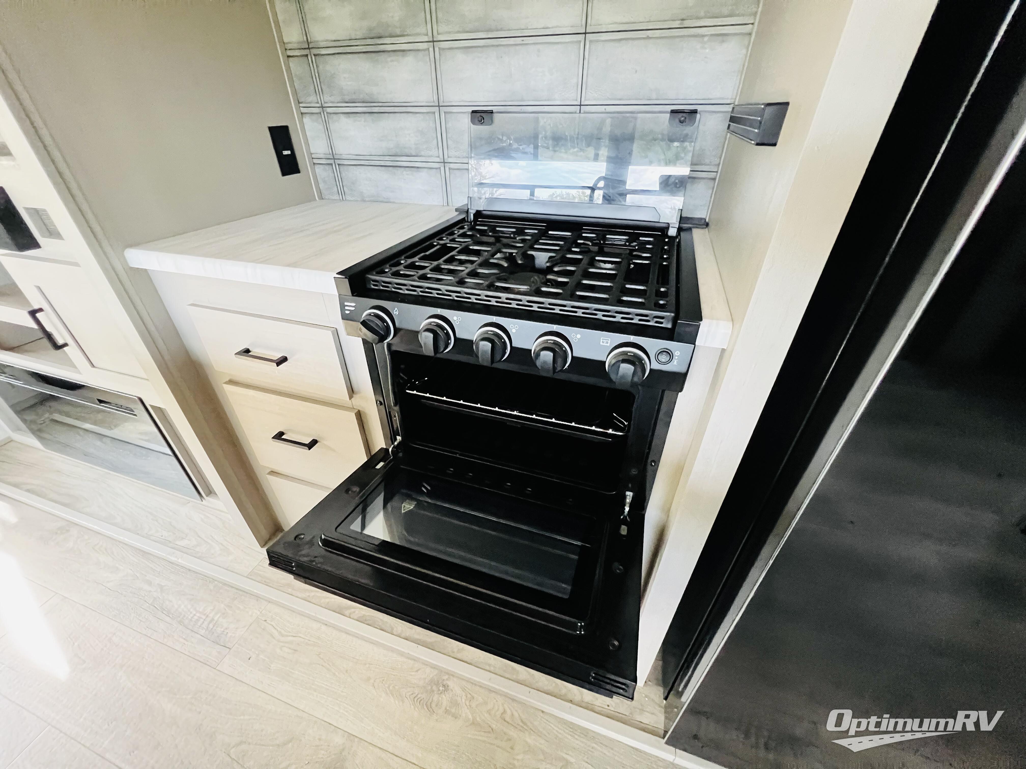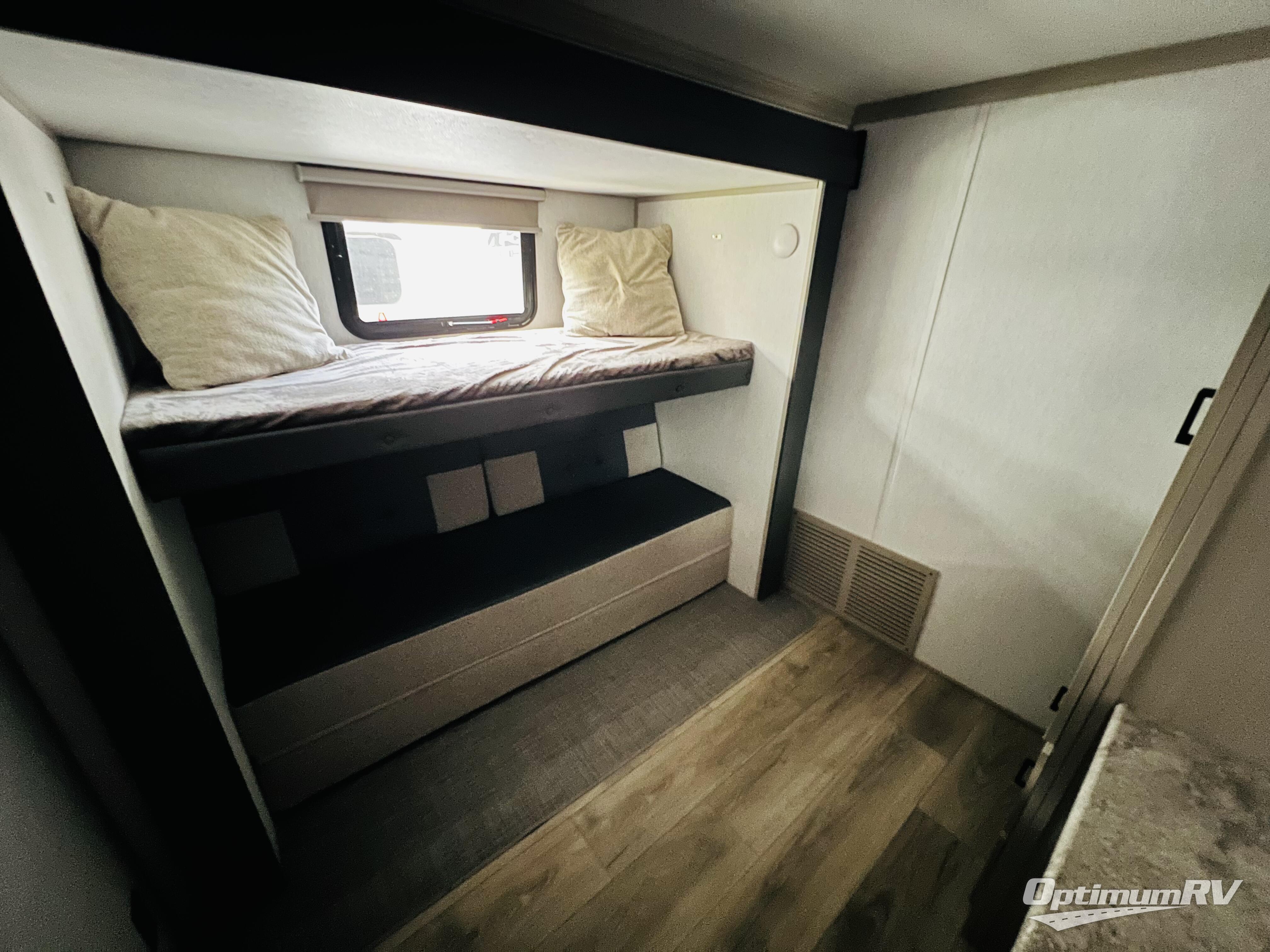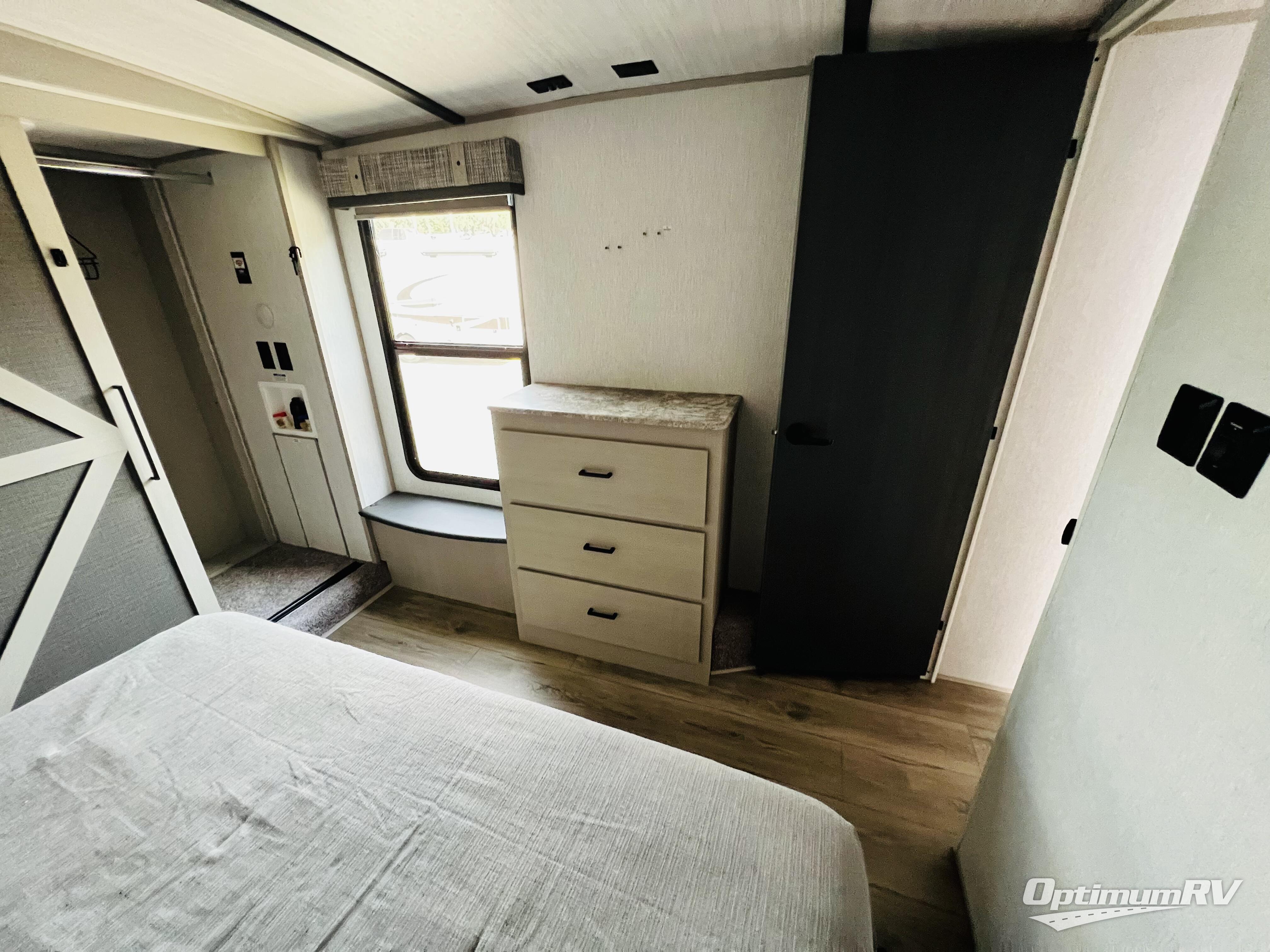 You won't know where to begin when you enter this fifth wheel! The rear living area has plenty of entertainment and seating choices between the tri-fold sofa and the theatre seating with cupholders, and the 50" LED TV will be perfect for movie nights. Meal prepping and clean up will be a breeze thanks to the kitchen island with a large sink, and the deluxe French door pantry that is big enough to store everyone's favorite snacks. Inside the middle bunkhouse, you will find a bunk with a Versa queen convertible bed/sofa below it and a loft above this room, plus there is a desk with a TV hookup and a dresser with a wardrobe. The outside also has lots of features you will love like the exterior storage with a refrigerator, the coax/TV hookup, two awnings and the Texas-sized pass-through storage area!