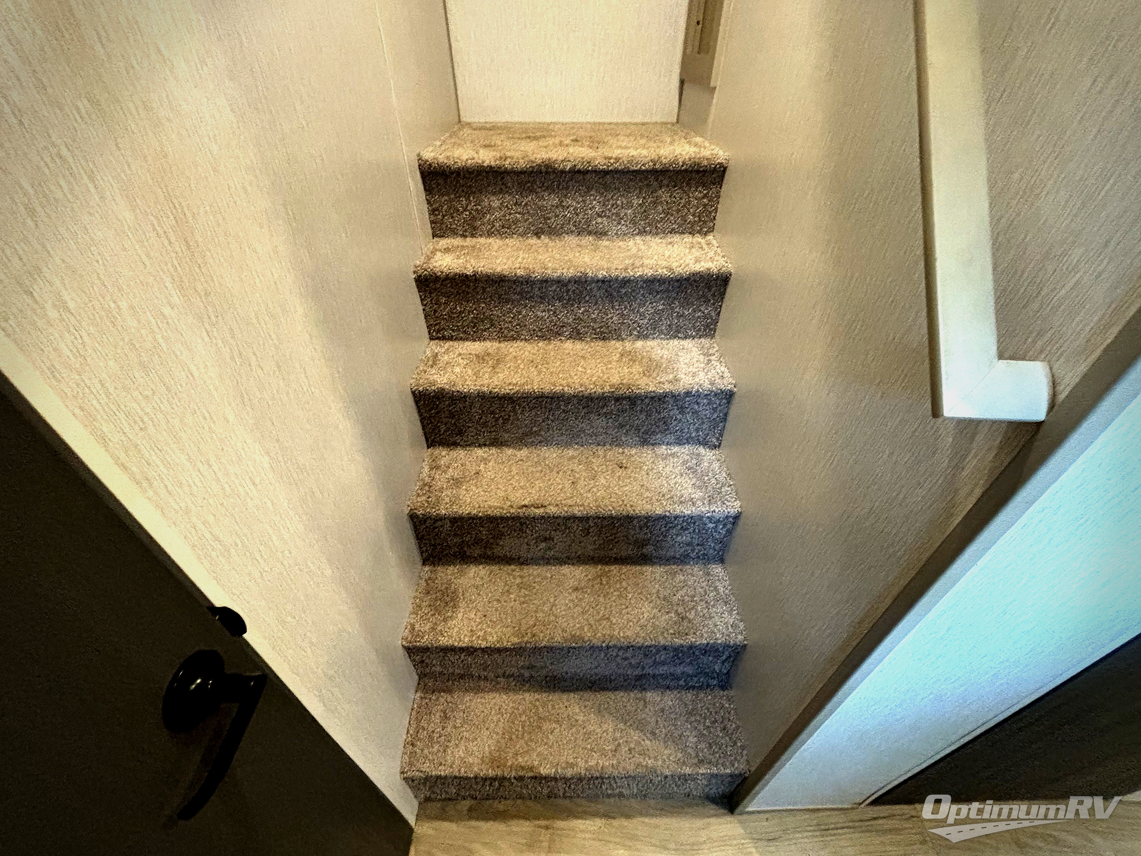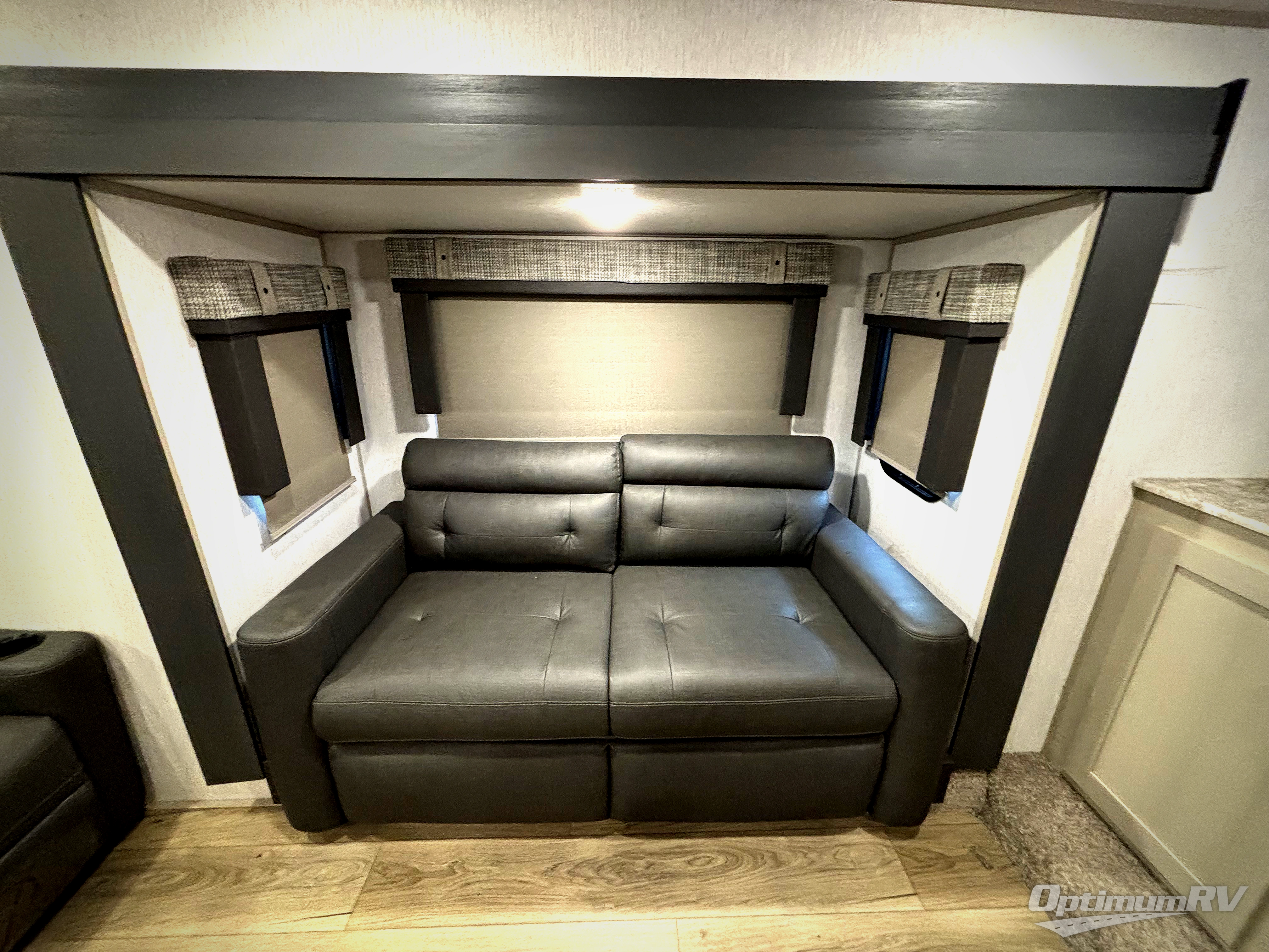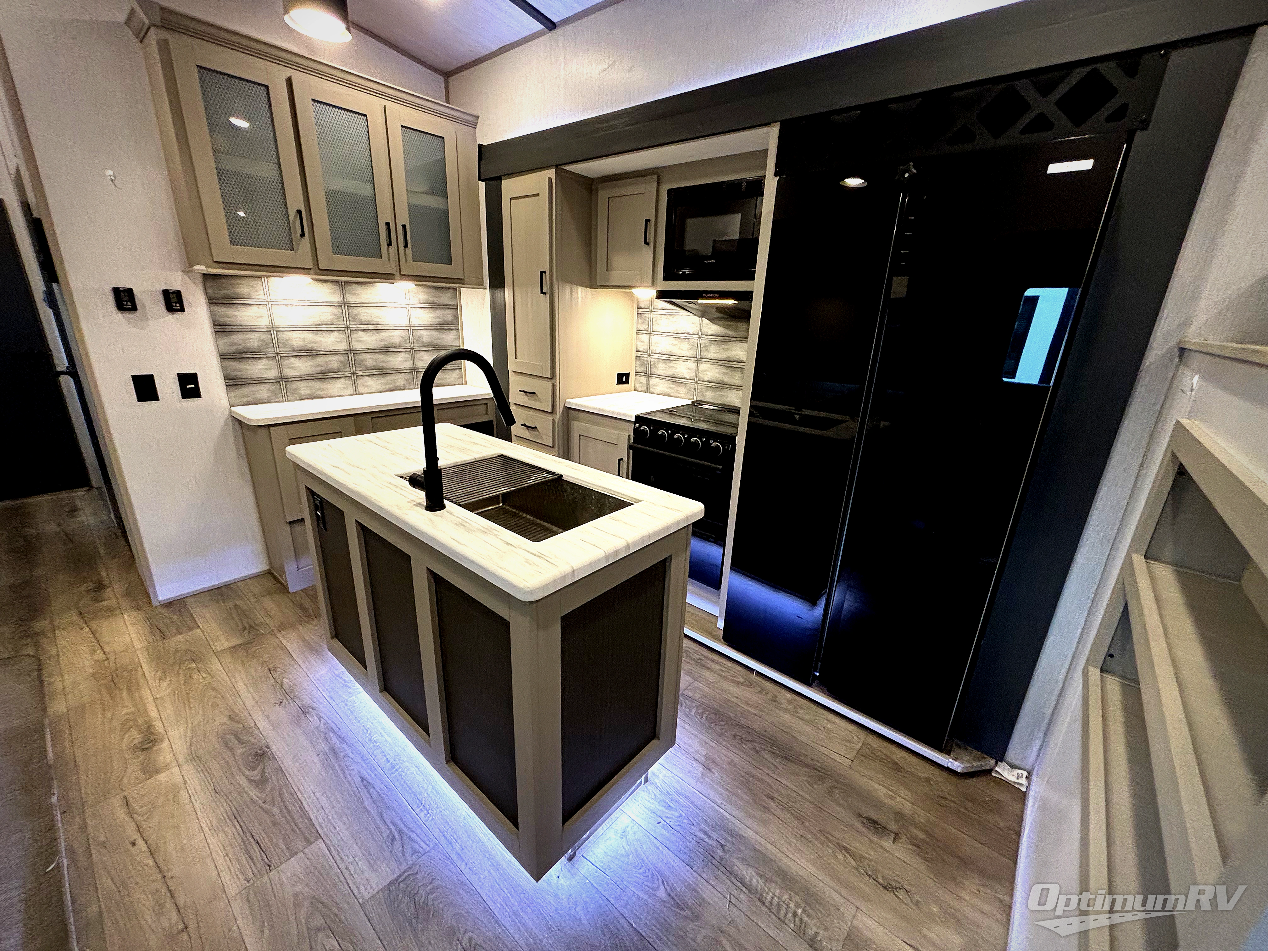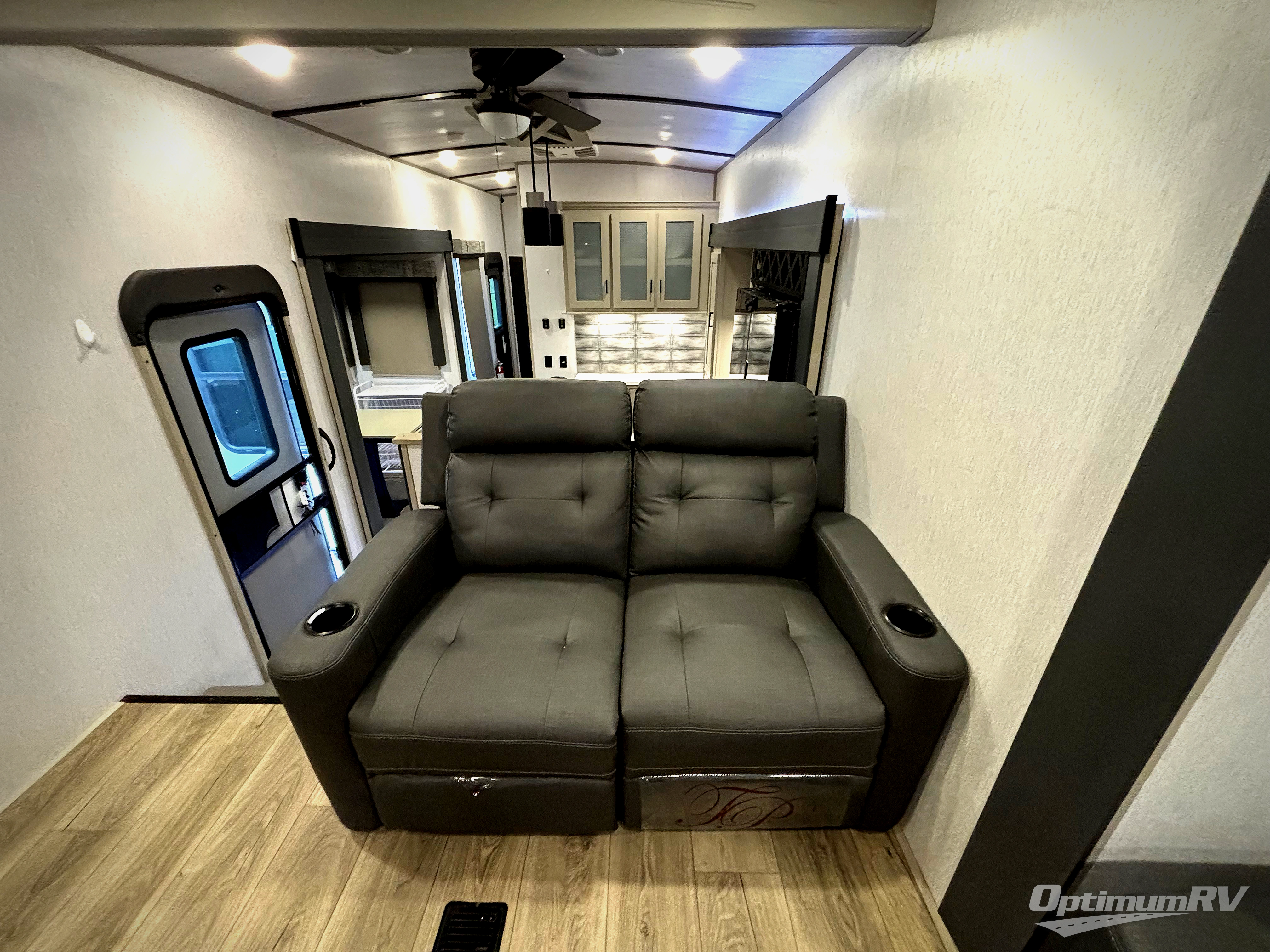 This fifth wheel is decked out in features you're going to love from the front separate living area to the Texas-sized exterior pass-through storage area! The two tri-fold sofas can convert into sleeping space and the theater seating is the perfect place to relax while you watch your favorite movie on the 50" LED TV. The kitchen island not only makes meal prepping easy, but cleaning up just as easy with the large sink. Everyone will enjoy getting ready each morning in the full bathroom with the residential walk-in shower and a vanity sink next to it. The rear private bedroom has everything you will need to feel right at home with the custom king bed, the wardrobe that is prepped to add the optional washer and dryer, and the large panoramic window on the rear wall to let in some morning sunlight. Plus, there are stairs just outside the bedroom that lead up to the loft with two bunk mats and storage areas!