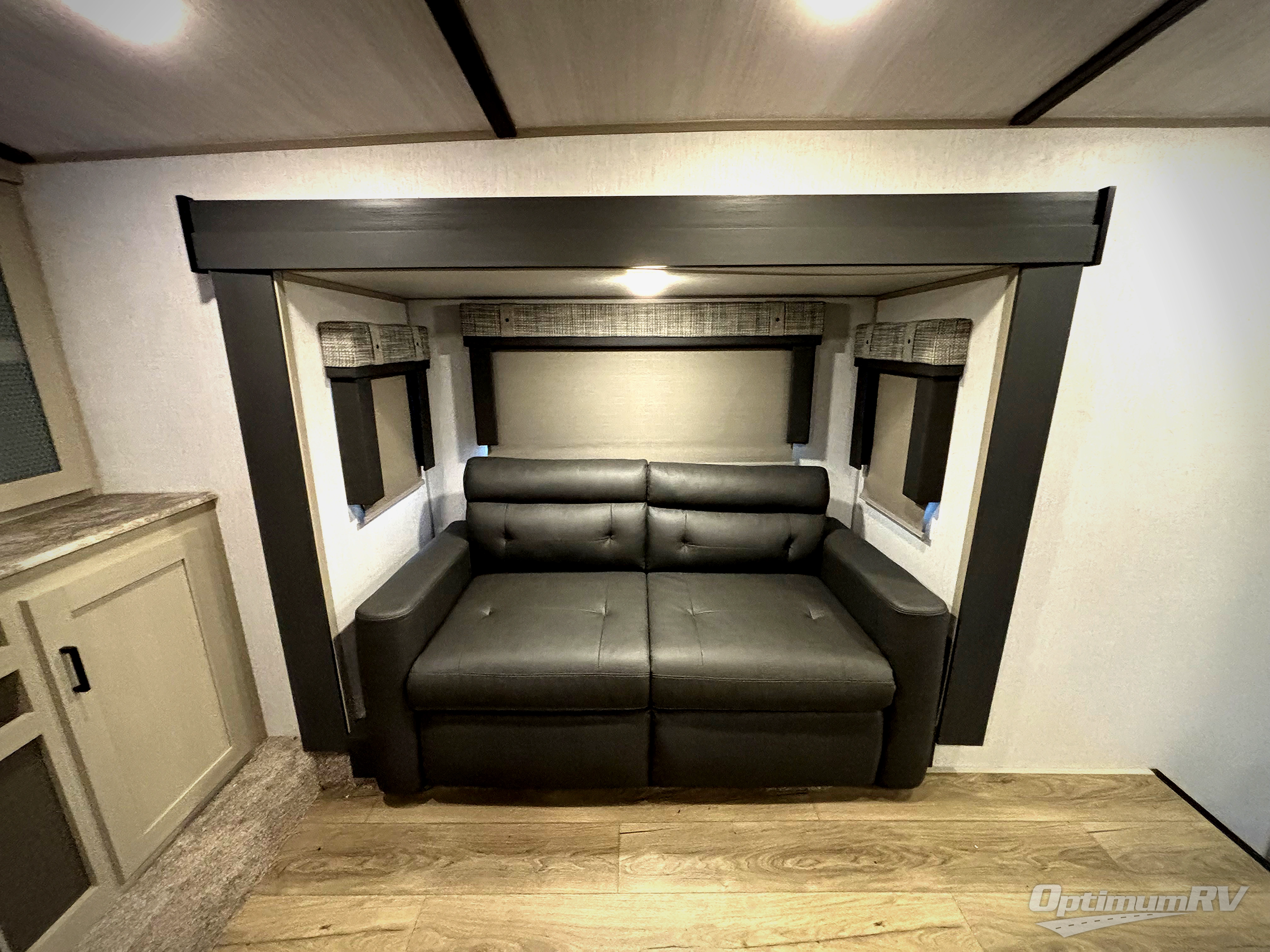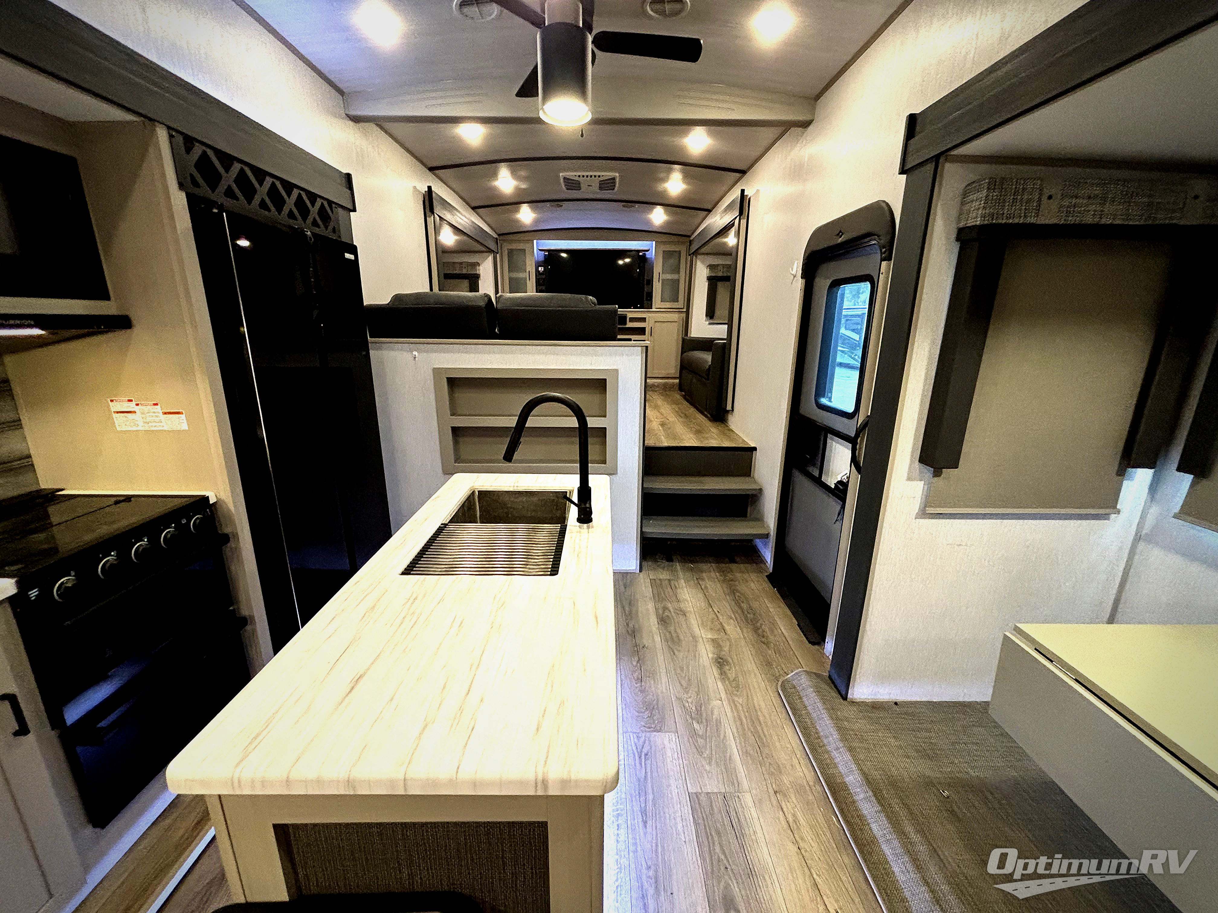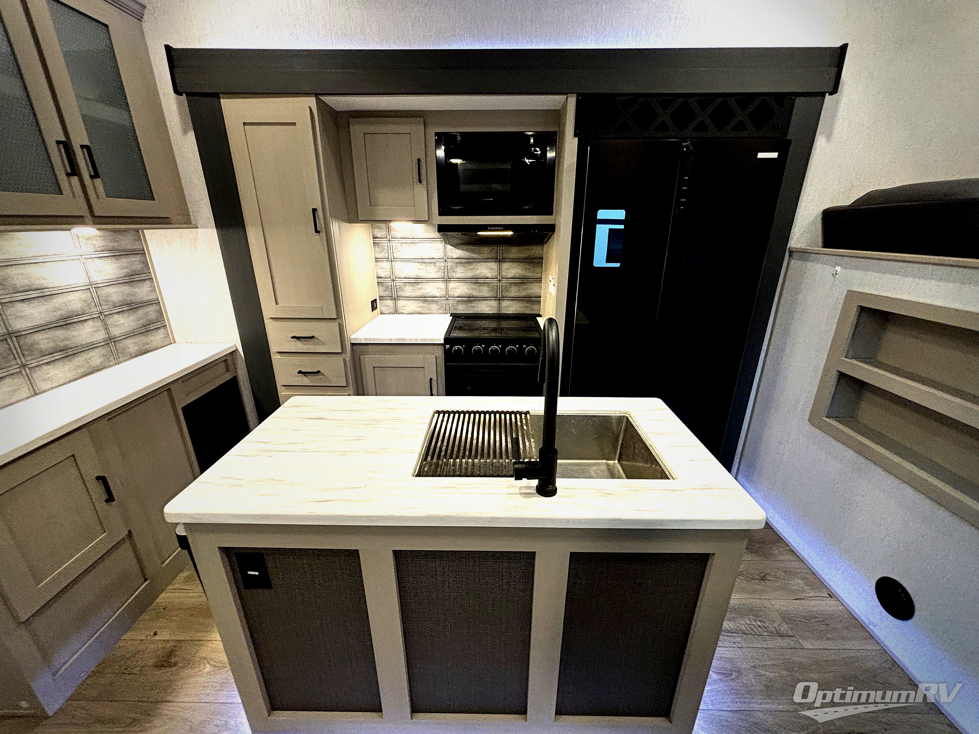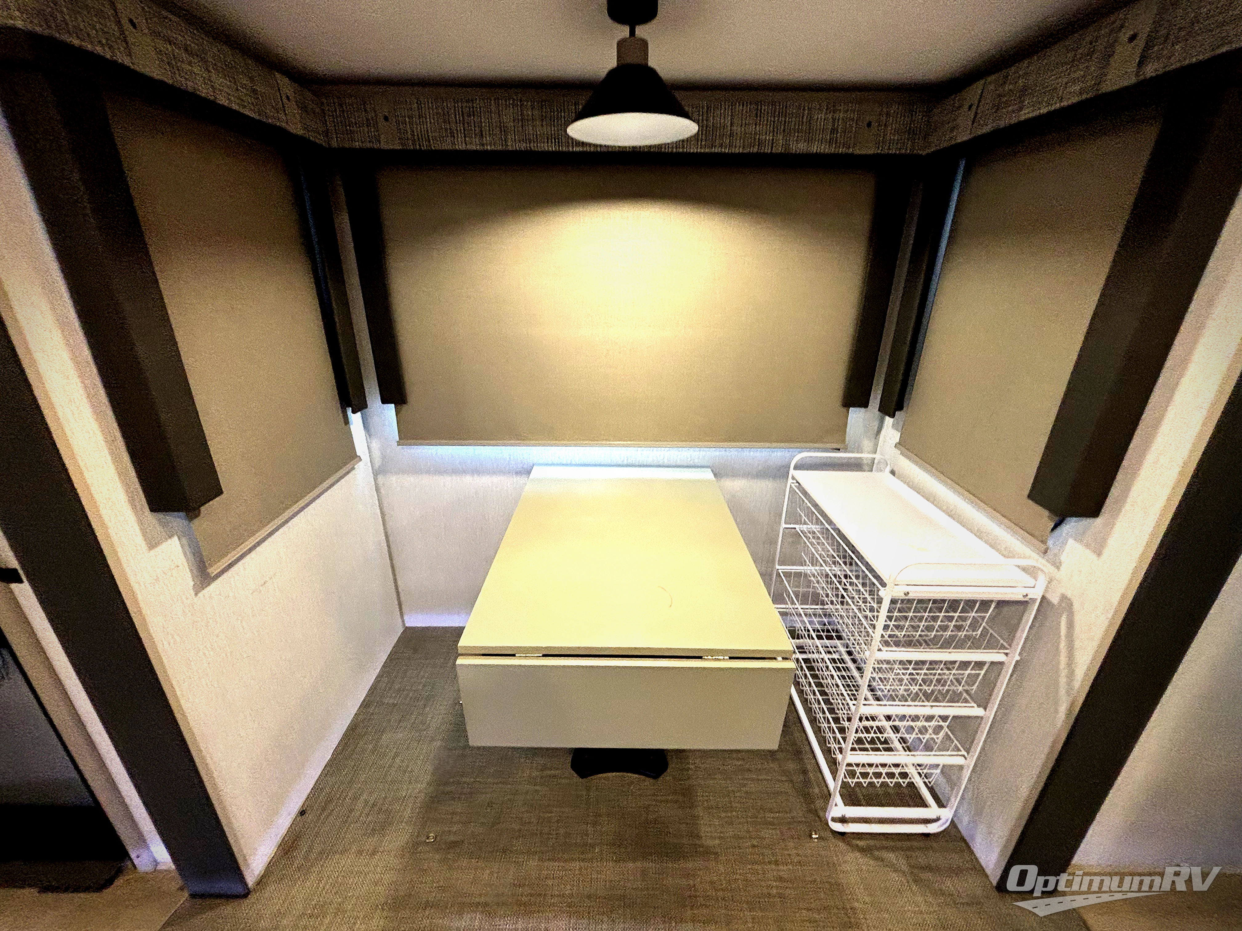 This fifth wheel is decked out in features you're going to love from the front separate living area to the Texas-sized exterior pass-through storage area! The two tri-fold sofas can convert into sleeping space and the theater seating is the perfect place to relax while you watch your favorite movie on the 50" LED TV. The kitchen island not only makes meal prepping easy, but cleaning up just as easy with the large sink. Everyone will enjoy getting ready each morning in the full bathroom with the residential walk-in shower and a vanity sink next to it. The rear private bedroom has everything you will need to feel right at home with the custom king bed, the wardrobe that is prepped to add the optional washer and dryer, and the large panoramic window on the rear wall to let in some morning sunlight. Plus, there are stairs just outside the bedroom that lead up to the loft with two bunk mats and storage areas!