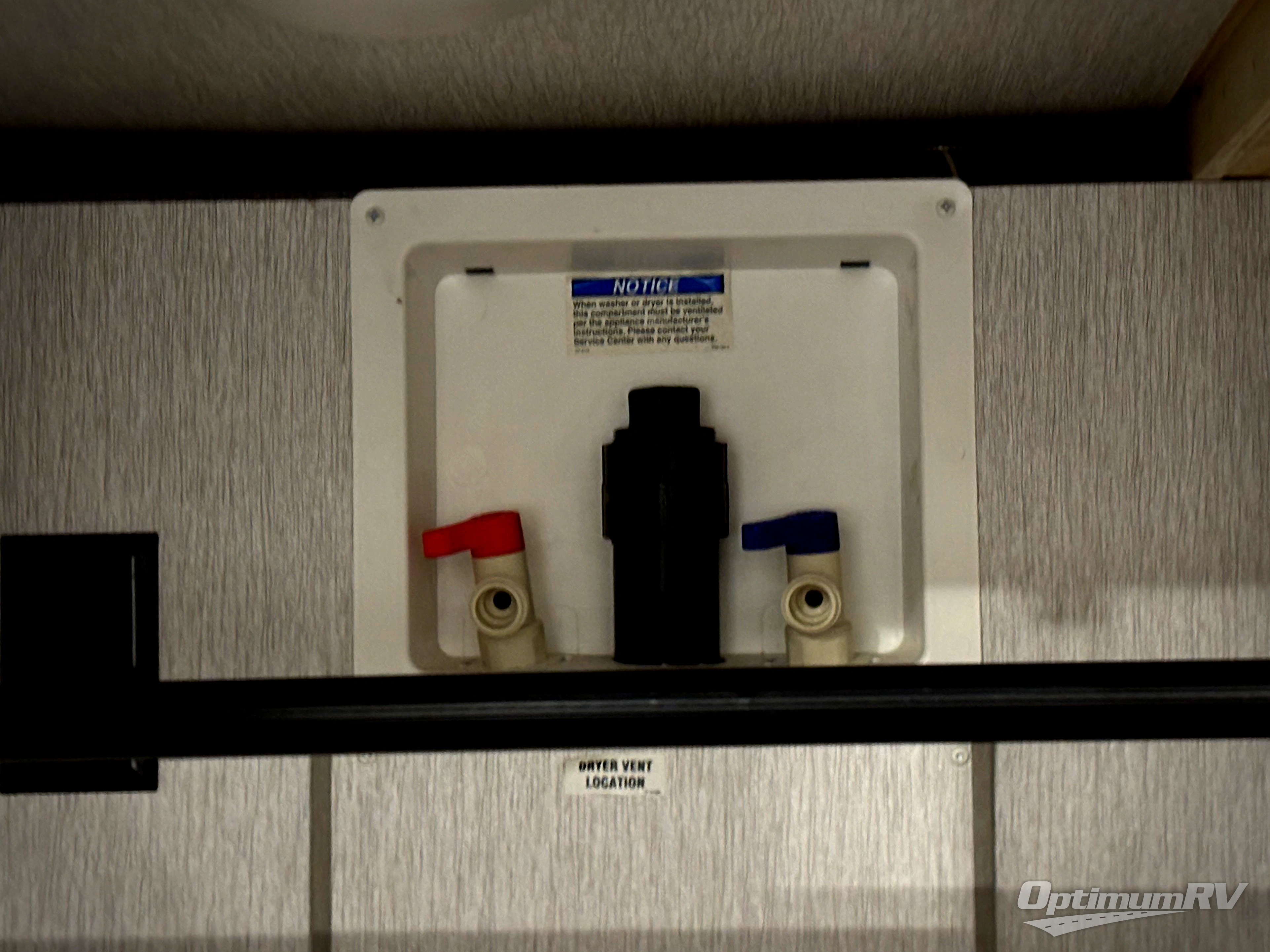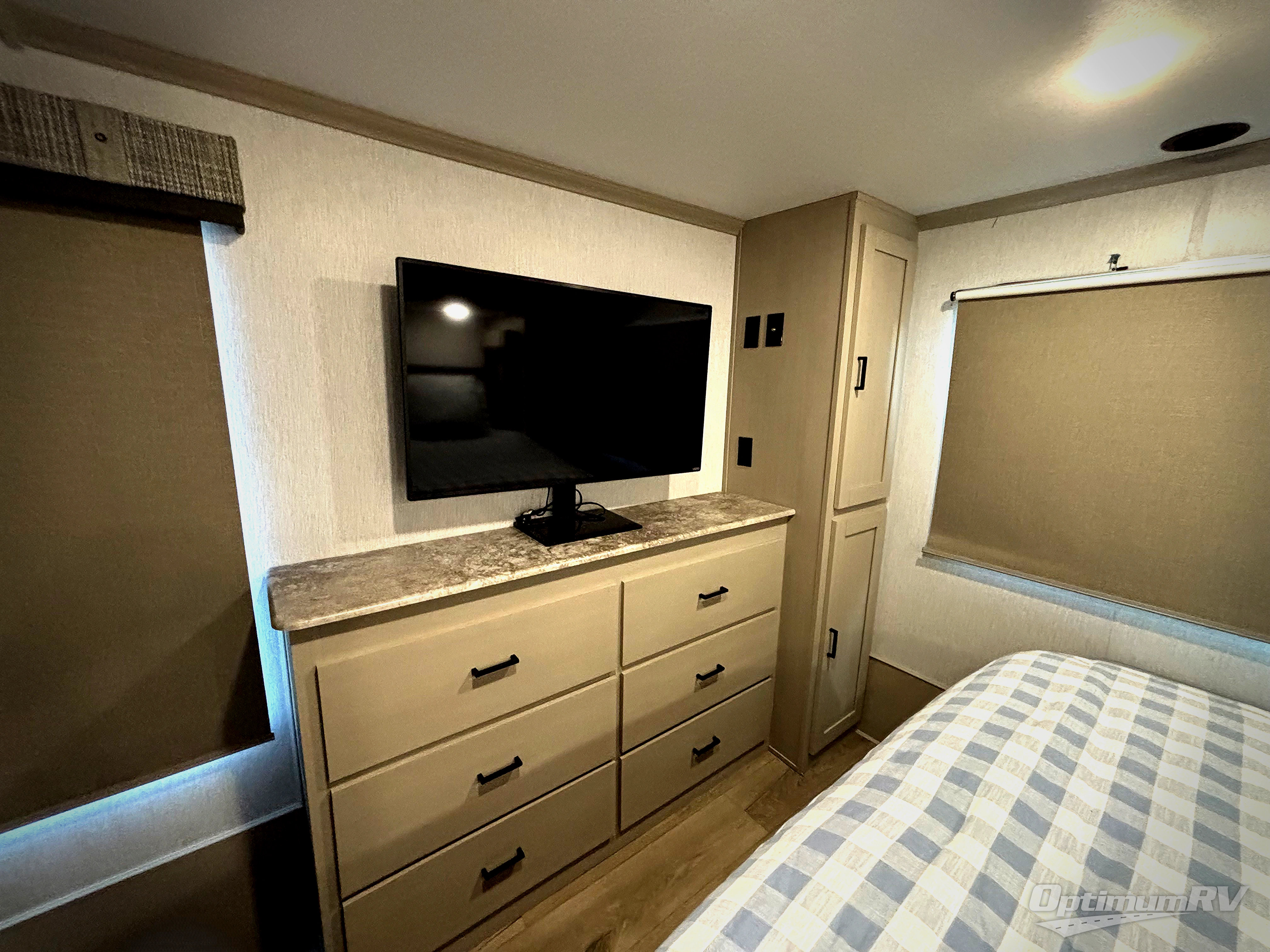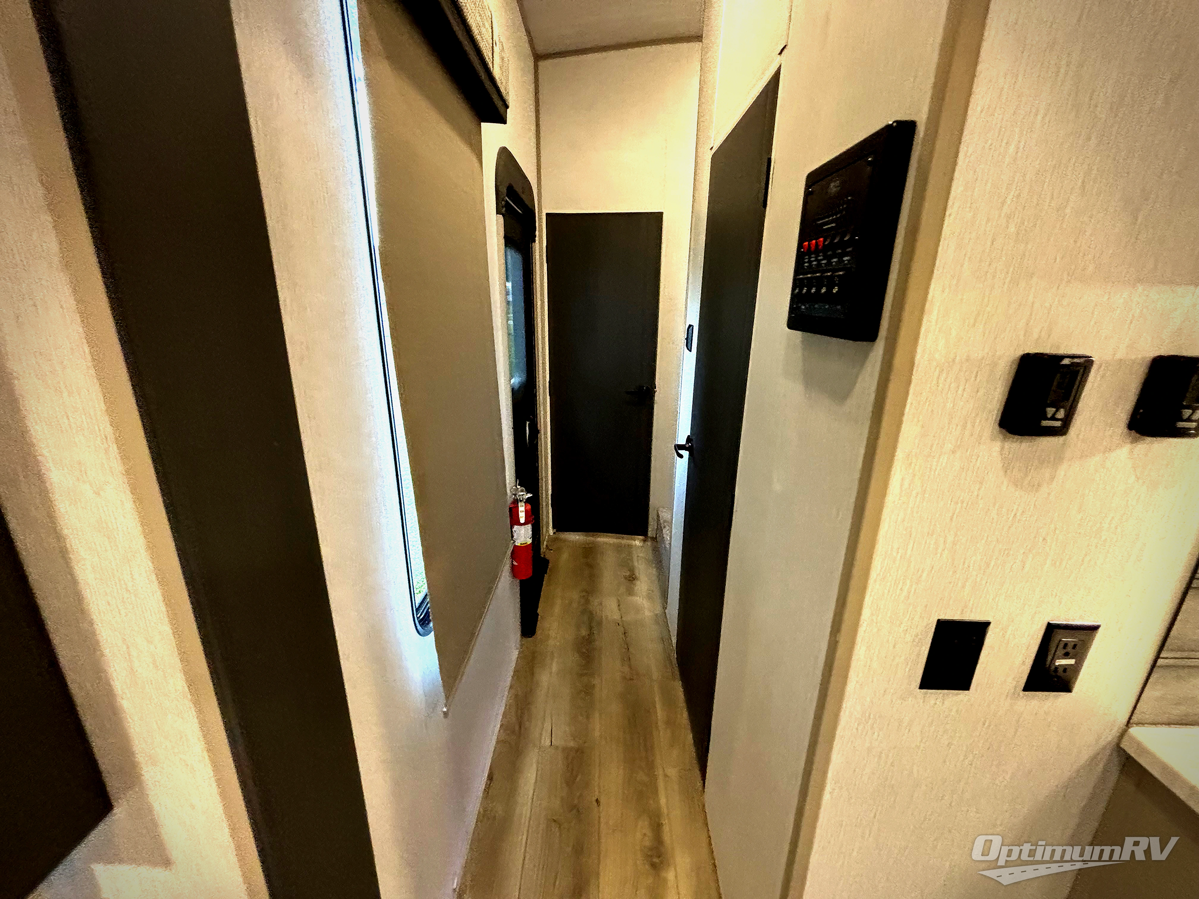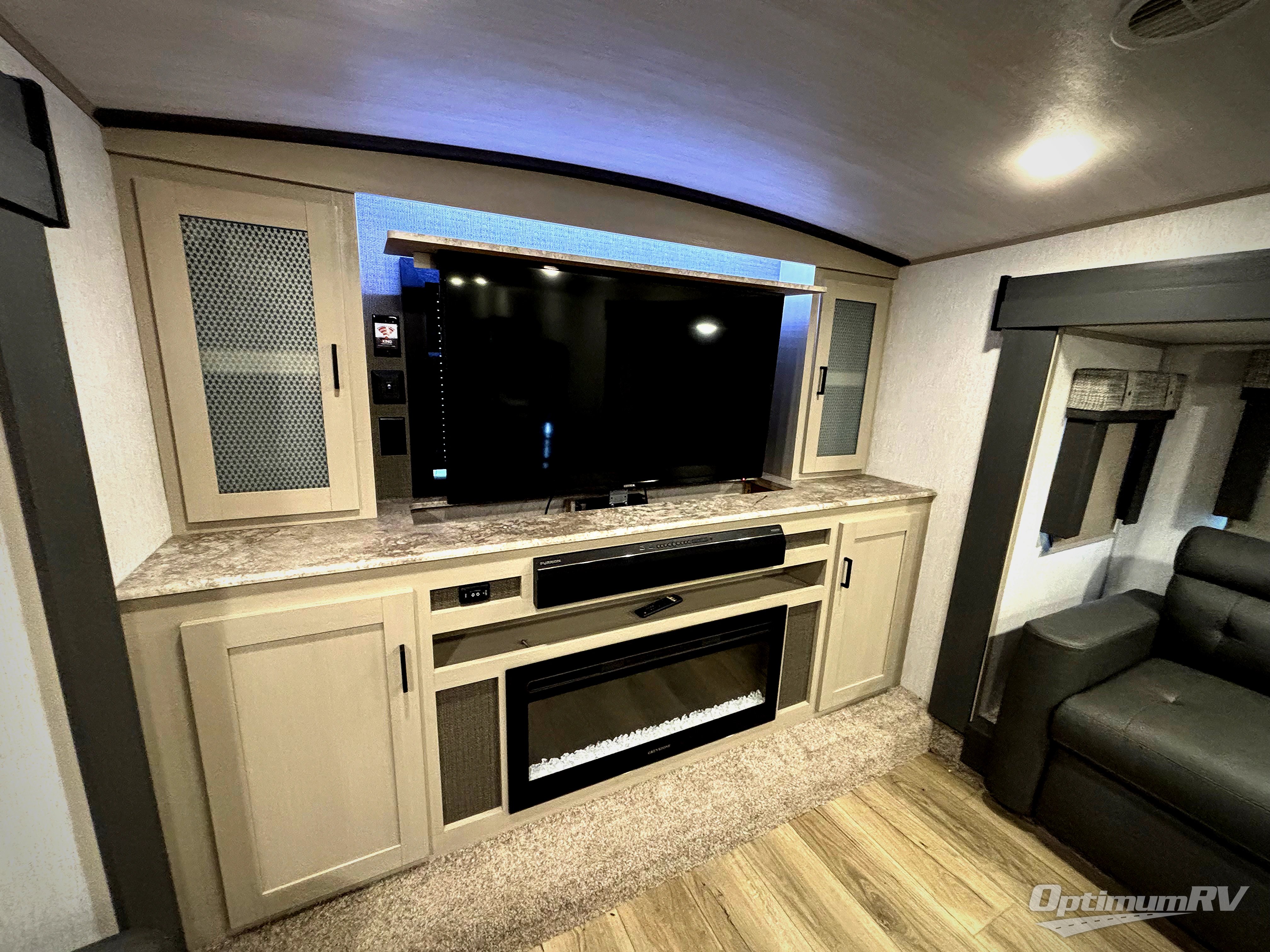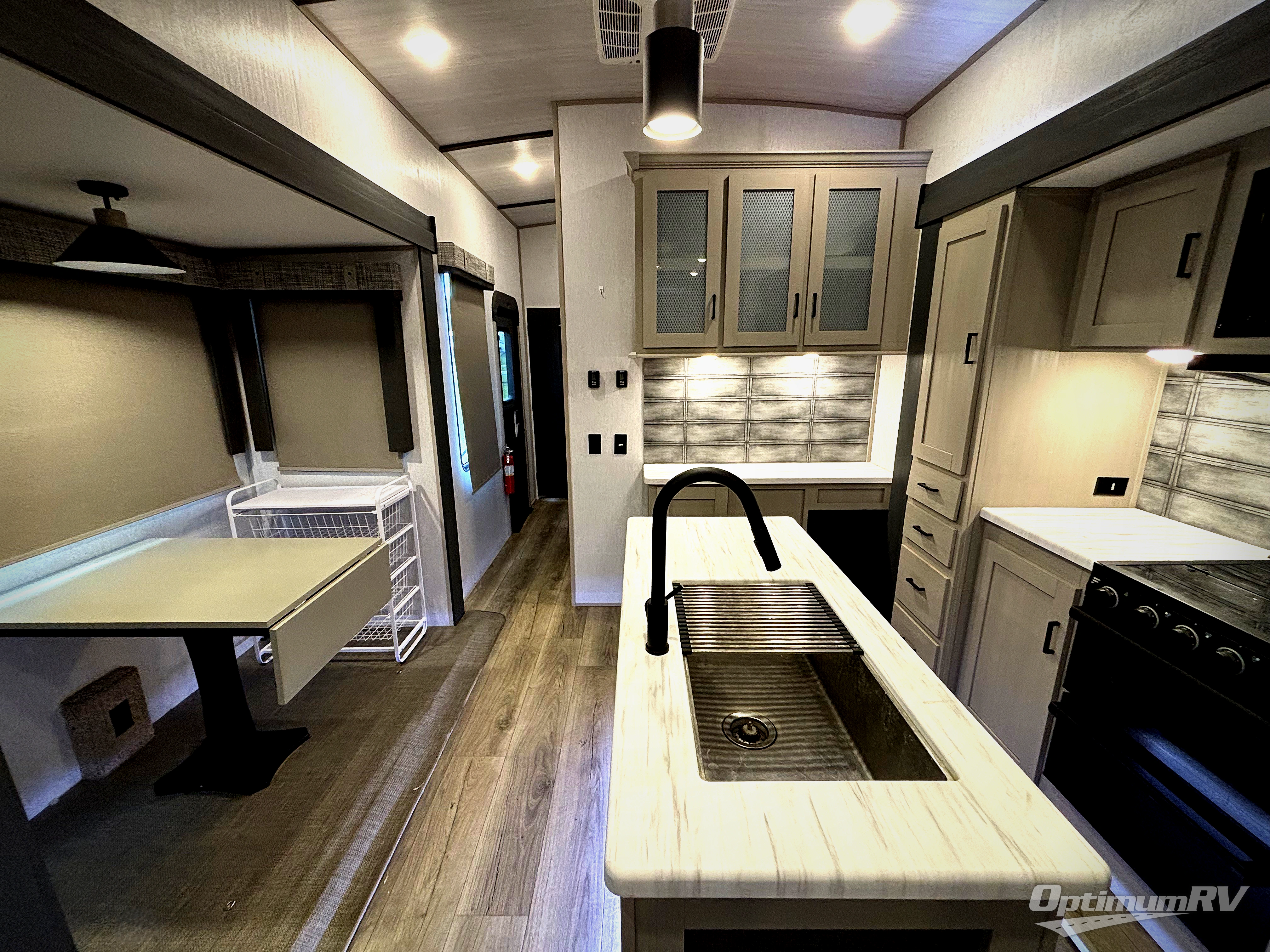 This fifth wheel is decked out in features you're going to love from the front separate living area to the Texas-sized exterior pass-through storage area! The two tri-fold sofas can convert into sleeping space and the theater seating is the perfect place to relax while you watch your favorite movie on the 50" LED TV. The kitchen island not only makes meal prepping easy, but cleaning up just as easy with the large sink. Everyone will enjoy getting ready each morning in the full bathroom with the residential walk-in shower and a vanity sink next to it. The rear private bedroom has everything you will need to feel right at home with the custom king bed, the wardrobe that is prepped to add the optional washer and dryer, and the large panoramic window on the rear wall to let in some morning sunlight. Plus, there are stairs just outside the bedroom that lead up to the loft with two bunk mats and storage areas!