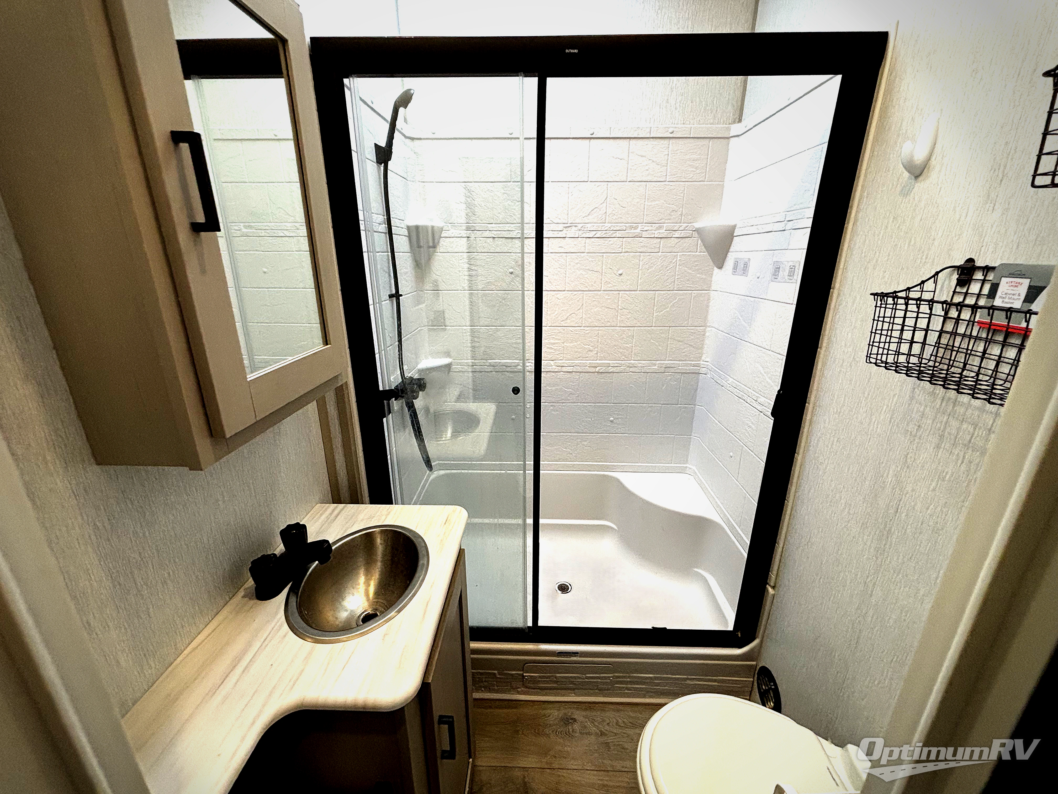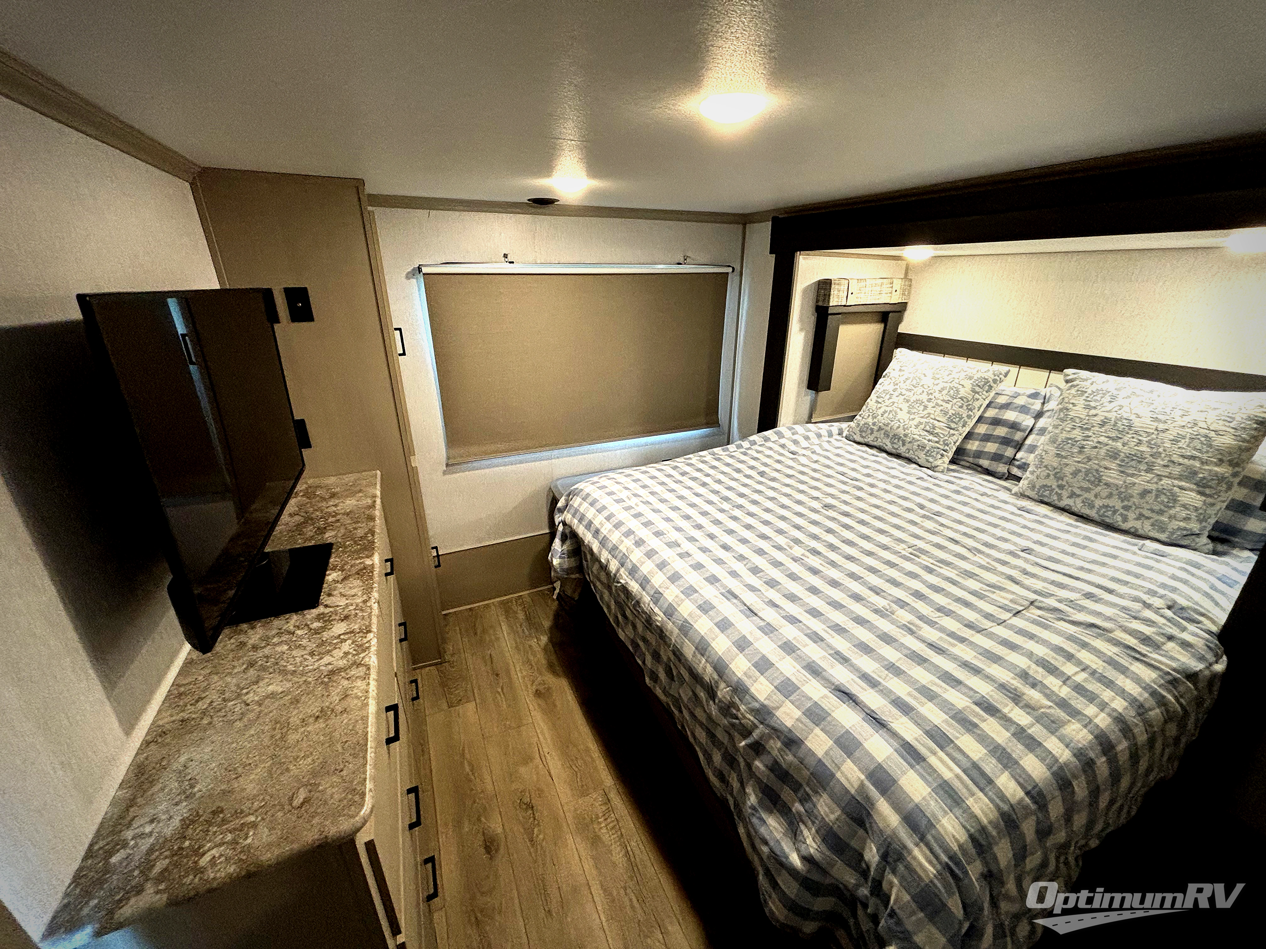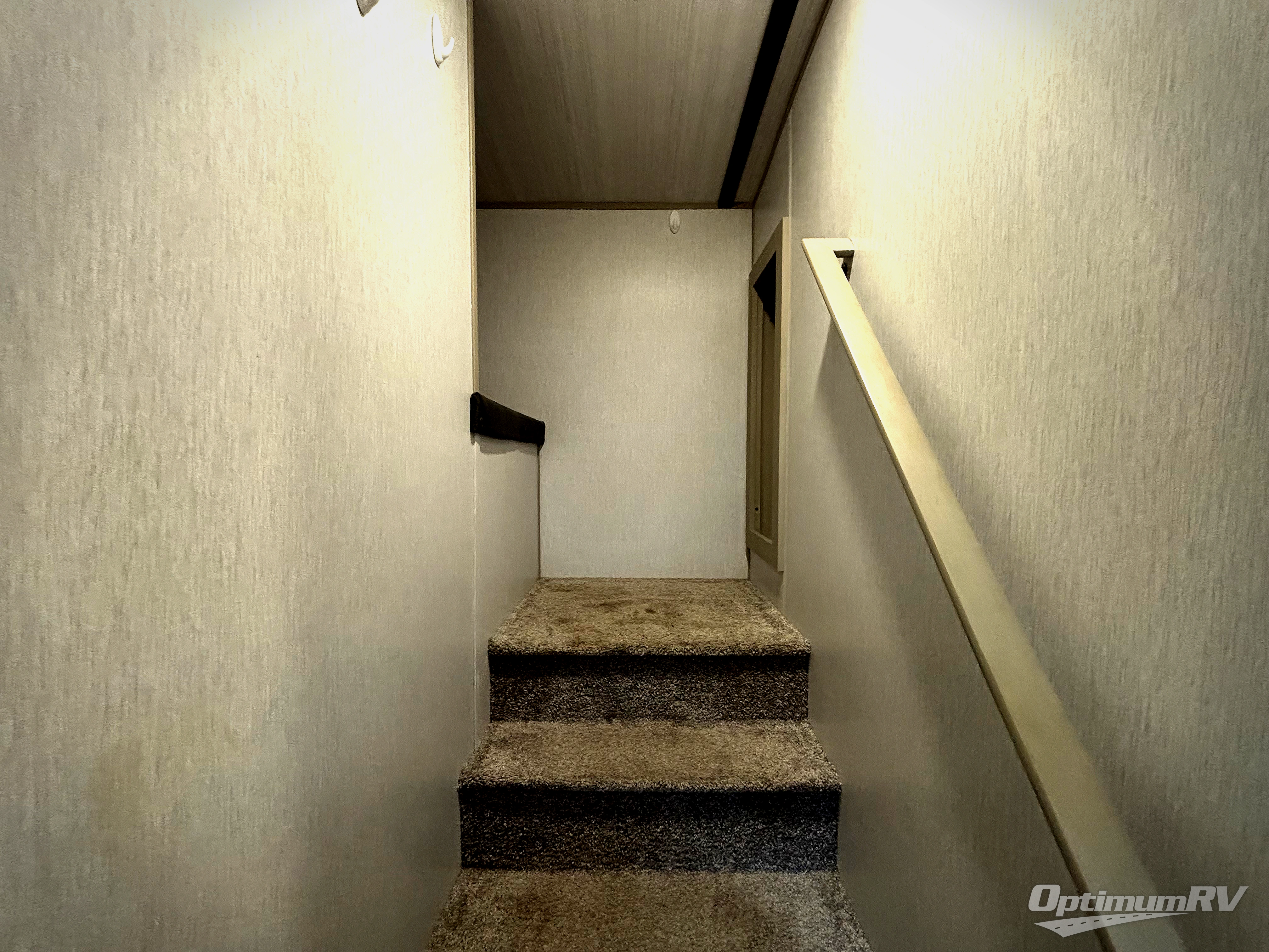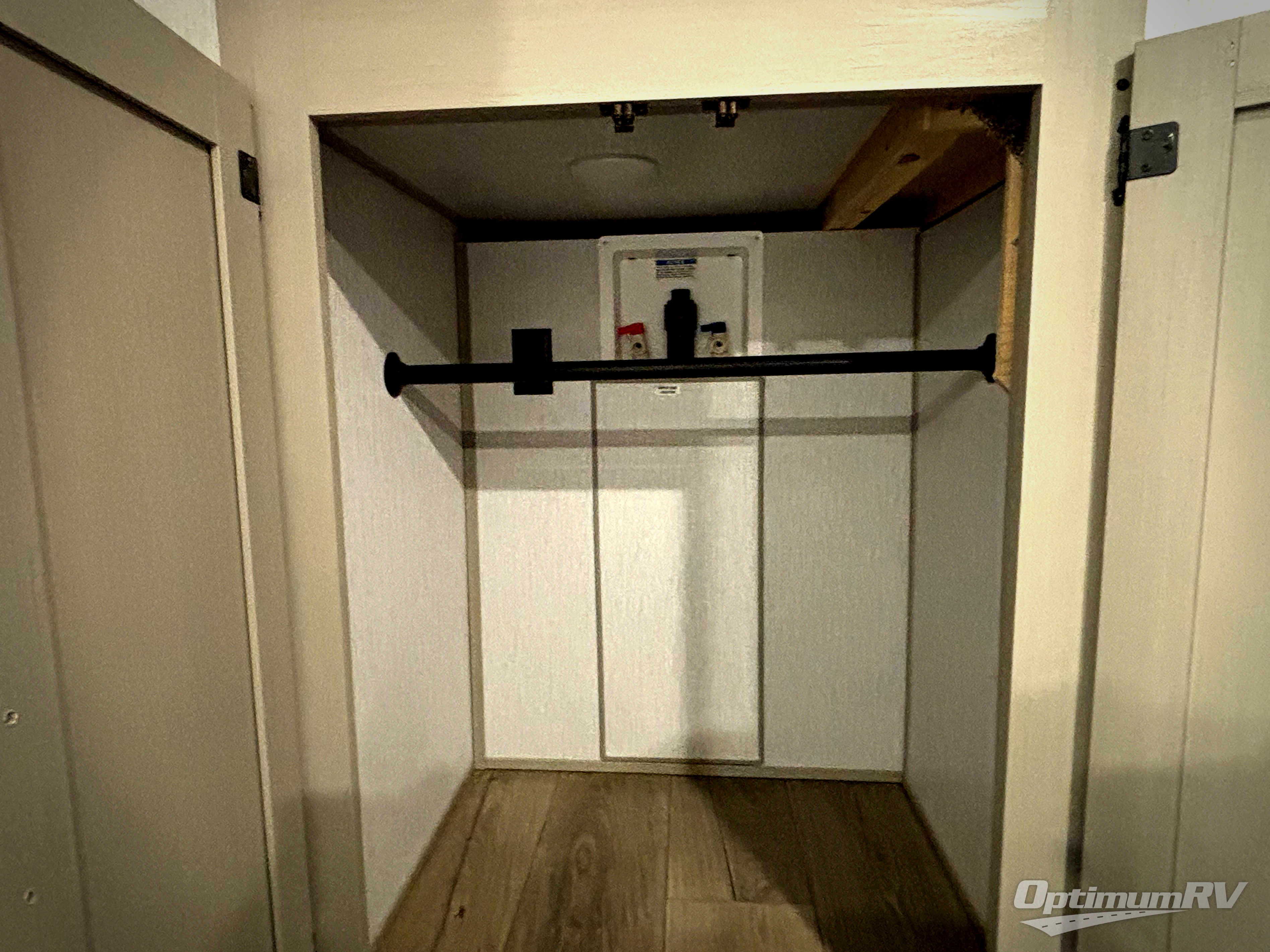 This fifth wheel is decked out in features you're going to love from the front separate living area to the Texas-sized exterior pass-through storage area! The two tri-fold sofas can convert into sleeping space and the theater seating is the perfect place to relax while you watch your favorite movie on the 50" LED TV. The kitchen island not only makes meal prepping easy, but cleaning up just as easy with the large sink. Everyone will enjoy getting ready each morning in the full bathroom with the residential walk-in shower and a vanity sink next to it. The rear private bedroom has everything you will need to feel right at home with the custom king bed, the wardrobe that is prepped to add the optional washer and dryer, and the large panoramic window on the rear wall to let in some morning sunlight. Plus, there are stairs just outside the bedroom that lead up to the loft with two bunk mats and storage areas!