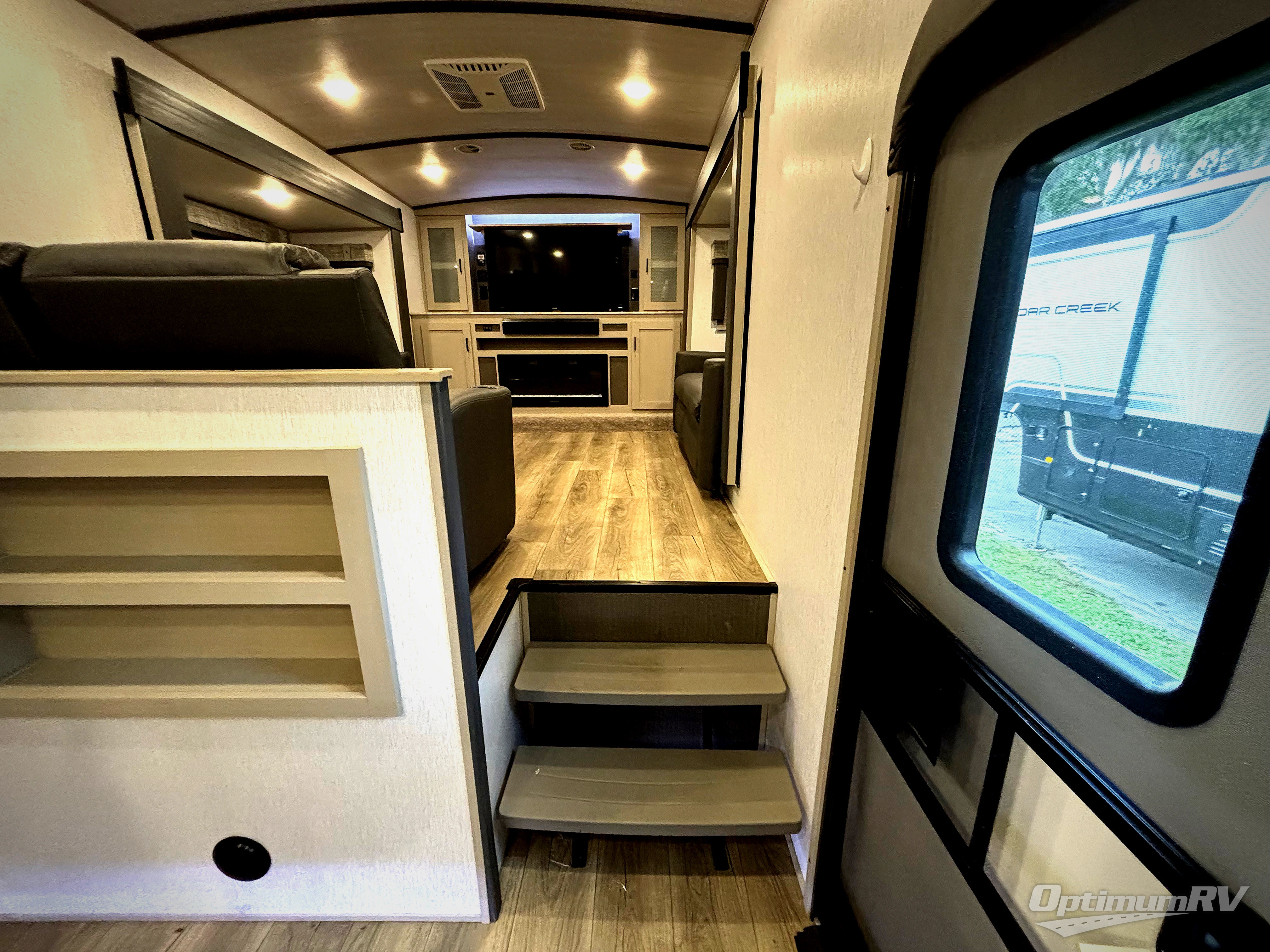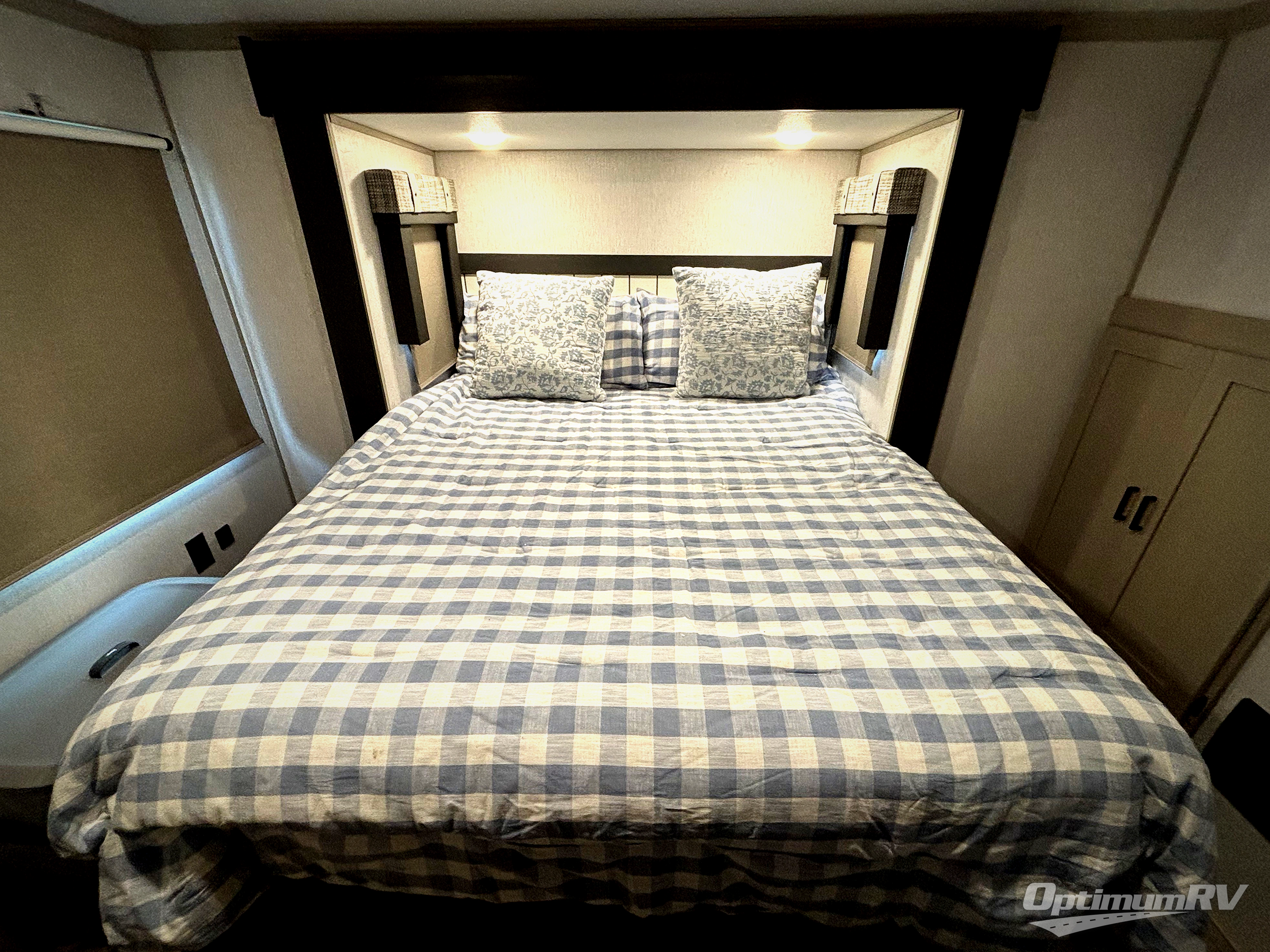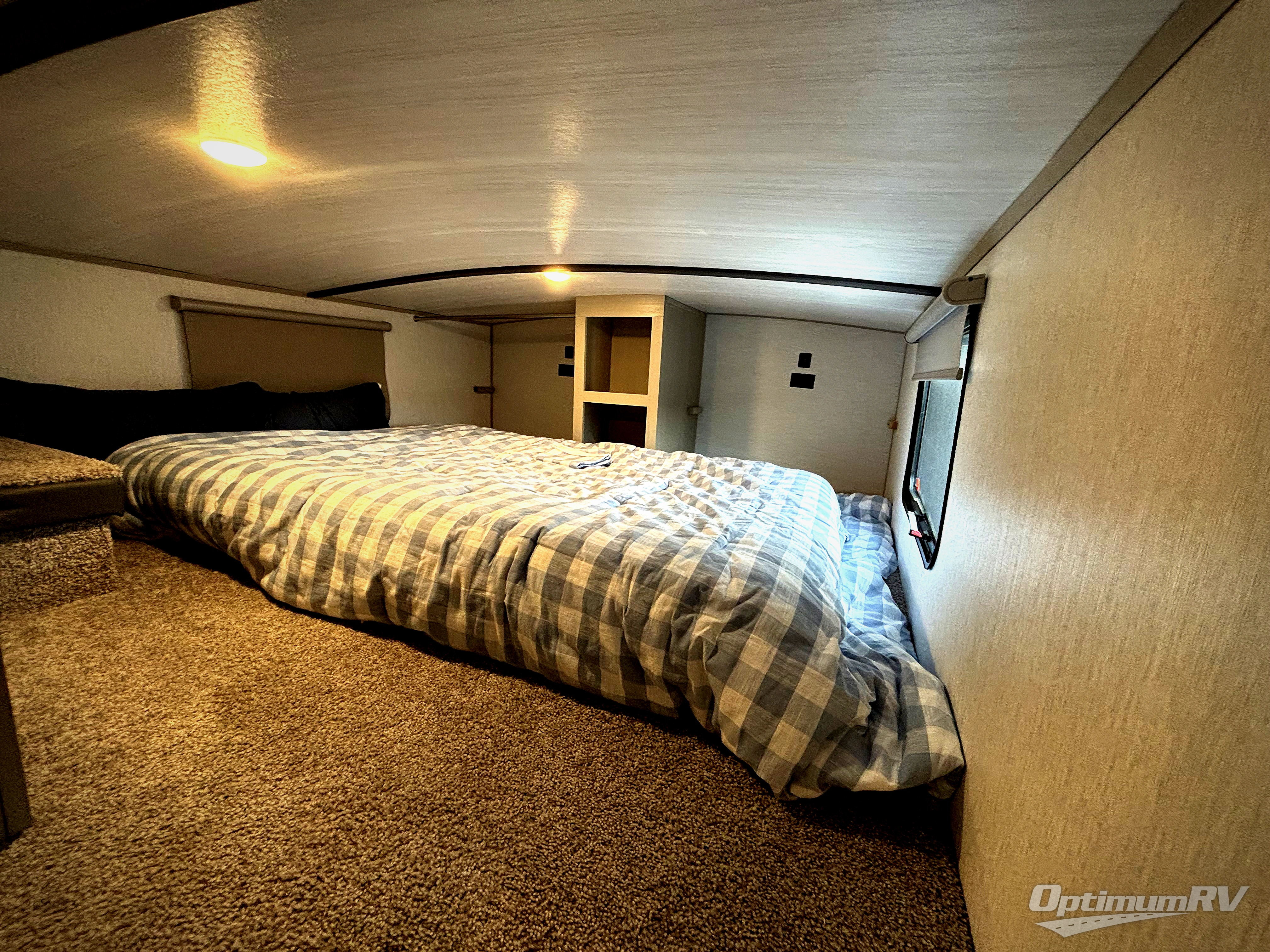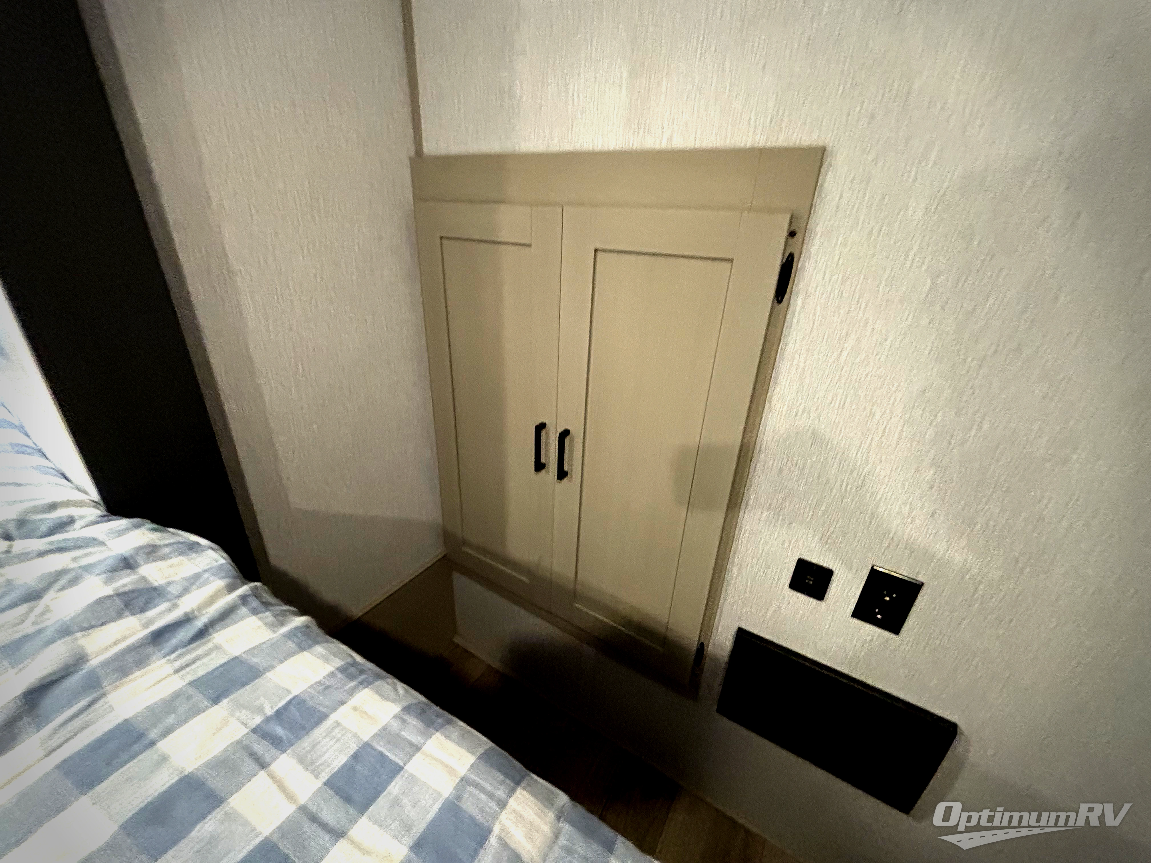 This fifth wheel is decked out in features you're going to love from the front separate living area to the Texas-sized exterior pass-through storage area! The two tri-fold sofas can convert into sleeping space and the theater seating is the perfect place to relax while you watch your favorite movie on the 50" LED TV. The kitchen island not only makes meal prepping easy, but cleaning up just as easy with the large sink. Everyone will enjoy getting ready each morning in the full bathroom with the residential walk-in shower and a vanity sink next to it. The rear private bedroom has everything you will need to feel right at home with the custom king bed, the wardrobe that is prepped to add the optional washer and dryer, and the large panoramic window on the rear wall to let in some morning sunlight. Plus, there are stairs just outside the bedroom that lead up to the loft with two bunk mats and storage areas!