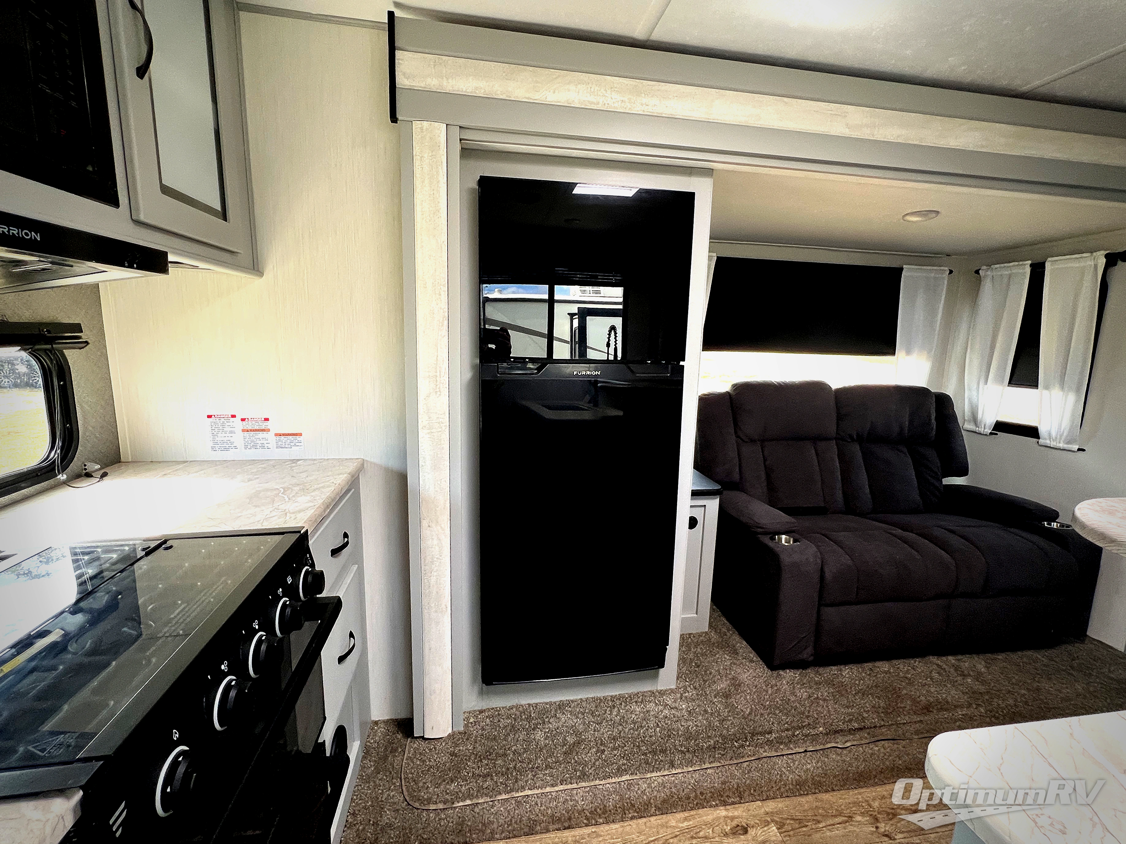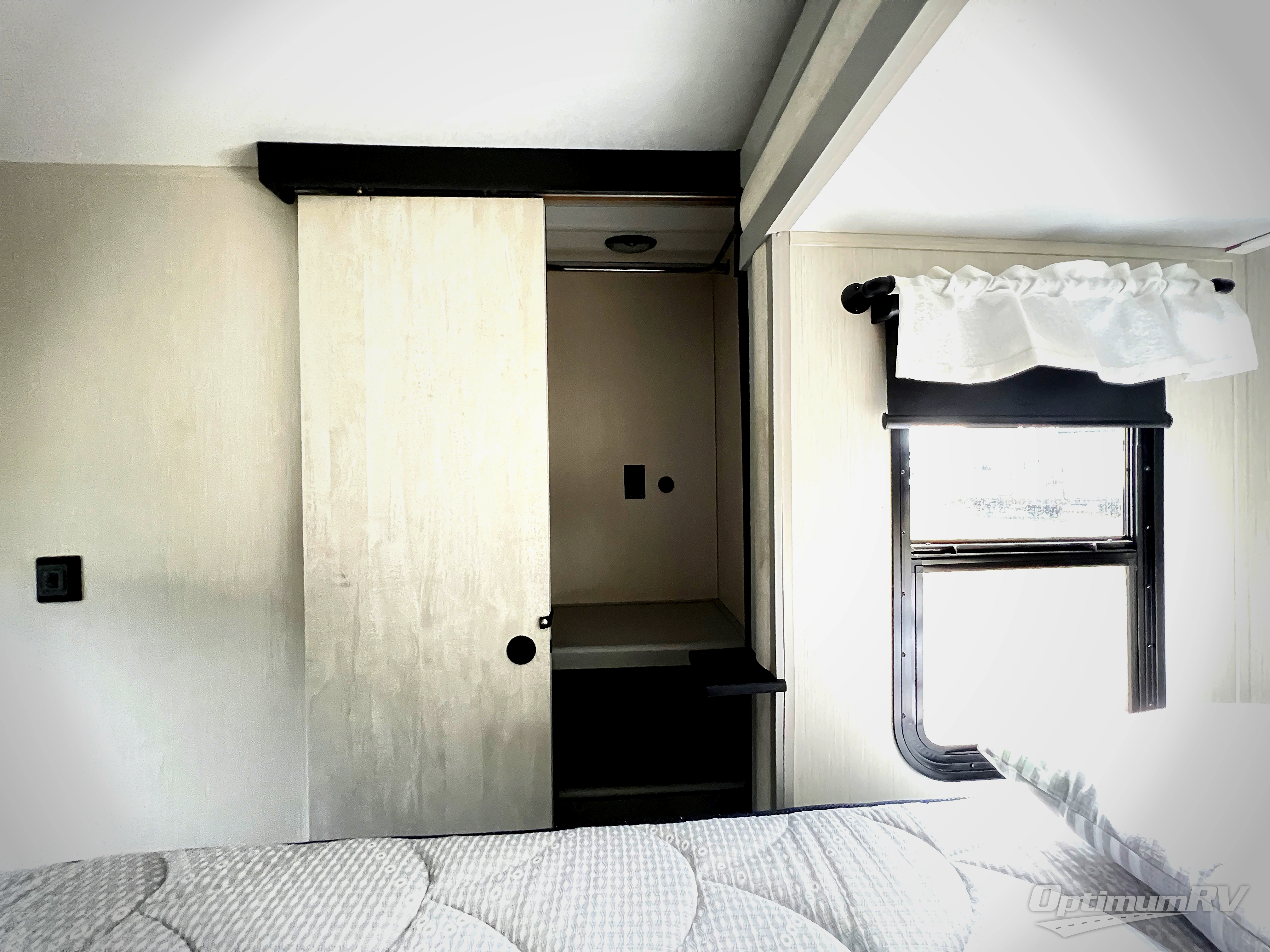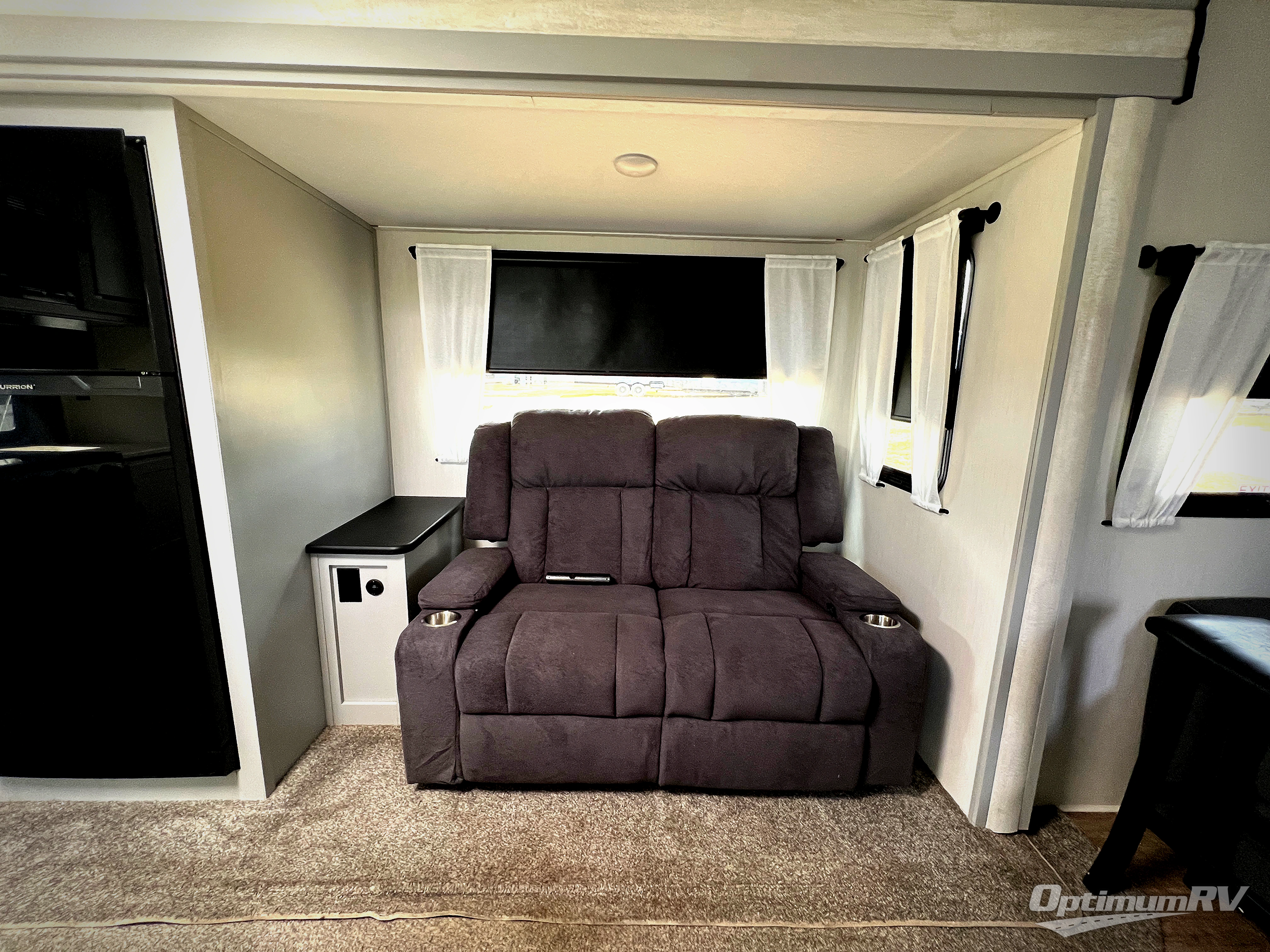 There is no going back to your tent-camping days after touring this travel trailer. The rear kitchen is any chef's dream with its walk-in pantry, residential refrigerator, plus a bar with stools where the kids can enjoy coloring. You will find comfortable seating space on the dual chairs and tri-fold sofa, and the fireplace and 50" TV with storage will feel just like home. The full bath will allow everyone space to clean up each day, and the front private bedroom will be your own oasis away from it all. Here, you will enjoy a slide out queen bed, a dresser where you can add a TV if you choose, plus a front walk-in closet so you can bring along all your favorite outfits!