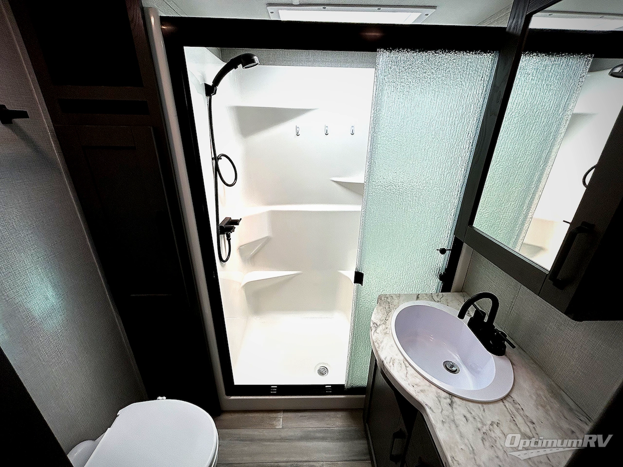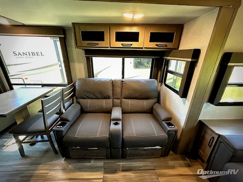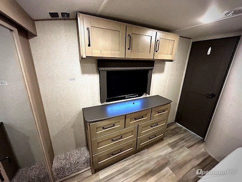 You can enjoy a spacious rear living area in this RV with dual opposing slides offering you entertainment, kitchen amenities, seating and windows for great views! The rear tri-fold sofa also converts into extra sleeping space for an extra guest or two, just like the booth dinette does. Yet you might like to add the free standing dinette option. There are theatre seats to enjoy while you place your drinks in the cupholders and watch the entertainment center with a 40" LED HDTV and fireplace. The pantry is big enough to store your favorite snacks, and the kitchen island will make meal prepping easier, plus there is a 16 cu. ft. refrigerator to store any leftovers. The full bathroom has a 30" x 48" fiberglass shower with a skylight above for natural lighting as you get ready and a linen closet to store your towels. The front private bedroom has a comfortable queen bed slide that can be switched out for the optional king bed, a dresser with overhead cabinets, and a full wall wardrobe that is prepped to add the optional washer and dryer so that you can extend your camping trip with clean clothes!