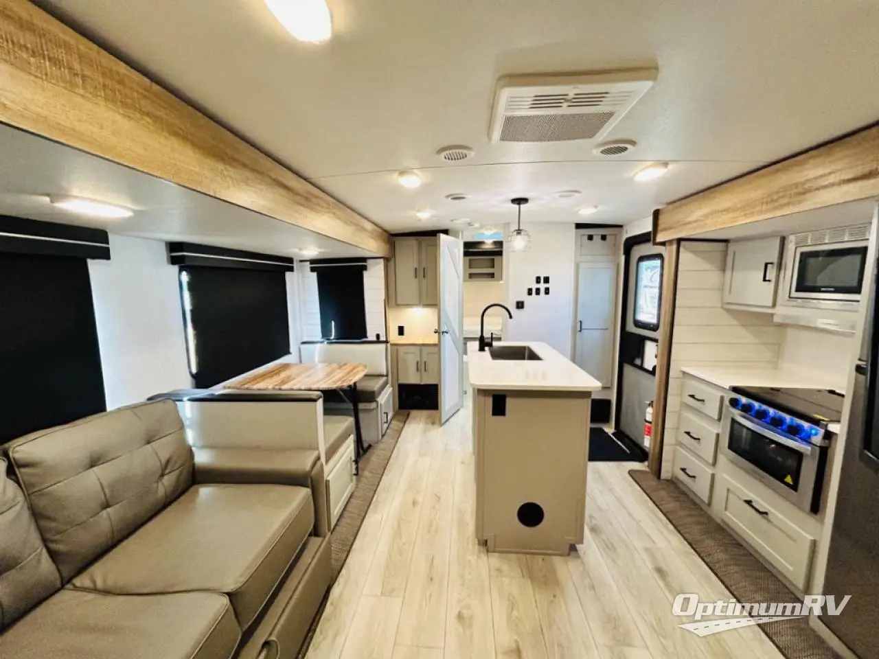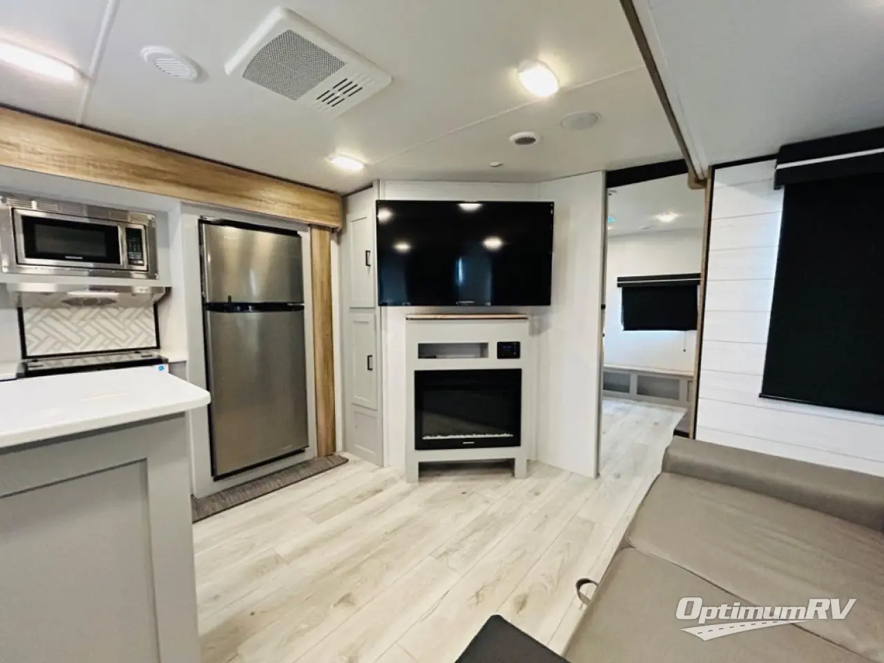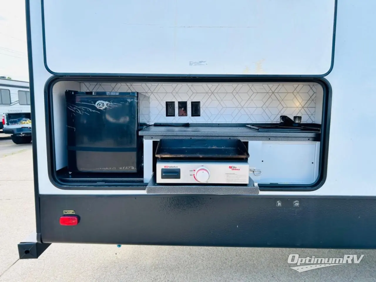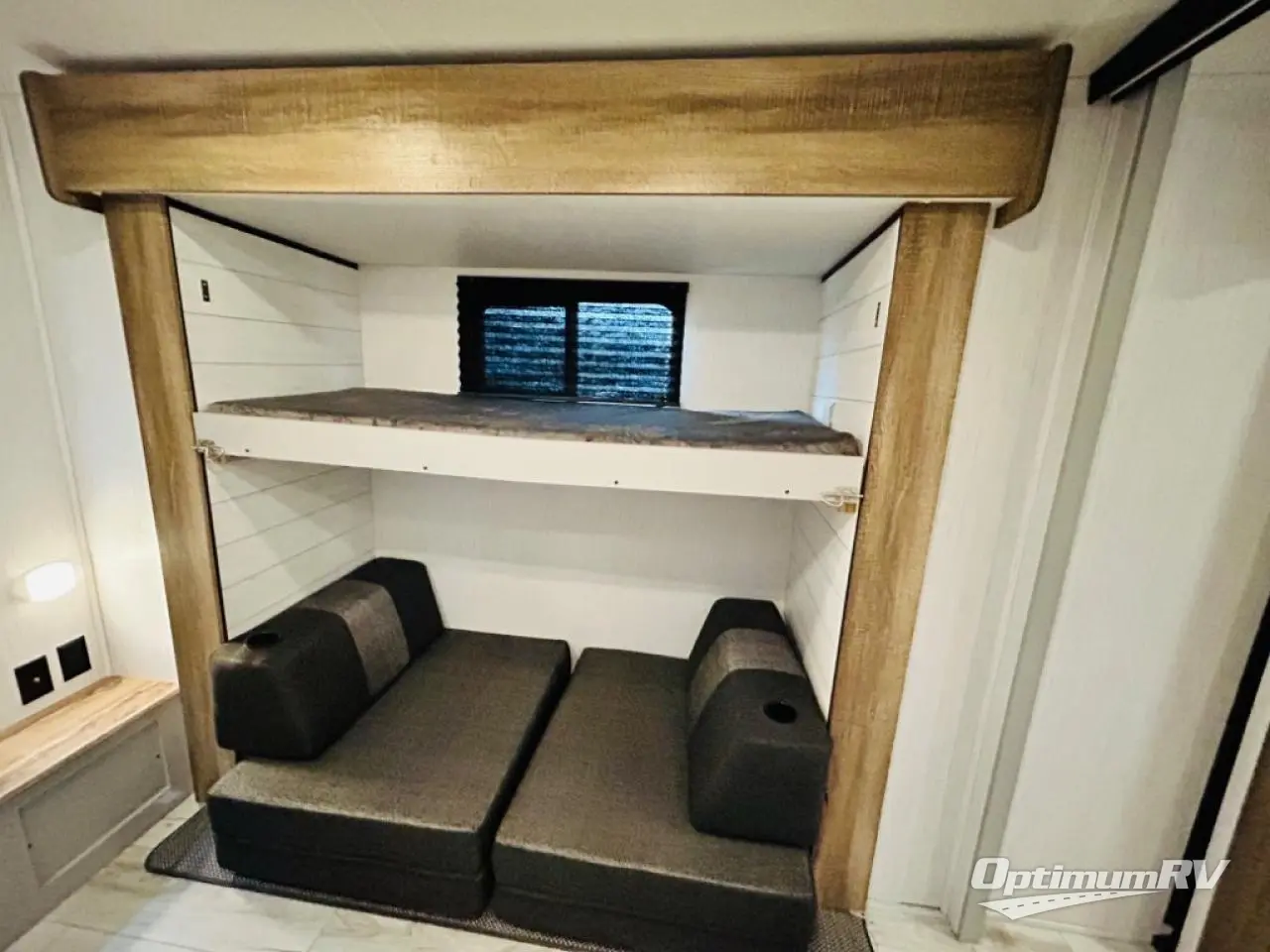 The ultimate travel trailer awaits you in this triple slide out model with a private bunkhouse suite, an exterior kitchen, and dual entry doors. The kitchen island incudes a stainless steel sink and additional counter space to prep meals. Your crew can get comfortable on the sofa by the fireplace, plus there is a living room TV to enjoy movie nights. The walk-through bath leads to the front master suite with a king bed, dual nightstands, and a linen closet for additional storage. Don't let this travel trailer pass you up!