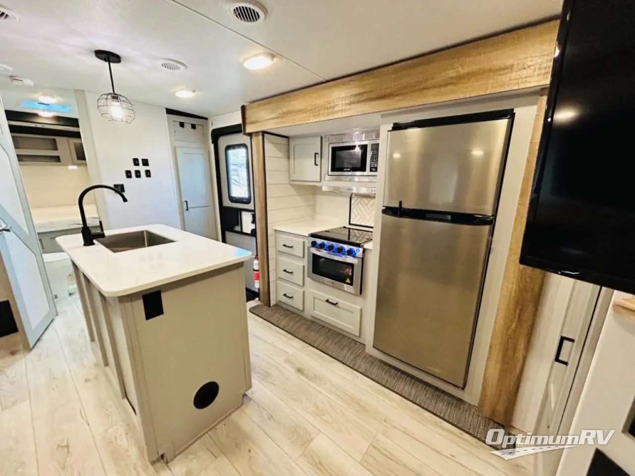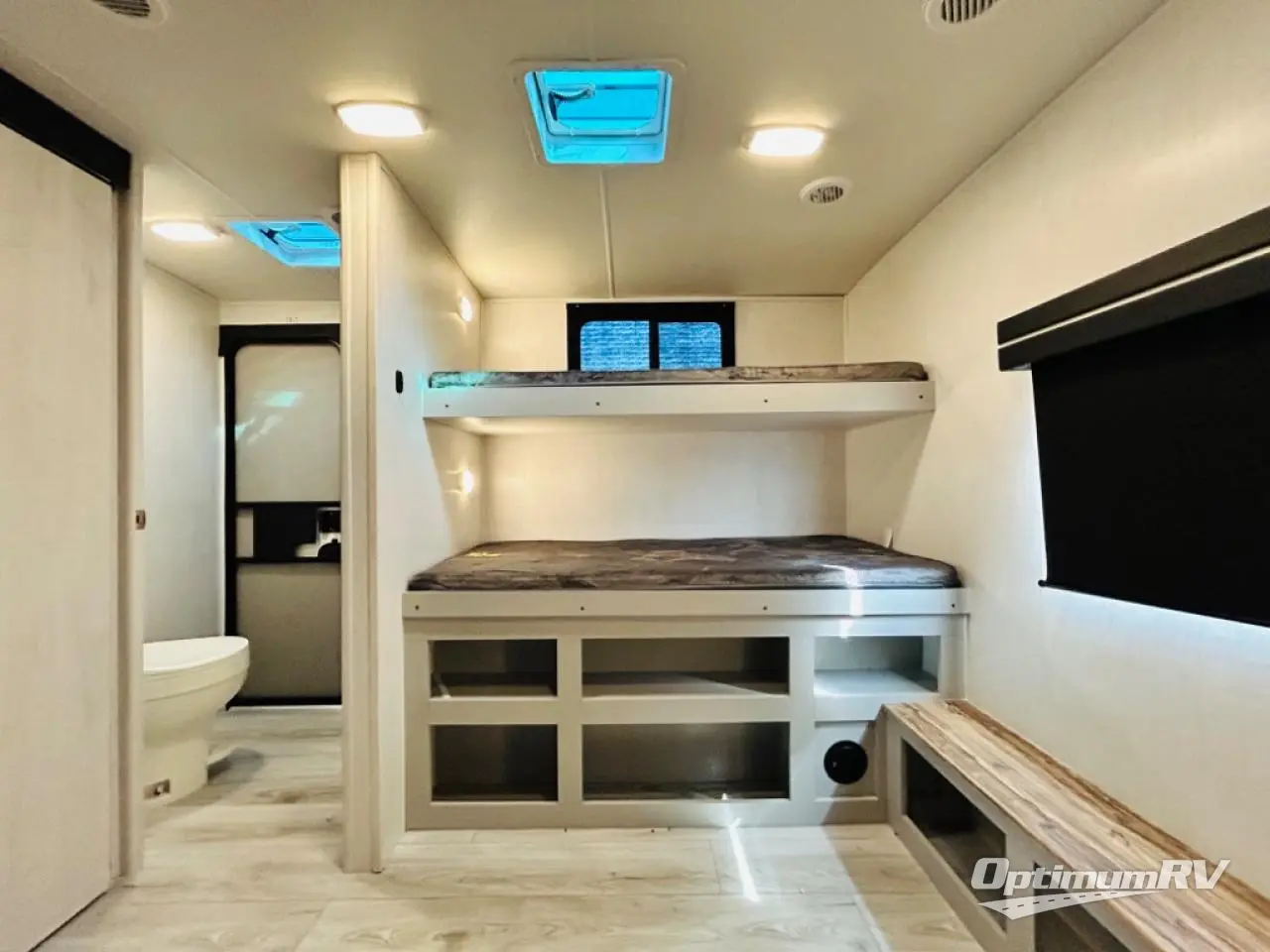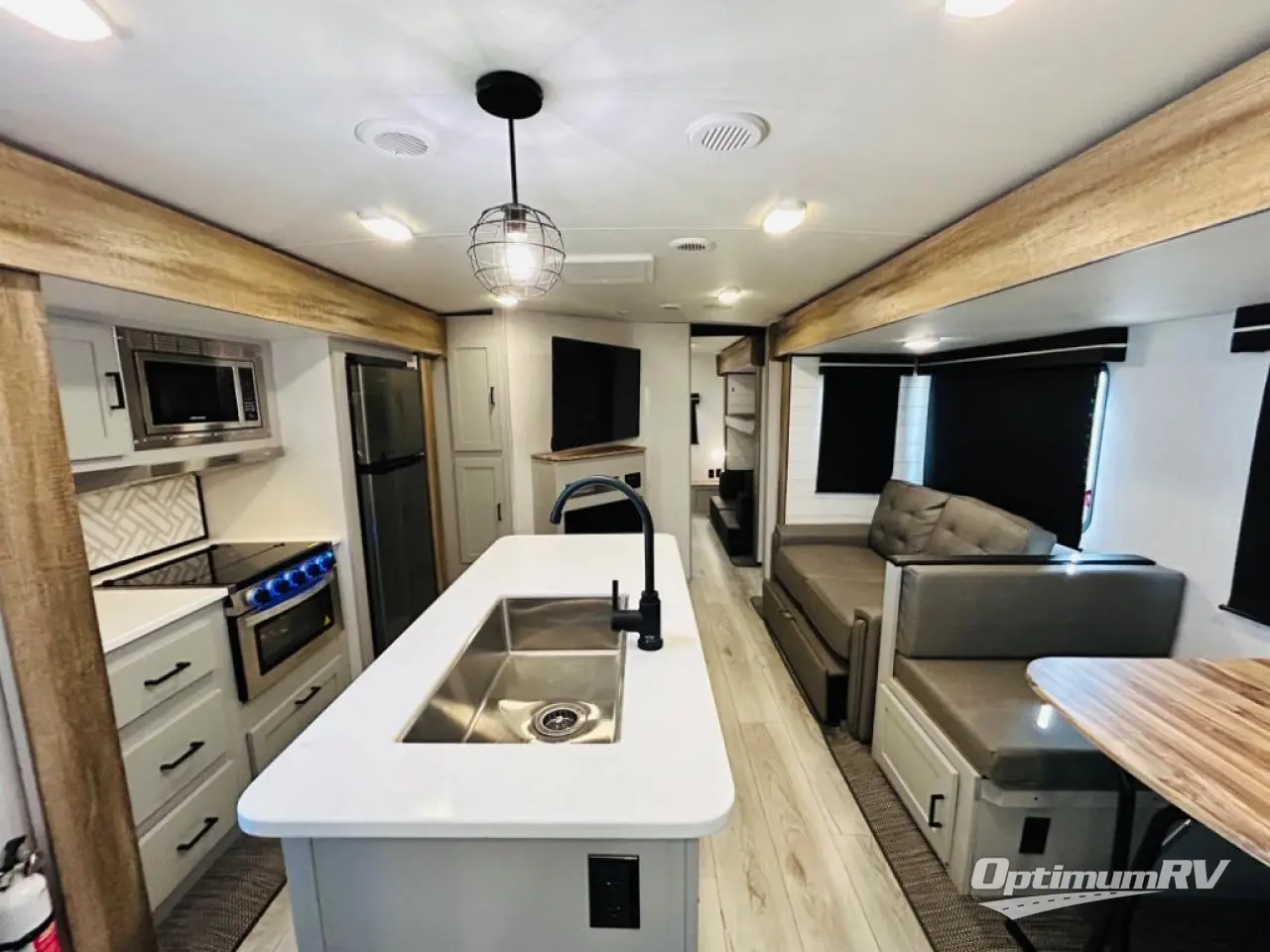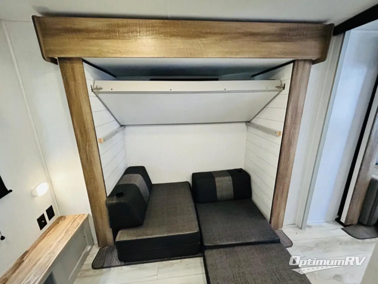 The ultimate travel trailer awaits you in this triple slide out model with a private bunkhouse suite, an exterior kitchen, and dual entry doors. The kitchen island incudes a stainless steel sink and additional counter space to prep meals. Your crew can get comfortable on the sofa by the fireplace, plus there is a living room TV to enjoy movie nights. The walk-through bath leads to the front master suite with a king bed, dual nightstands, and a linen closet for additional storage. Don't let this travel trailer pass you up!