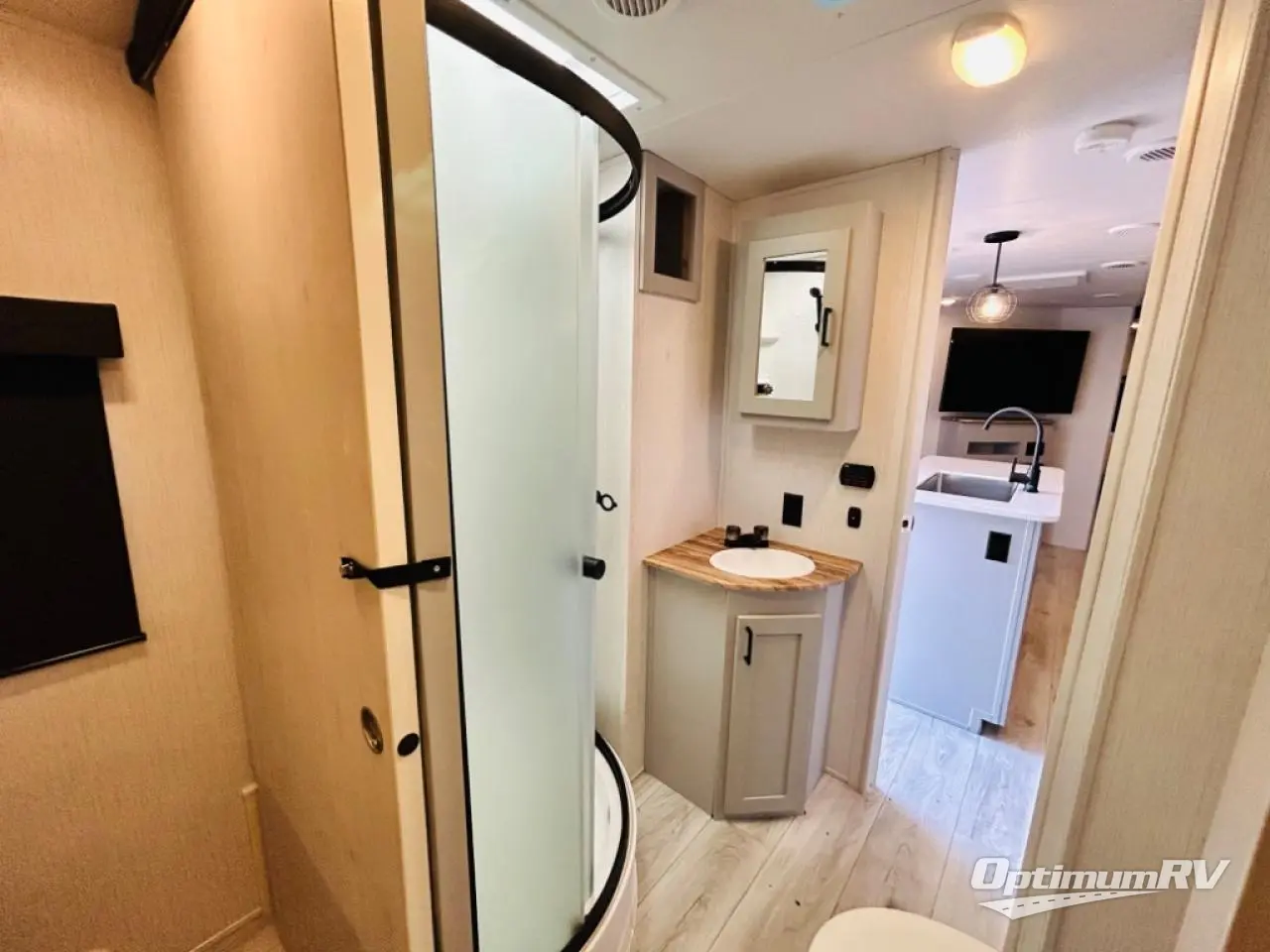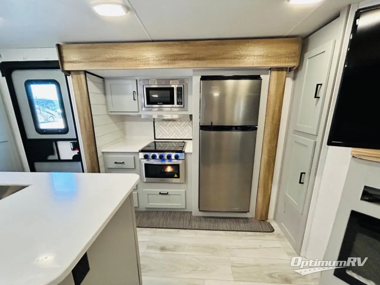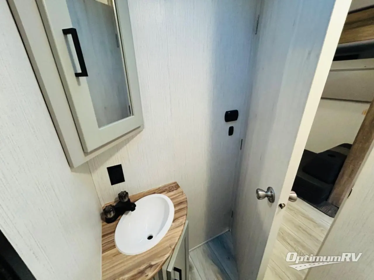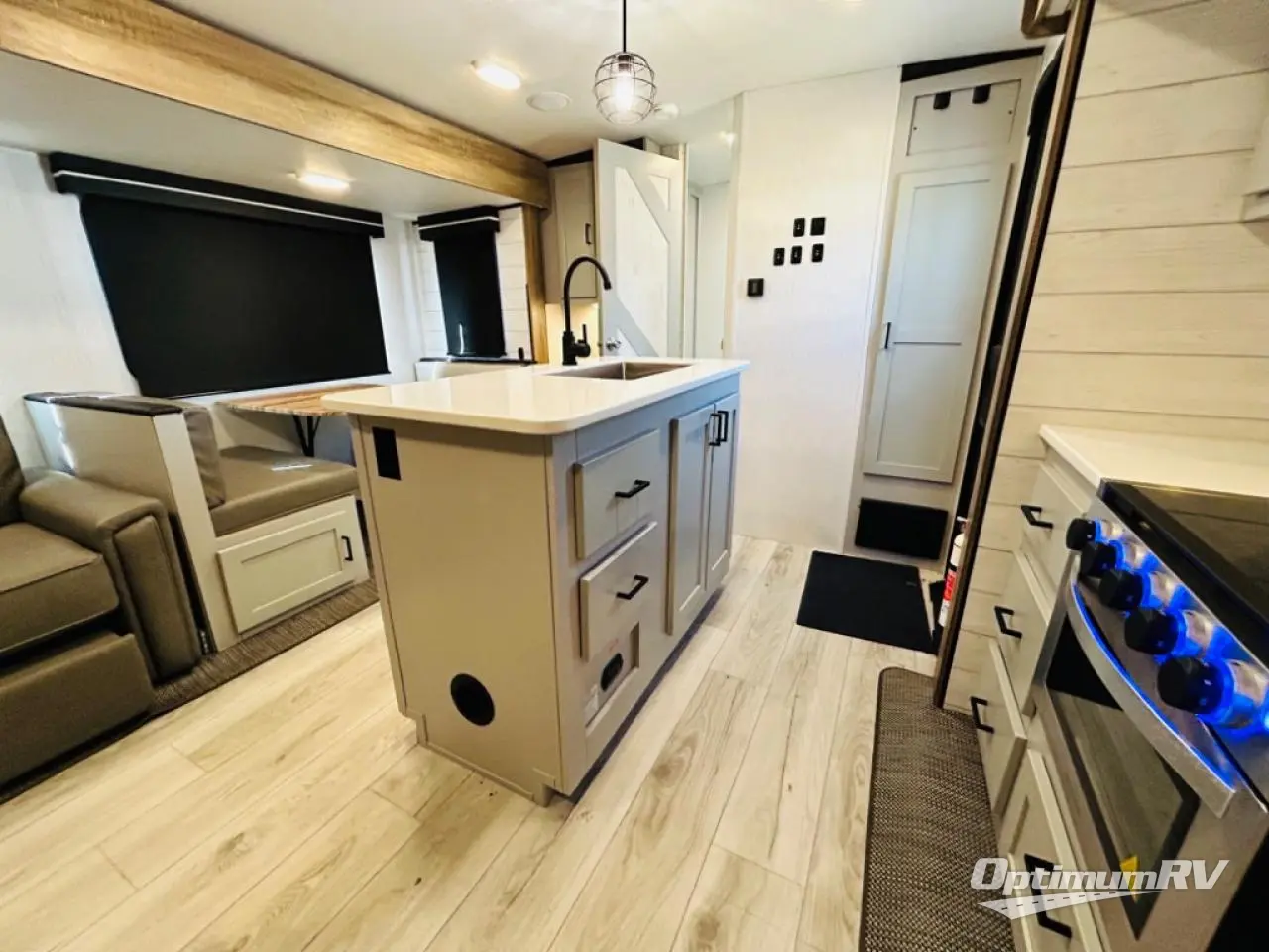 The ultimate travel trailer awaits you in this triple slide out model with a private bunkhouse suite, an exterior kitchen, and dual entry doors. The kitchen island incudes a stainless steel sink and additional counter space to prep meals. Your crew can get comfortable on the sofa by the fireplace, plus there is a living room TV to enjoy movie nights. The walk-through bath leads to the front master suite with a king bed, dual nightstands, and a linen closet for additional storage. Don't let this travel trailer pass you up!