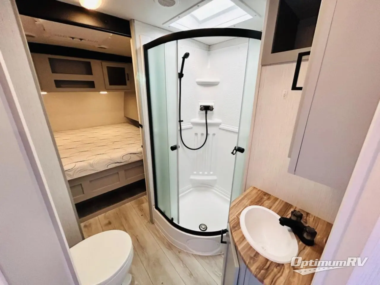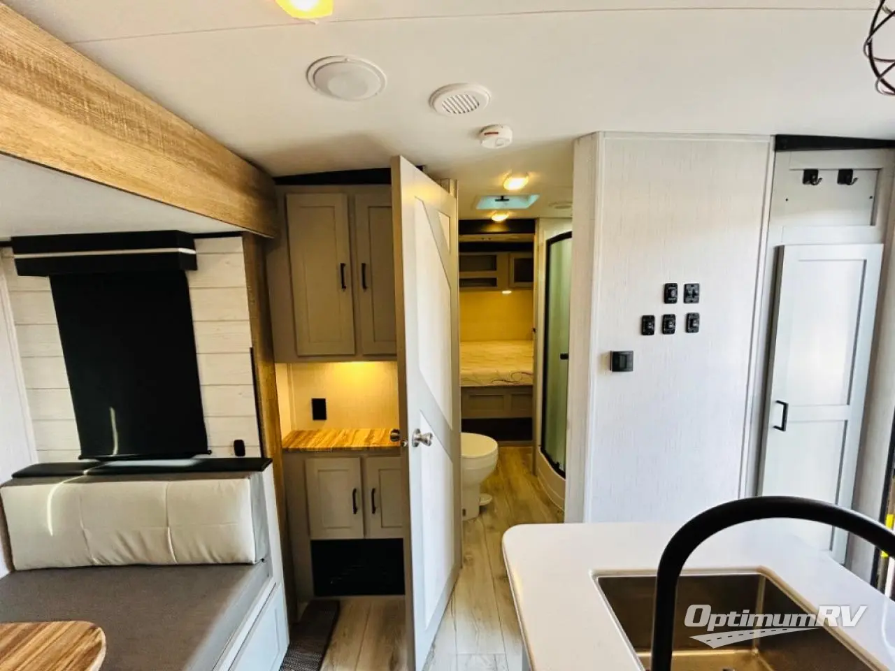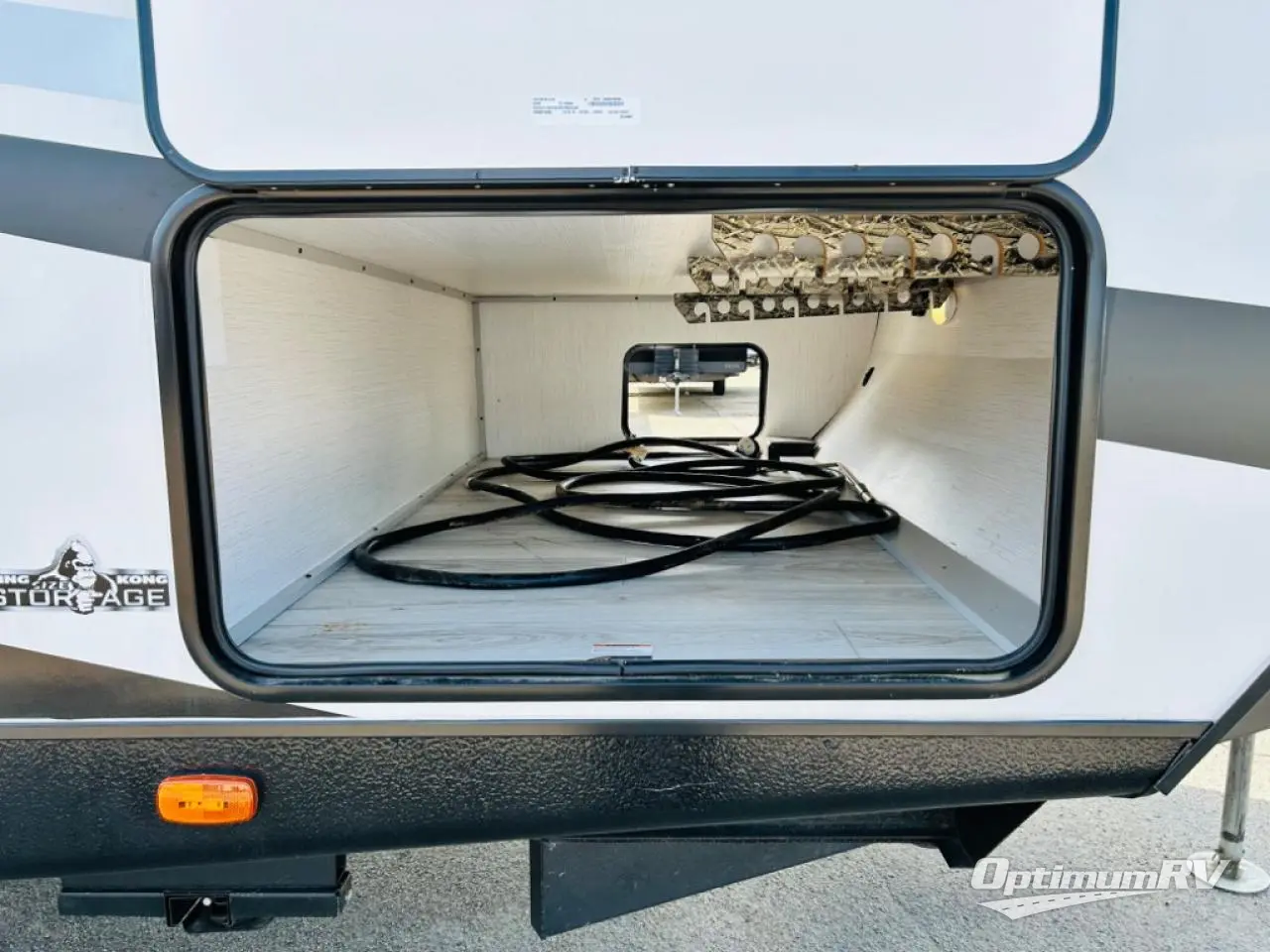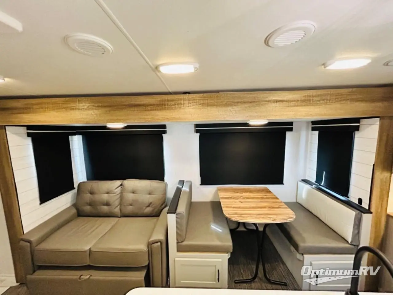 The ultimate travel trailer awaits you in this triple slide out model with a private bunkhouse suite, an exterior kitchen, and dual entry doors. The kitchen island incudes a stainless steel sink and additional counter space to prep meals. Your crew can get comfortable on the sofa by the fireplace, plus there is a living room TV to enjoy movie nights. The walk-through bath leads to the front master suite with a king bed, dual nightstands, and a linen closet for additional storage. Don't let this travel trailer pass you up!