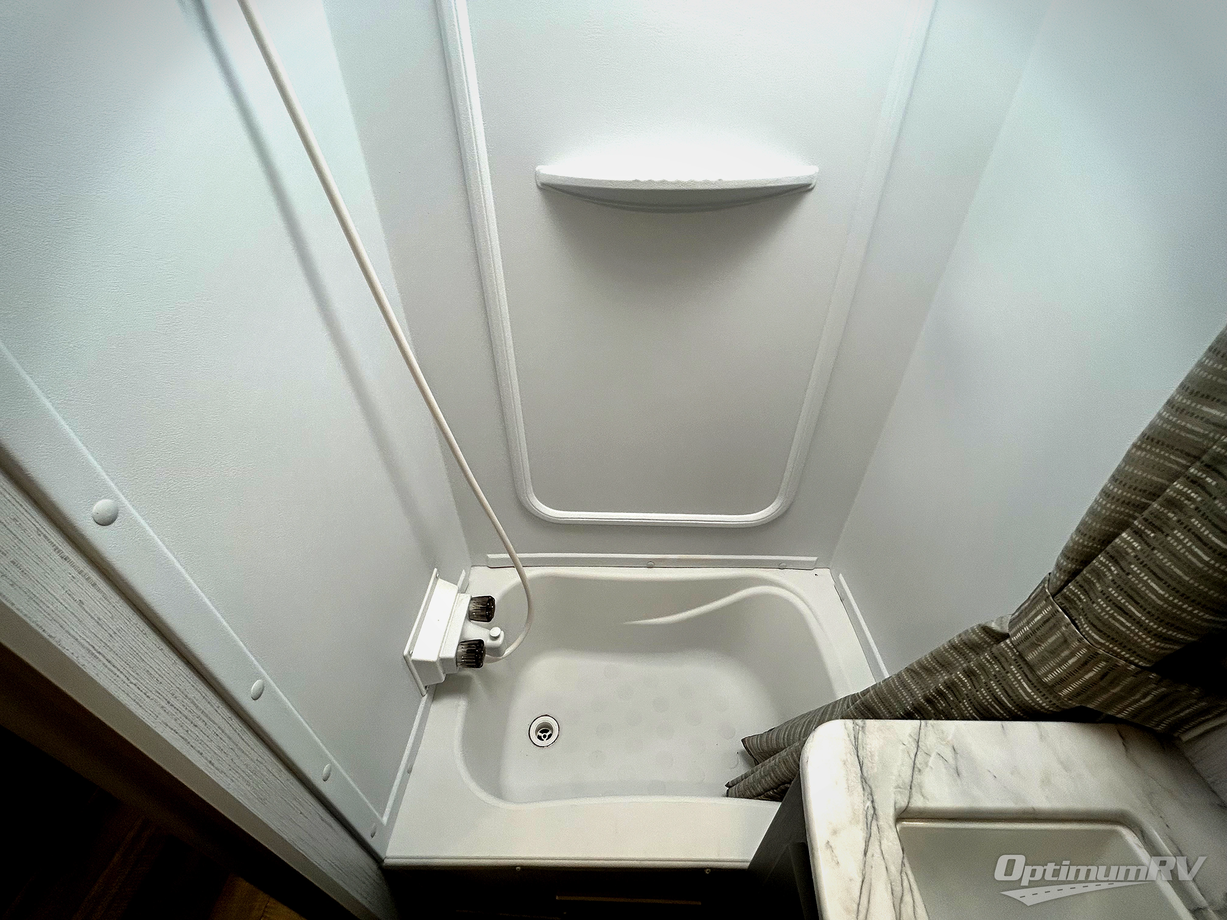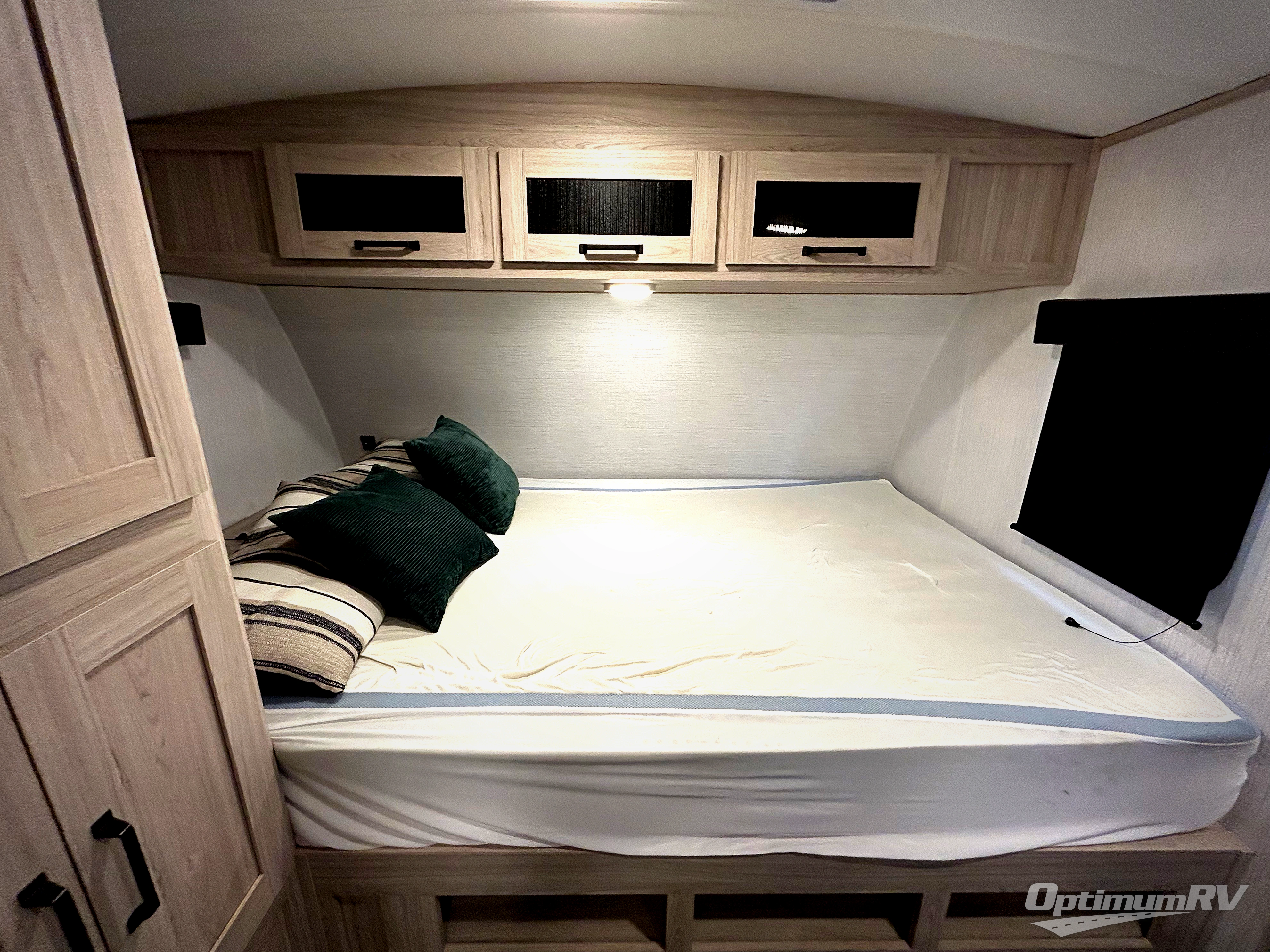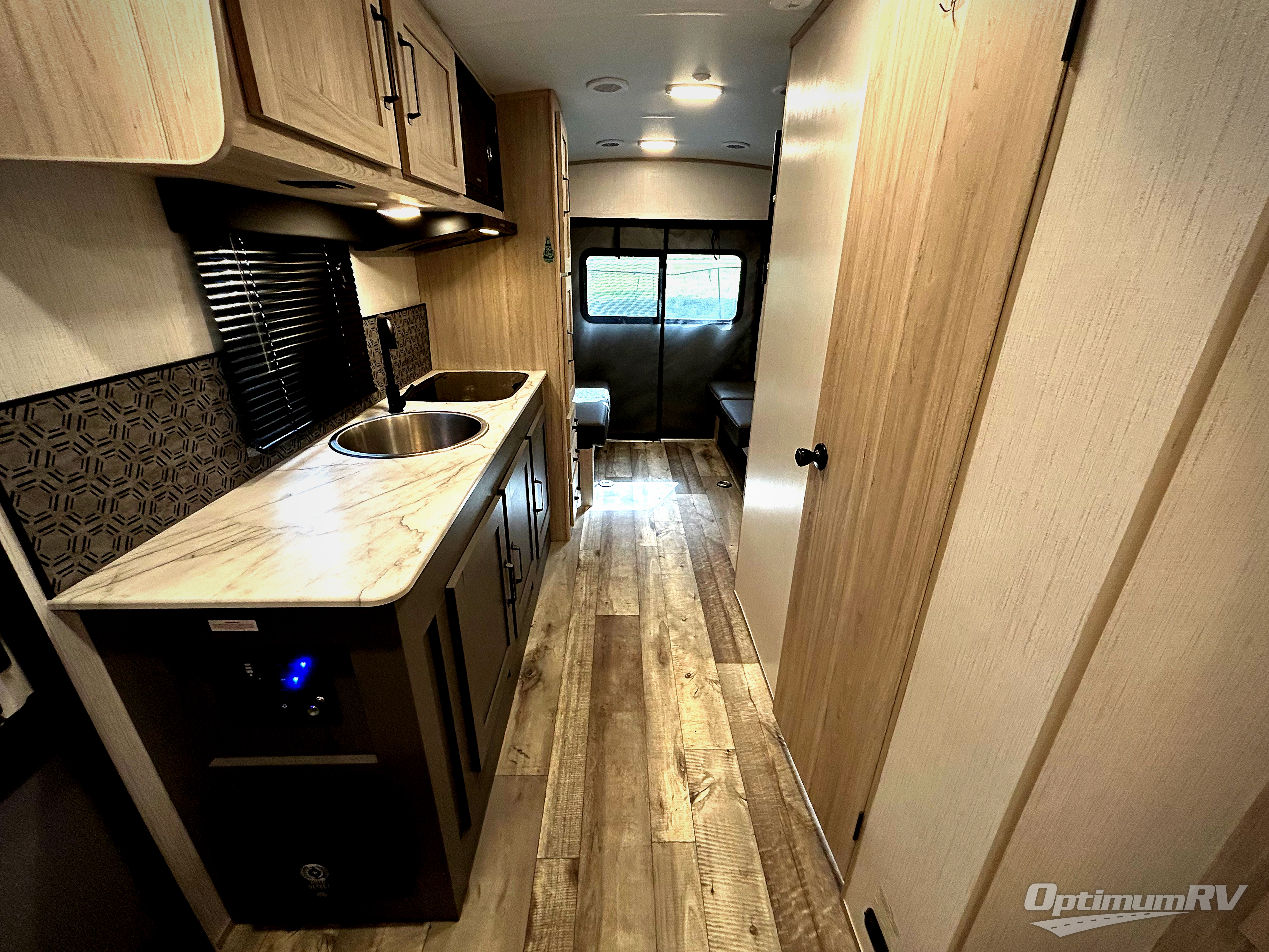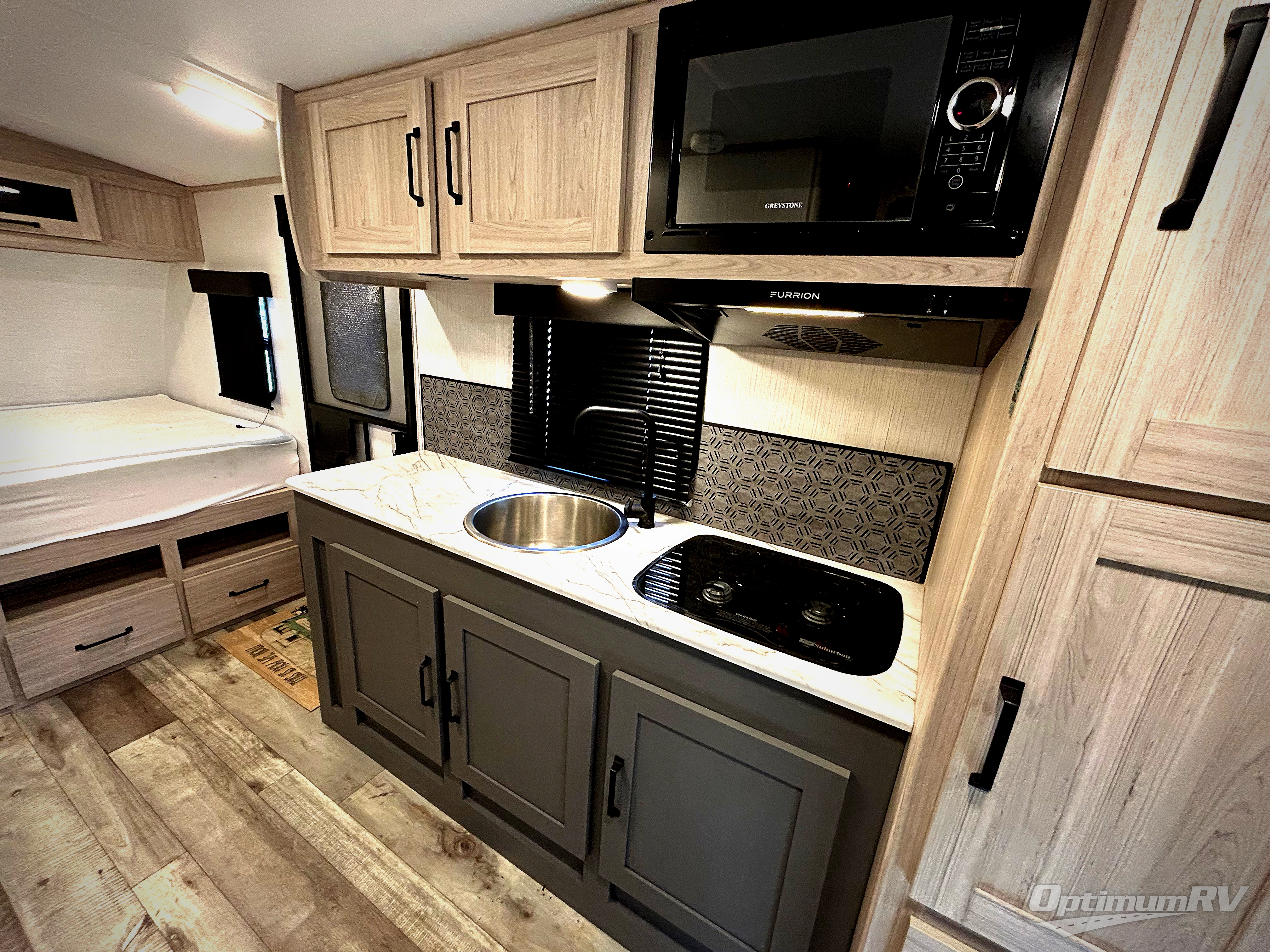 Weekends at the lake just got sweeter with this travel trailer in tow! You will love the flip-up back hatch baggage door that opens fully so you can easily load luggage, bikes, and kayaks. The free-standing dinette table provides more space for these items, and if you have guests they can sleep on the dinette seats once they're folded down. This model includes a two burner range in the kitchen, along with a 12V residential refrigerator, plus a slide out TV that rotates all the way around for better viewing. When you're ready to settle down for the night, the full bath will allow you to clean up, and the queen bed up front is sure to bring a great night's rest. There is even a bedroom closet to keep your clothes tidy!