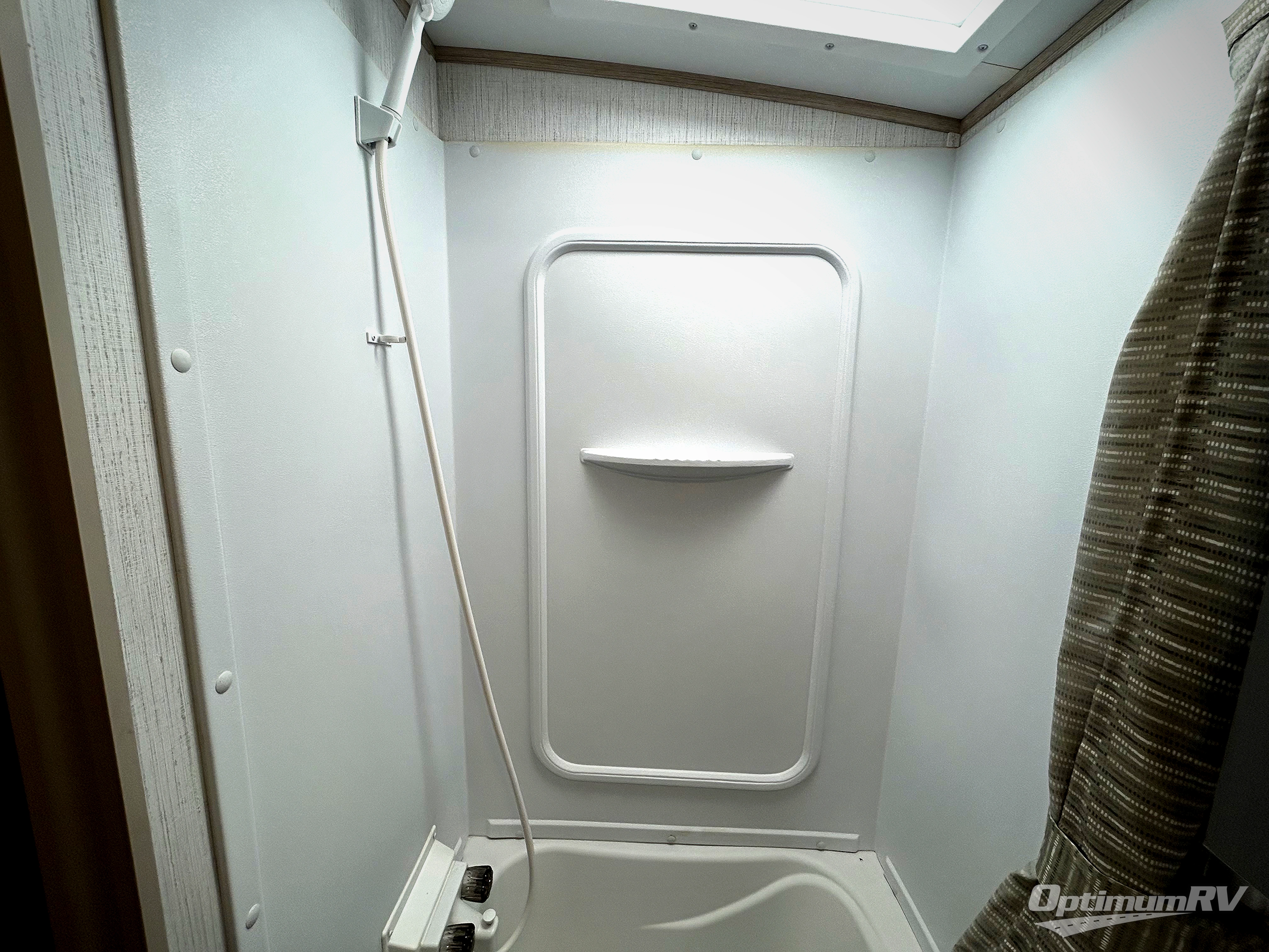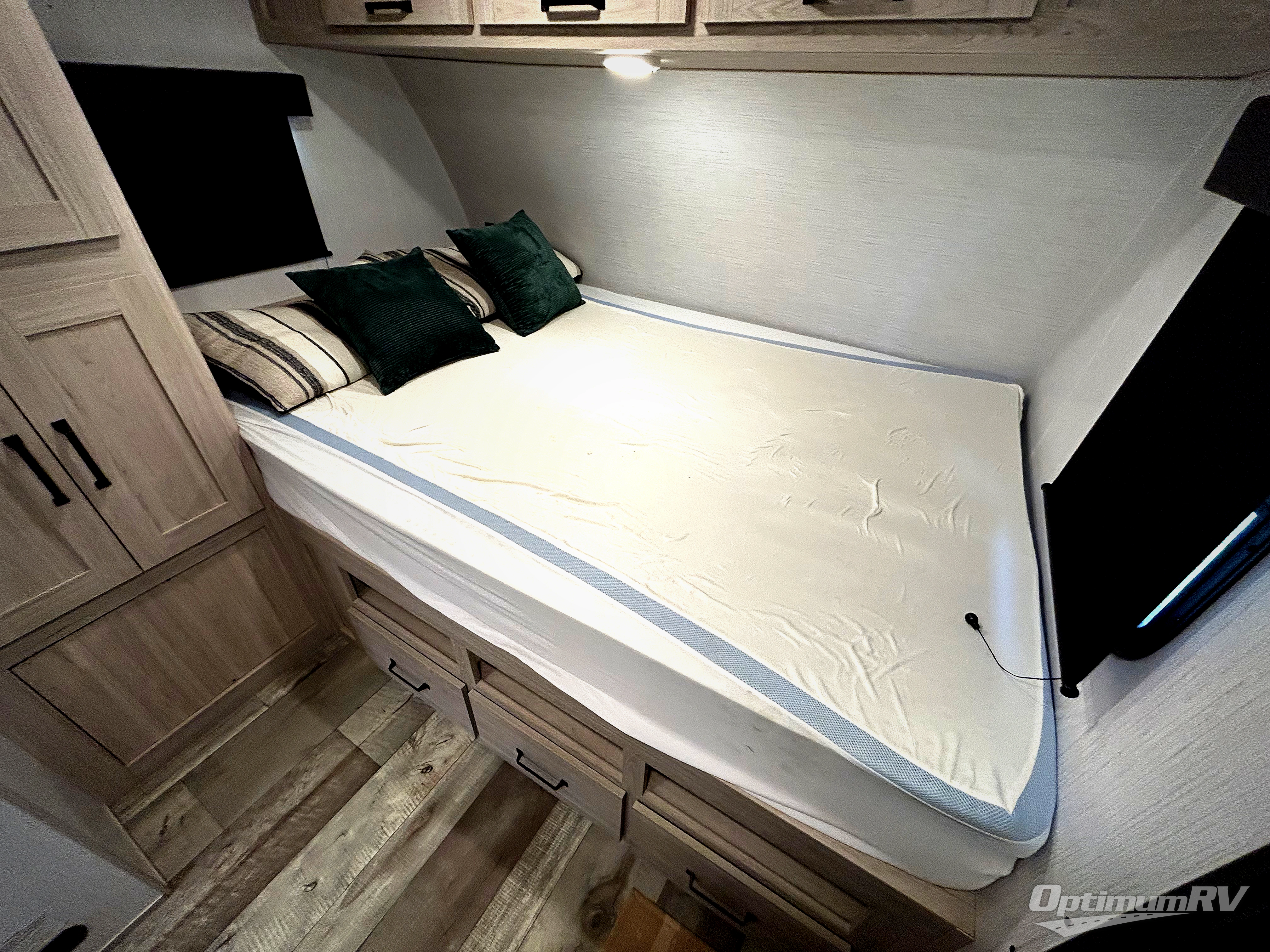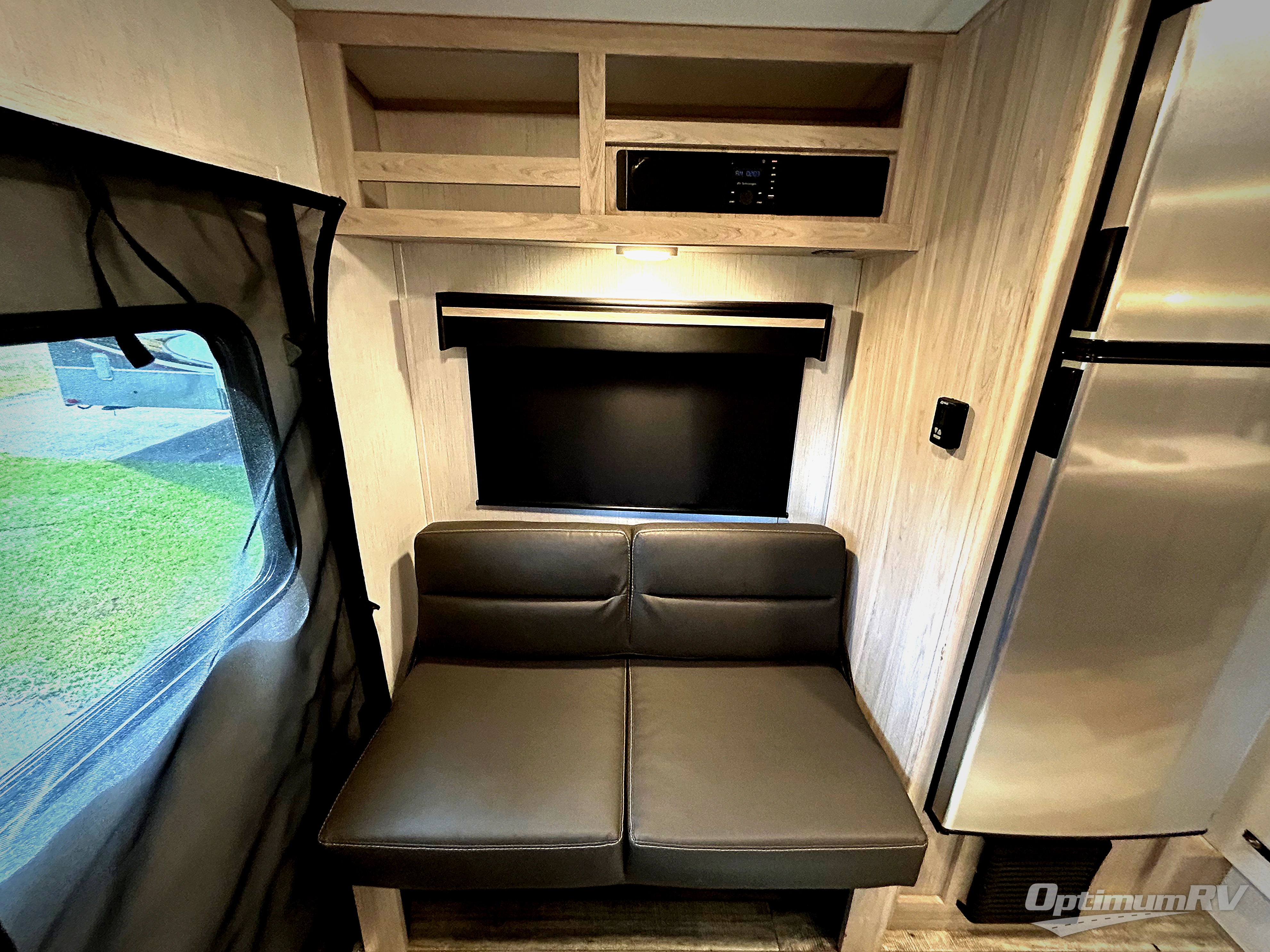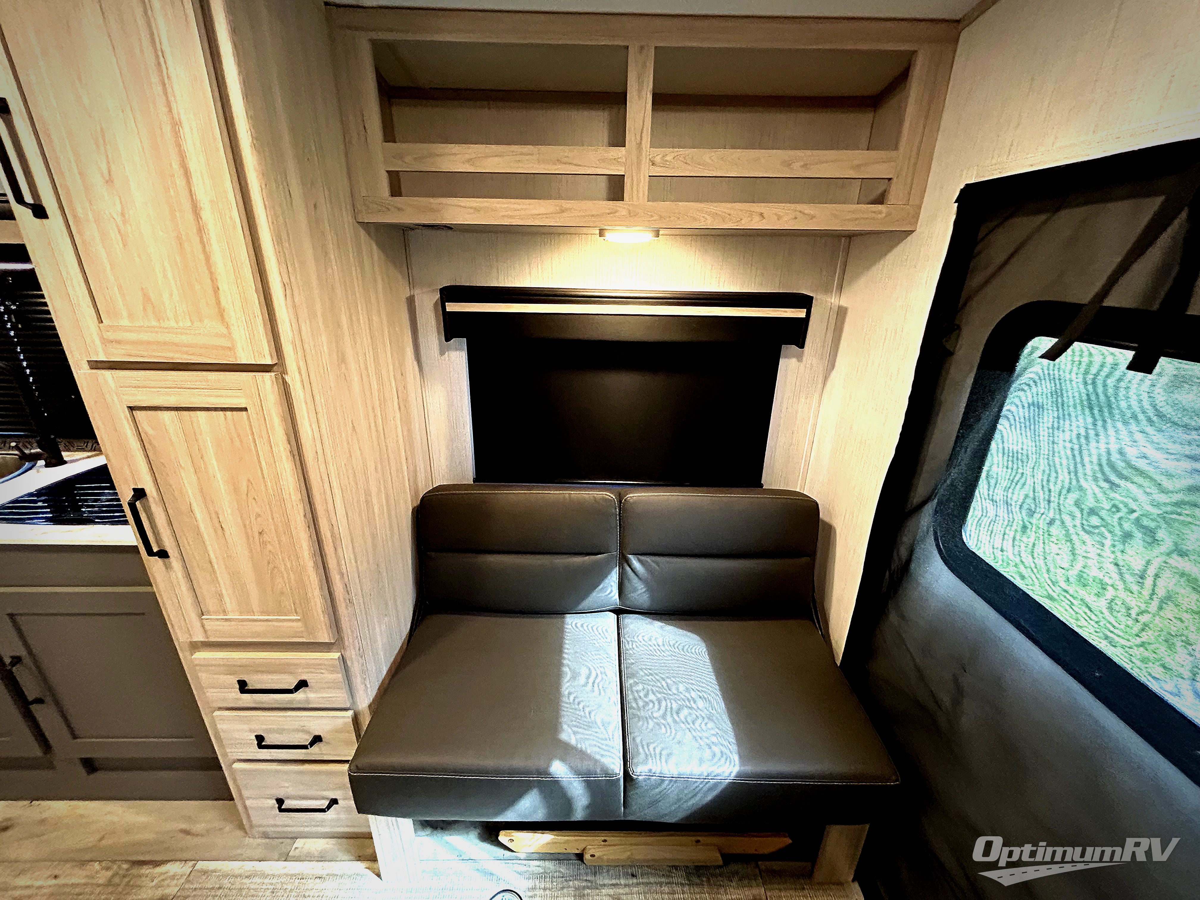 Weekends at the lake just got sweeter with this travel trailer in tow! You will love the flip-up back hatch baggage door that opens fully so you can easily load luggage, bikes, and kayaks. The free-standing dinette table provides more space for these items, and if you have guests they can sleep on the dinette seats once they're folded down. This model includes a two burner range in the kitchen, along with a 12V residential refrigerator, plus a slide out TV that rotates all the way around for better viewing. When you're ready to settle down for the night, the full bath will allow you to clean up, and the queen bed up front is sure to bring a great night's rest. There is even a bedroom closet to keep your clothes tidy!