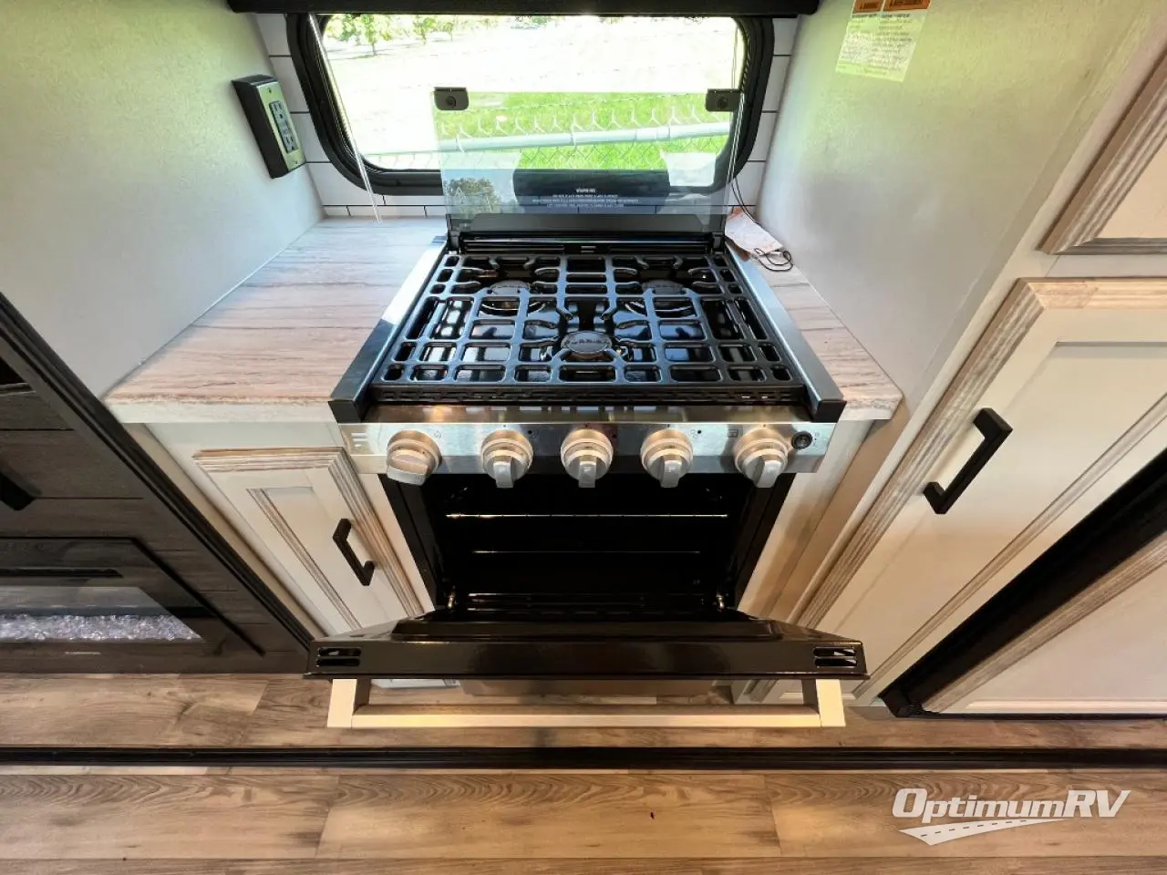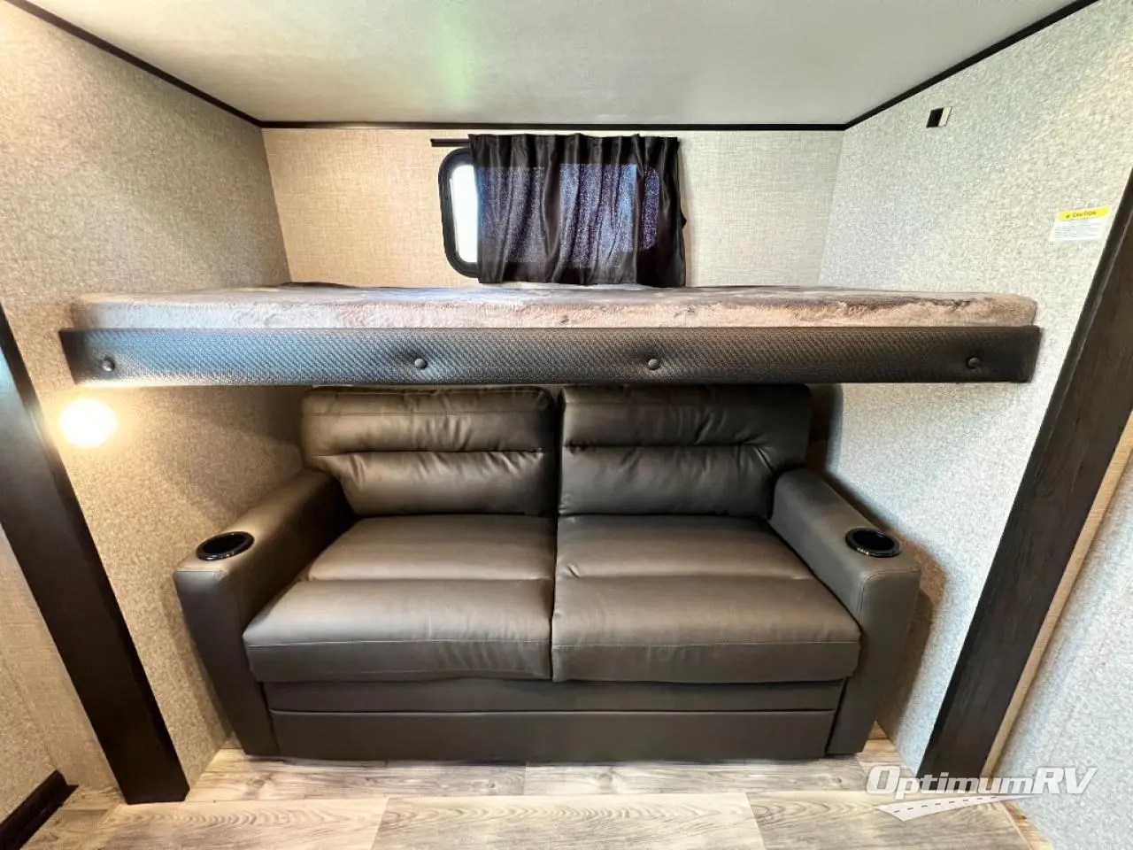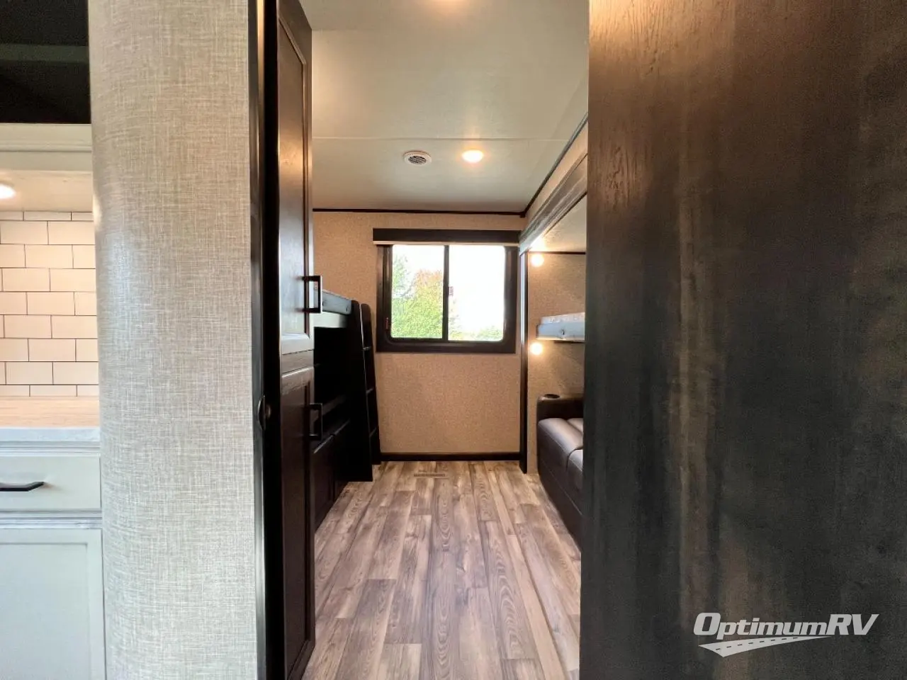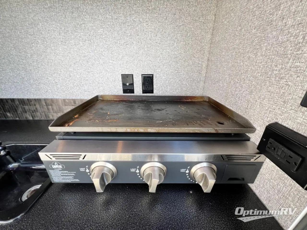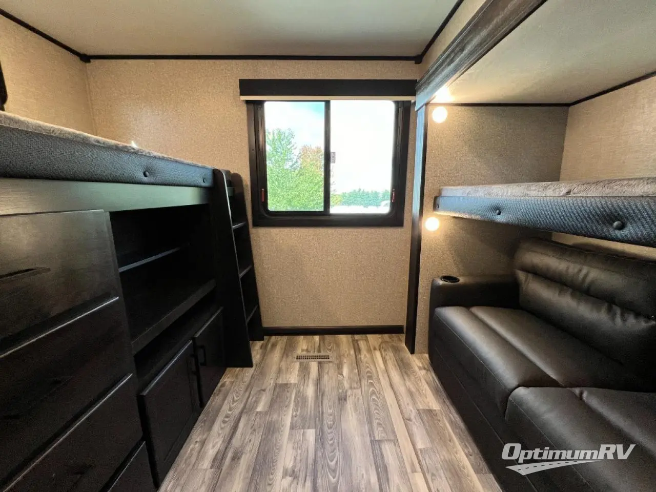 This travel trailer is perfect for your larger group or family! There is a rear private bunkhouse with two bunks, a tri-fold sofa, plus a slide out for more space. You will have the front private bedroom all to yourselves with a queen bed, and any other guests can sleep on the tri-fold sofa and booth dinette! There is also a wardrobe/linen closet with washer and dryer prep if you plan to add a washer and dyer for convenience. The chef can prepare their best meals with the kitchen island and will enjoy having two hutches to store the essentials. They could even cook at the outside kitchen to breathe in some fresh air and enjoy the beautiful scenery!