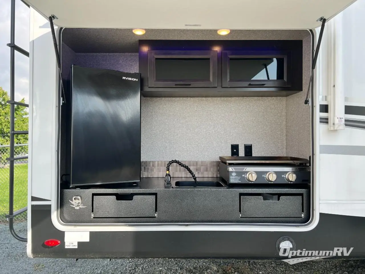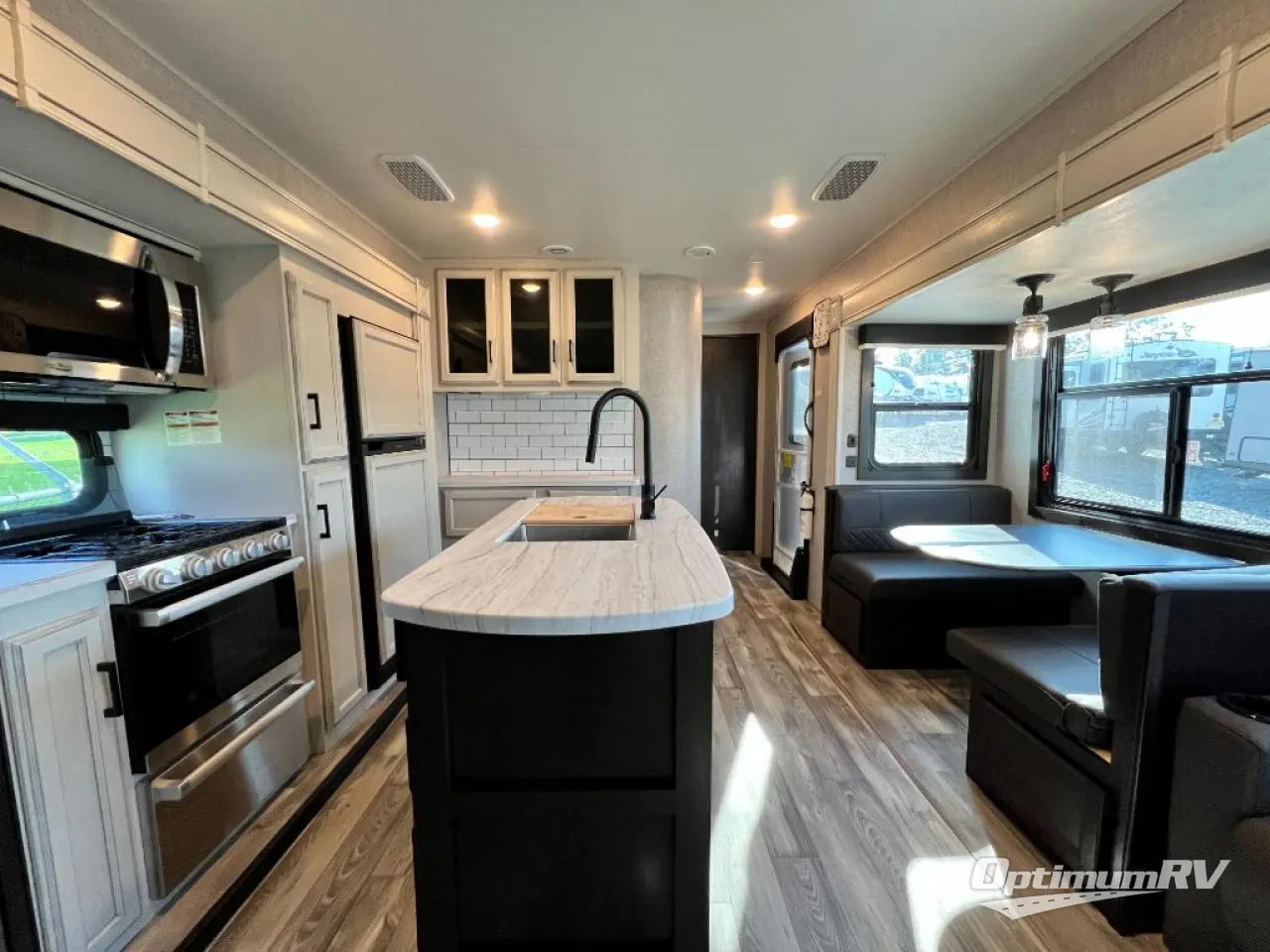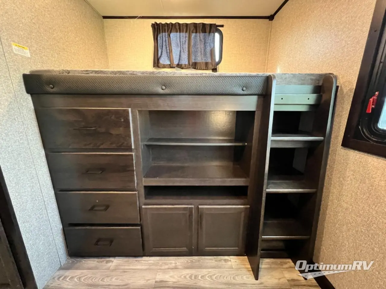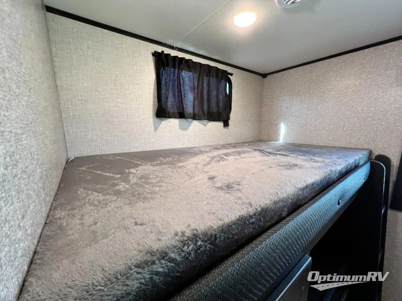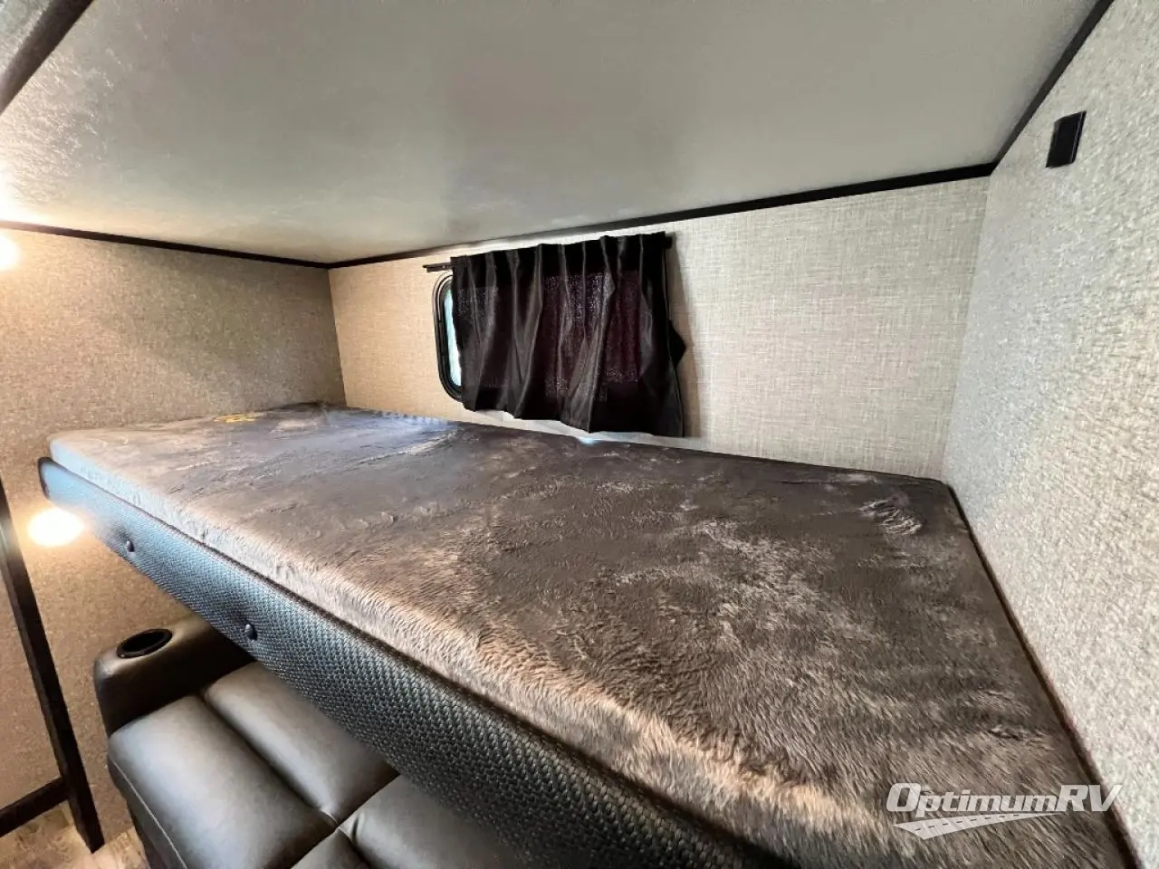 This travel trailer is perfect for your larger group or family! There is a rear private bunkhouse with two bunks, a tri-fold sofa, plus a slide out for more space. You will have the front private bedroom all to yourselves with a queen bed, and any other guests can sleep on the tri-fold sofa and booth dinette! There is also a wardrobe/linen closet with washer and dryer prep if you plan to add a washer and dyer for convenience. The chef can prepare their best meals with the kitchen island and will enjoy having two hutches to store the essentials. They could even cook at the outside kitchen to breathe in some fresh air and enjoy the beautiful scenery!
