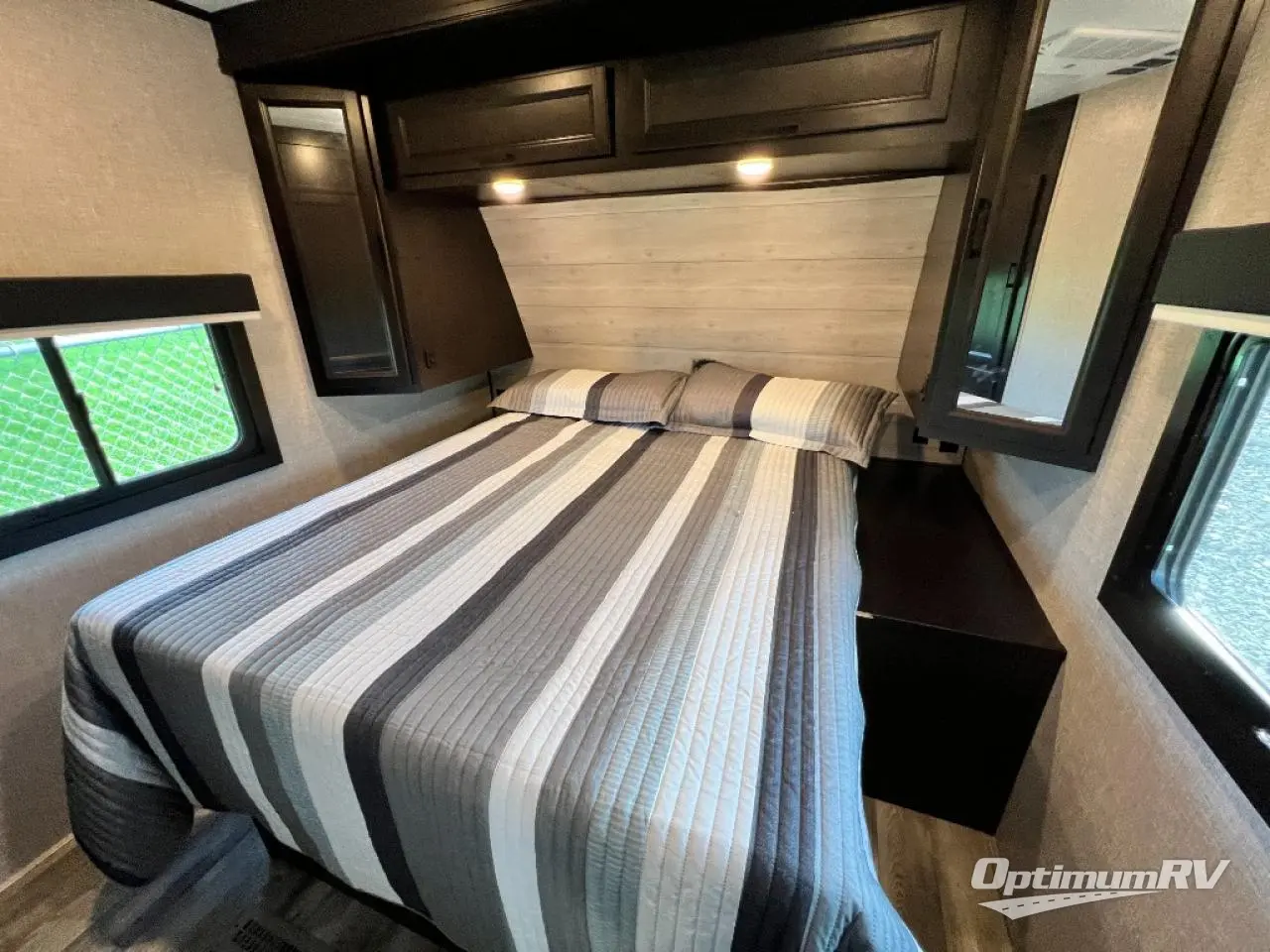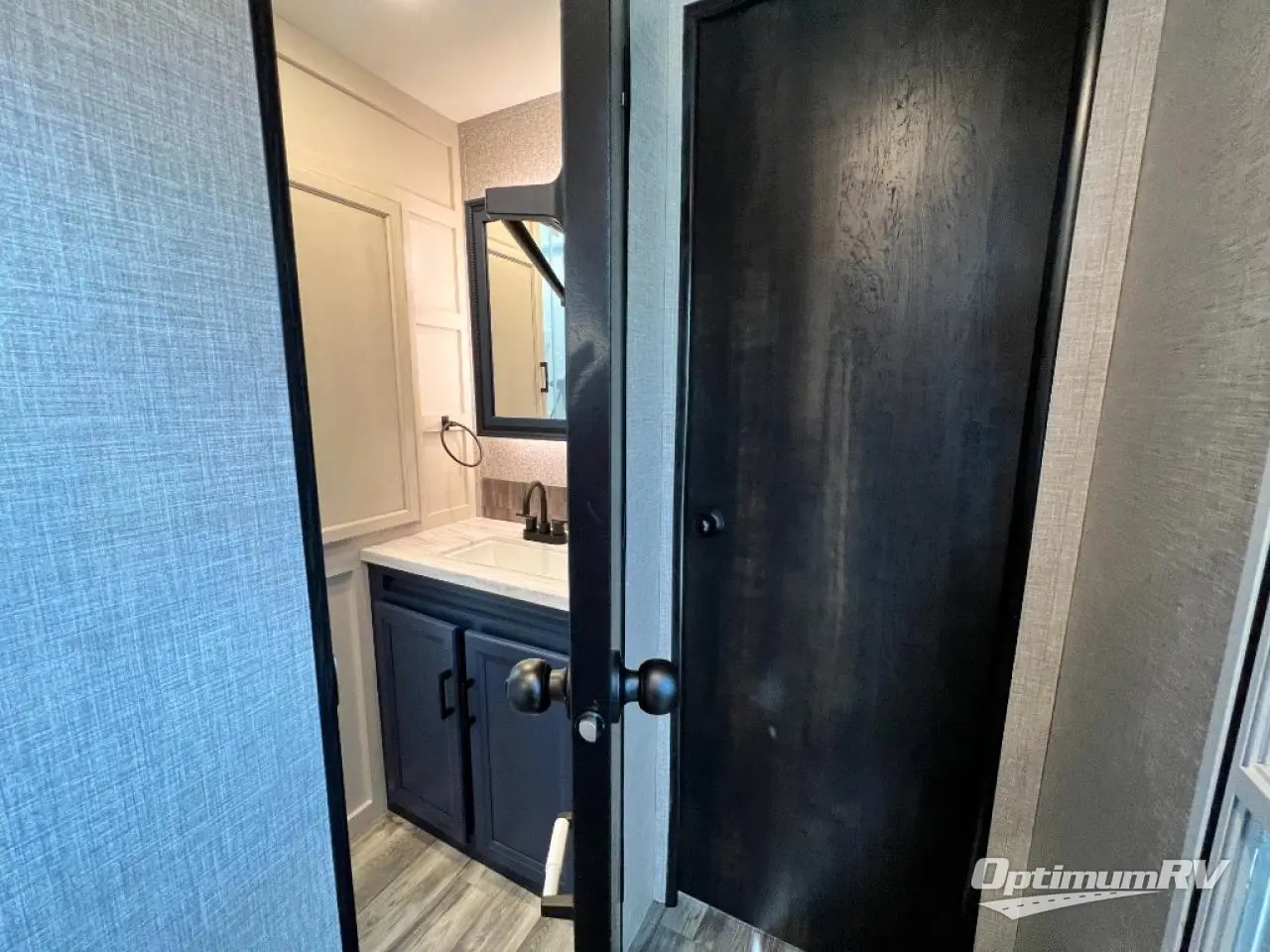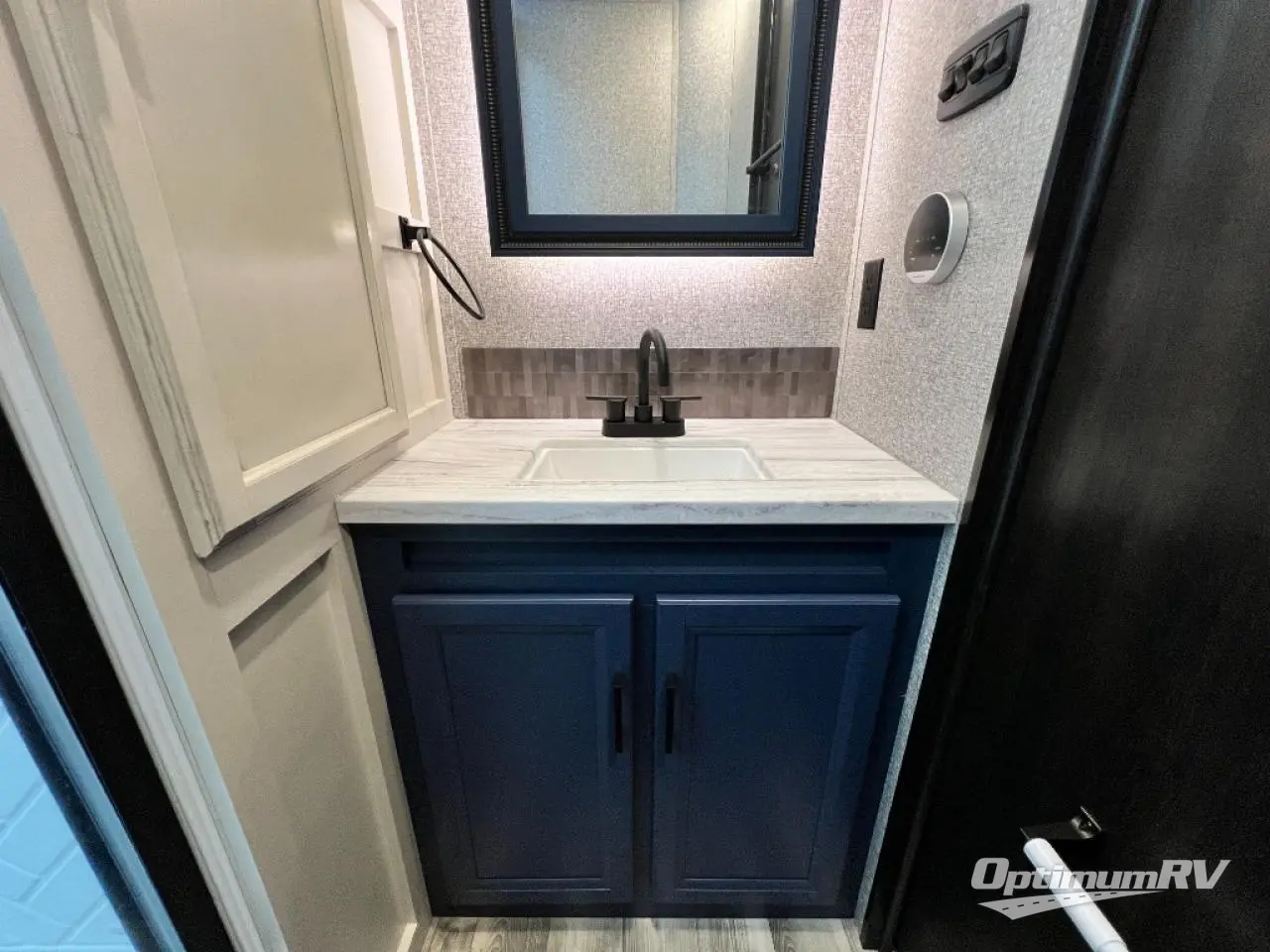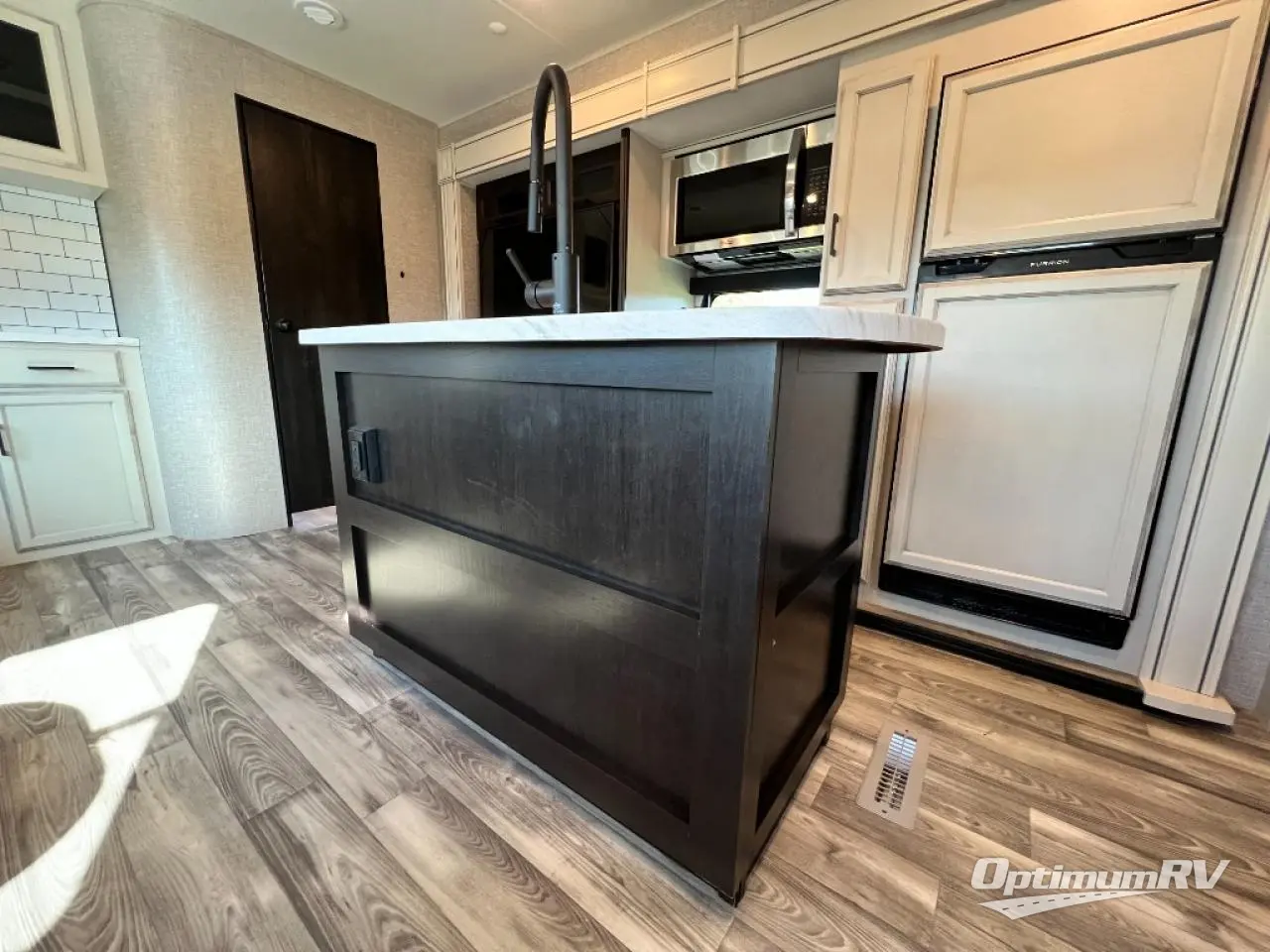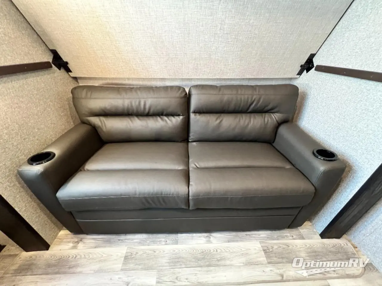 This travel trailer is perfect for your larger group or family! There is a rear private bunkhouse with two bunks, a tri-fold sofa, plus a slide out for more space. You will have the front private bedroom all to yourselves with a queen bed, and any other guests can sleep on the tri-fold sofa and booth dinette! There is also a wardrobe/linen closet with washer and dryer prep if you plan to add a washer and dyer for convenience. The chef can prepare their best meals with the kitchen island and will enjoy having two hutches to store the essentials. They could even cook at the outside kitchen to breathe in some fresh air and enjoy the beautiful scenery!