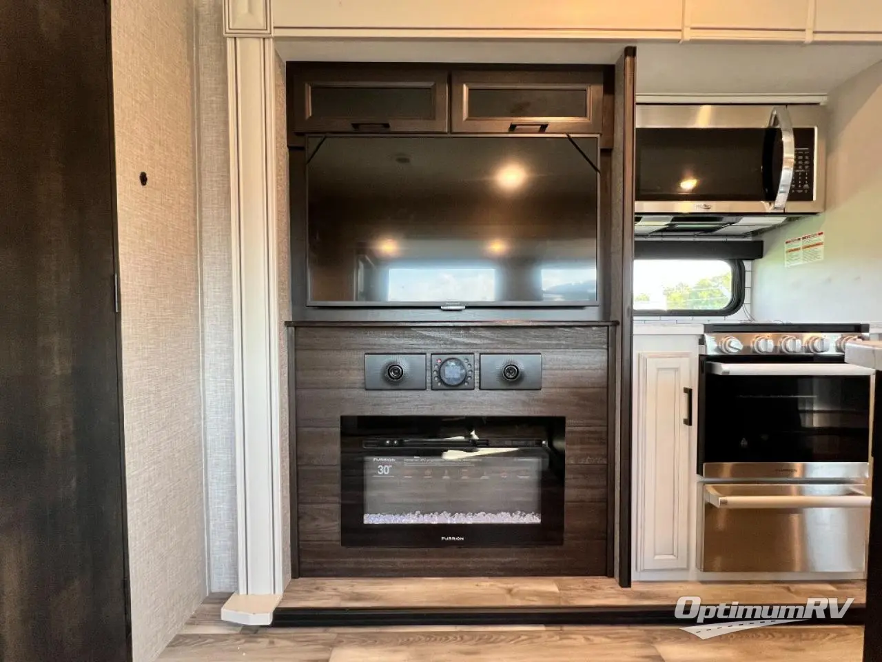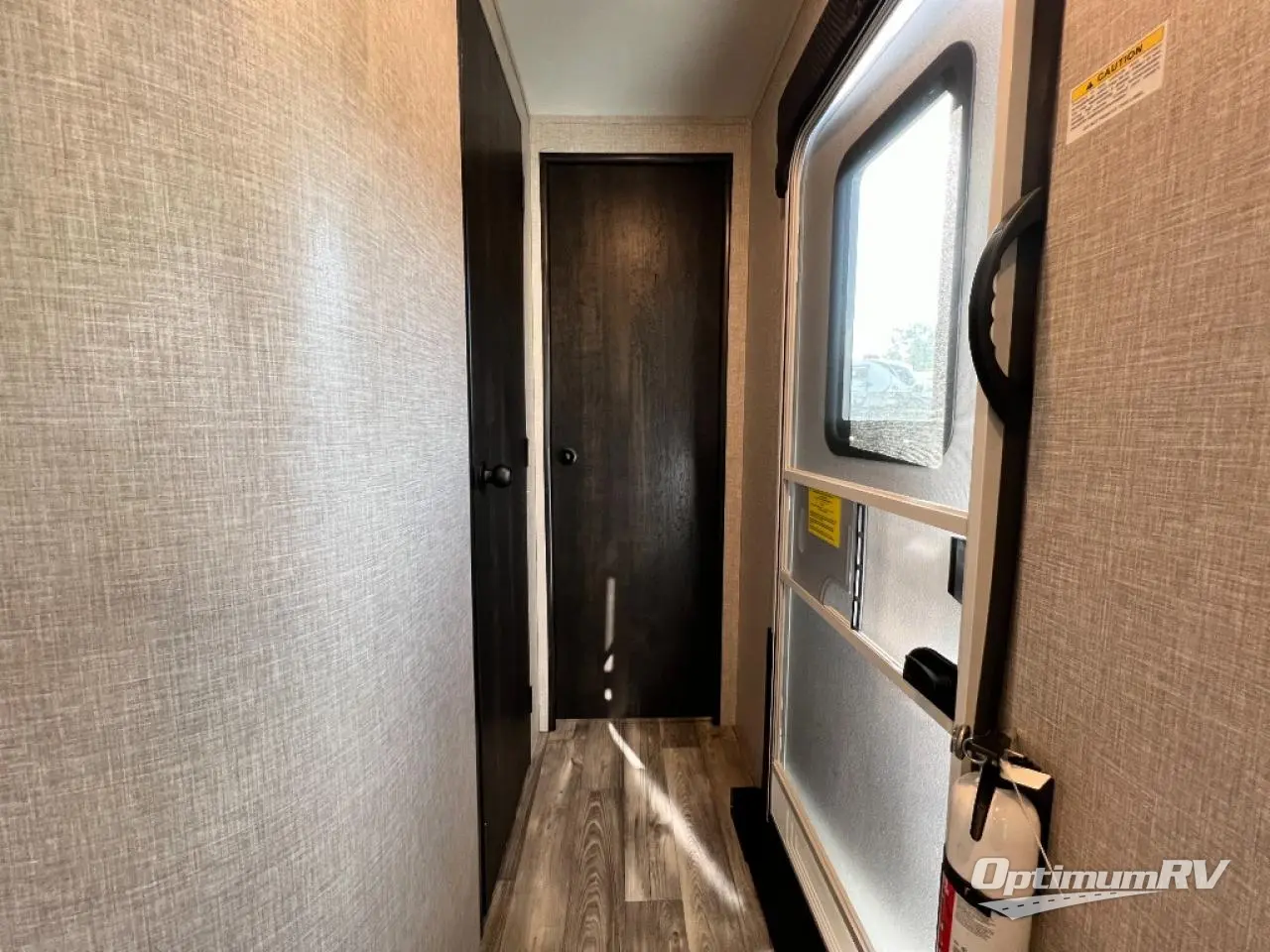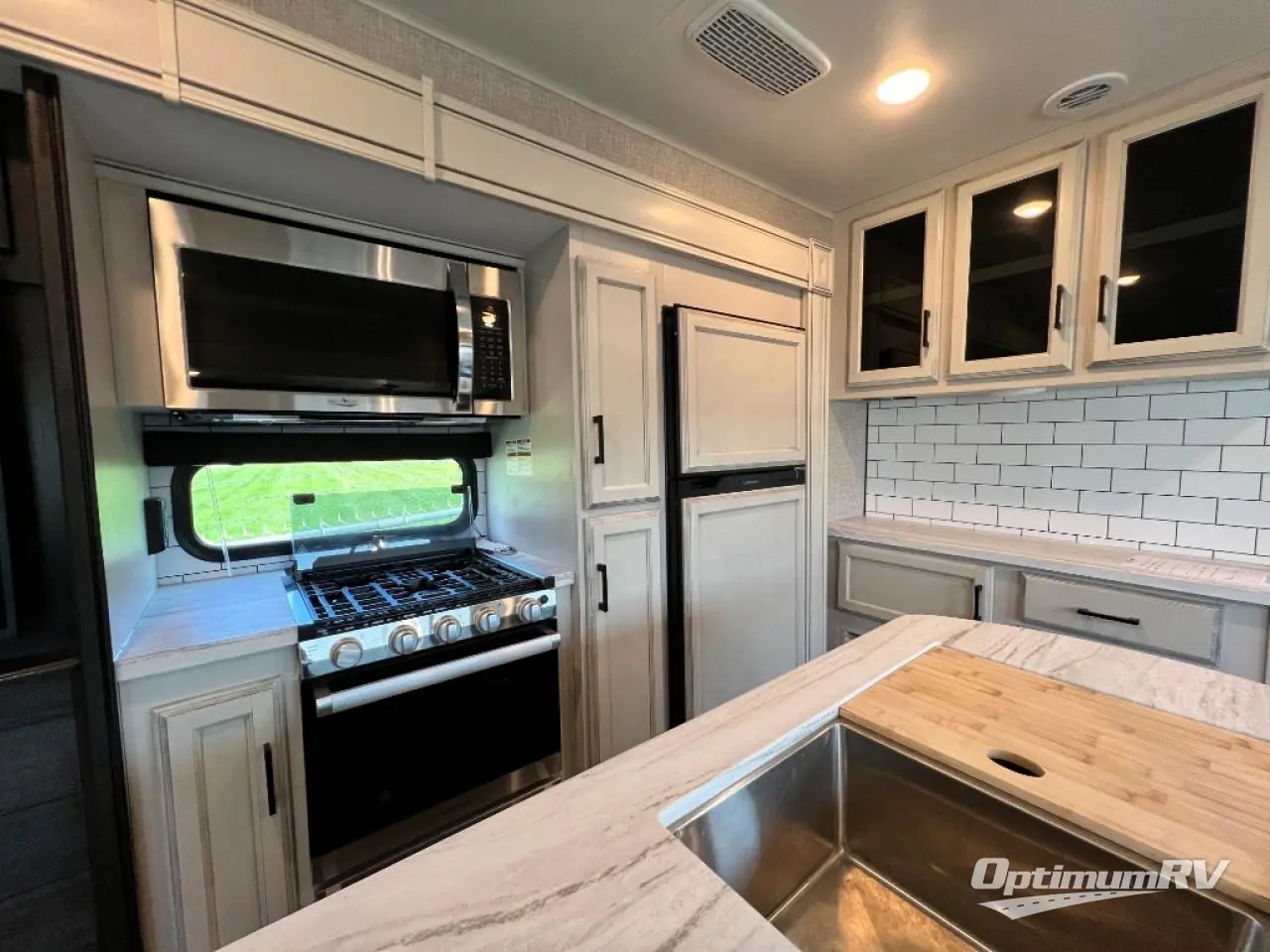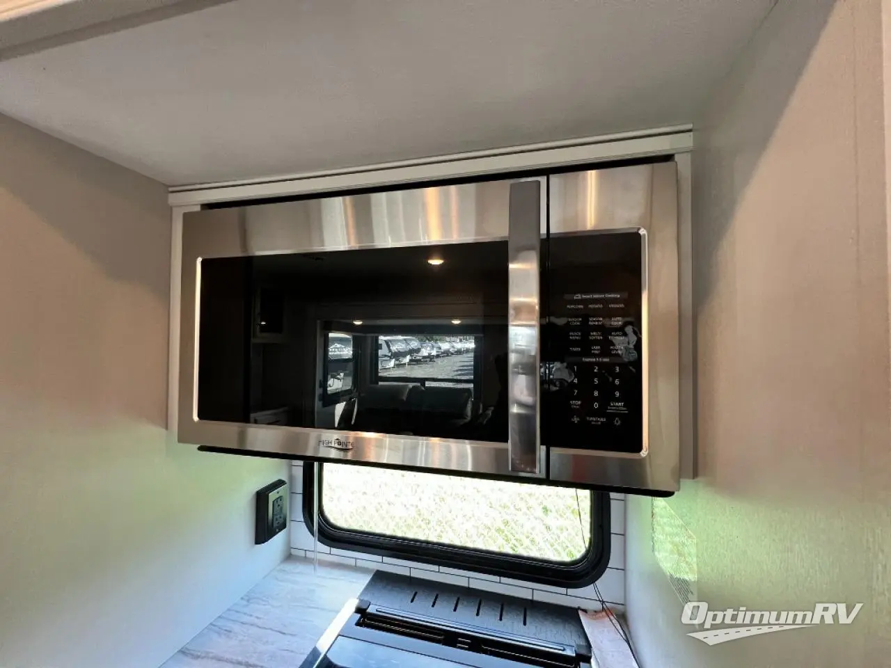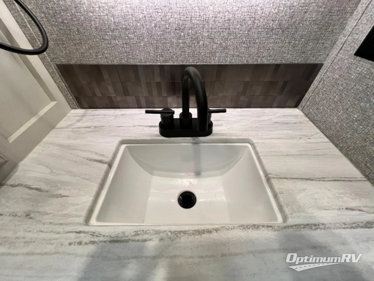 This travel trailer is perfect for your larger group or family! There is a rear private bunkhouse with two bunks, a tri-fold sofa, plus a slide out for more space. You will have the front private bedroom all to yourselves with a queen bed, and any other guests can sleep on the tri-fold sofa and booth dinette! There is also a wardrobe/linen closet with washer and dryer prep if you plan to add a washer and dyer for convenience. The chef can prepare their best meals with the kitchen island and will enjoy having two hutches to store the essentials. They could even cook at the outside kitchen to breathe in some fresh air and enjoy the beautiful scenery!