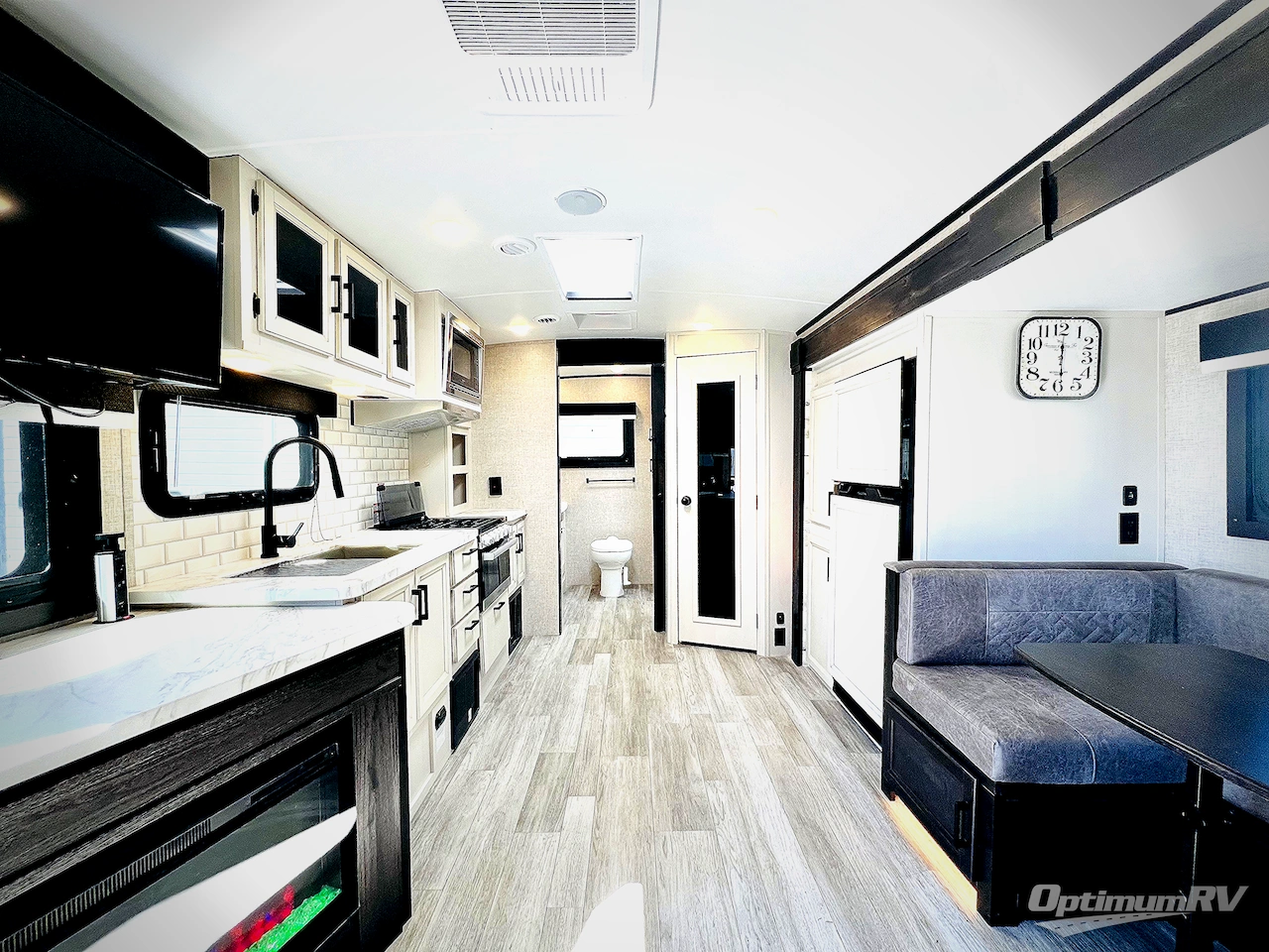 This versatile travel trailer is perfect for your family of four. The Murphy bed will provide comfortable sleeping space at night, and the jack-knife sofa will give you a place to relax during the day. Your crew can gather around the U-shaped dinette across from the fireplace, plus there is an LED TV here for movie night. This model also includes an outside kitchen under the 19' awning for an inviting outdoor living space, and two pass-through storage compartments for all your gear. And don't forget about the spacious full rear bath with plenty of counterspace, a medicine cabinet and a linen closet for clean towels!