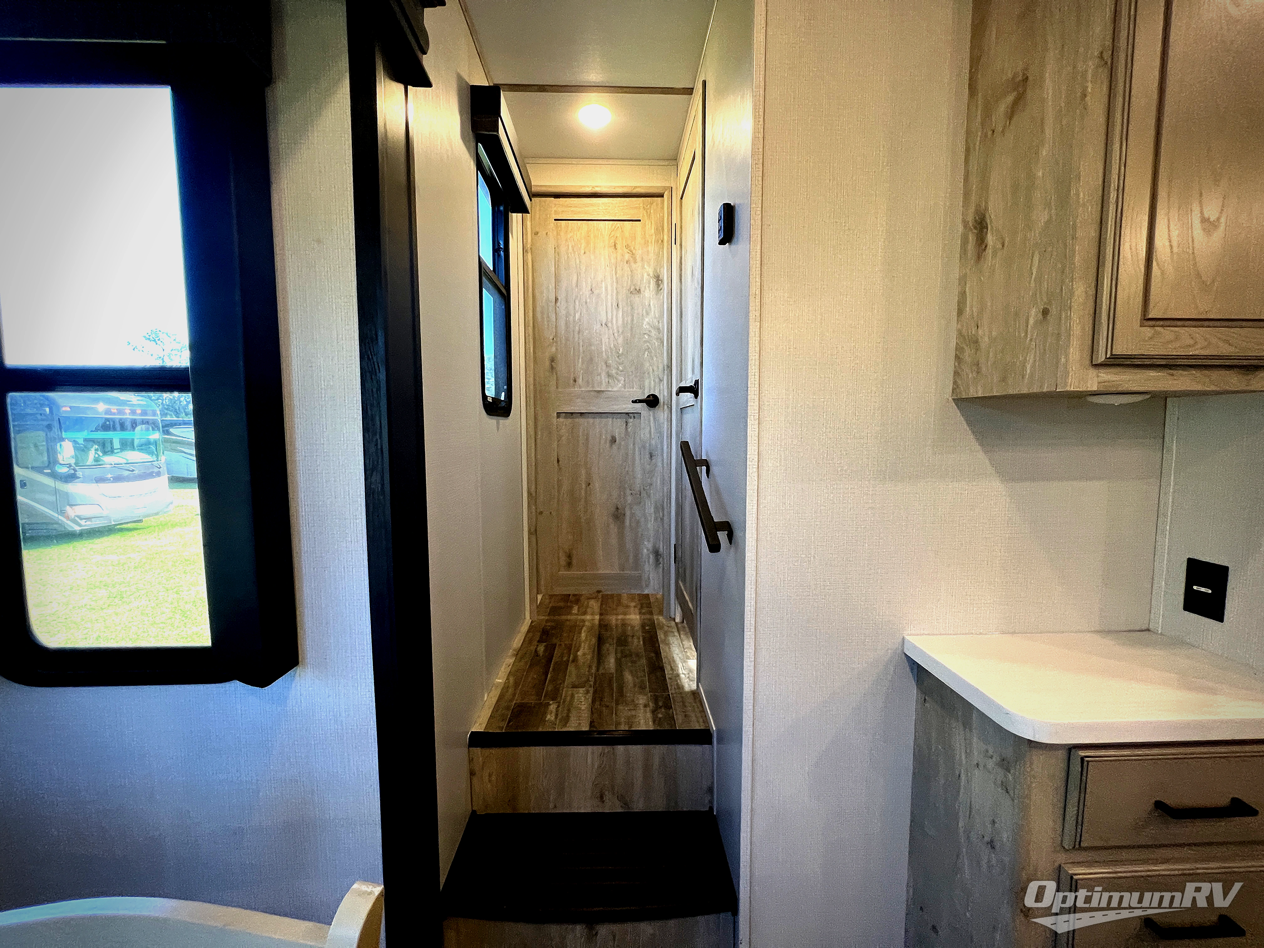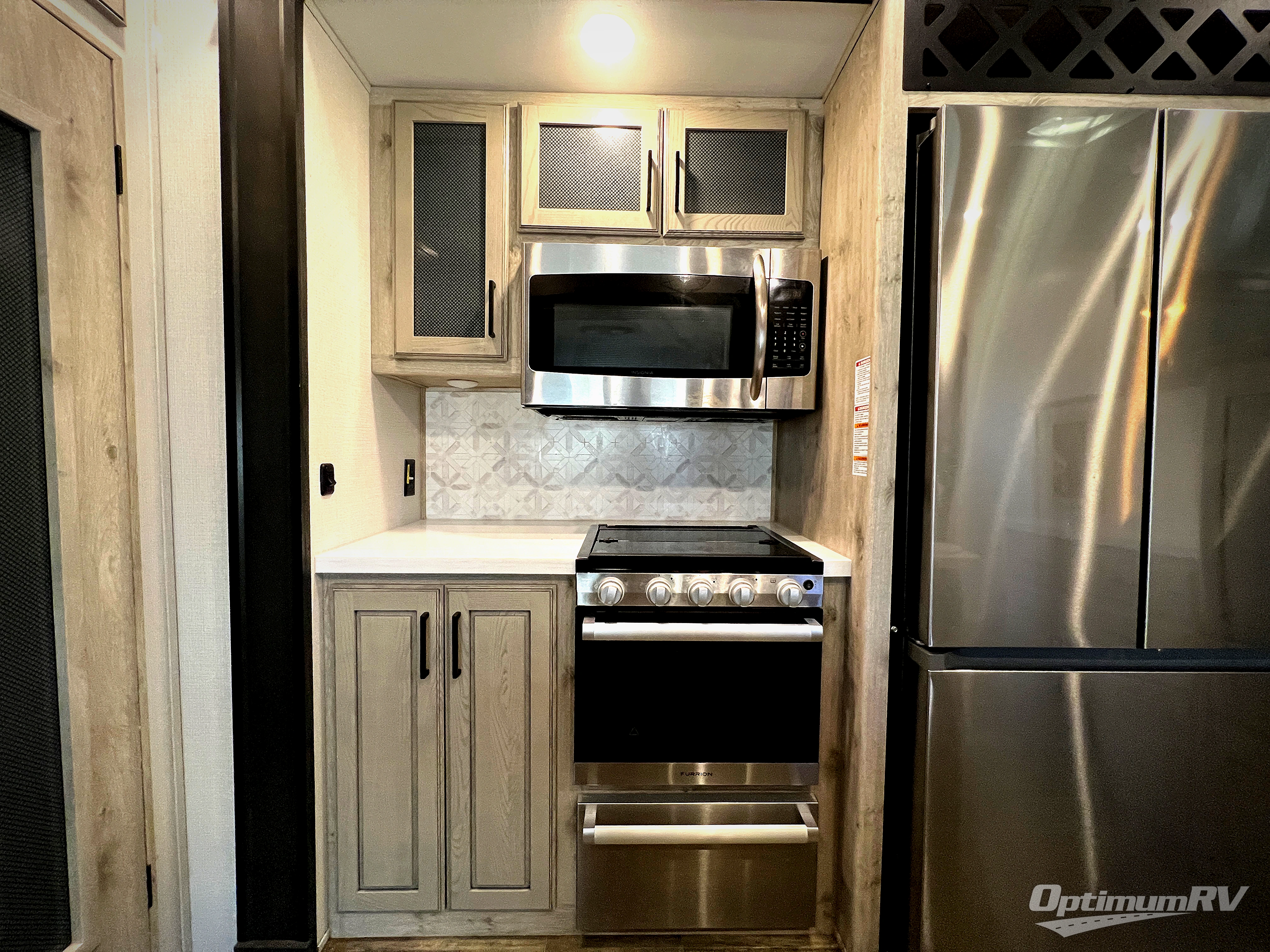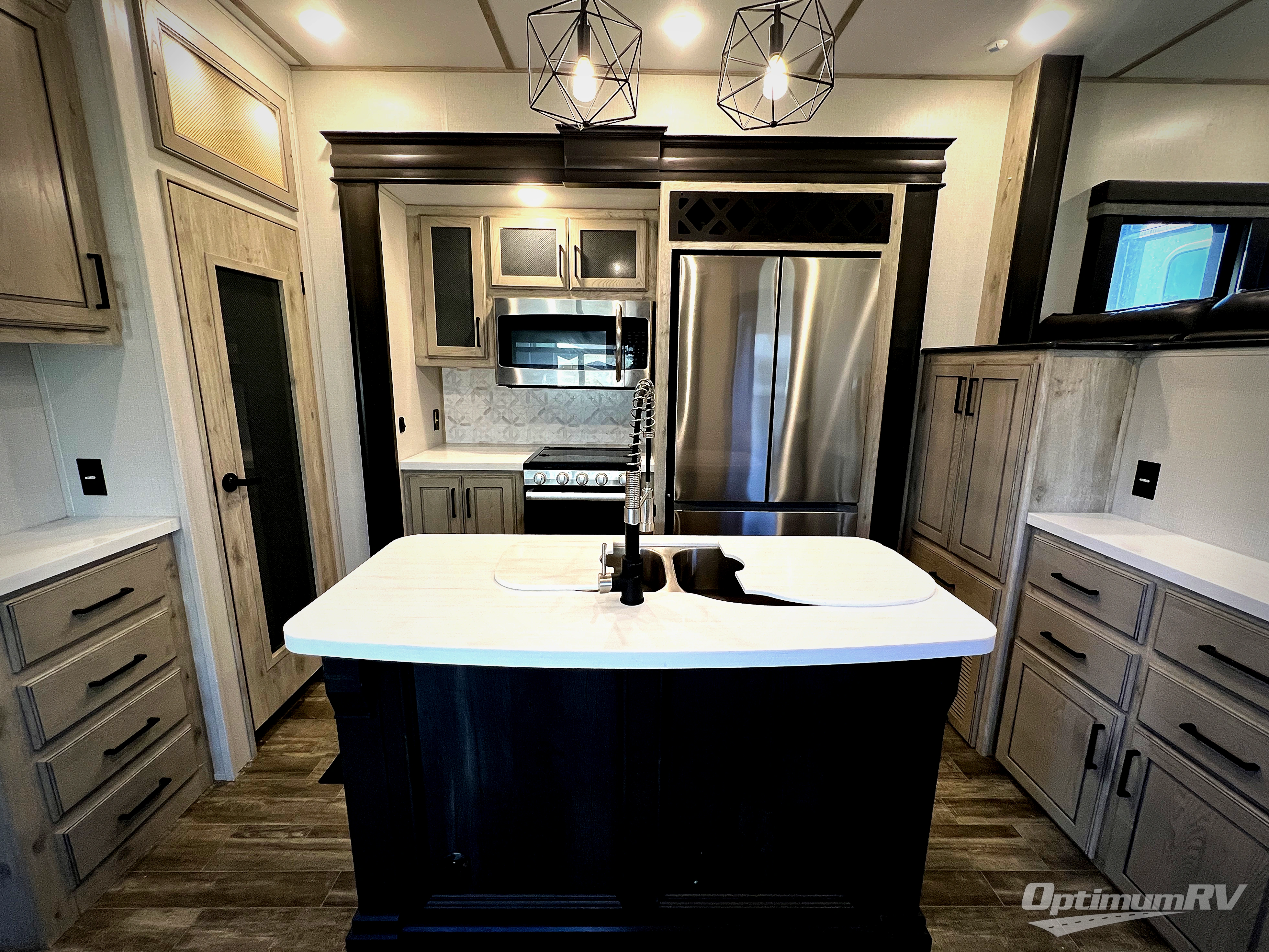 Enjoy traveling with your family and friends in this fifth wheel featuring FIVE slides providing space for everyone! The front living area offers two of those slides each with a tri-fold sleeper sofa for family or overnight guests. A full wall entertainment area and fireplace, plus a theater seat sets this space up as a great gathering place for all to enjoy. Step down to the spacious double slide kitchen and dining area with free standing dinette, a kitchen island, and coffee station, plus 18 cu. ft. refrigerator and range slide with residential microwave overhead. You can easily prepare and enjoy meals while you travel just like at home. At the rear of this amazing coach, you will find a private bed/bath suite featuring a large shower, a king bed slide with storage beneath for extra blankets, plus a wardrobe with bench/workstation and separate space that has been prepped for an optional stackable washer and dryer to provide even more at-home conveniences.