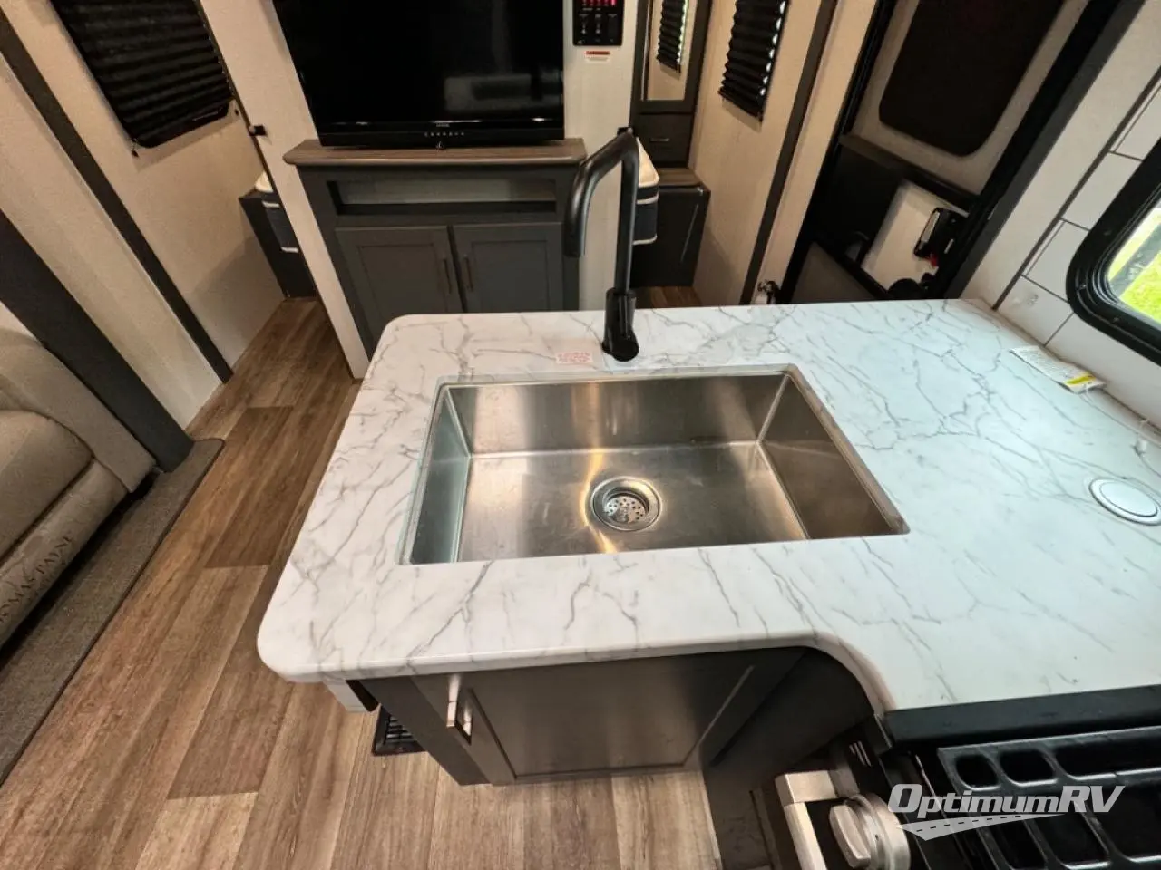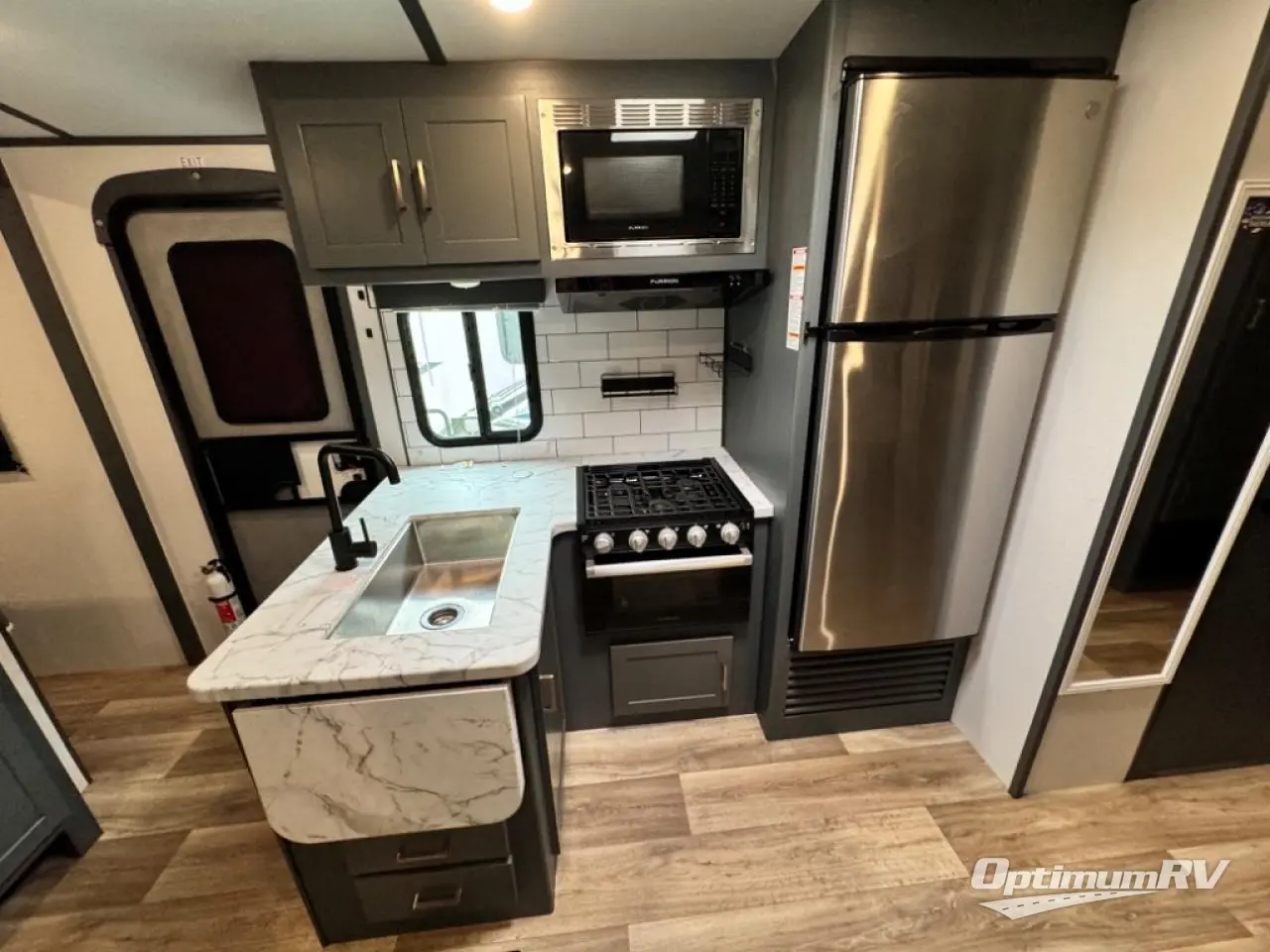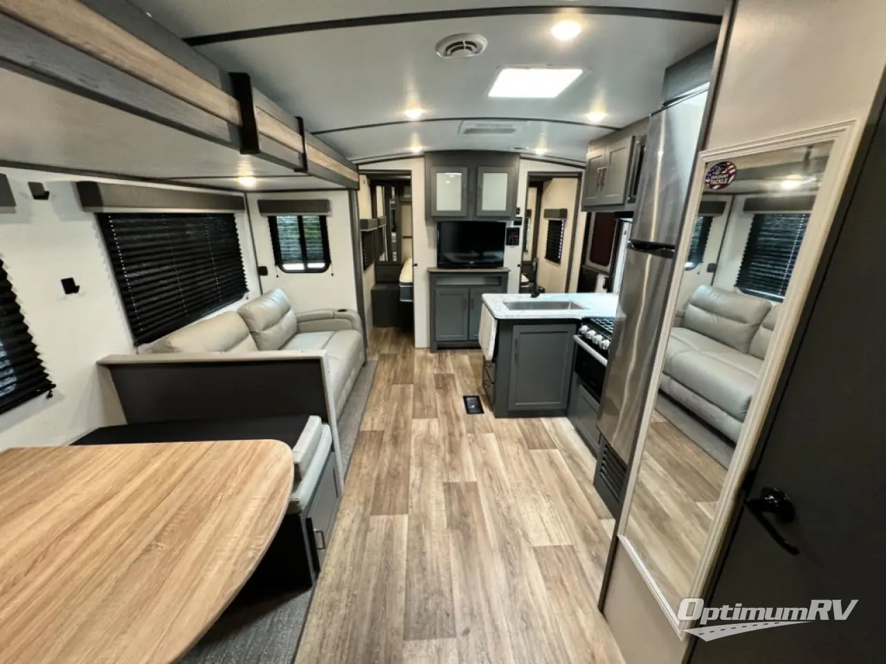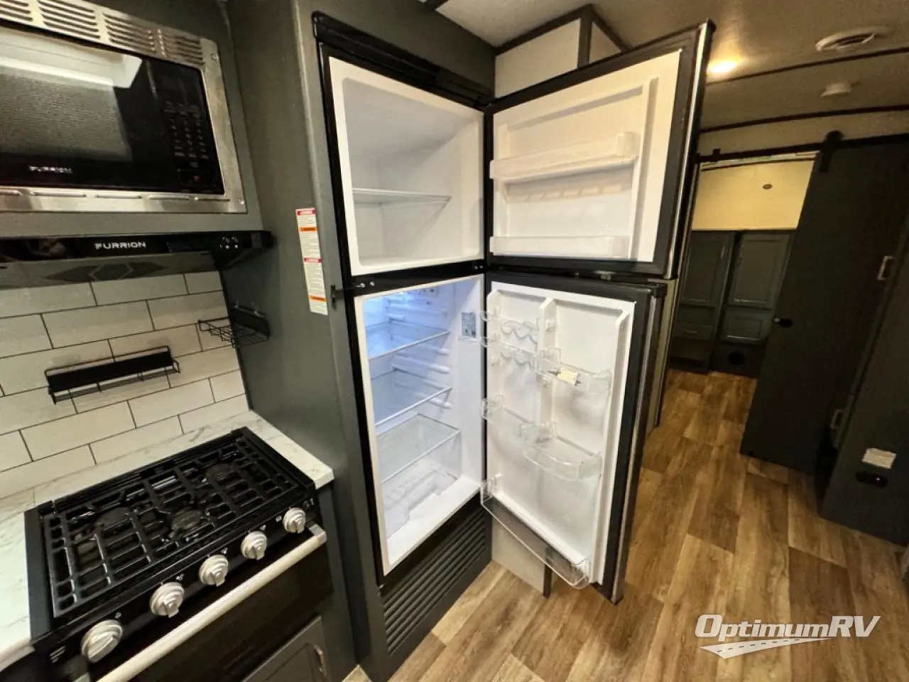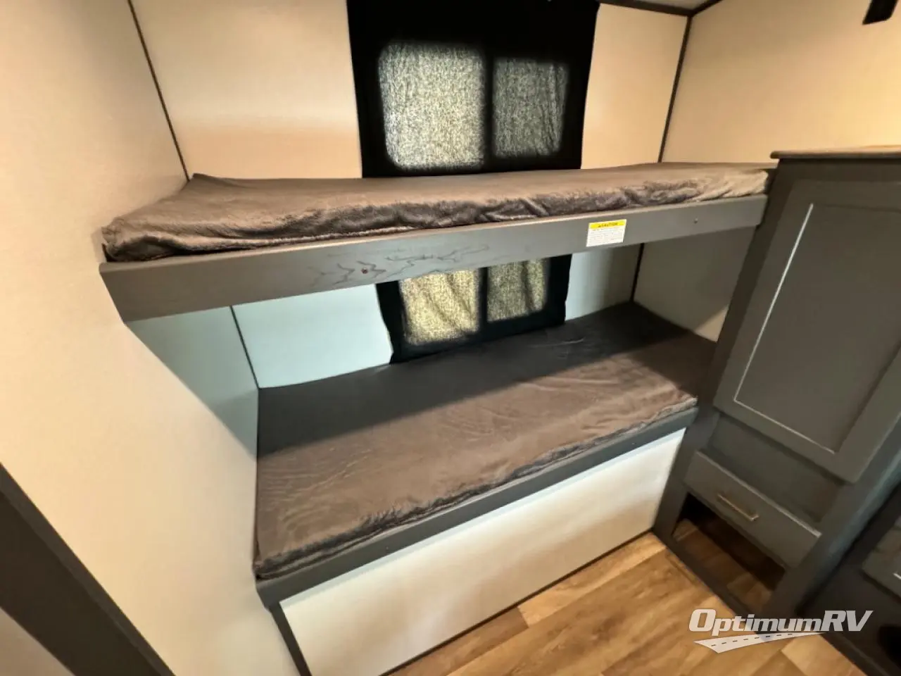 Get ready for family fun with this trailer at a local RV spot, your land, or a national park! The kids will love the private bunkhouse with triple bunks and a dinette to play at, plus they will have a wardrobe to place their things. You will have a queen-size bed in the front bedroom with dual access and two wardrobes, plus a laundry chute. Everyone can relax and dine at the Dream dinette and tri-fold sofa which are within the large slide. The cook will love the Furrion appliances and the 8 cu. ft. refrigerator when cooking, plus the pantry for storage. There is a single basin stainless steel sink and high rise faucet that will make cleaning up easy. And along the exterior, the outside kitchen is available for meals, plus the 15' electric awning gives you an outdoor living area protected from the elements.