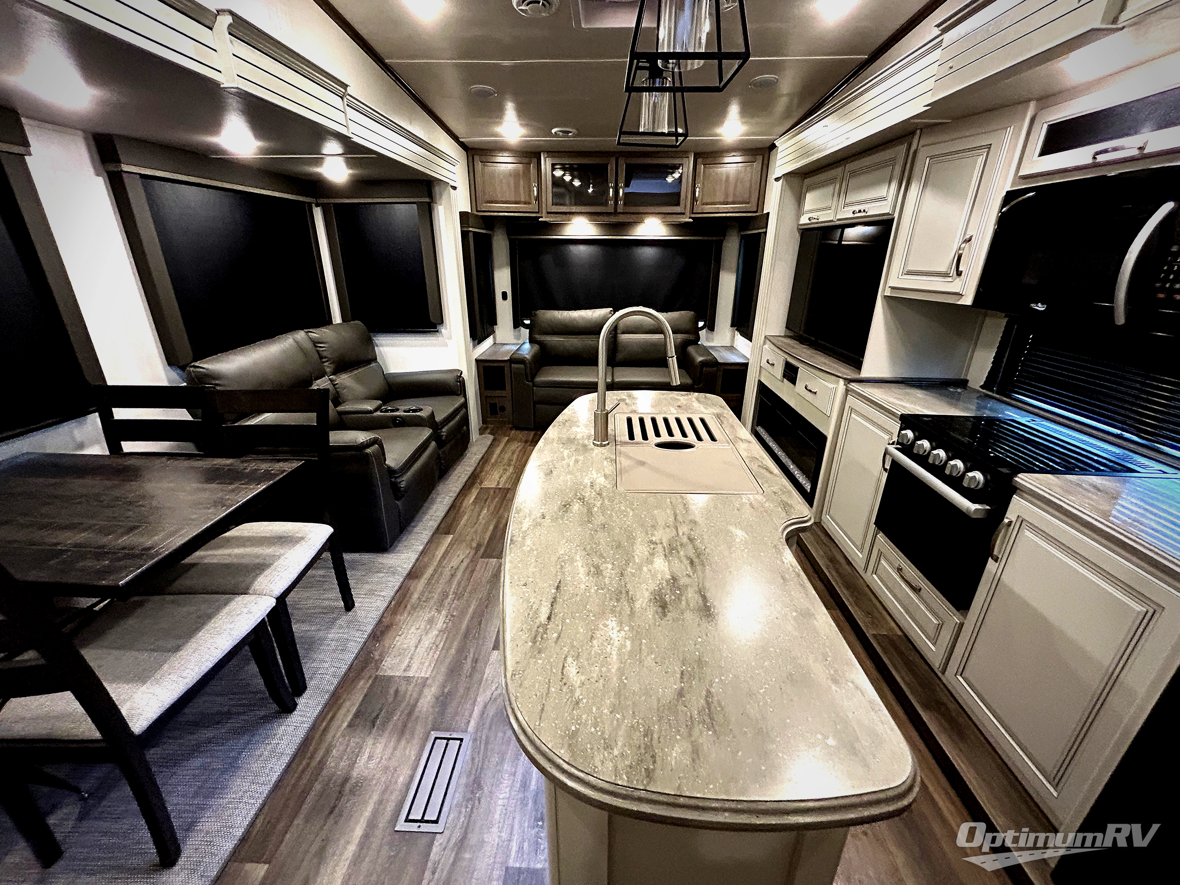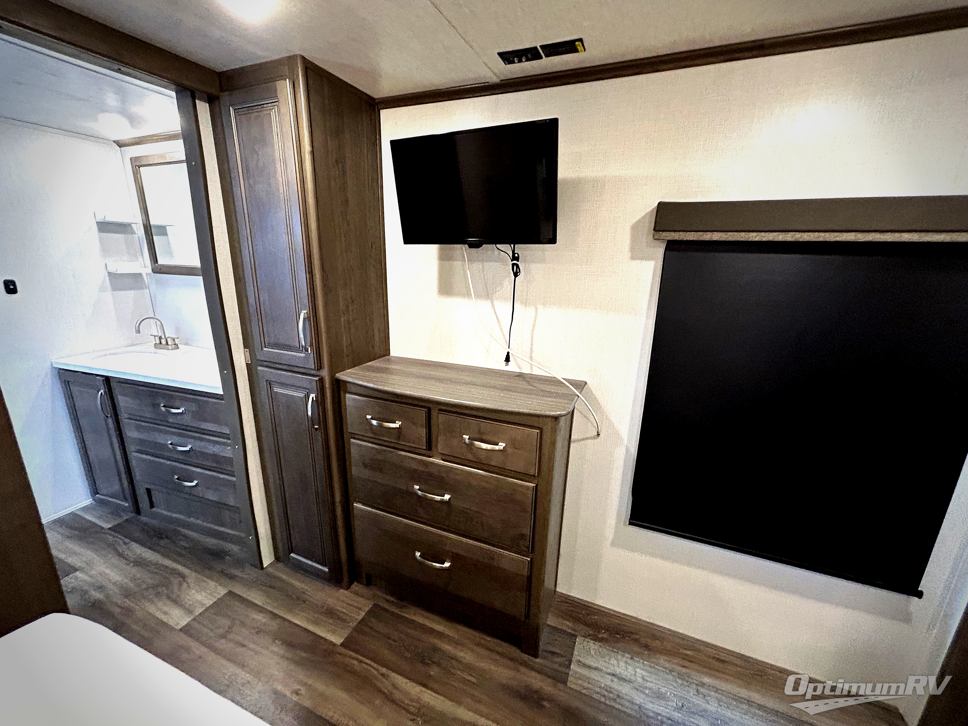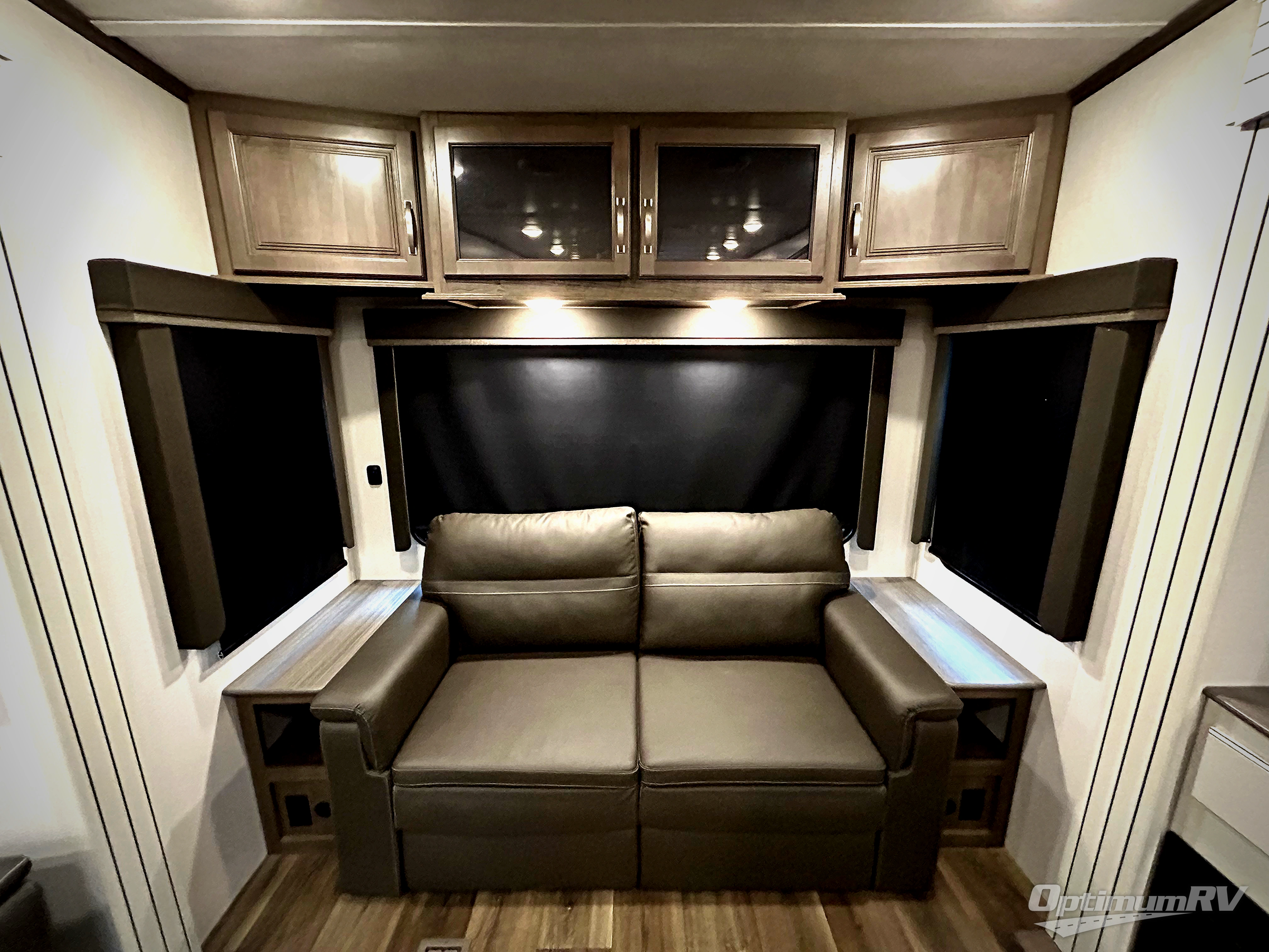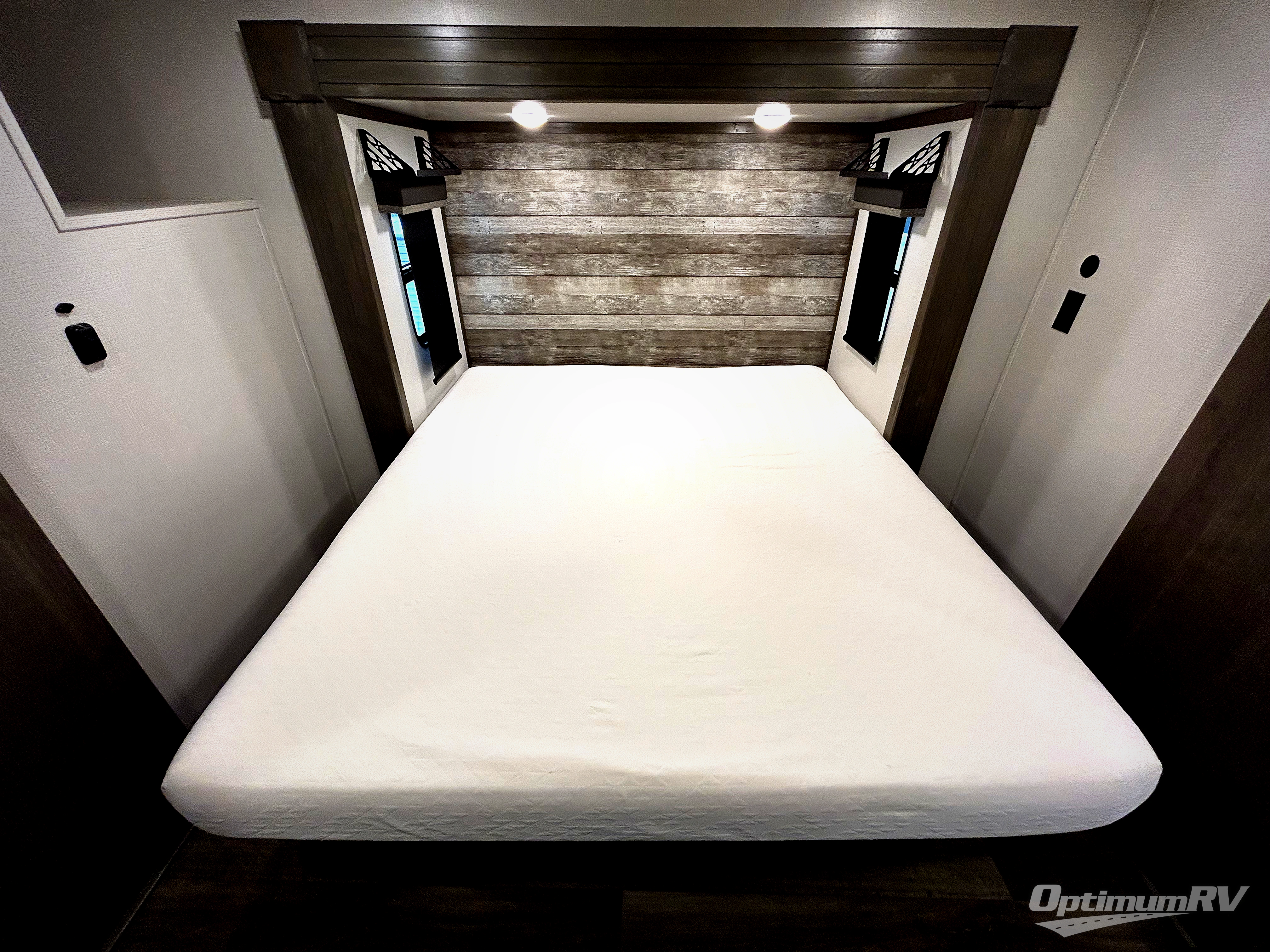 You will be so excited to take this Cougar fifth wheel out for the first time! Because of its secluded and fully stocked master suite at the front, this unit is perfect for a couple who wants to see the country or visit family. The master bathroom has a wonderful walk-in closet that has shoe storage and preparations for a washer/dryer. There is also under-bed storage in the bedroom portion, and the King bed slide gives you a little more space to get to the dresser and linen closet. The half bathroom is located out in the main living area so that your friends will have a place to go when they visit. Opposing slides keep this living area open for lounging comfortably on the tri-fold sleeper sofa and theater seating, and you can get everyone together for a board game at the booth dinette.