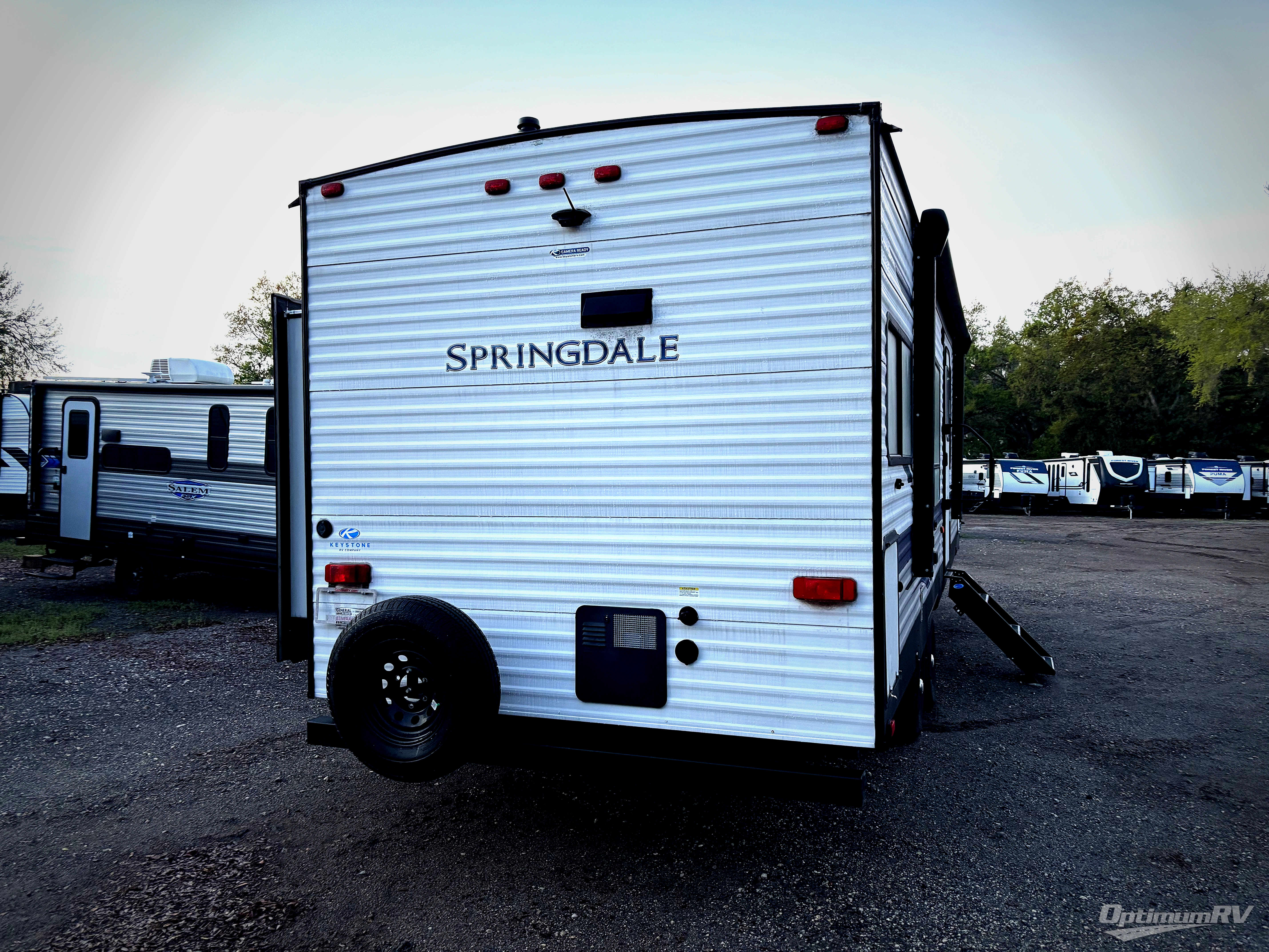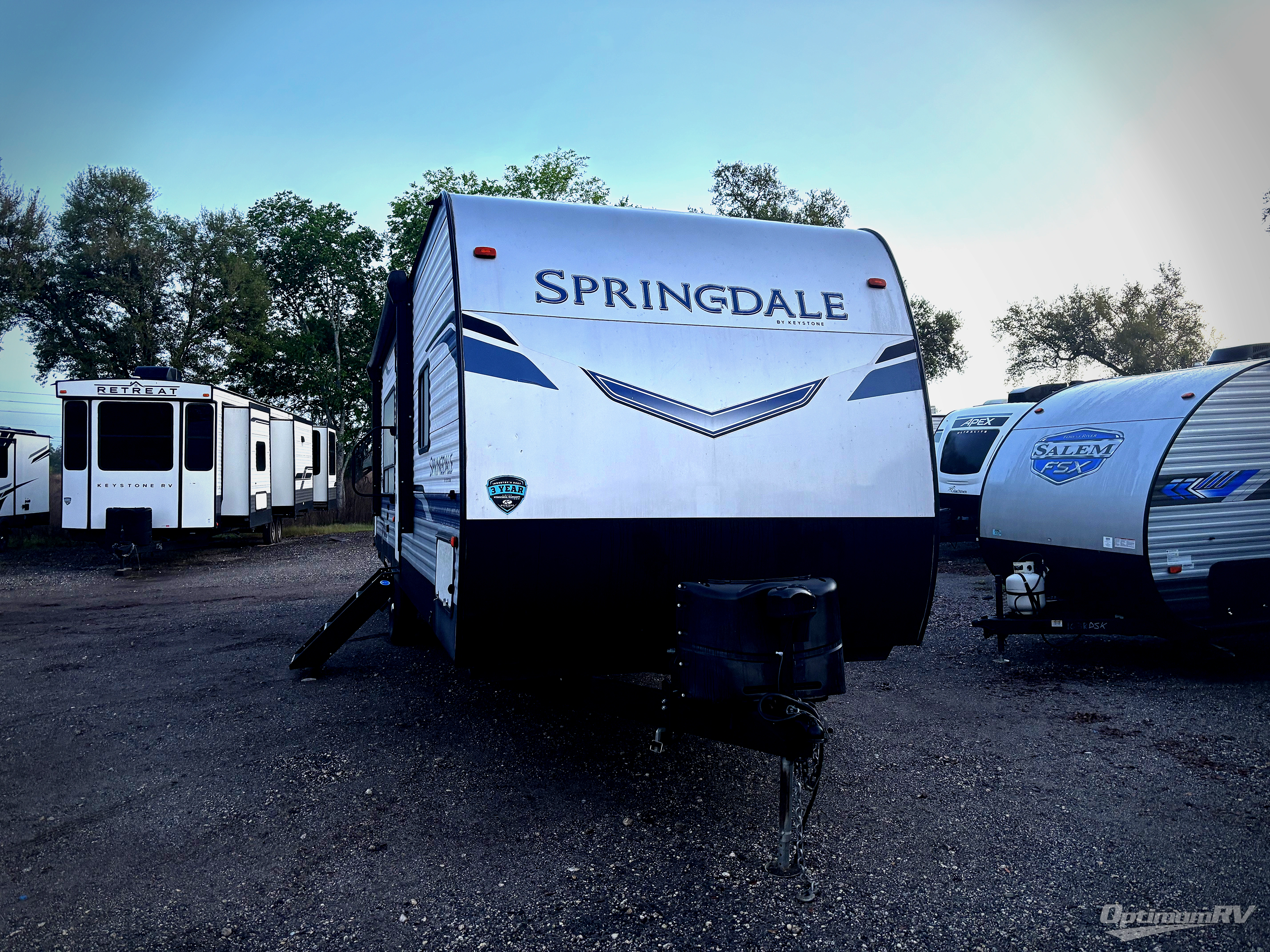 With any Keystone Springdale travel trailer, you will have a friction hinge entry door with sturdy MORryde StepAbove steps, a pass-through storage compartment for your outdoor gear, and reliable Dexter E-Z Lube axles to maneuver your Springdale down the road and into the campsites. Some of the Keystone Exclusives provide 12V color-coded wiring with easy-to-trace circuits which is better than conventional RV wiring allowing a faster diagnosis for quicker repairs, and the streamlined heat distribution that uses in-floor heat vents for more efficiency for uninterrupted air flow. Also included, the Blade high performance air flow system that delivers 30% more air flow. The interior gives you pressed kitchen countertops, pleated night shades, and designer upholstered window valances for easy care and style, and more depending on the Springdale you choose!