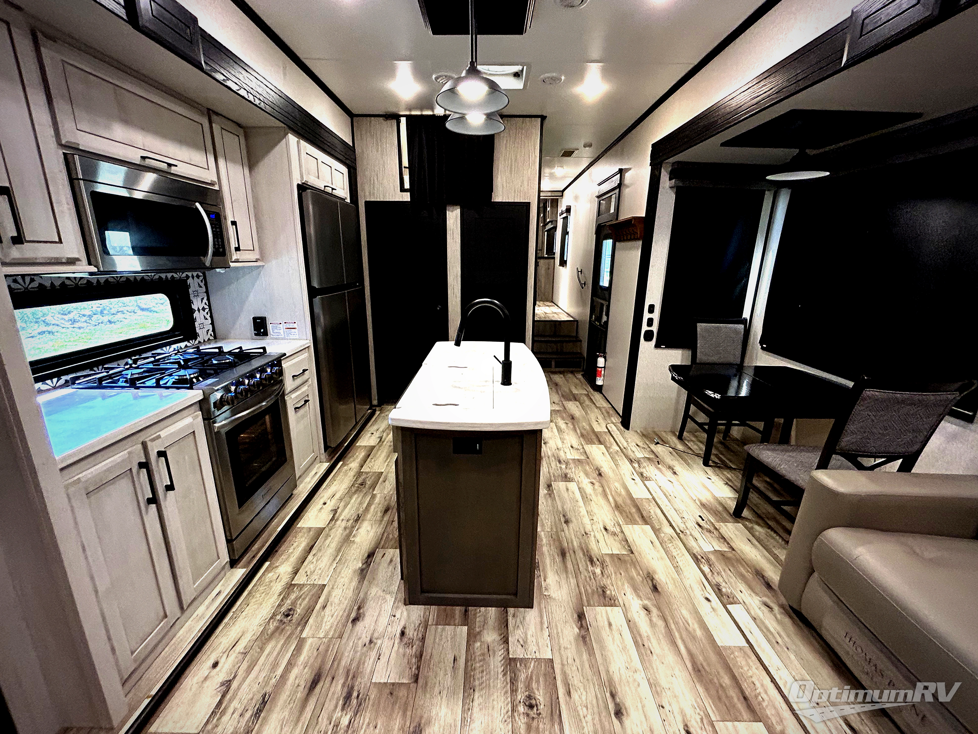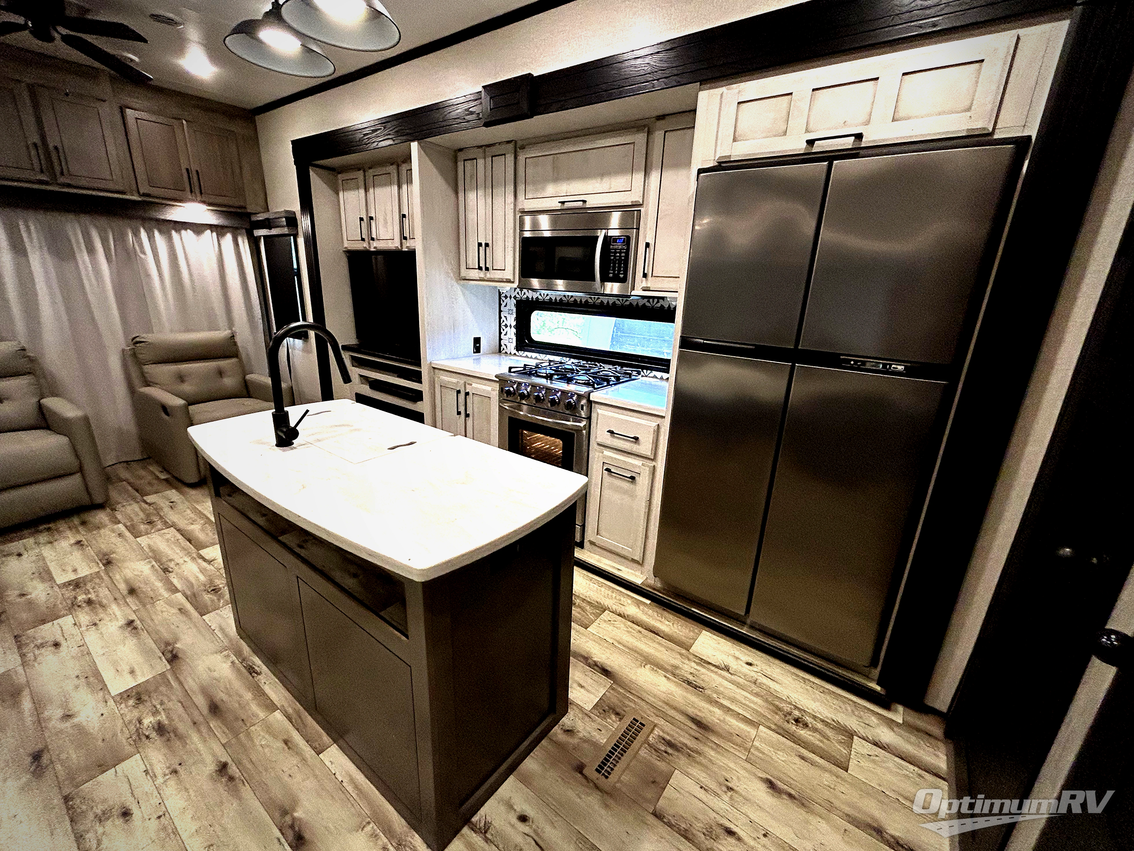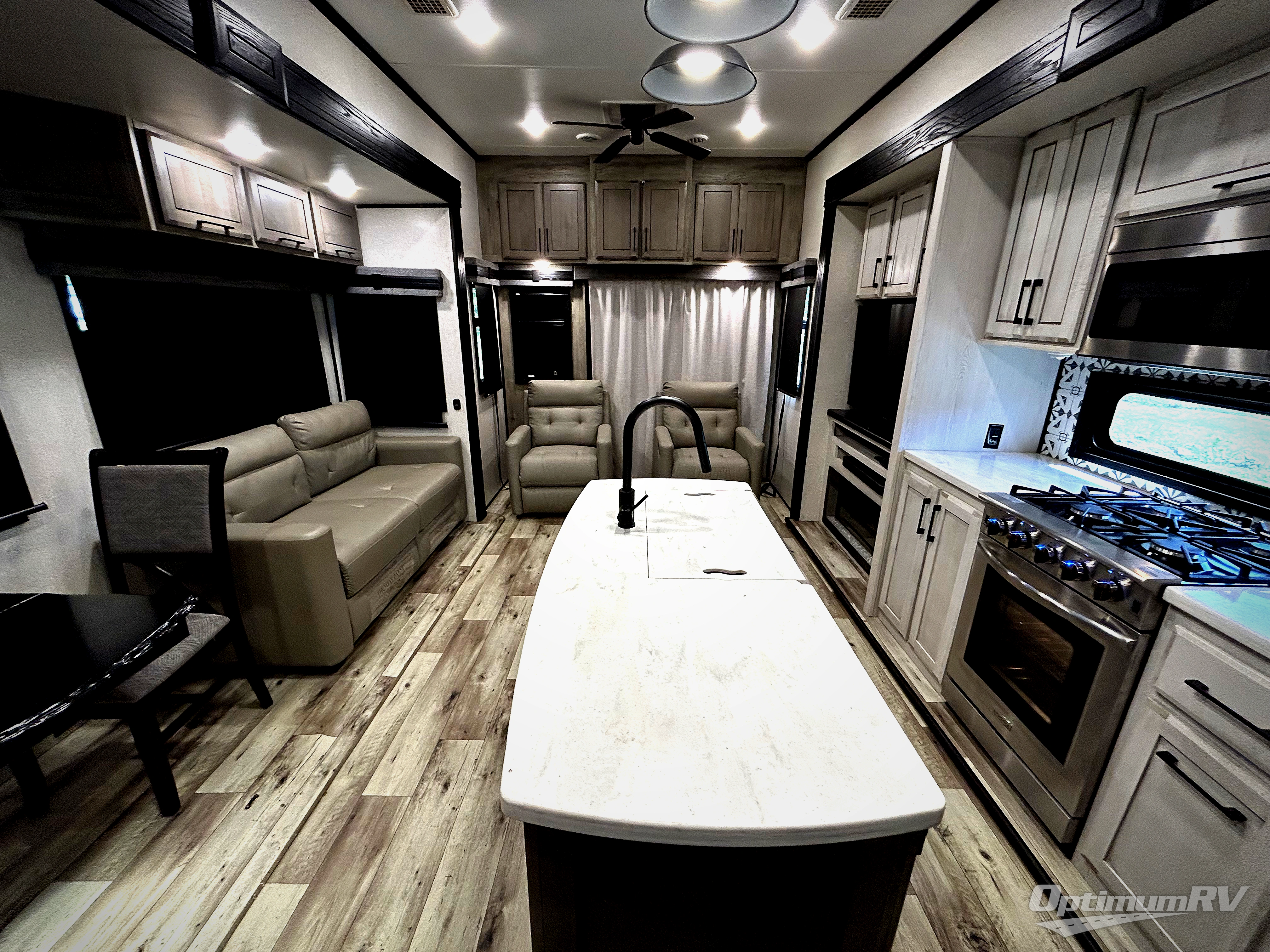 With any KZ Durango Gold full-time luxury fifth wheel, you will enjoy the look of modern farmhouse cabinetry, upgraded kitchen appliances such as a 30" convection microwave and 24" oven with four burner range, plus a stainless dishwasher. Other top features include an electric tilt bed with Serta Comfort foam king mattress, theater seating with cupholders and a USB plug, plus heat, massage, and power recline/decline features. You will also appreciate a handy central vacuum system with multiple attachments that stores out of sight. Each Durango Gold is constructed with six-sided aluminum framing, and has heated, insulated and an enclosed underbelly. It is also constructed with Tufflex roofing material which is flexible, puncture resistant, and reflective. Some additional standout features include a fully-vented attic system, and a Durango Towing package which includes a 2" towing receiver hitch with 4-pin wire harness connection. This will provide you with 3,000 lbs. of towing capacity. Come choose your favorite lightweight high-profile wide body luxury fifth wheel today!