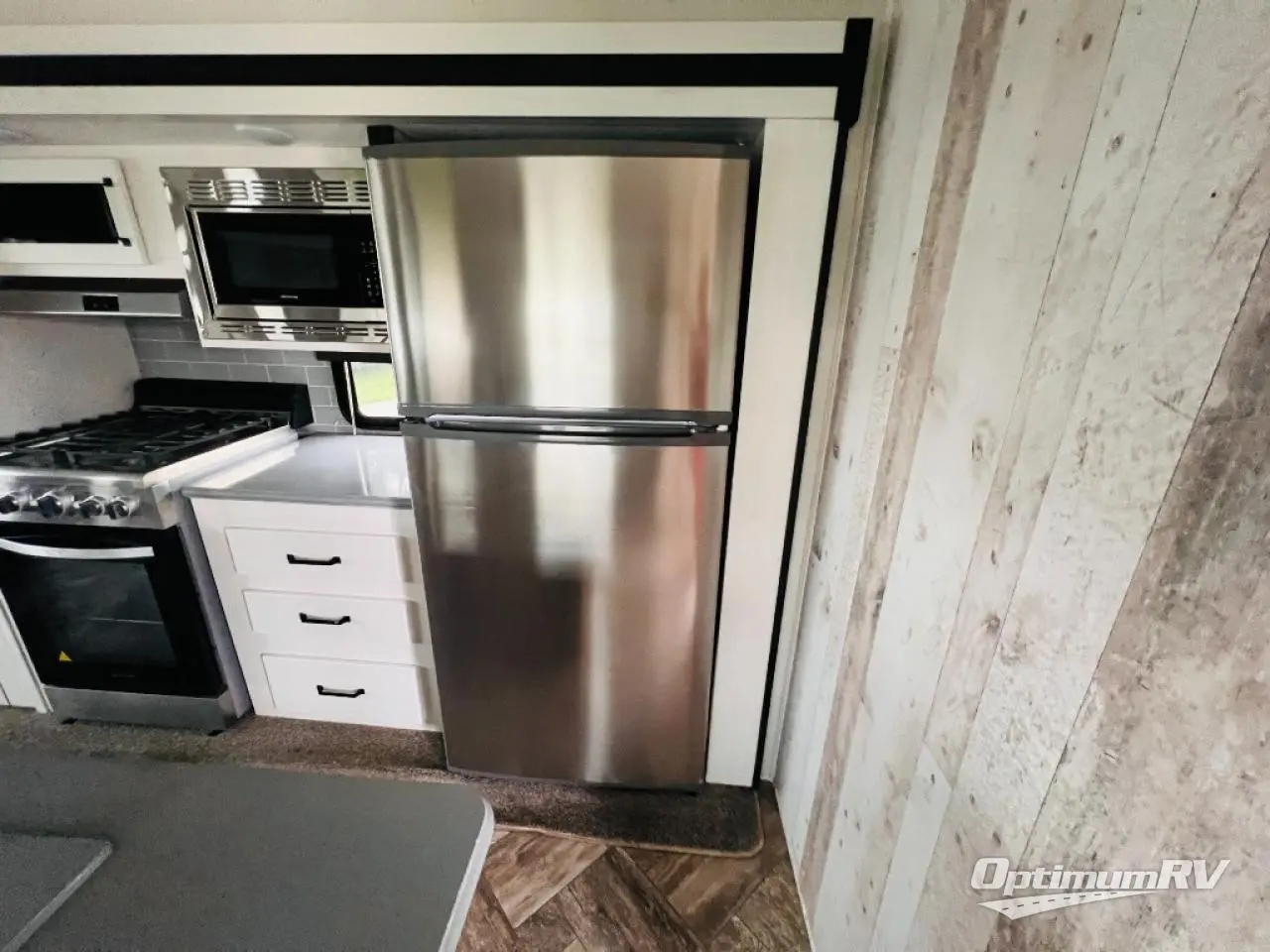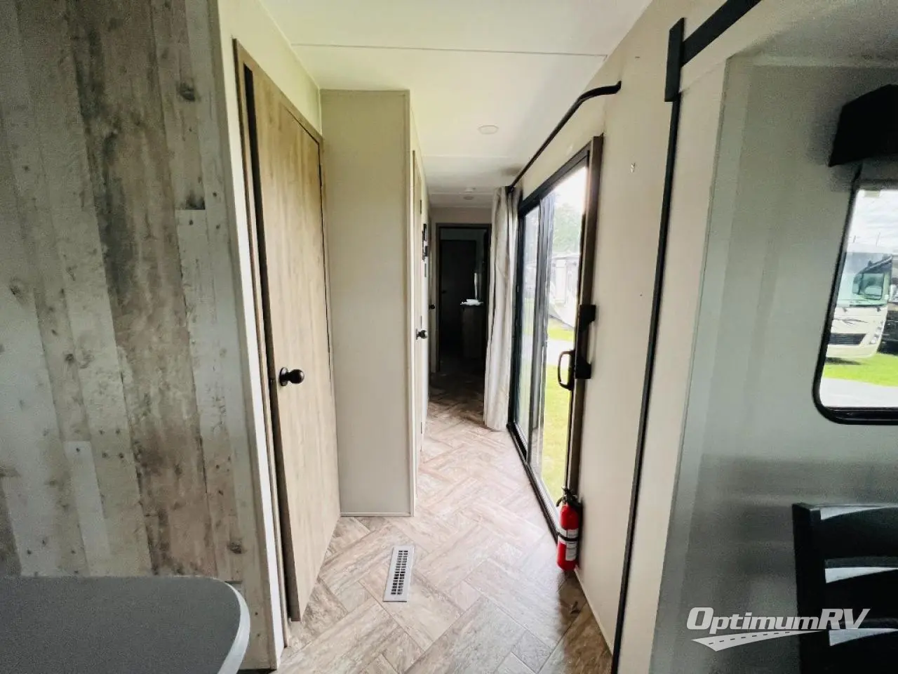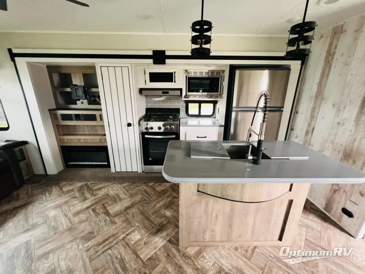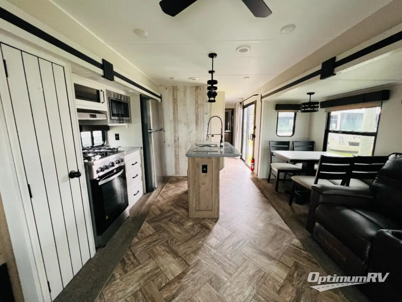 Everyone will want to join you when you head back out to the lake to stay in this trailer! With the middle bunkhouse that includes a bunk above a jiffy sofa and a closet, this can be your kids room or guests headquarters. You will have your own privacy when needed in the front bedroom which includes a queen bed slide and two closets. There is also a dresser and a space within a closet for a washer/dryer option. The full bathroom is conveniently located between the two rooms, and the rear of the destination trailer offers a combined living and kitchen area. The dual slides give you lots of floor space around the kitchen island to relax on the booth dinette or sofa, and the cook will have full kitchen amenities including a residential style refrigerator.