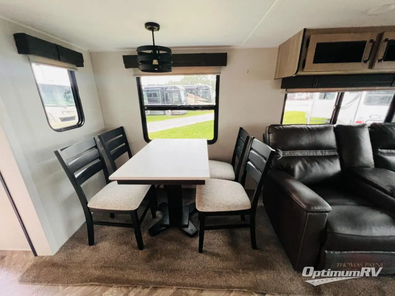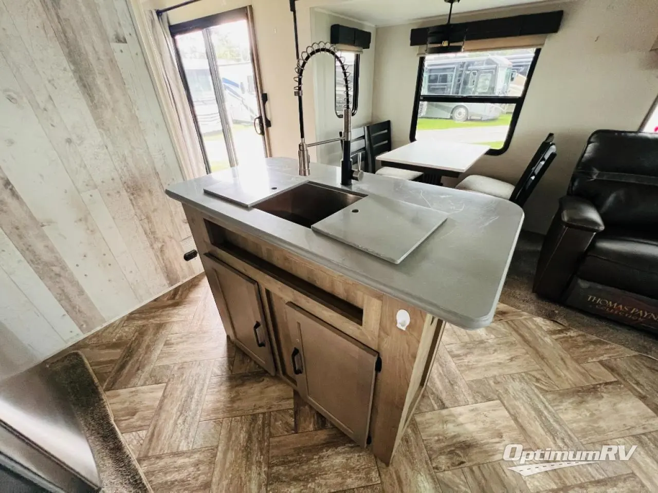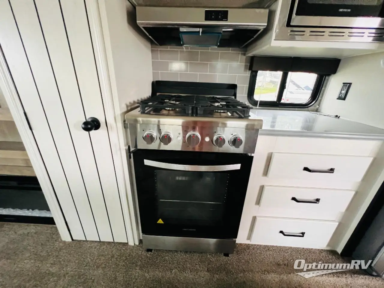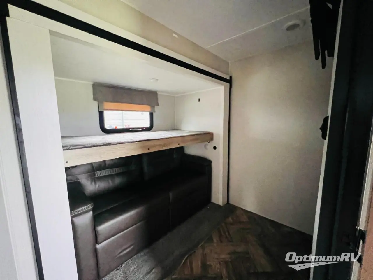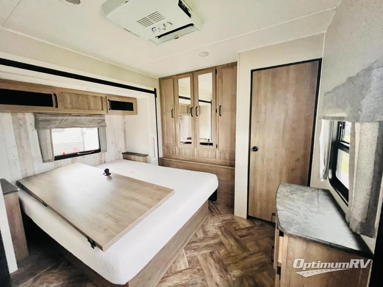 Everyone will want to join you when you head back out to the lake to stay in this trailer! With the middle bunkhouse that includes a bunk above a jiffy sofa and a closet, this can be your kids room or guests headquarters. You will have your own privacy when needed in the front bedroom which includes a queen bed slide and two closets. There is also a dresser and a space within a closet for a washer/dryer option. The full bathroom is conveniently located between the two rooms, and the rear of the destination trailer offers a combined living and kitchen area. The dual slides give you lots of floor space around the kitchen island to relax on the booth dinette or sofa, and the cook will have full kitchen amenities including a residential style refrigerator.