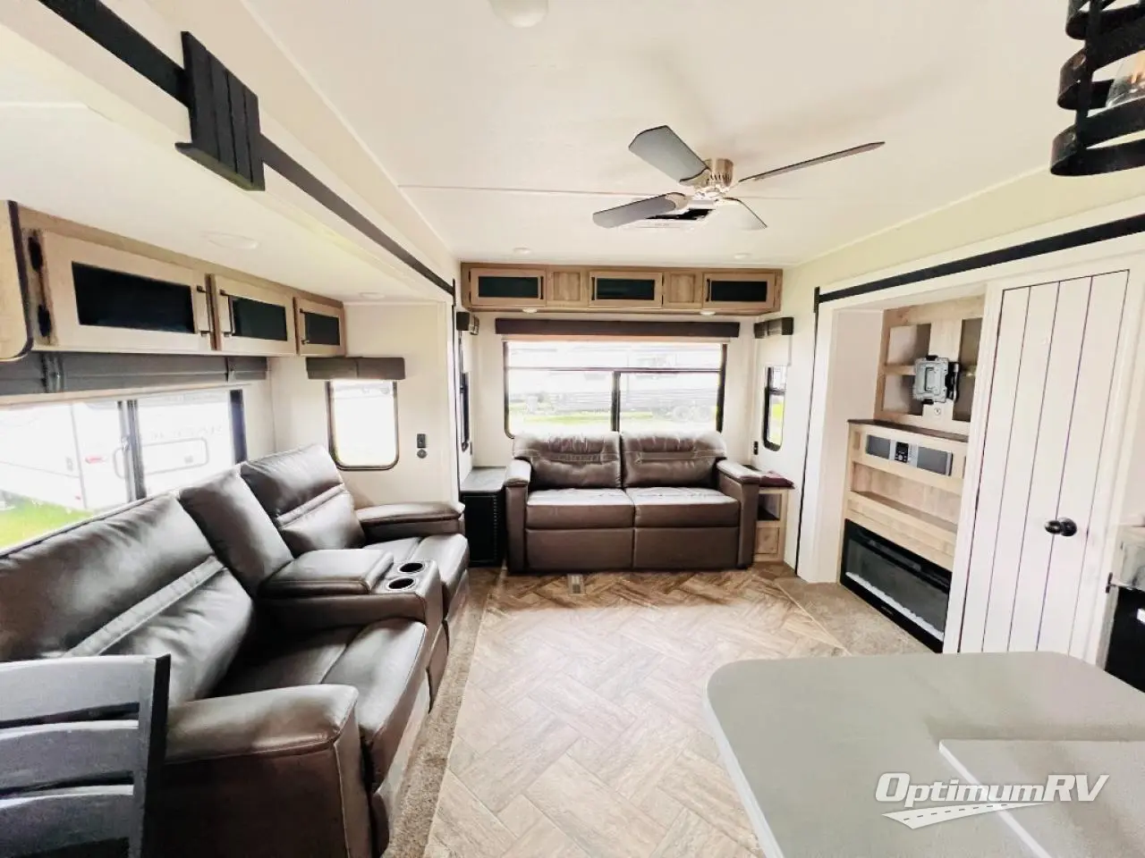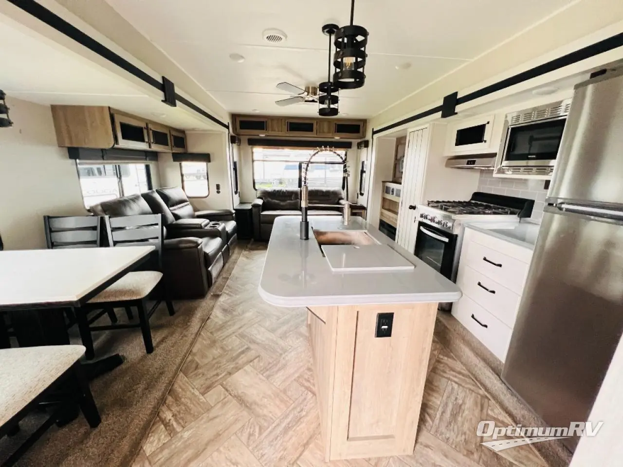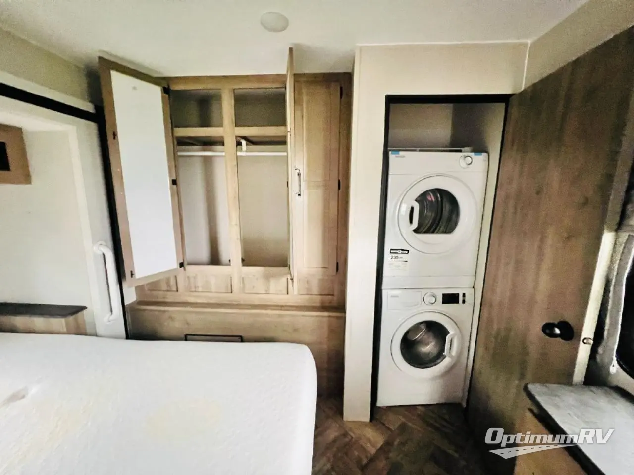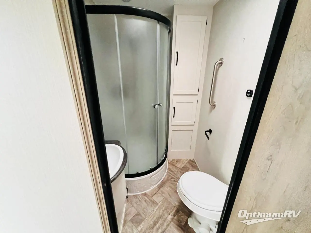 Everyone will want to join you when you head back out to the lake to stay in this trailer! With the middle bunkhouse that includes a bunk above a jiffy sofa and a closet, this can be your kids room or guests headquarters. You will have your own privacy when needed in the front bedroom which includes a queen bed slide and two closets. There is also a dresser and a space within a closet for a washer/dryer option. The full bathroom is conveniently located between the two rooms, and the rear of the destination trailer offers a combined living and kitchen area. The dual slides give you lots of floor space around the kitchen island to relax on the booth dinette or sofa, and the cook will have full kitchen amenities including a residential style refrigerator.